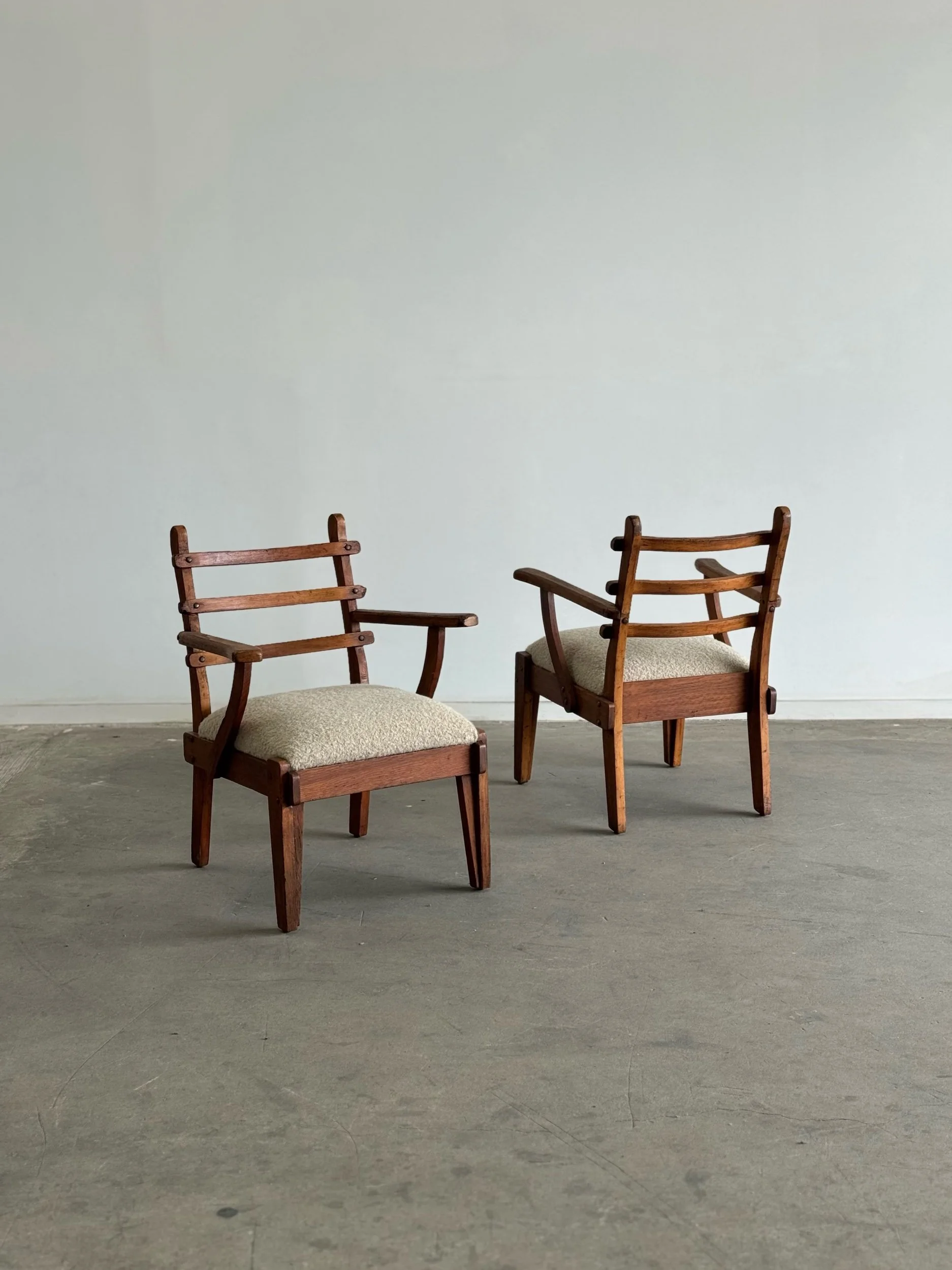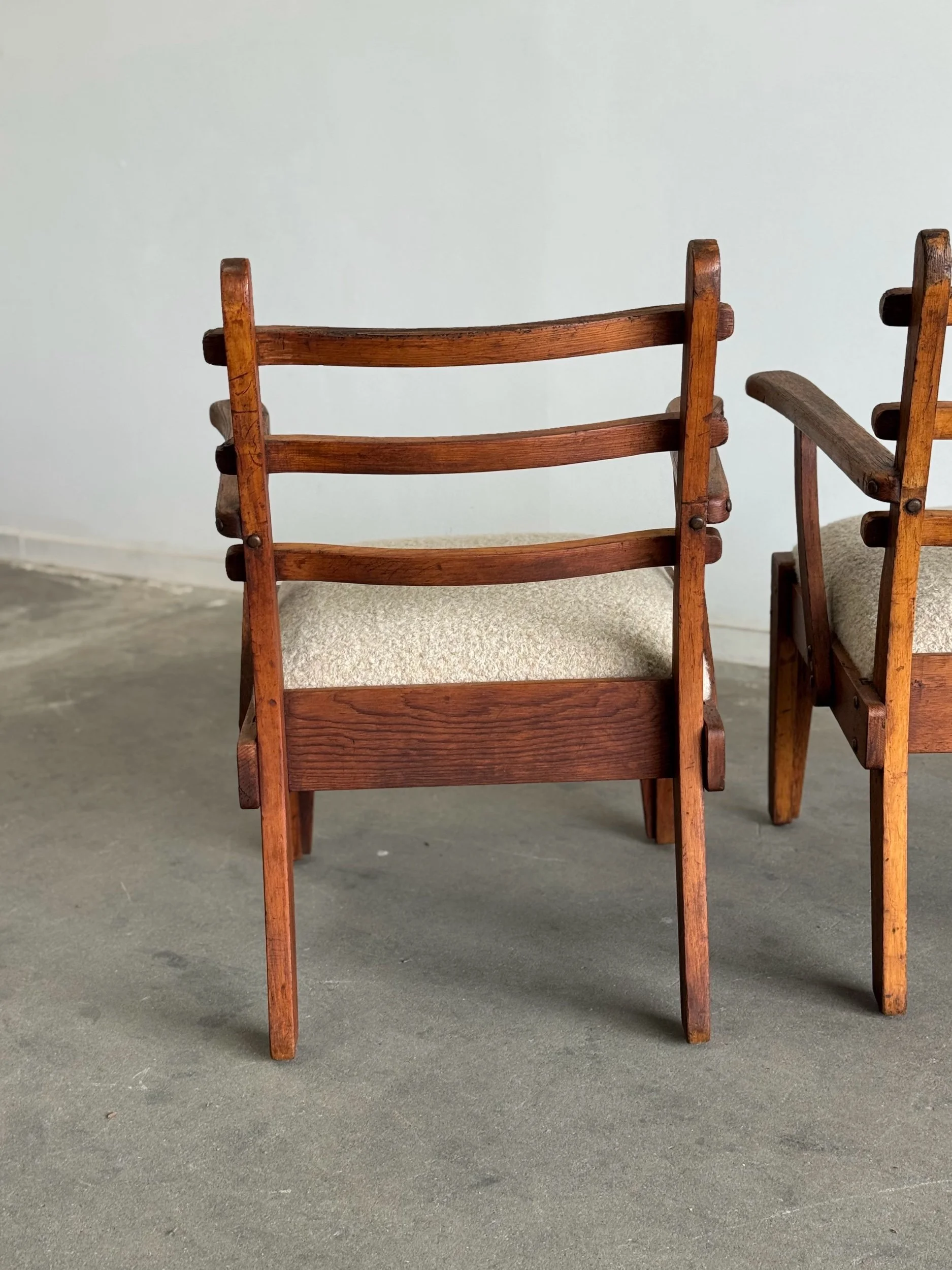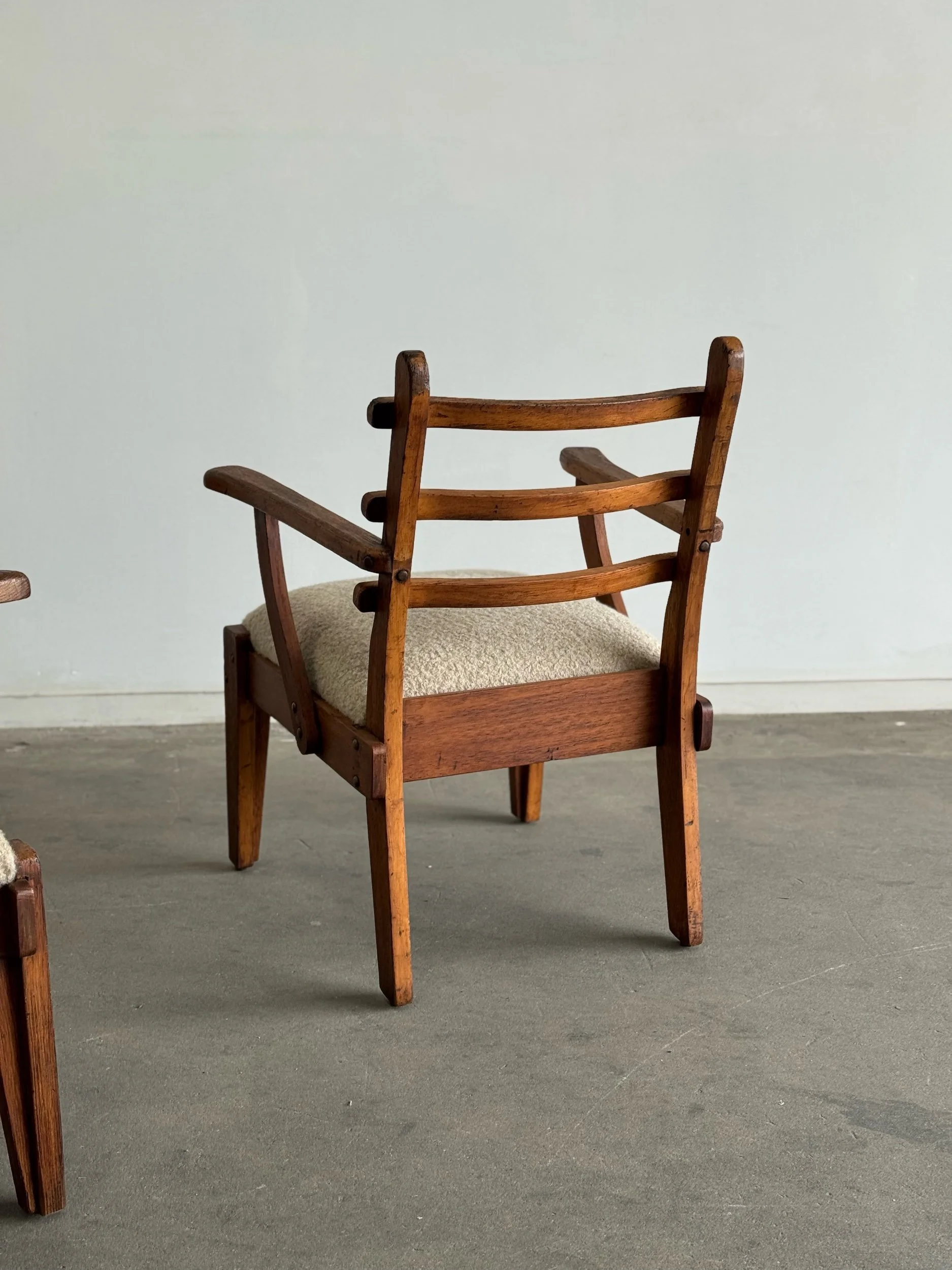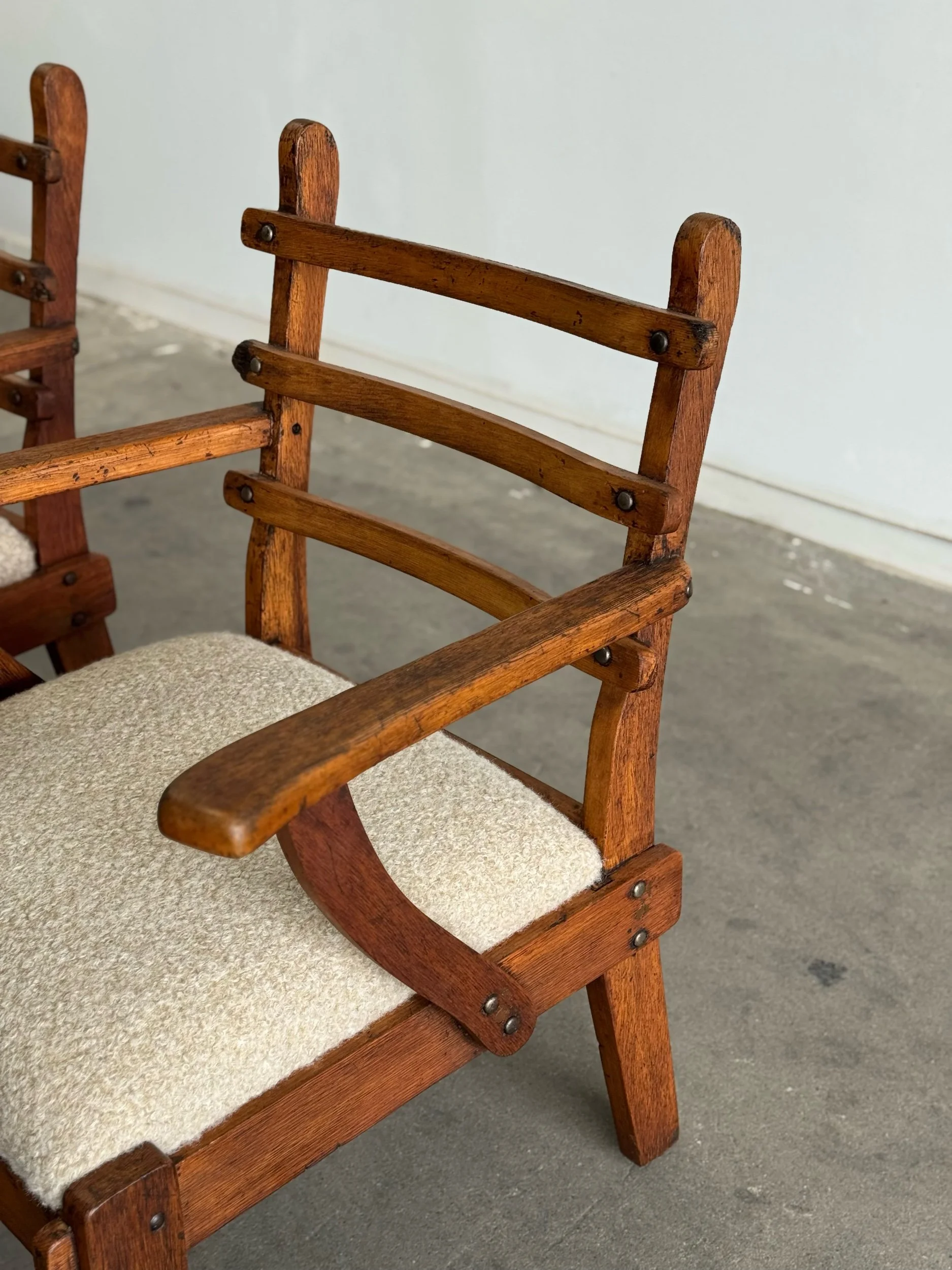 Vintage primitive side chairs restored structurally. Each unit has been disassembled with new adhesive and reassembled with added reinforcements where needed. Each unit has been washed and cleaned and coated with a walnut wax finish to preserve existing character and patina but extend life. Chairs features new foam , and wool boucle. Price is for the pair .