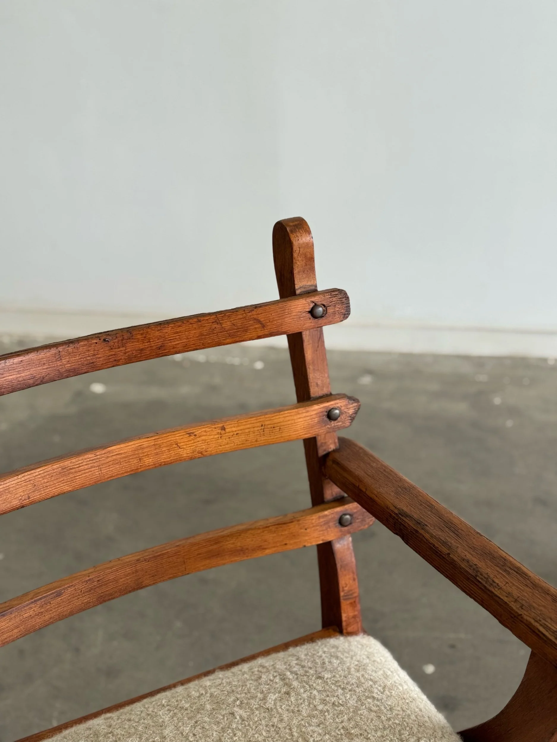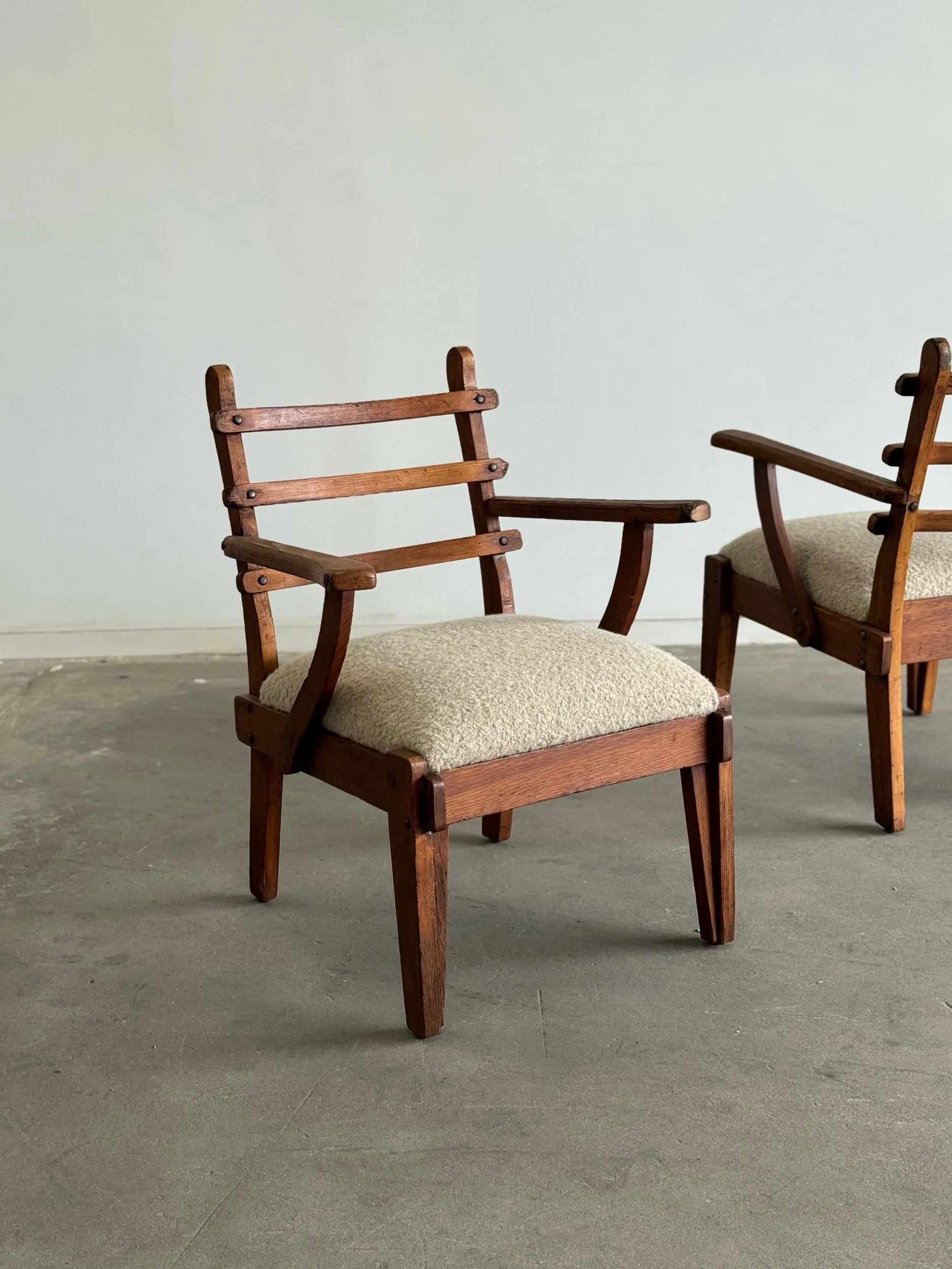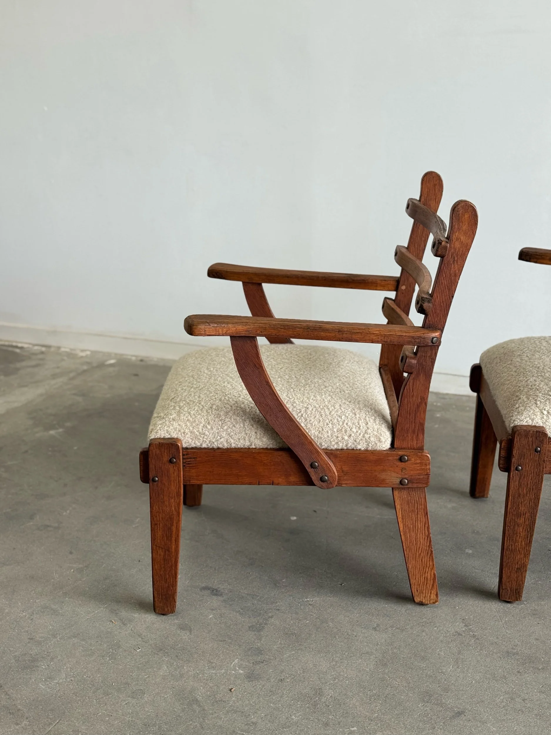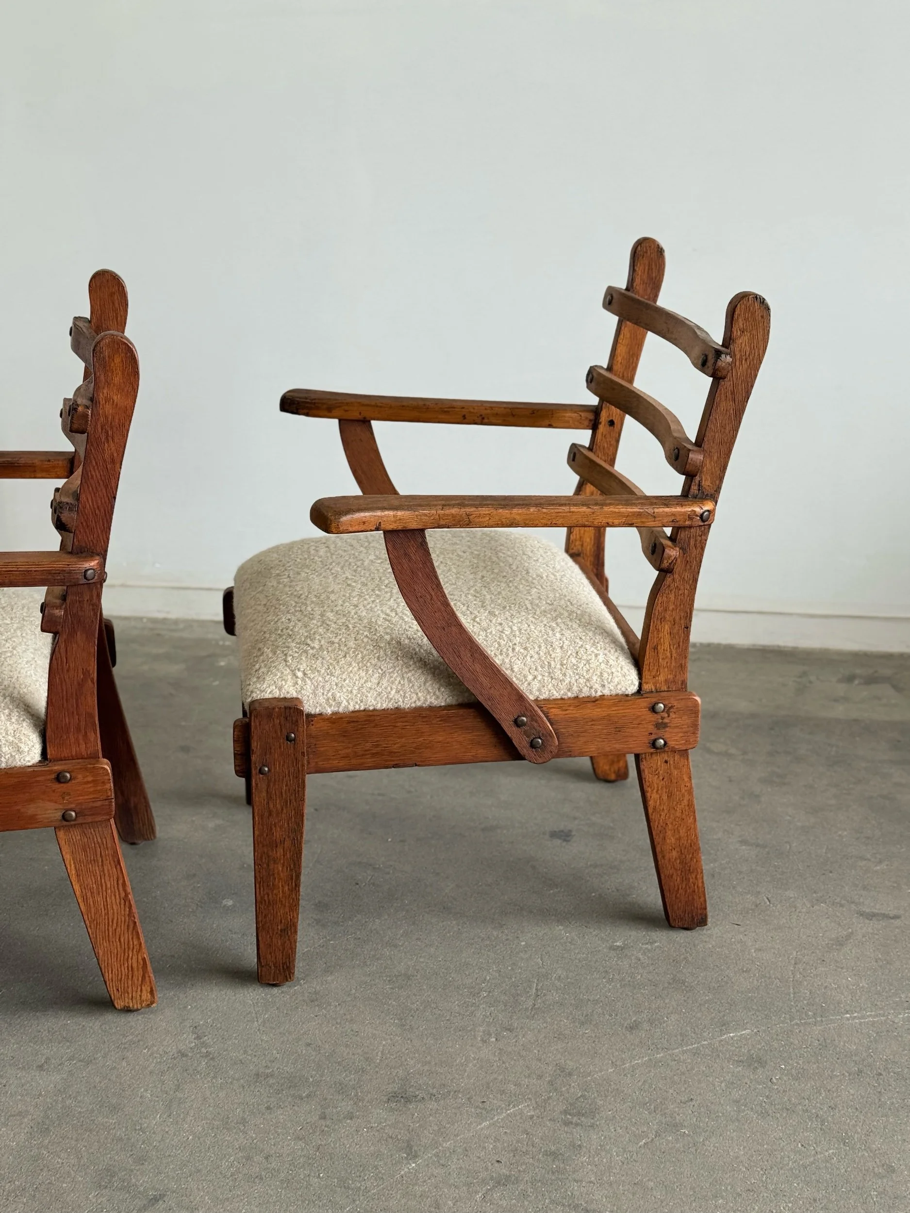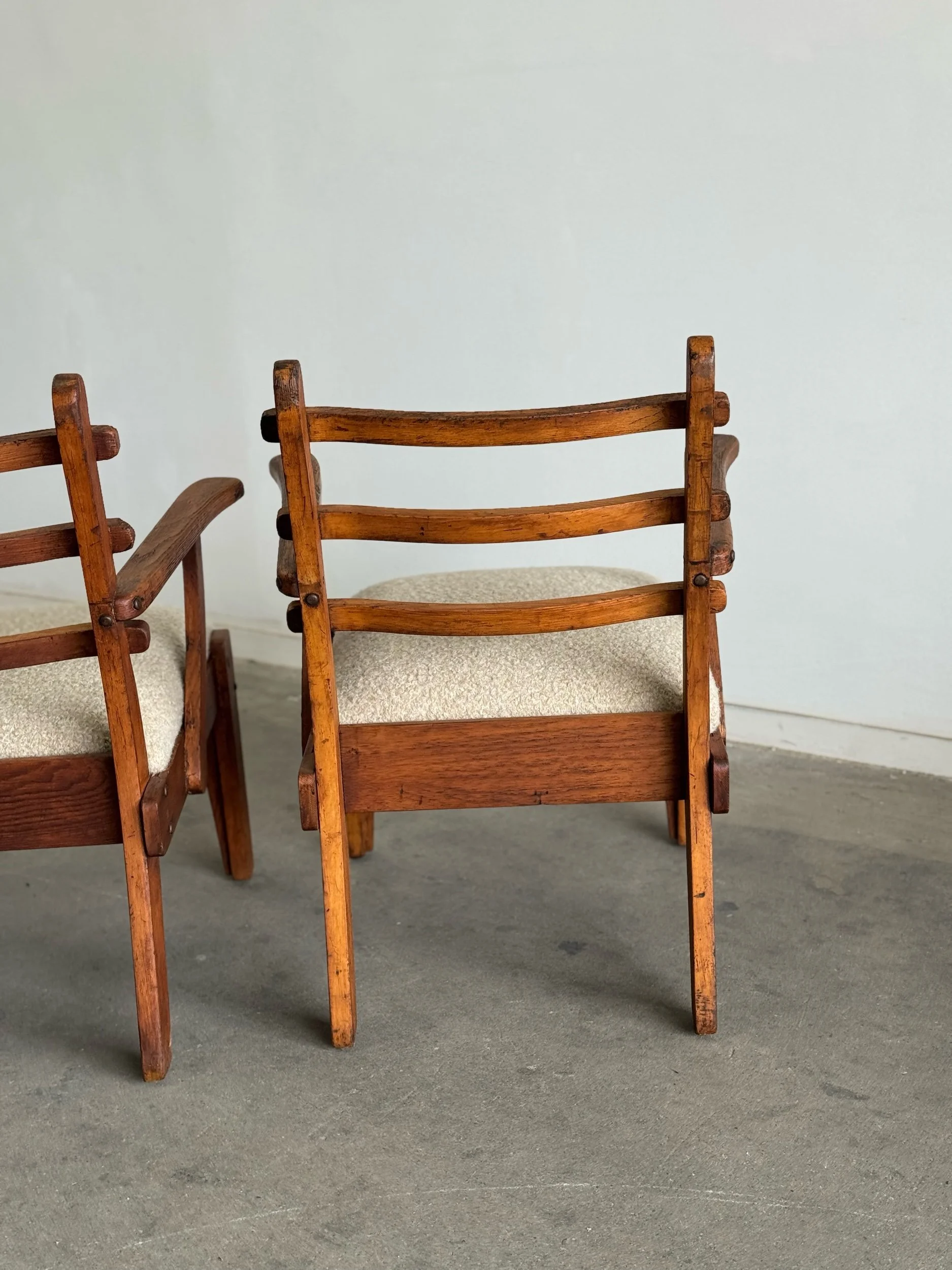 Vintage primitive side chairs restored structurally. Each unit has been disassembled with new adhesive and reassembled with added reinforcements where needed. Each unit has been washed and cleaned and coated with a walnut wax finish to preserve existing character and patina but extend life. Chairs features new foam , and wool boucle. Price is for the pair .