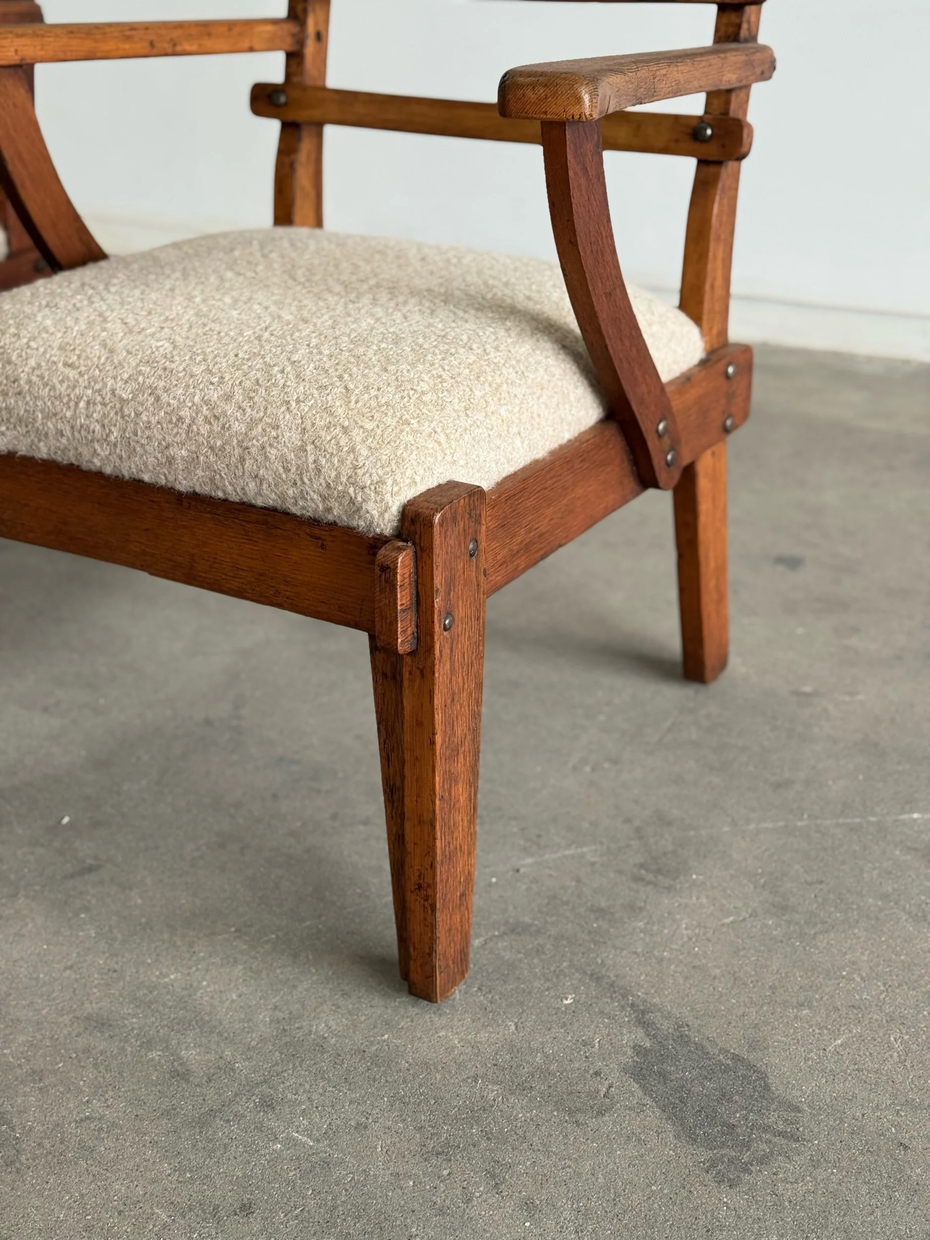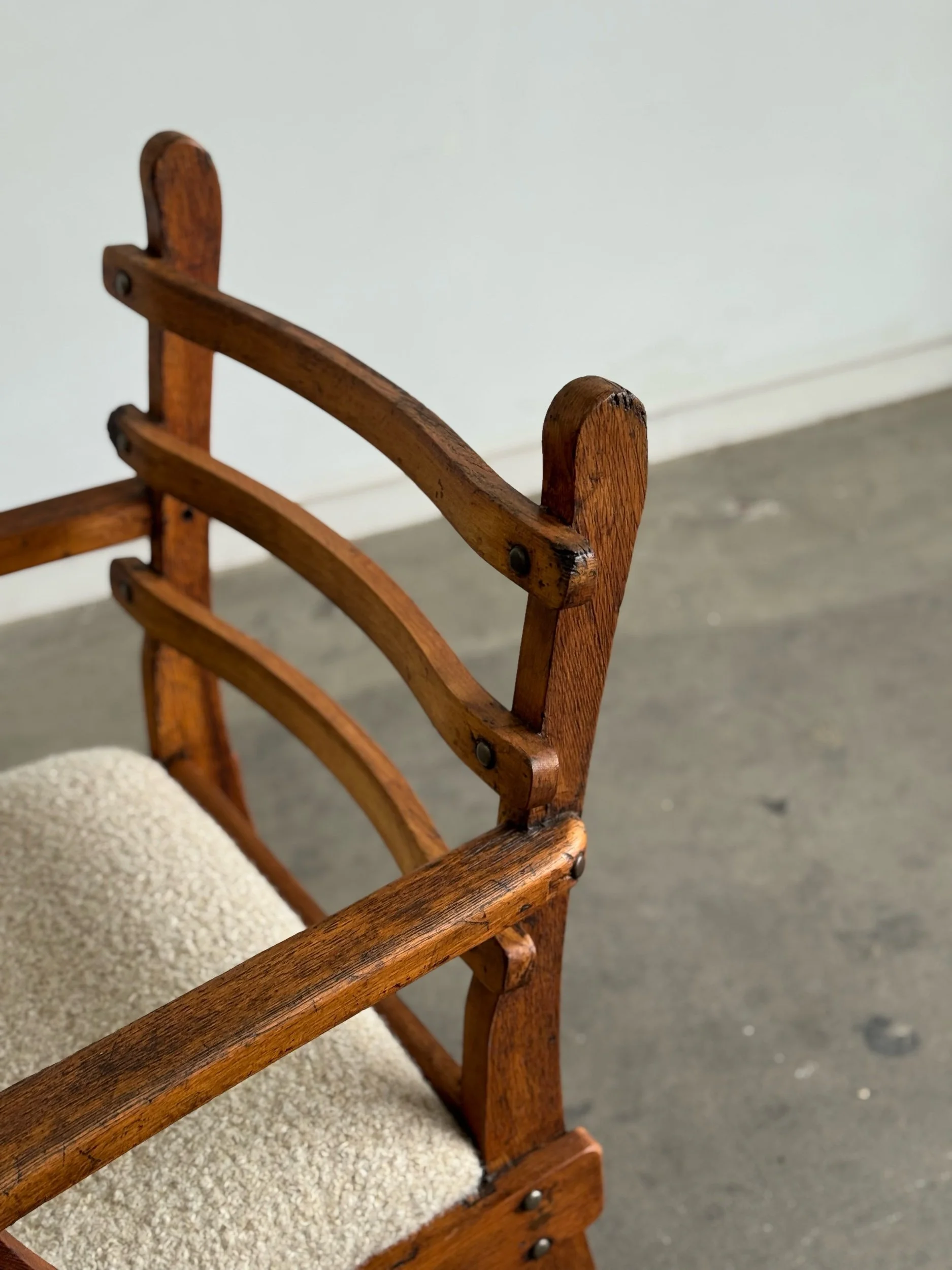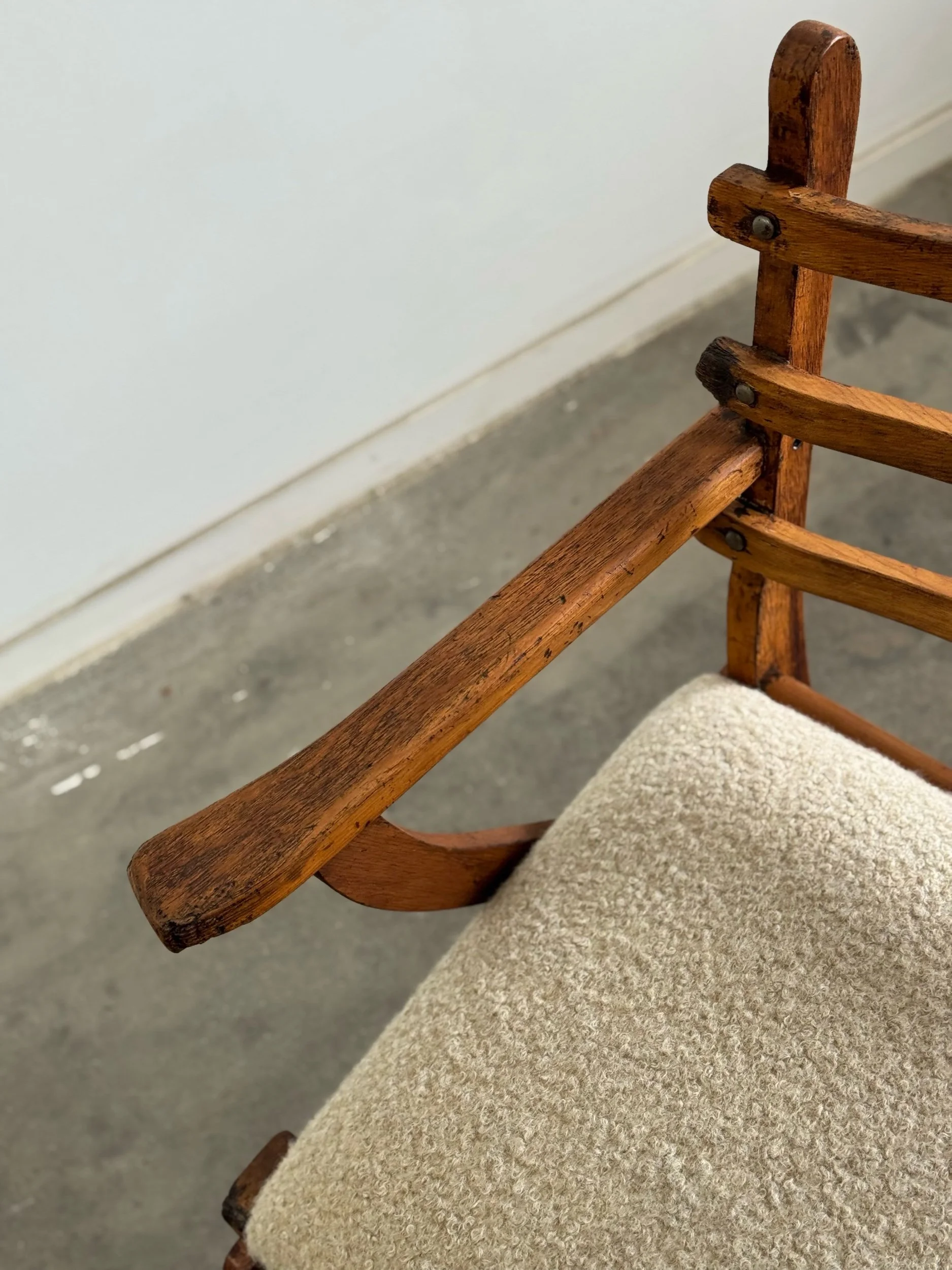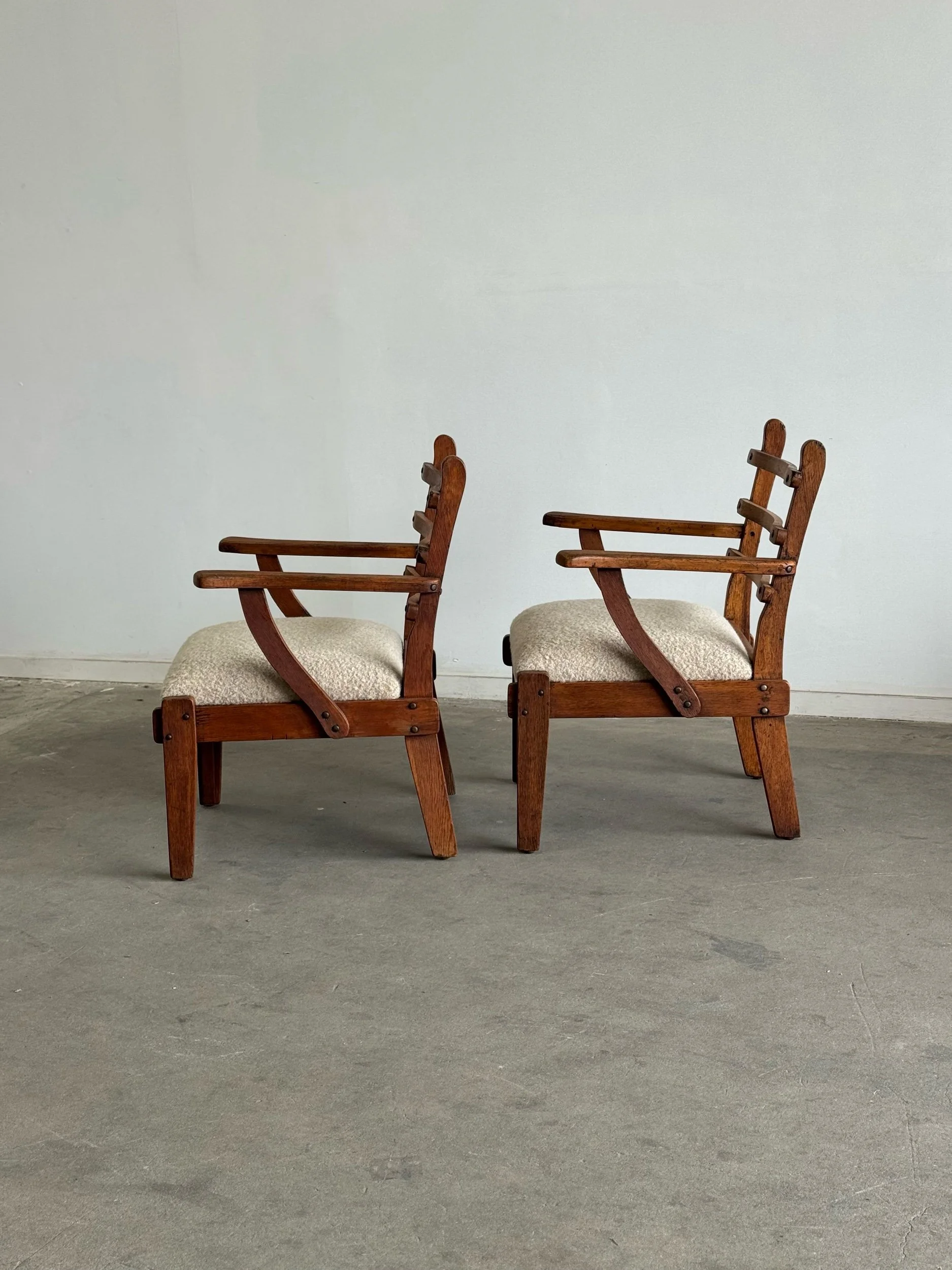 Vintage primitive side chairs restored structurally. Each unit has been disassembled with new adhesive and reassembled with added reinforcements where needed. Each unit has been washed and cleaned and coated with a walnut wax finish to preserve existing character and patina but extend life. Chairs features new foam , and wool boucle. Price is for the pair .