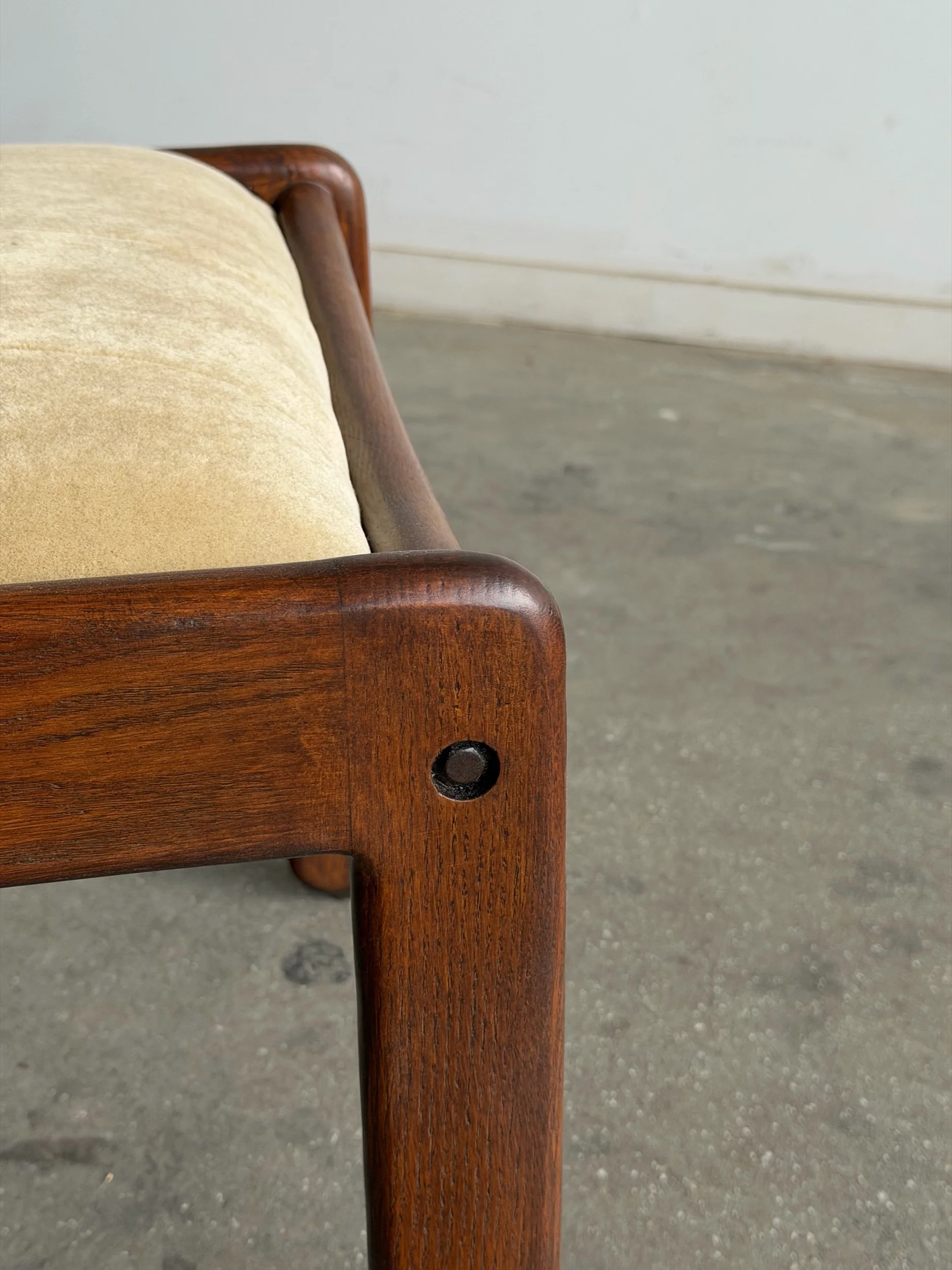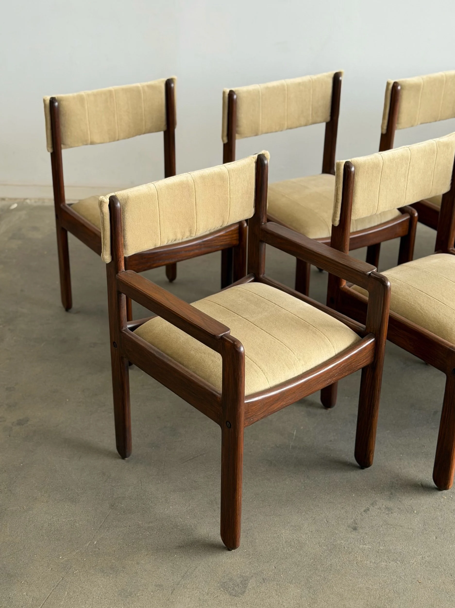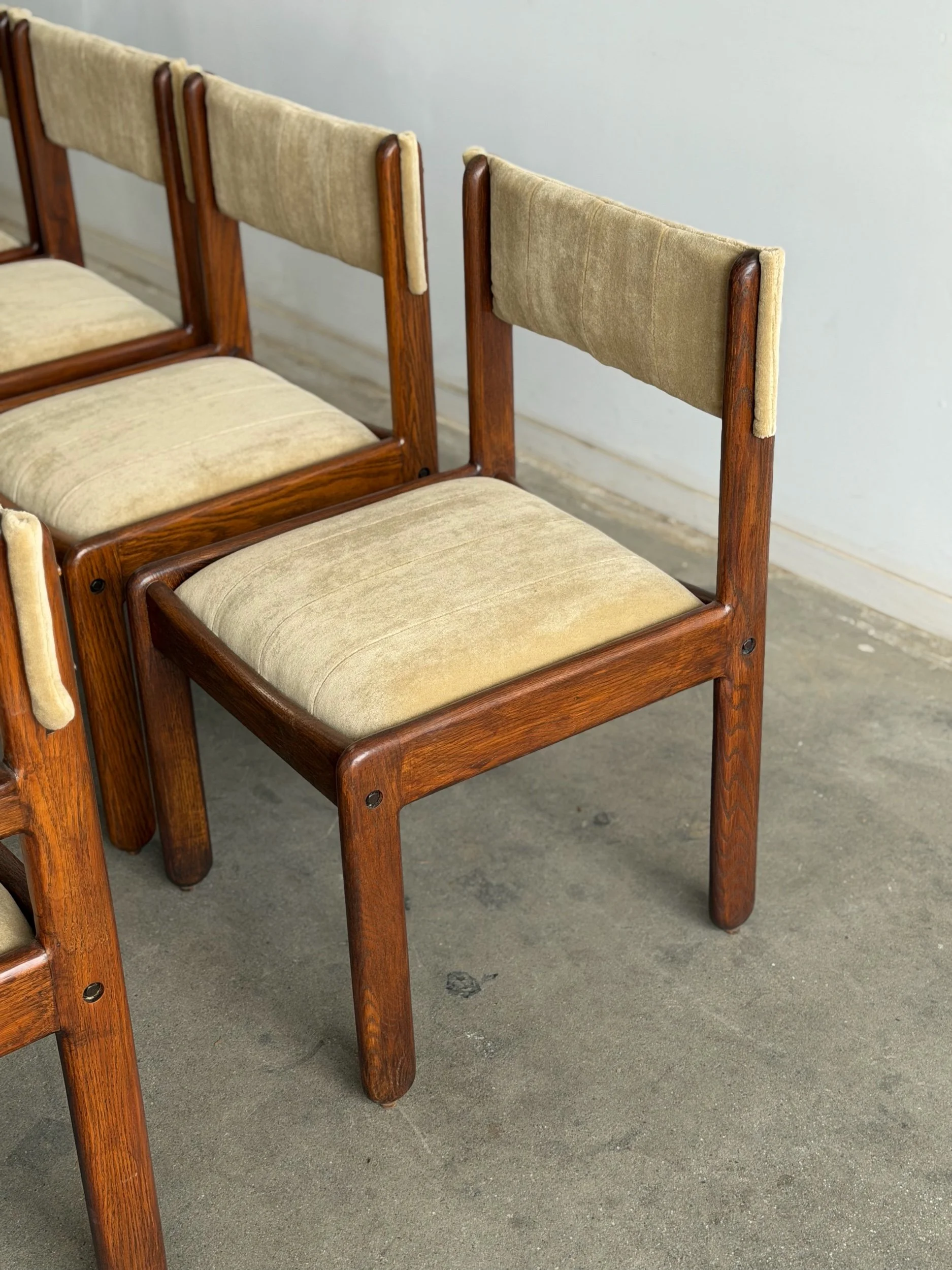Solid oak dining chairs in excellent fully restored condition. Chairs have been reinforced and inspected for structural integrity, each unit presents in sturdy sound condition. Each unit features fresh fill and foam , new low pile mohair fabric, and fresh medium dark walnut stain on all the wooden surfaces. Price is for the set of ten.