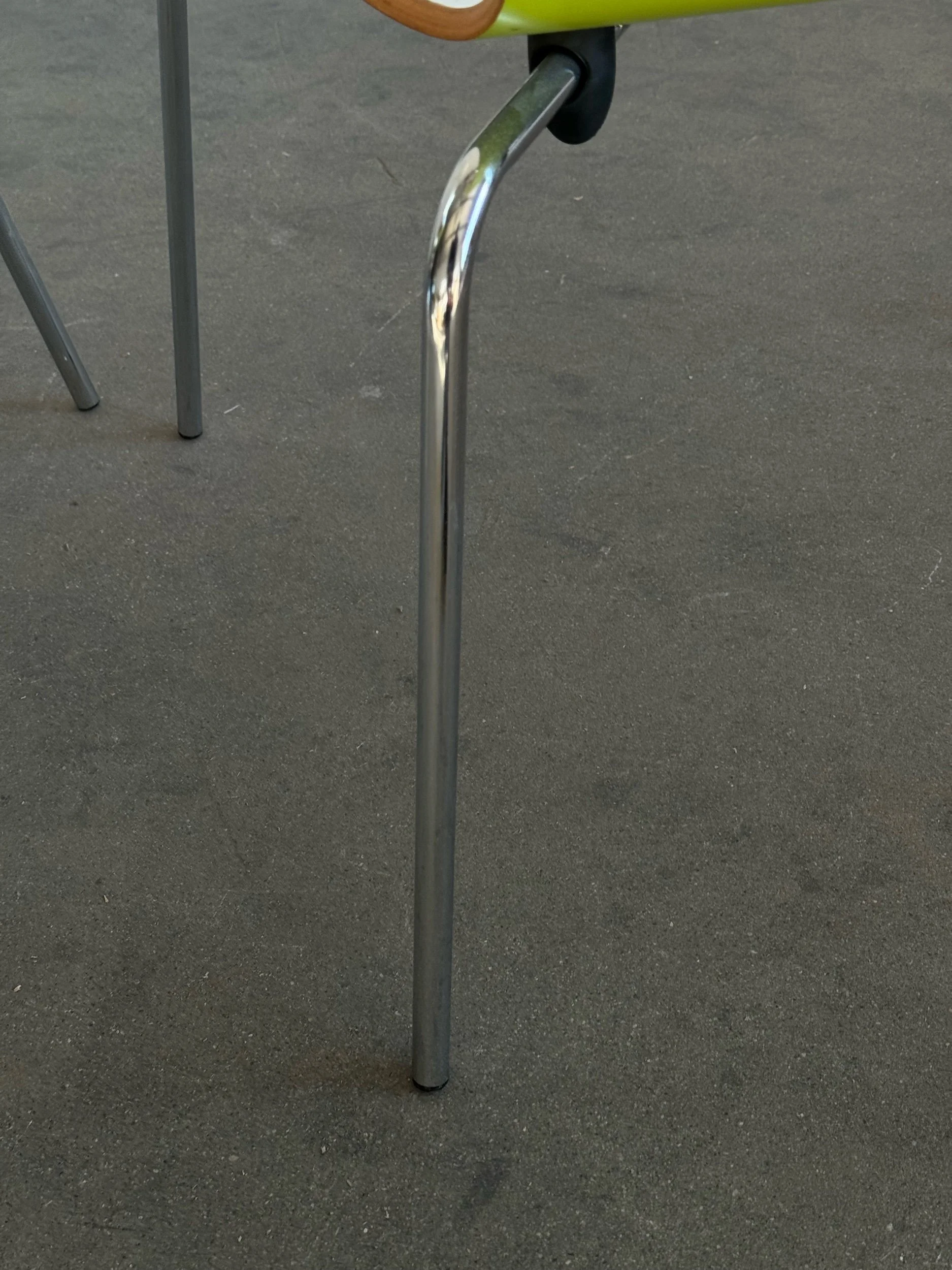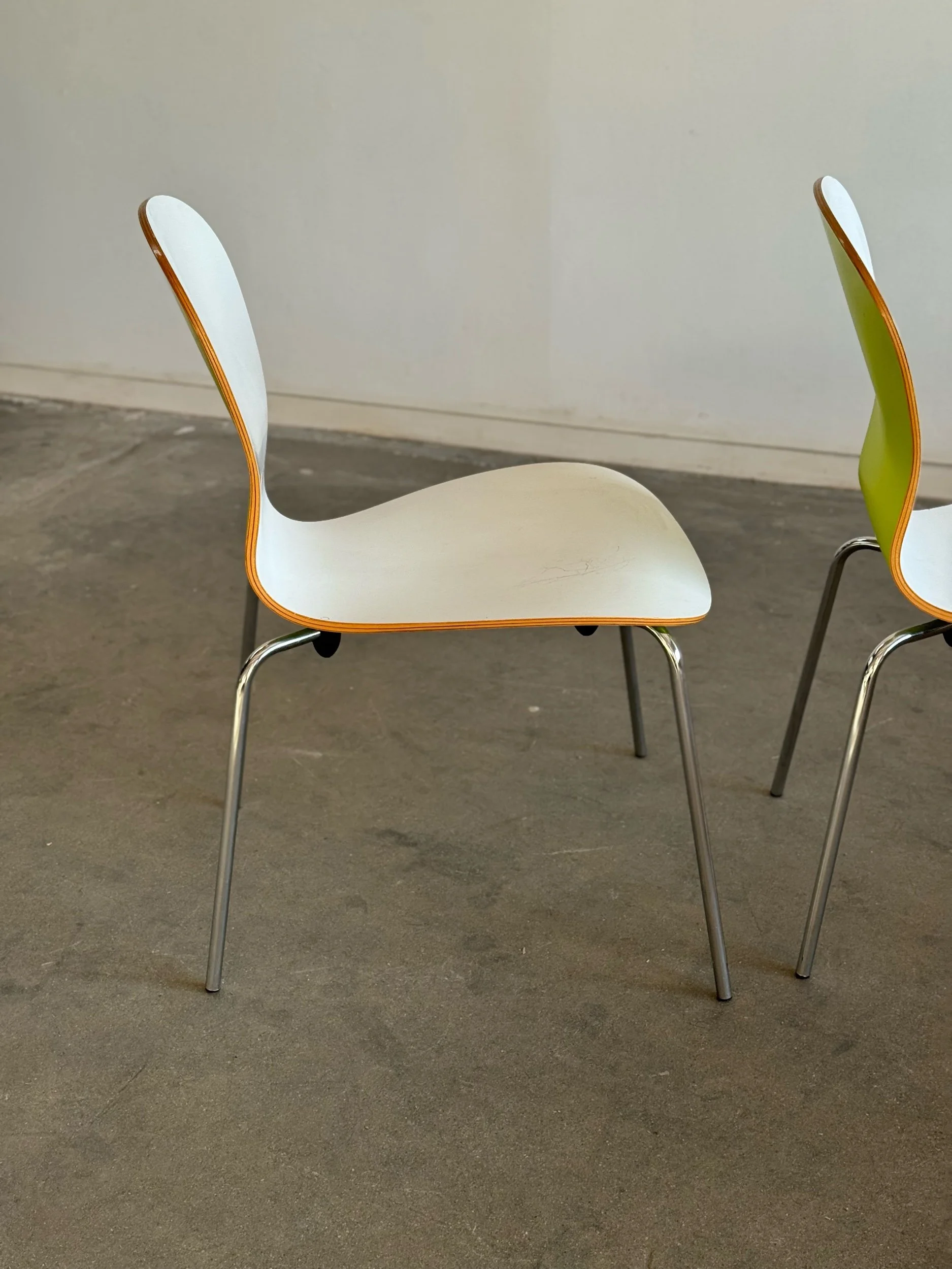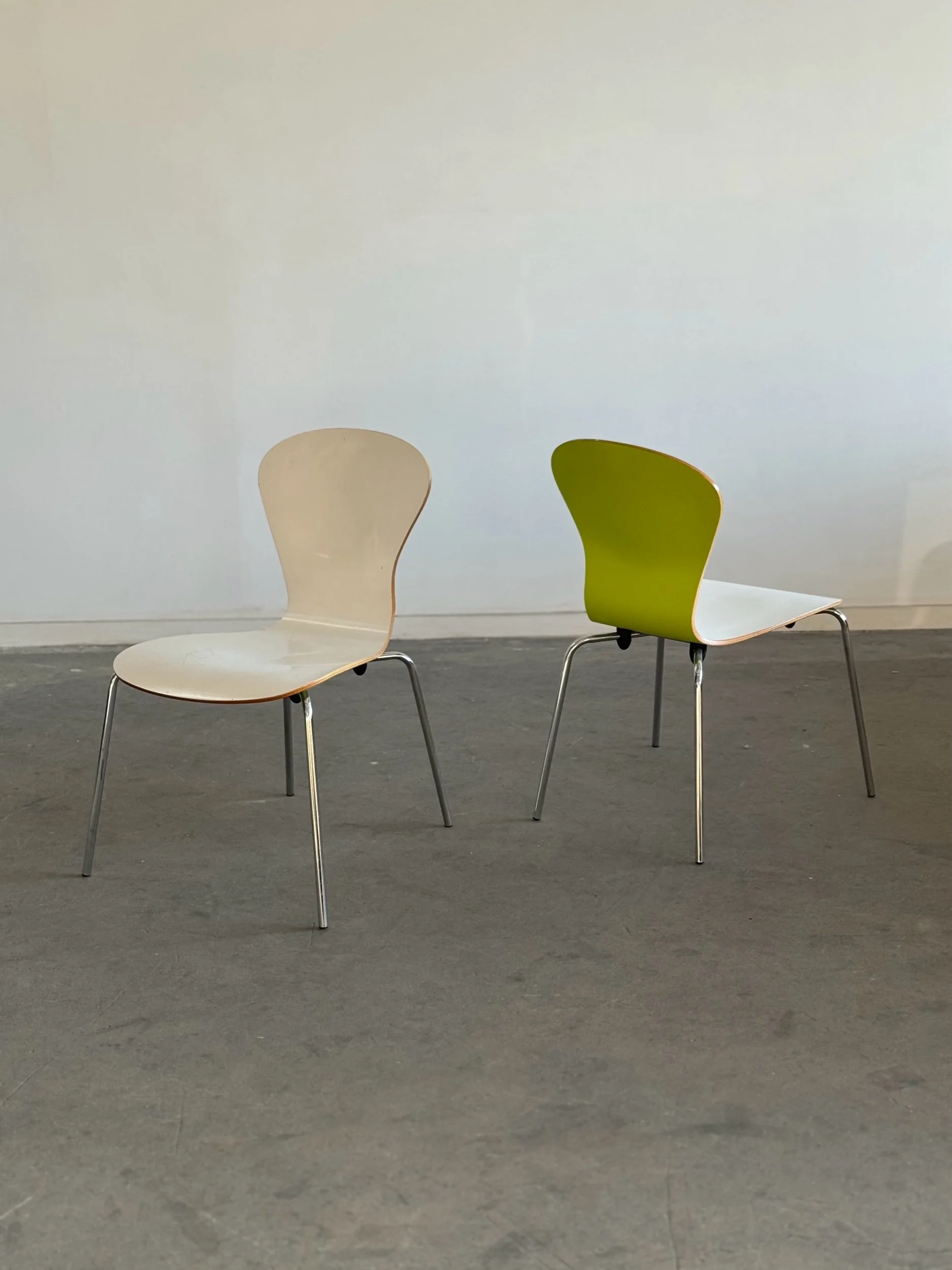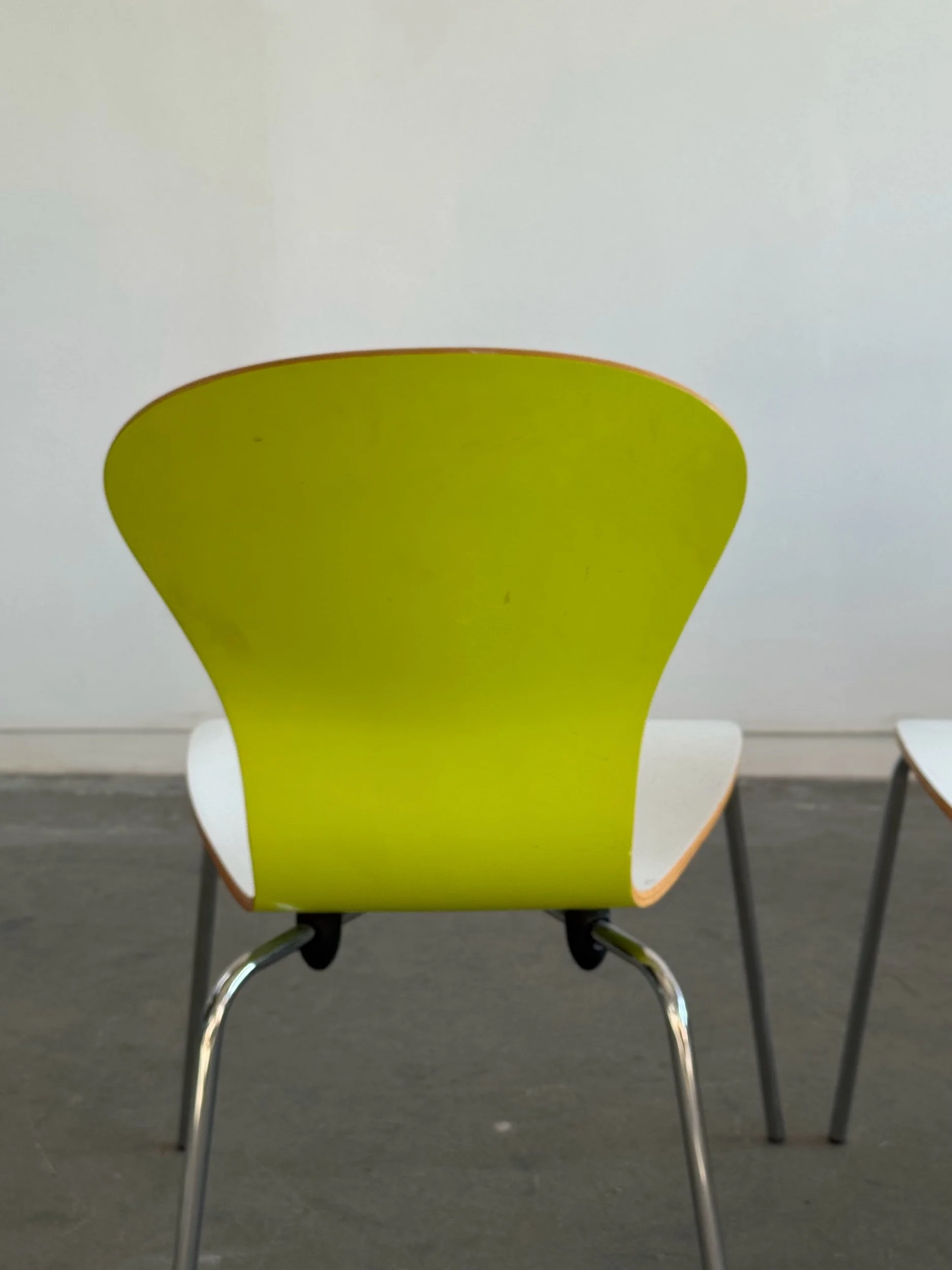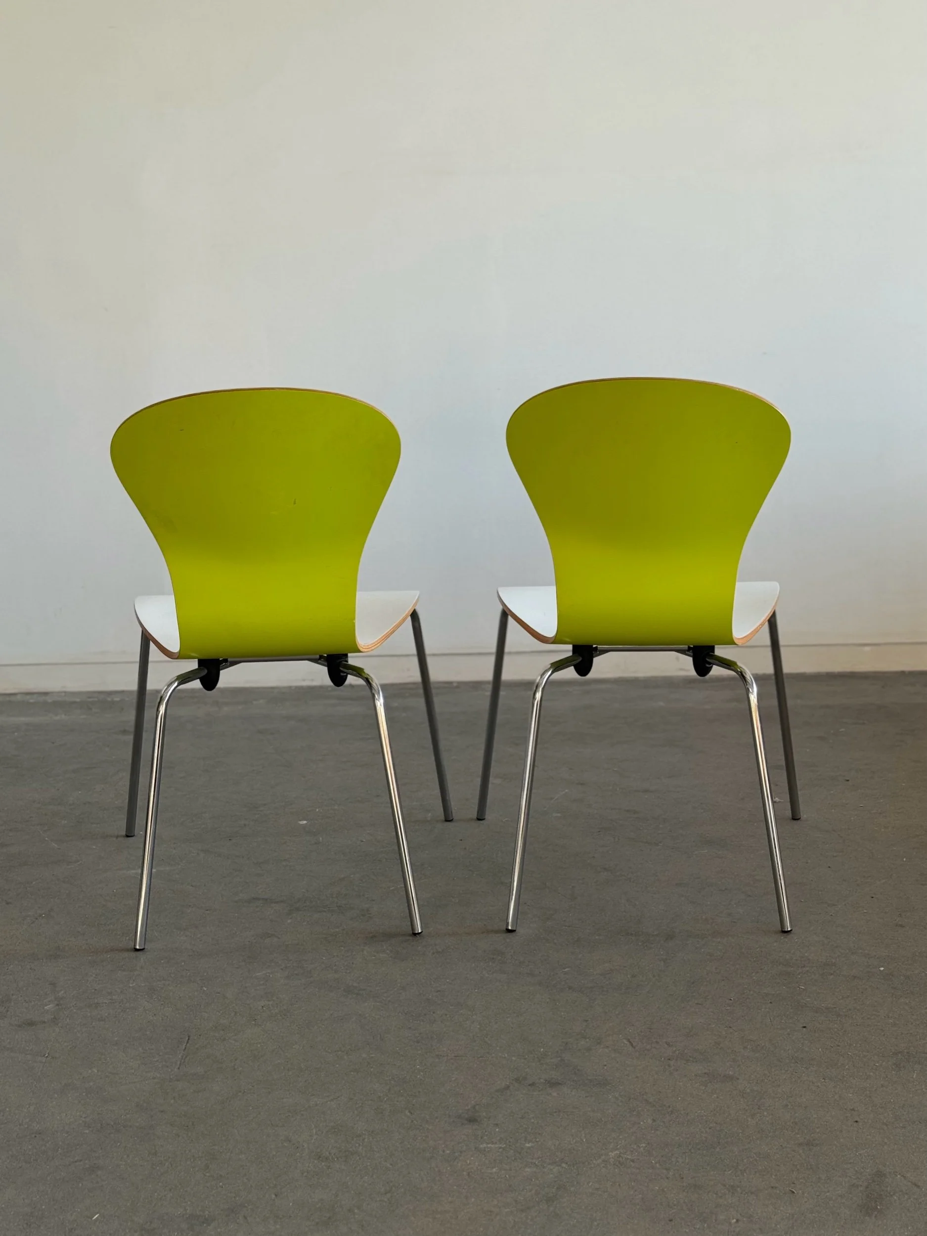 Designed by the visionary Ross Lovegrove, the Sprite Chair is a masterpiece of “organic essentialism.” It features a sinuous, molded plywood shell that appears to wrap around the sitter, providing surprising comfort within a sleek, sculptural silhouette. This specific pair features a striking two-tone aesthetic: a clean White face with a vibrant Lime Green back, mounted on a polish chrome tubular steel base.