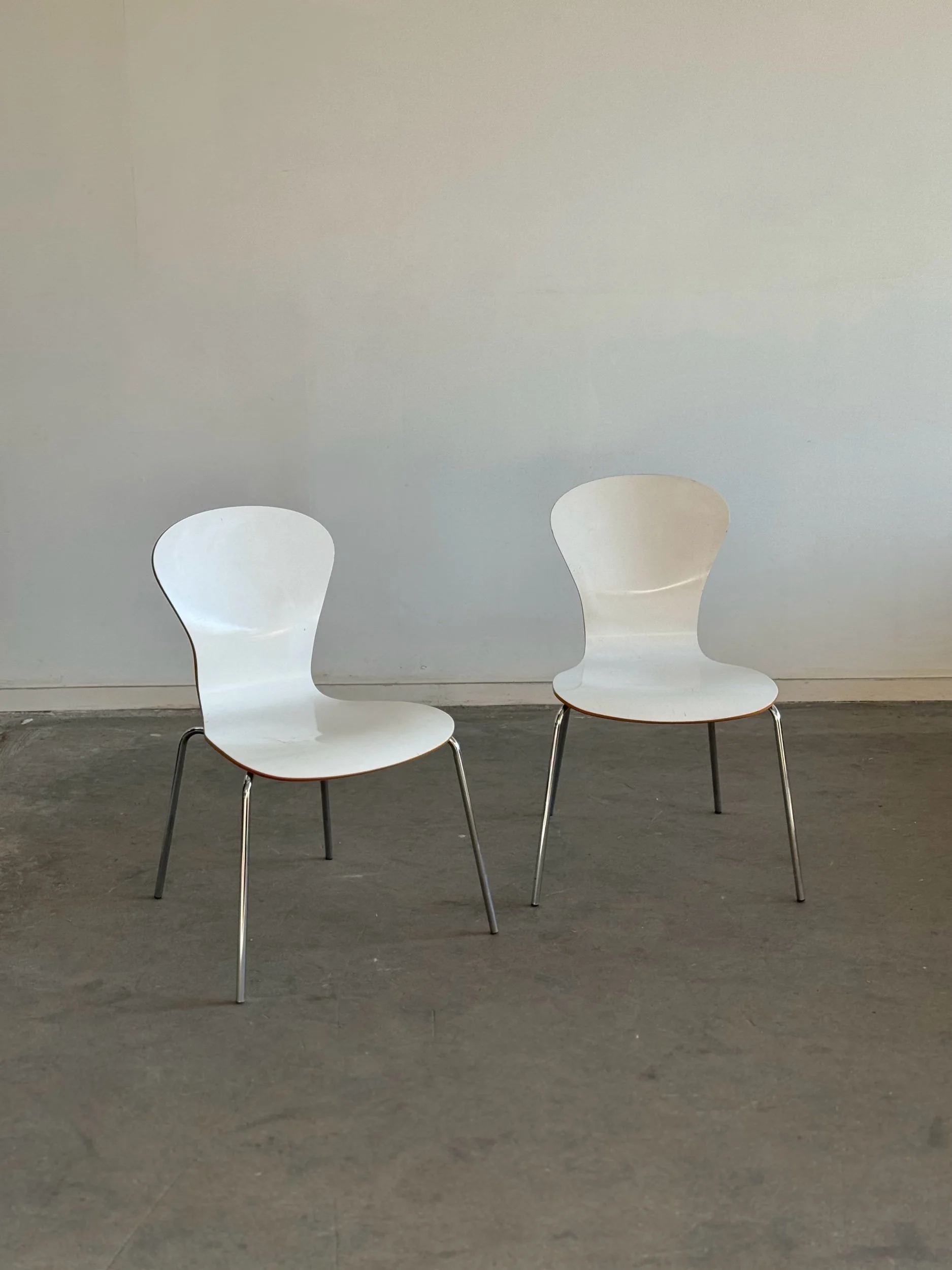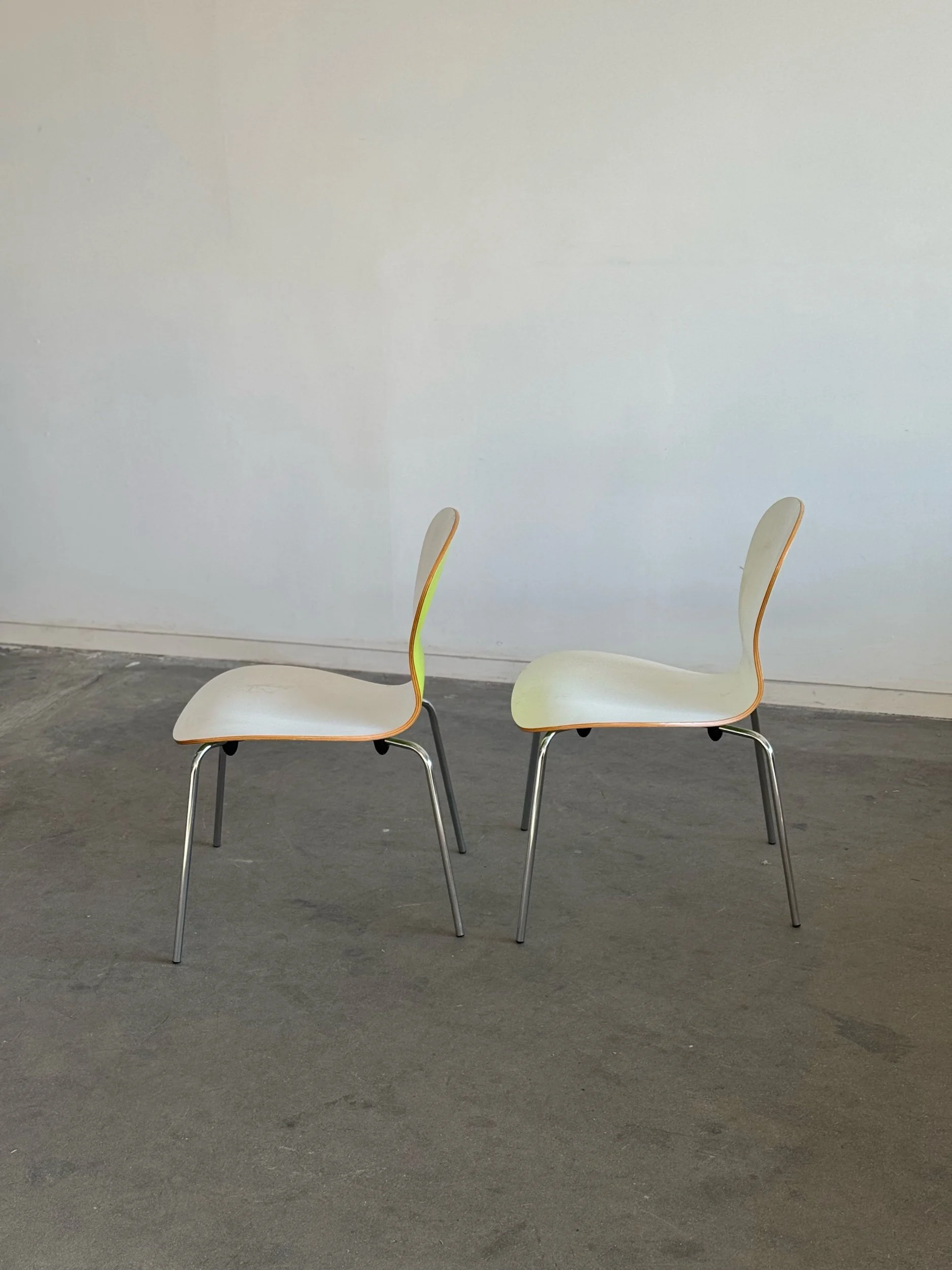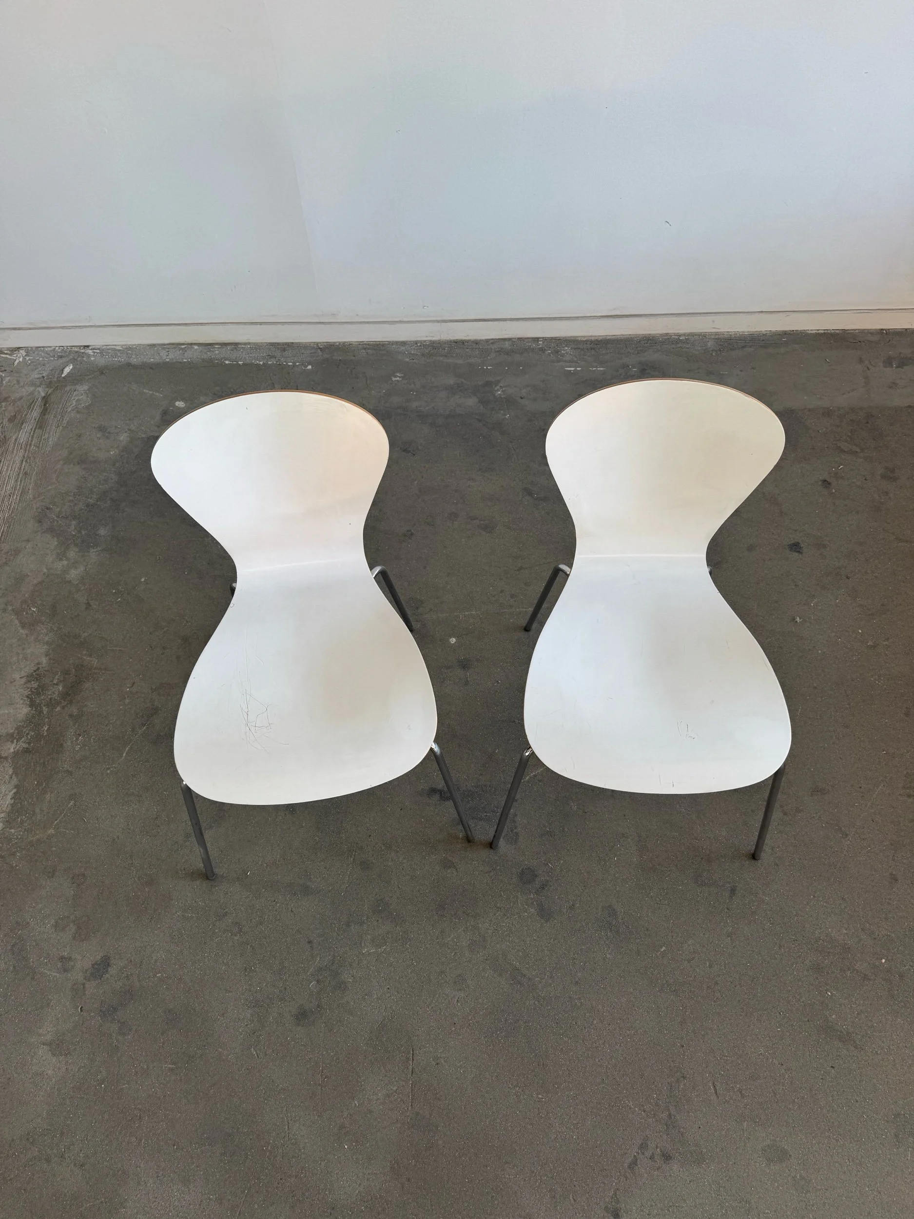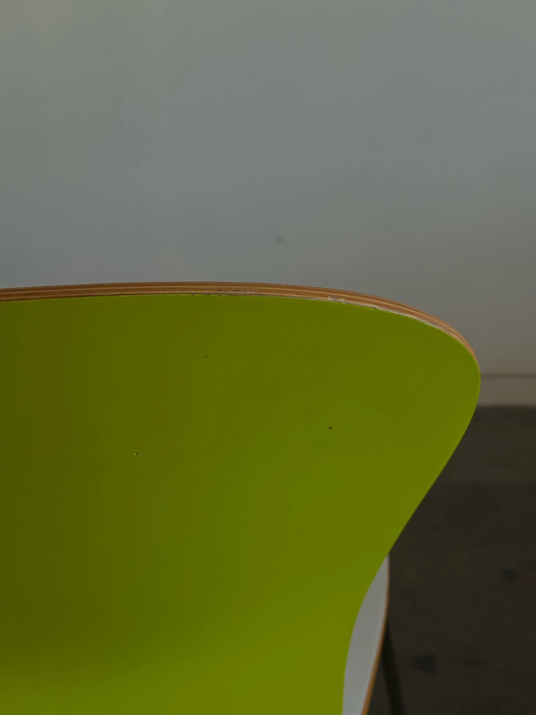 Designed by the visionary Ross Lovegrove, the Sprite Chair is a masterpiece of “organic essentialism.” It features a sinuous, molded plywood shell that appears to wrap around the sitter, providing surprising comfort within a sleek, sculptural silhouette. This specific pair features a striking two-tone aesthetic: a clean White face with a vibrant Lime Green back, mounted on a polish chrome tubular steel base.