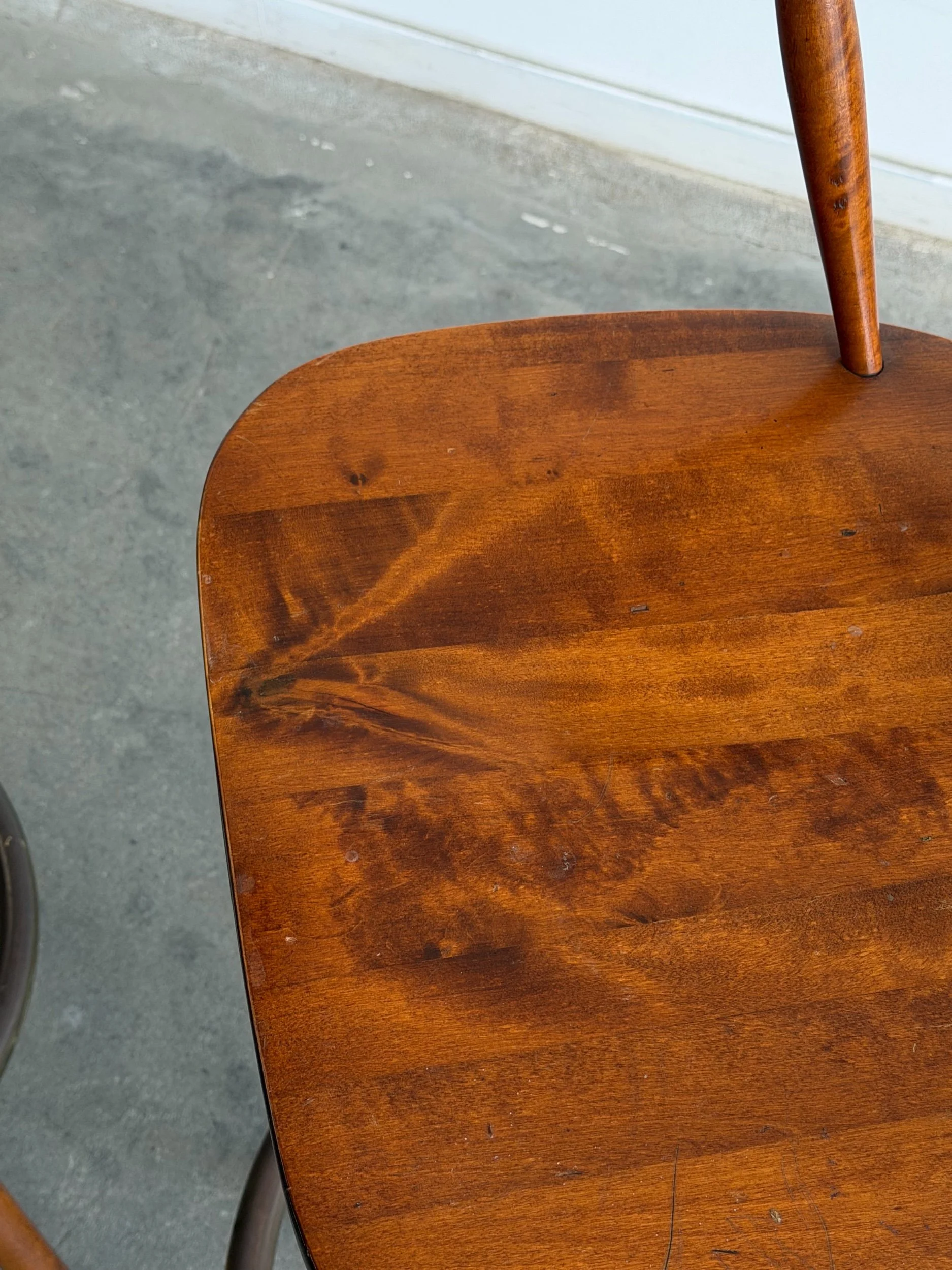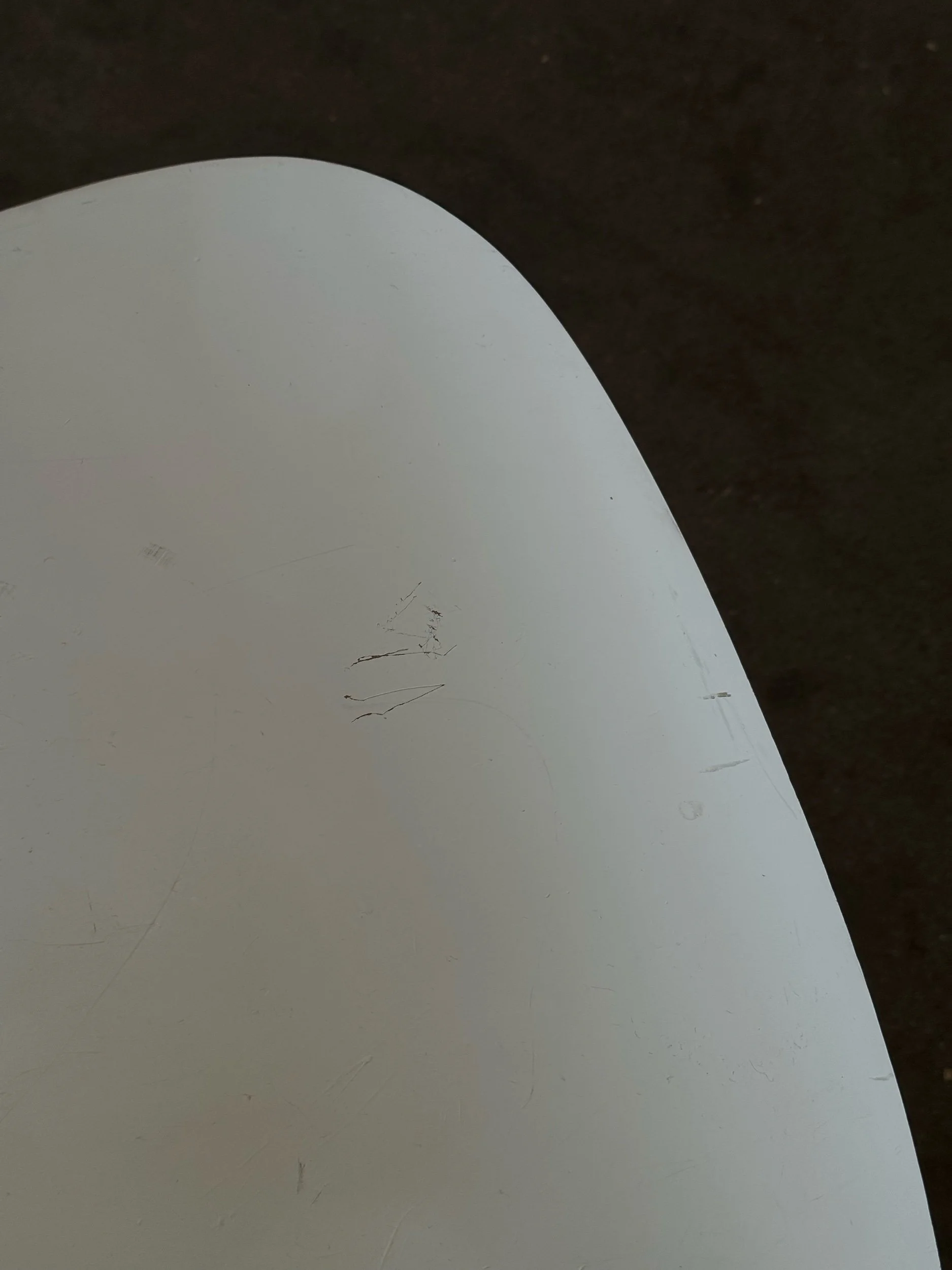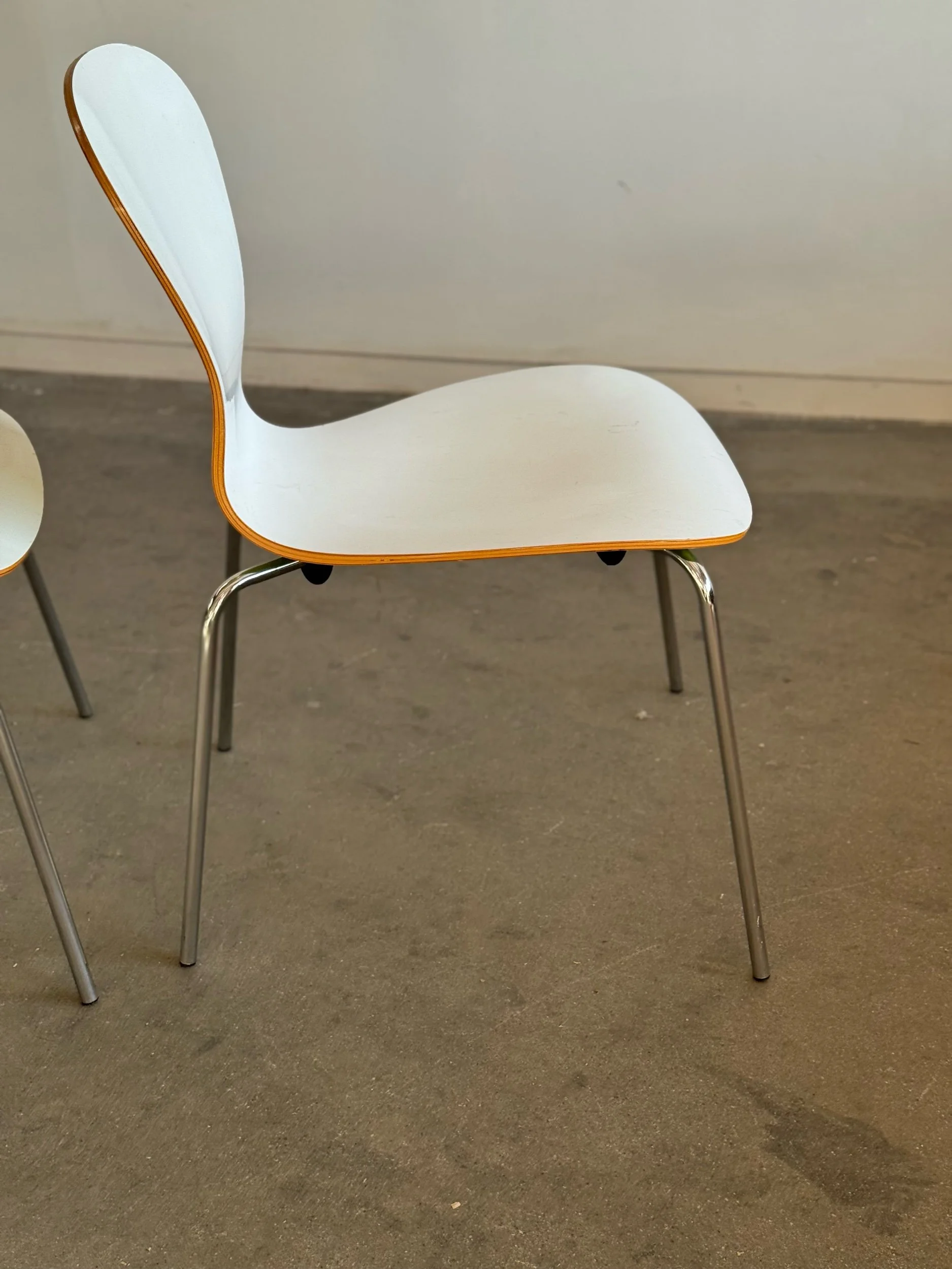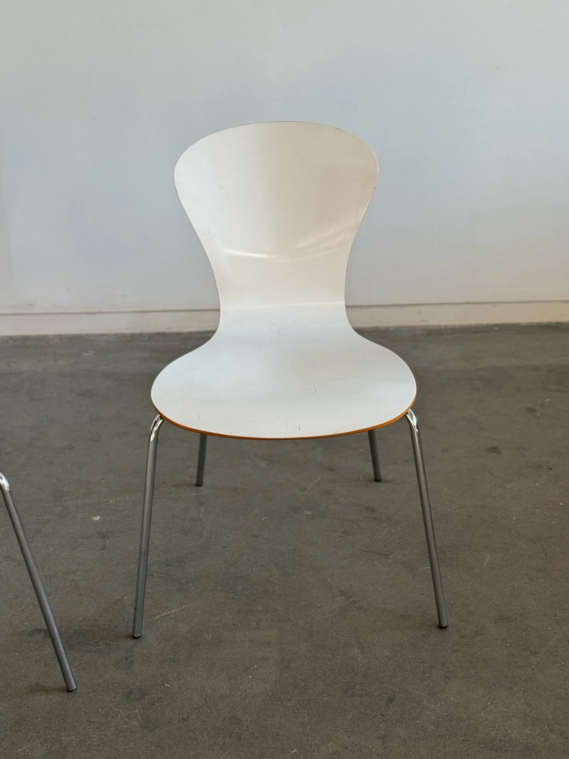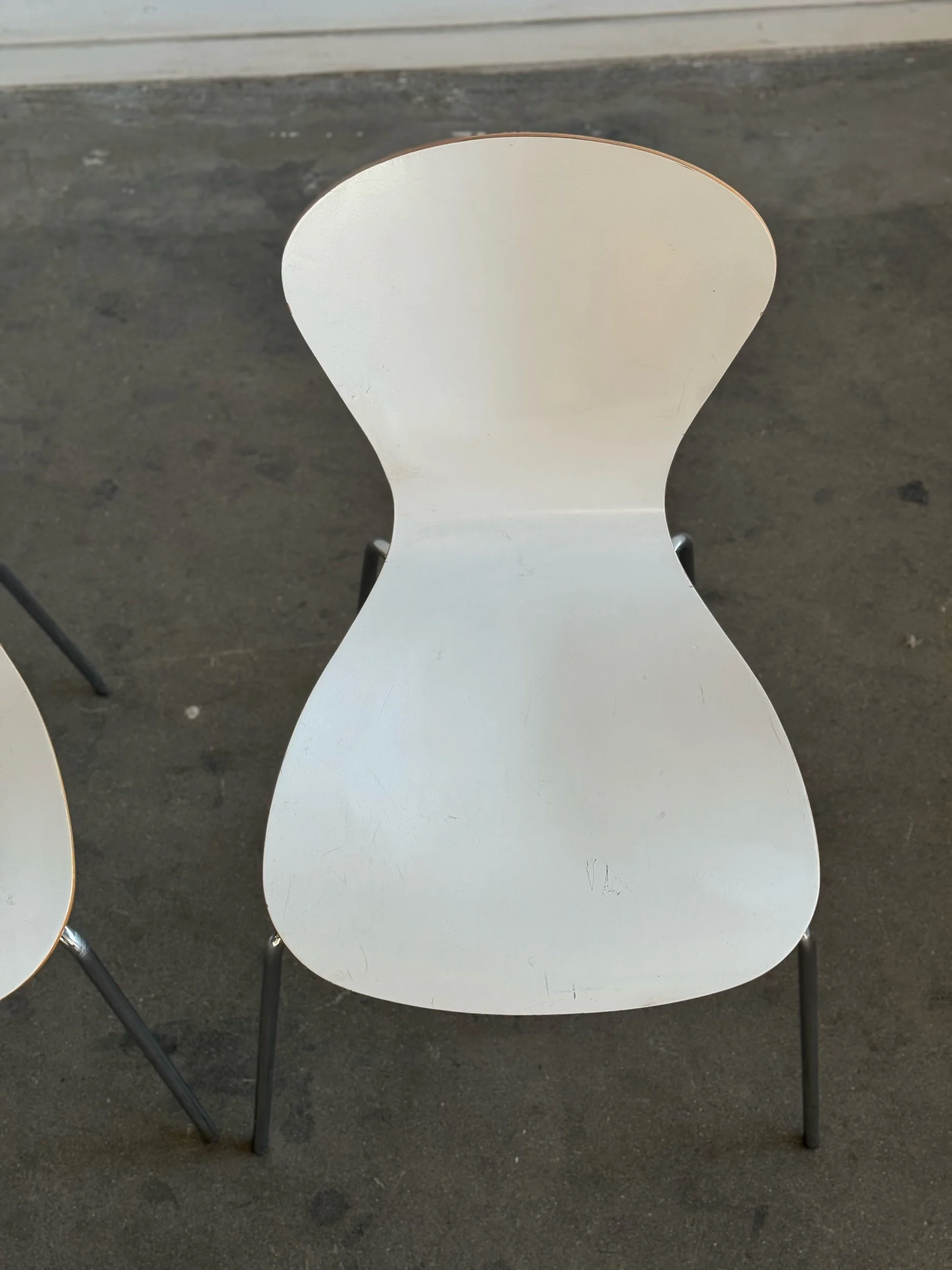 Designed by the visionary Ross Lovegrove, the Sprite Chair is a masterpiece of “organic essentialism.” It features a sinuous, molded plywood shell that appears to wrap around the sitter, providing surprising comfort within a sleek, sculptural silhouette. This specific pair features a striking two-tone aesthetic: a clean White face with a vibrant Lime Green back, mounted on a polish chrome tubular steel base.