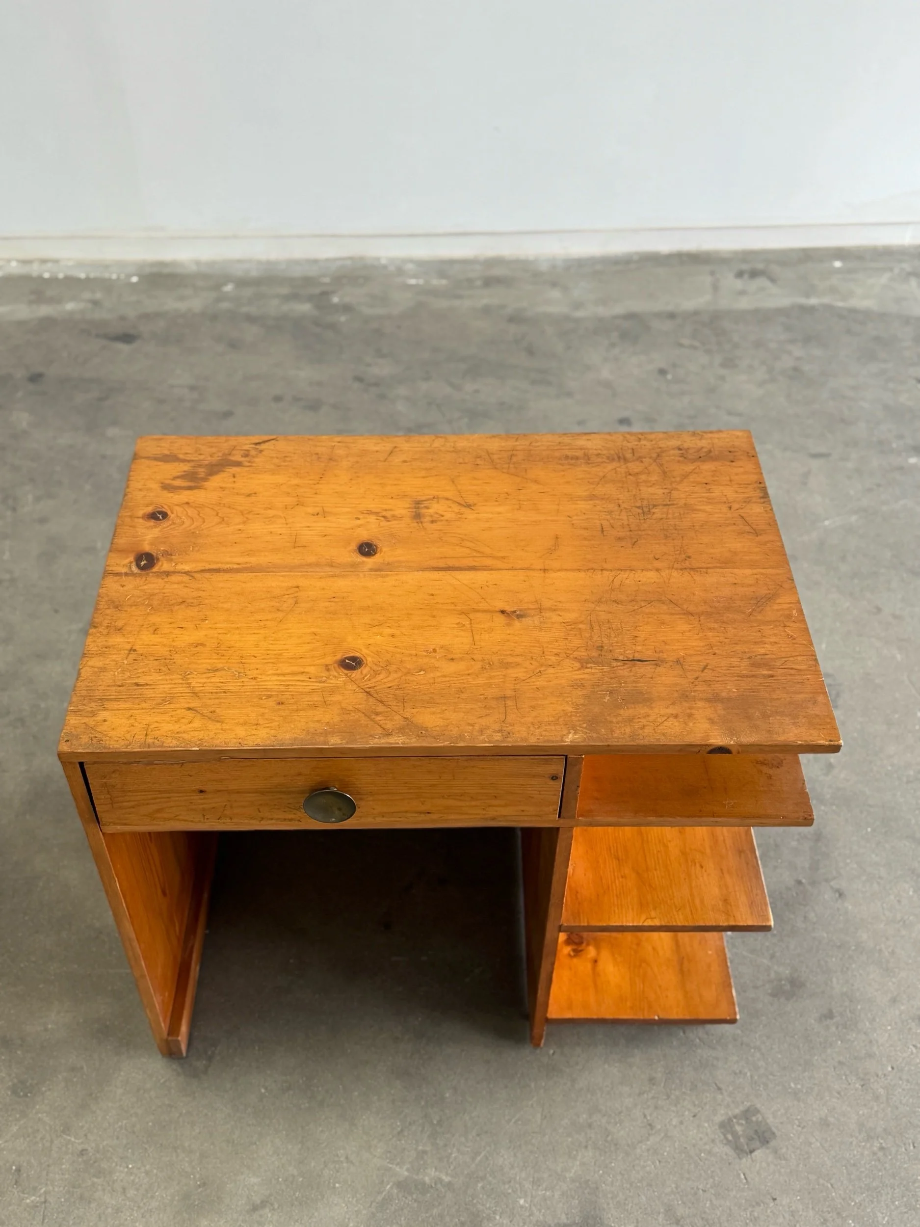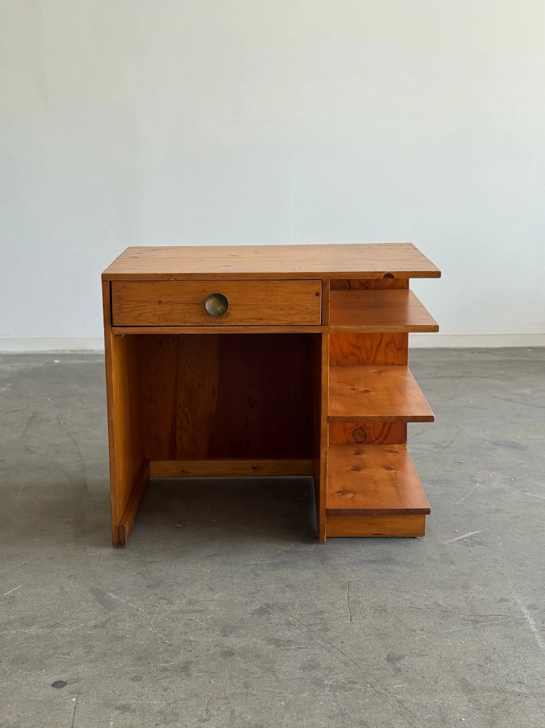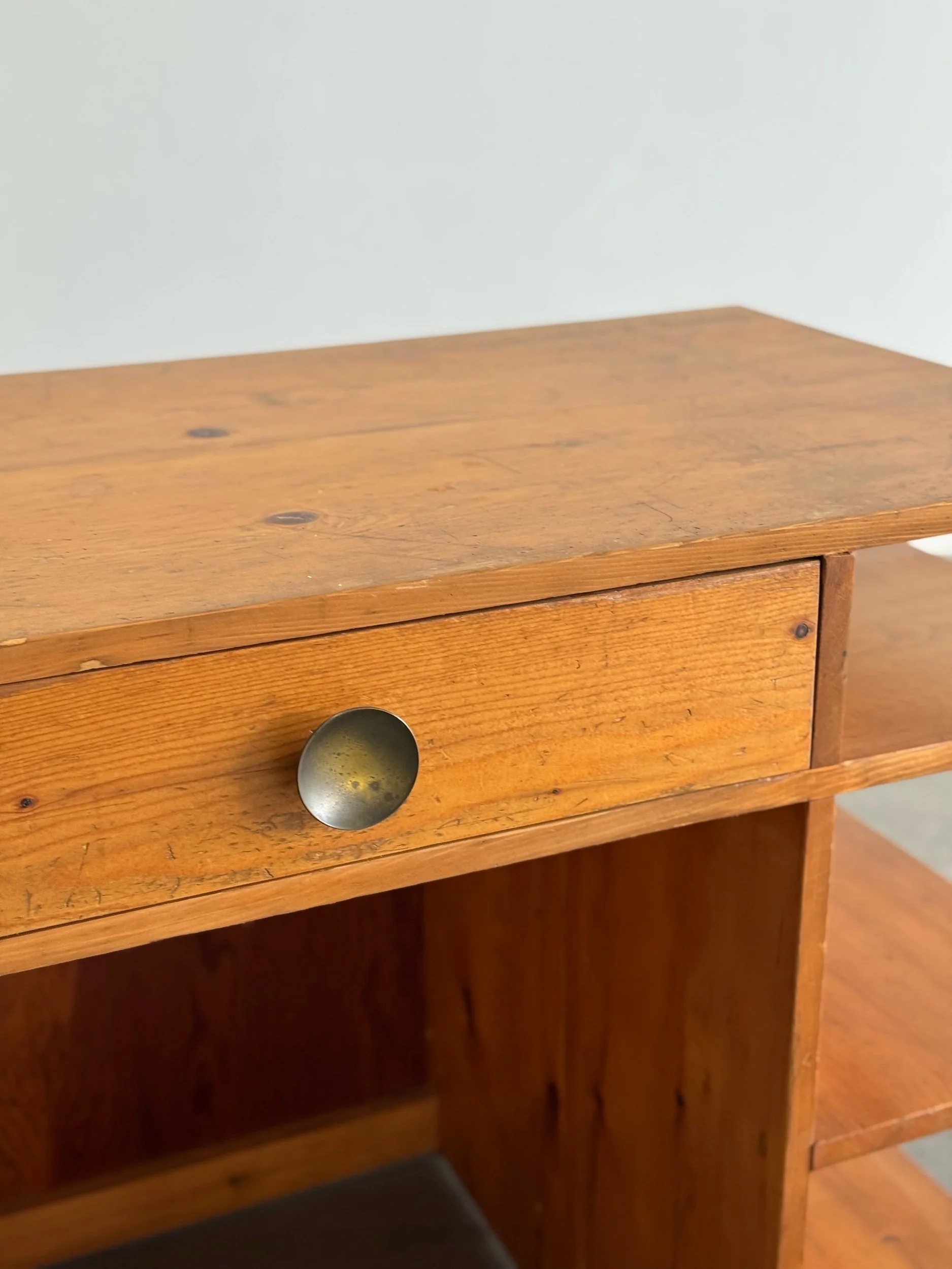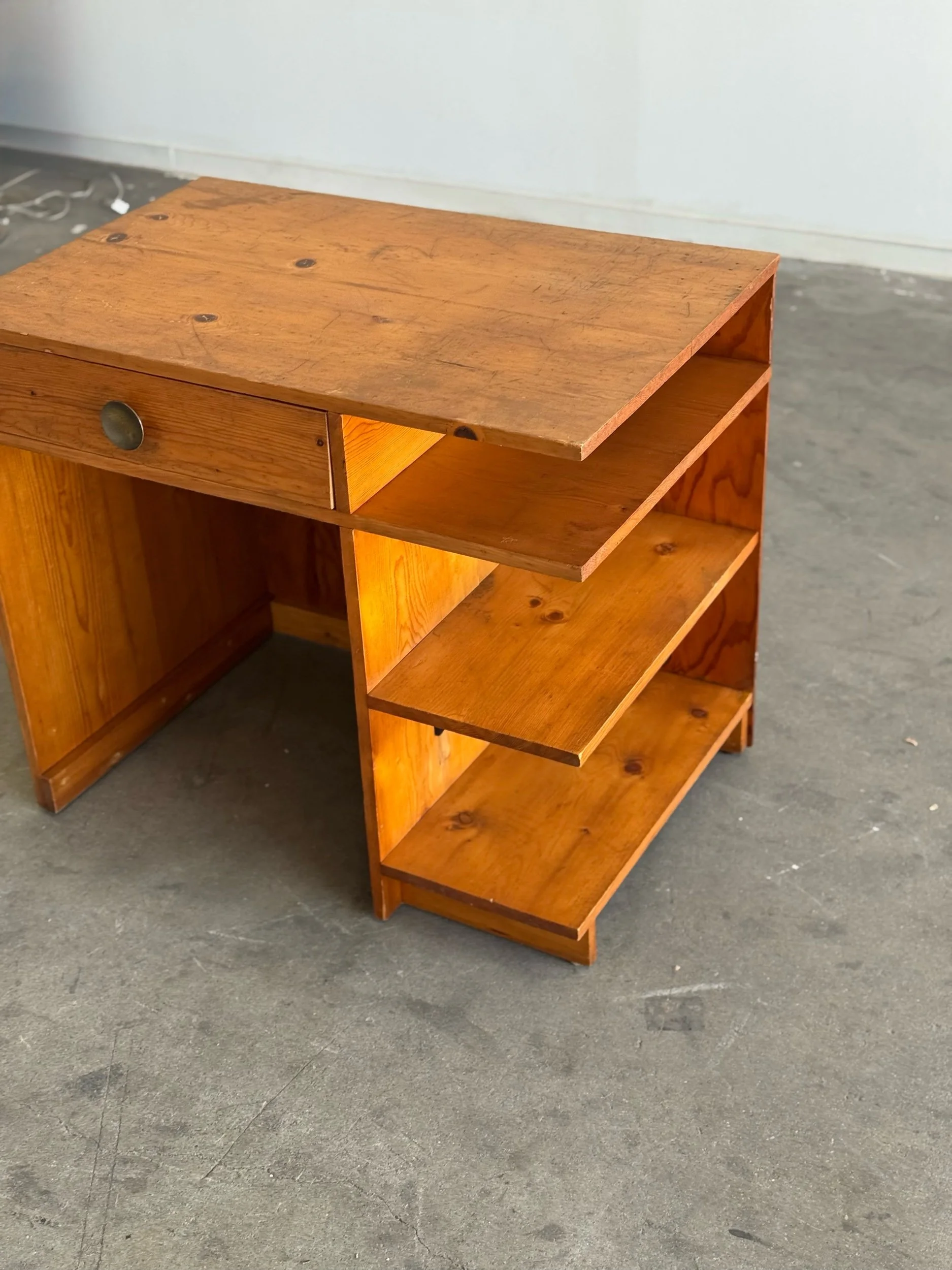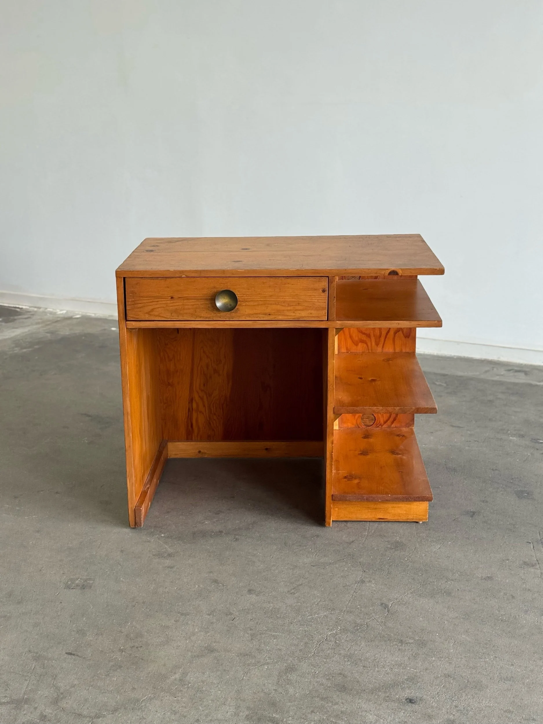 Mid-Century classic pine writing desk, featuring a single drawer with a brass handle and an open 3-tier shelving unit. Available in as-is vintage condition with flaws on the desk pictured above.