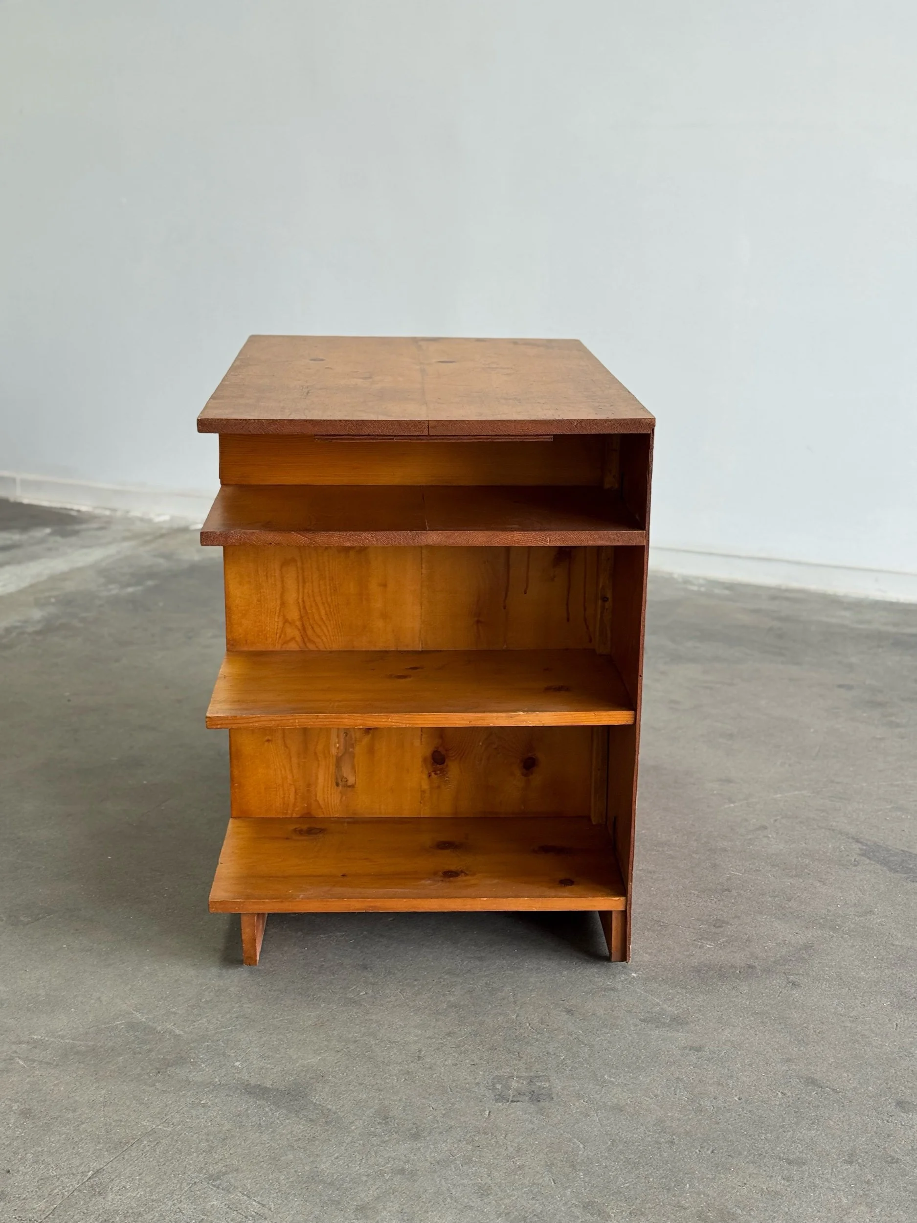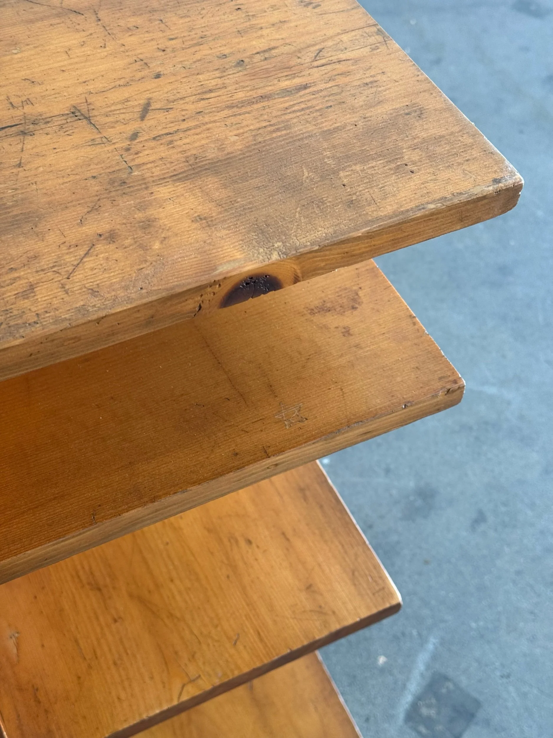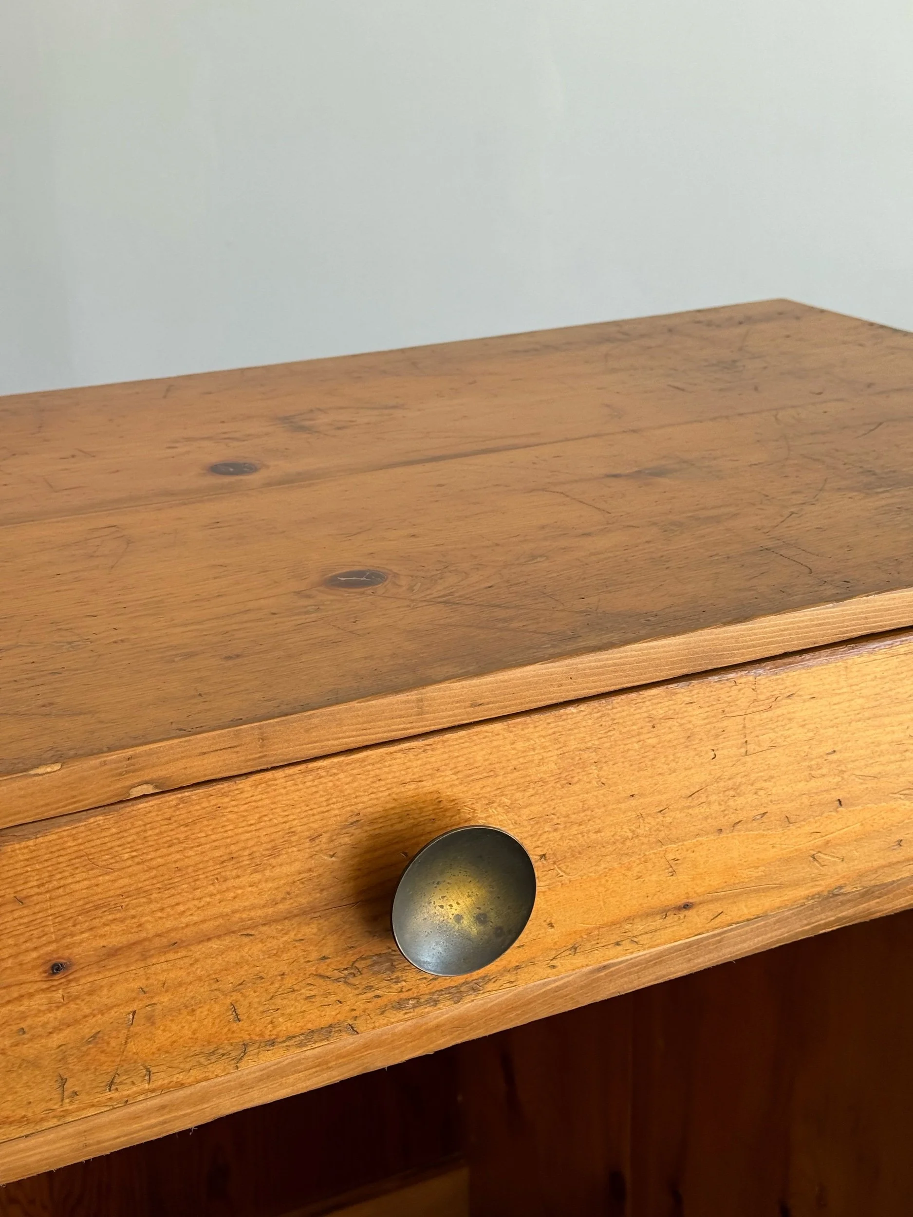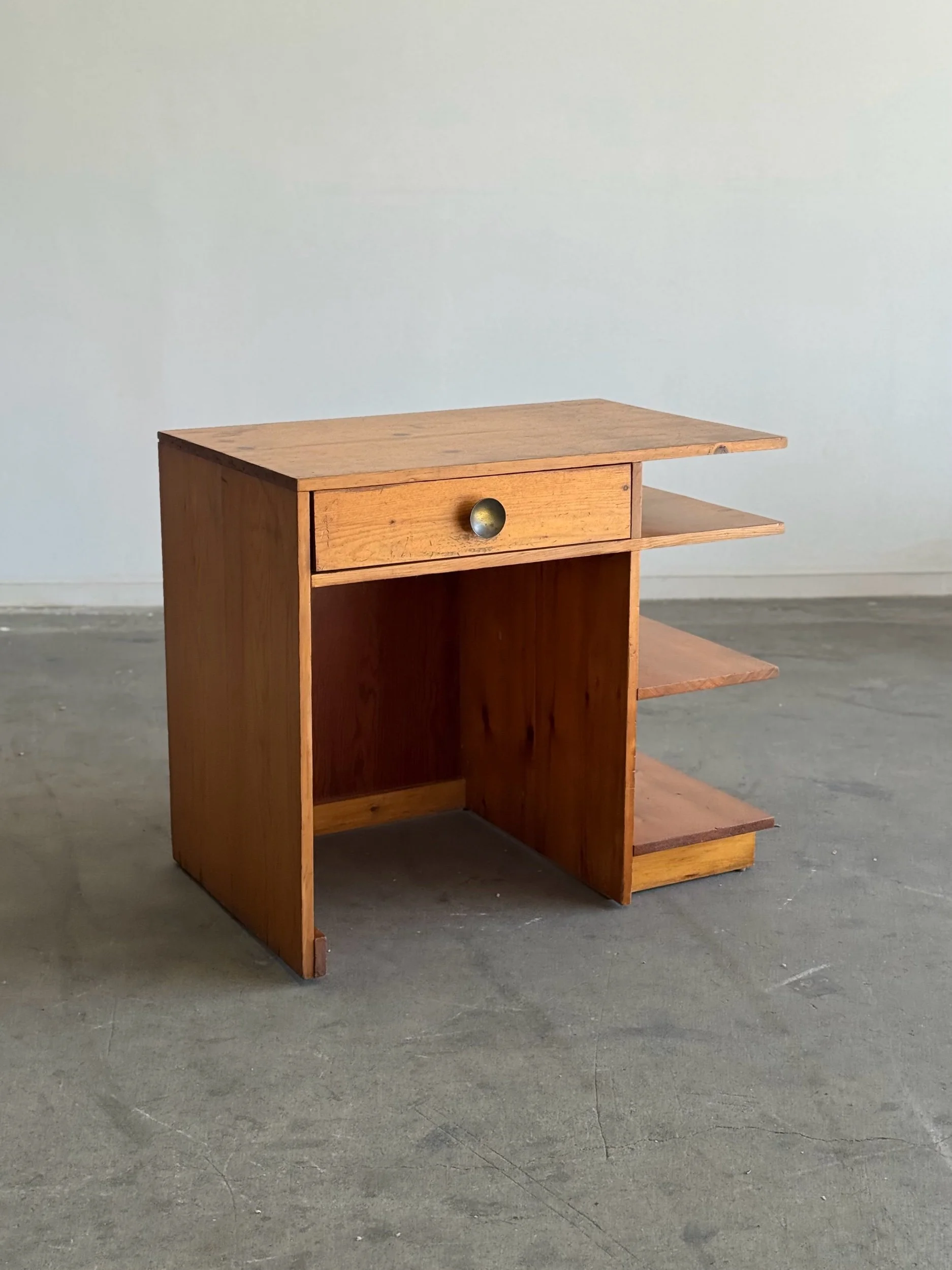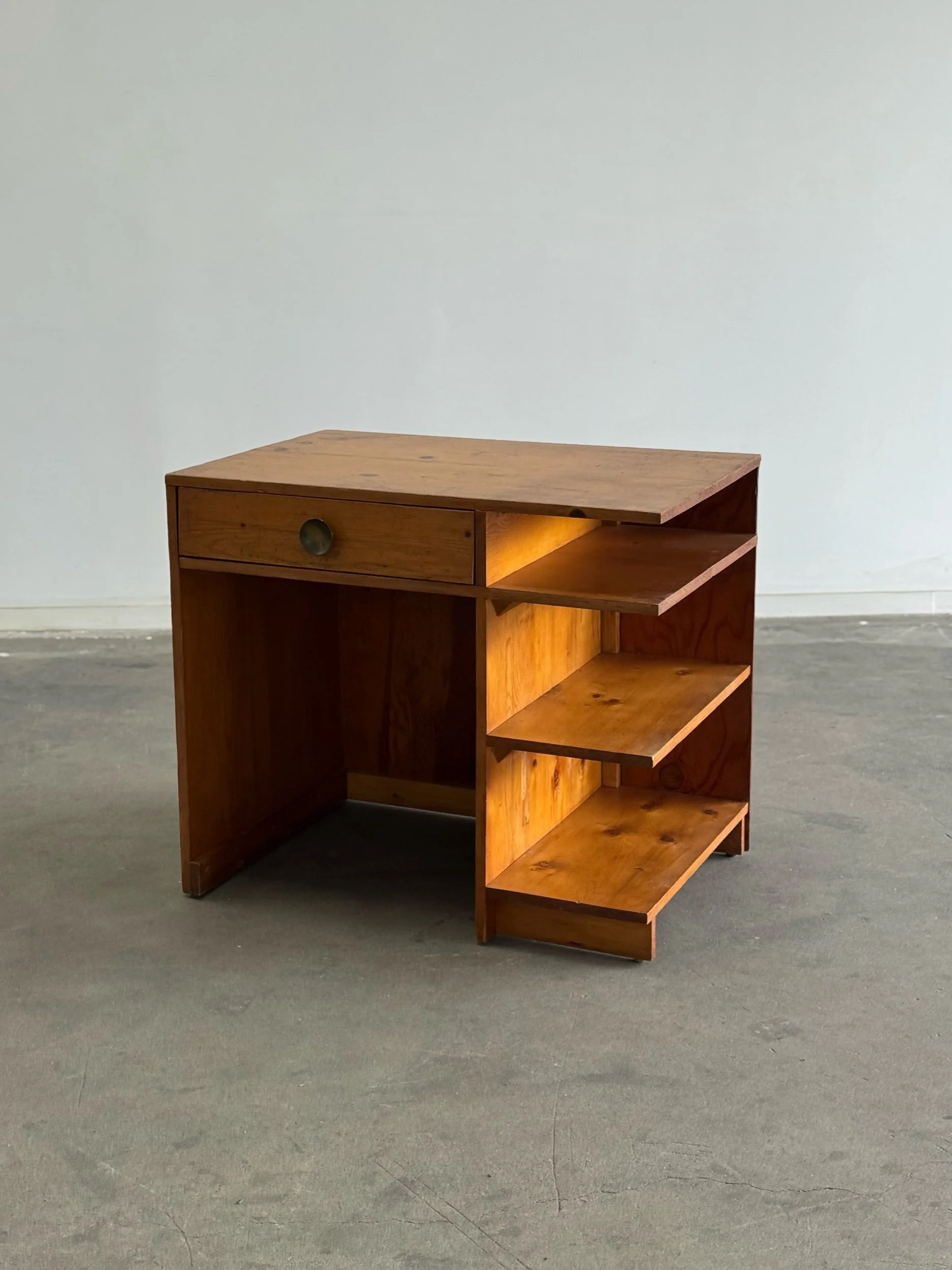 Mid-Century classic pine writing desk, featuring a single drawer with a brass handle and an open 3-tier shelving unit. Available in as-is vintage condition with flaws on the desk pictured above.