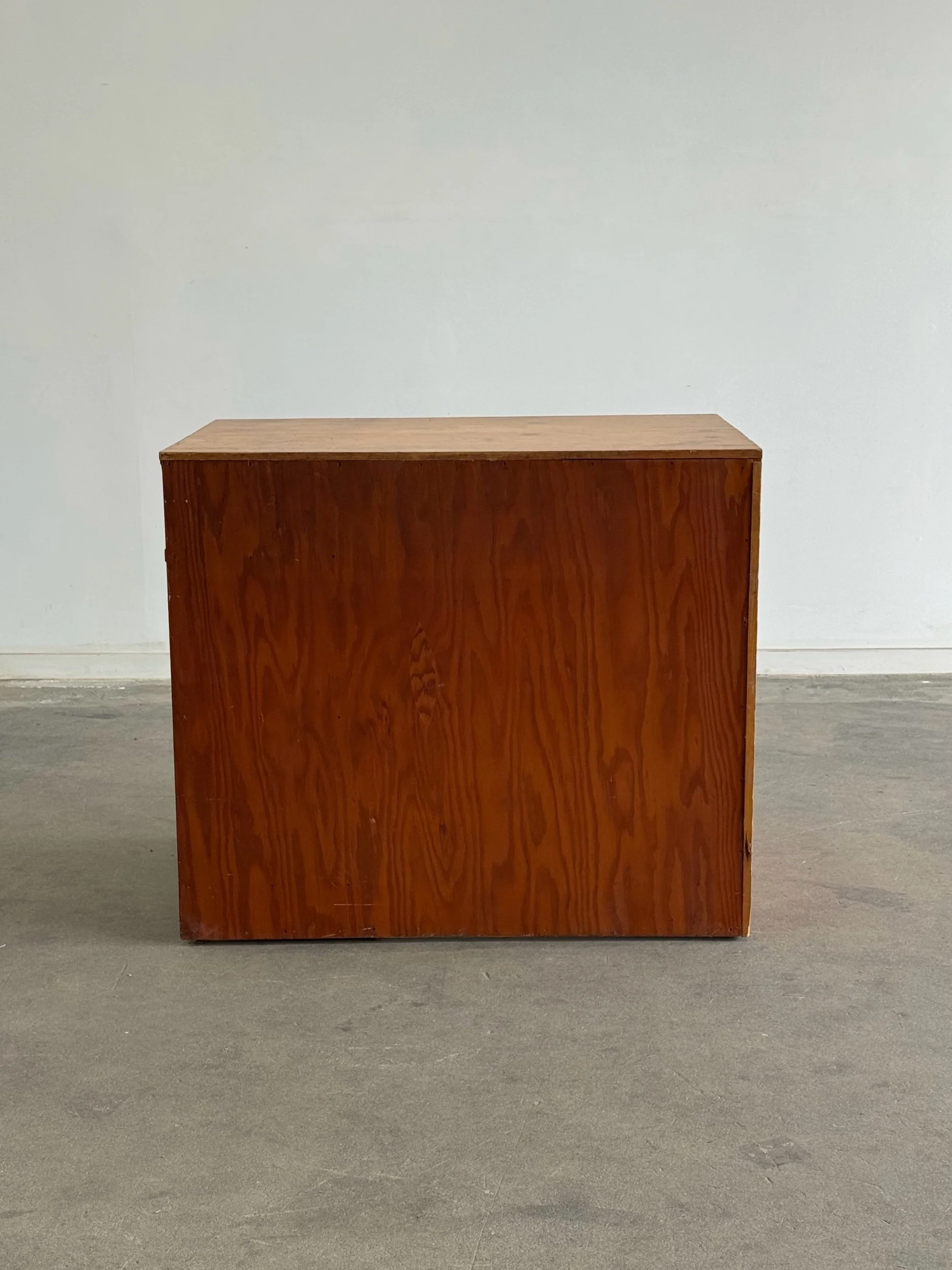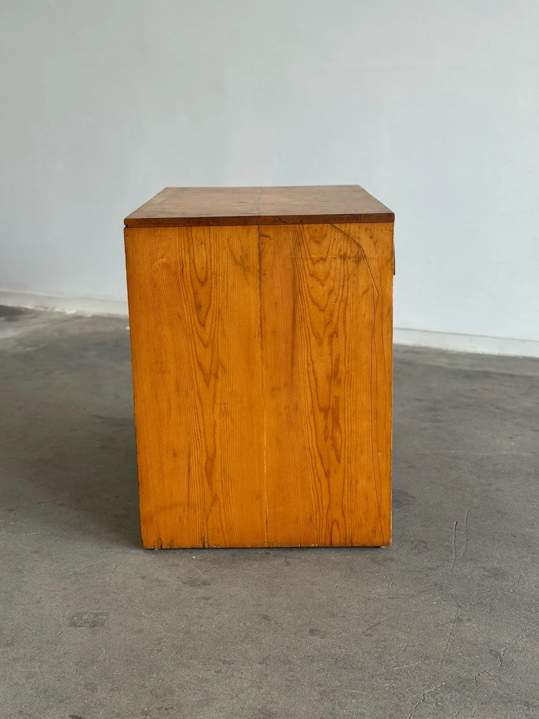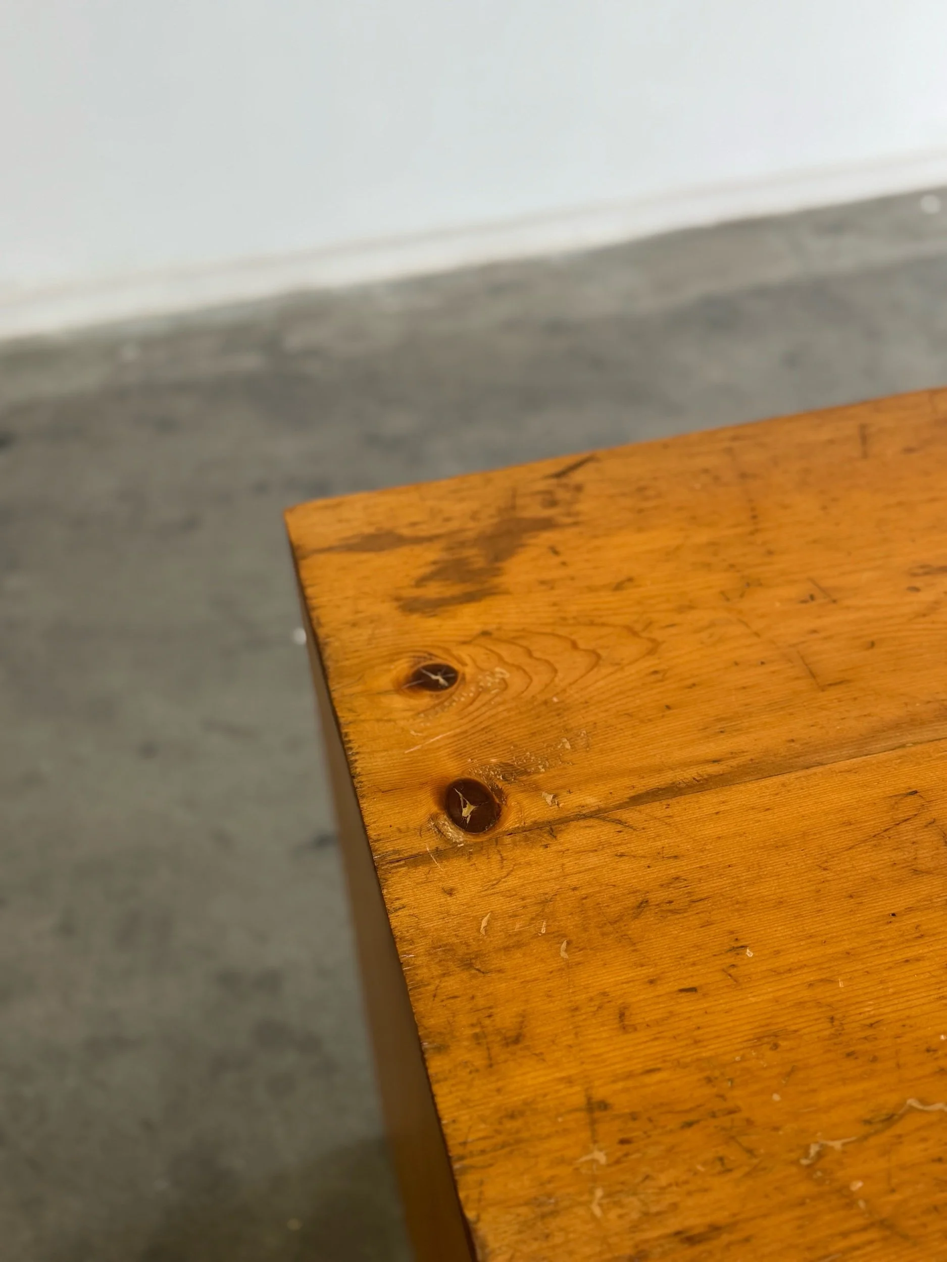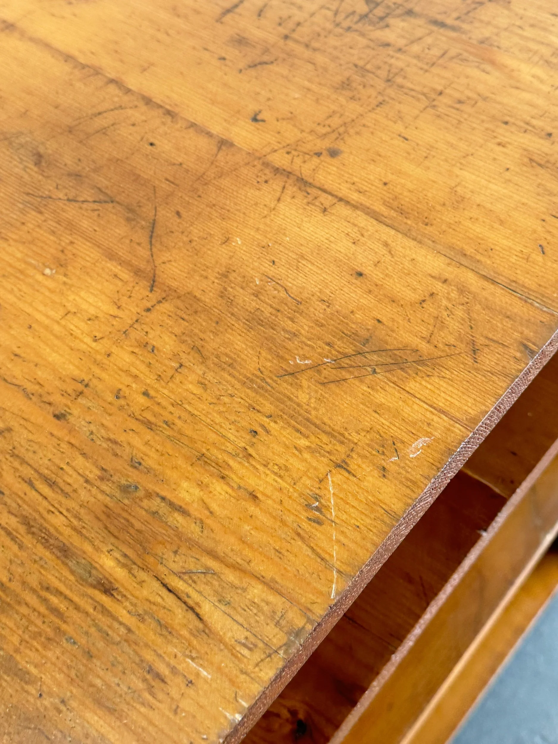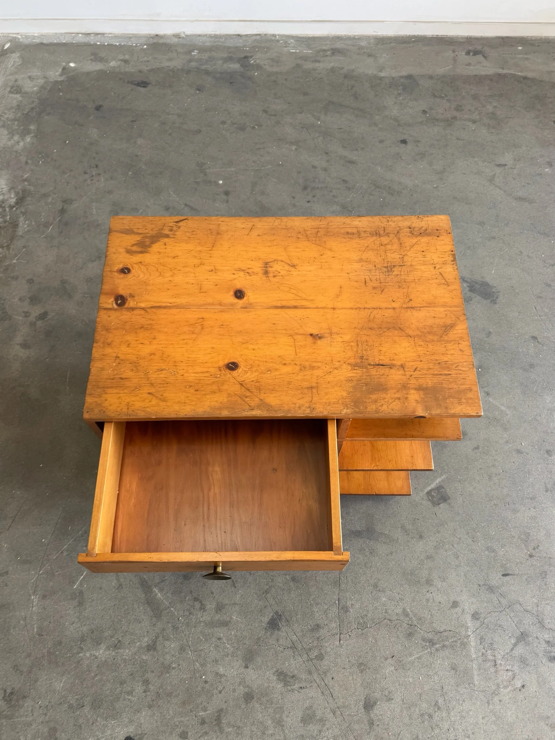 Mid-Century classic pine writing desk, featuring a single drawer with a brass handle and an open 3-tier shelving unit. Available in as-is vintage condition with flaws on the desk pictured above.