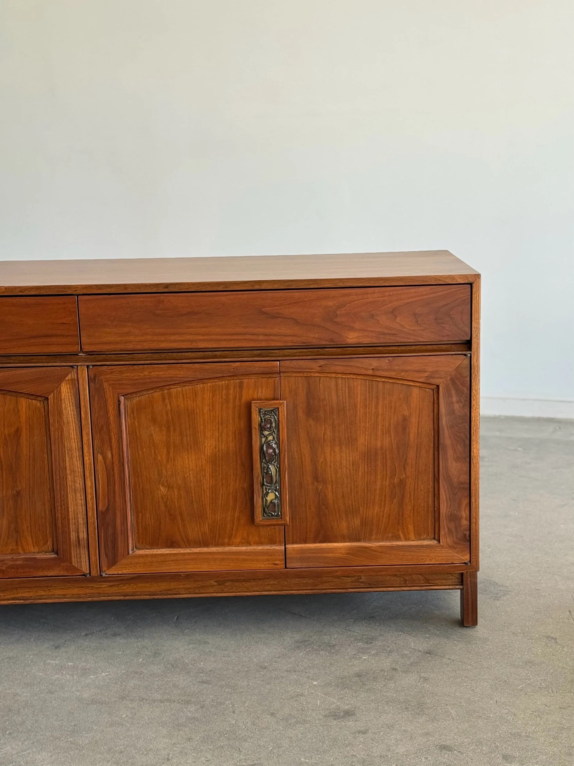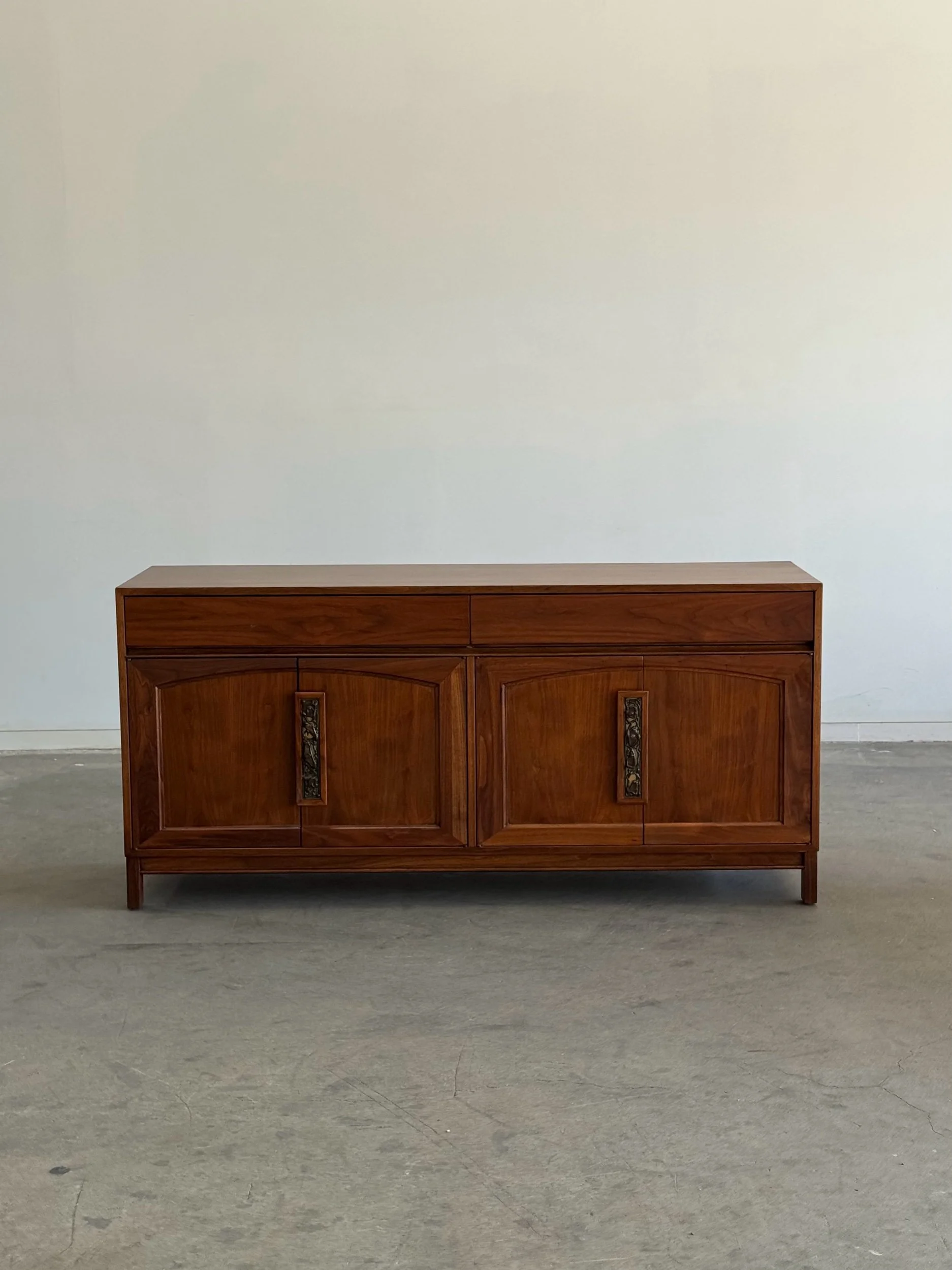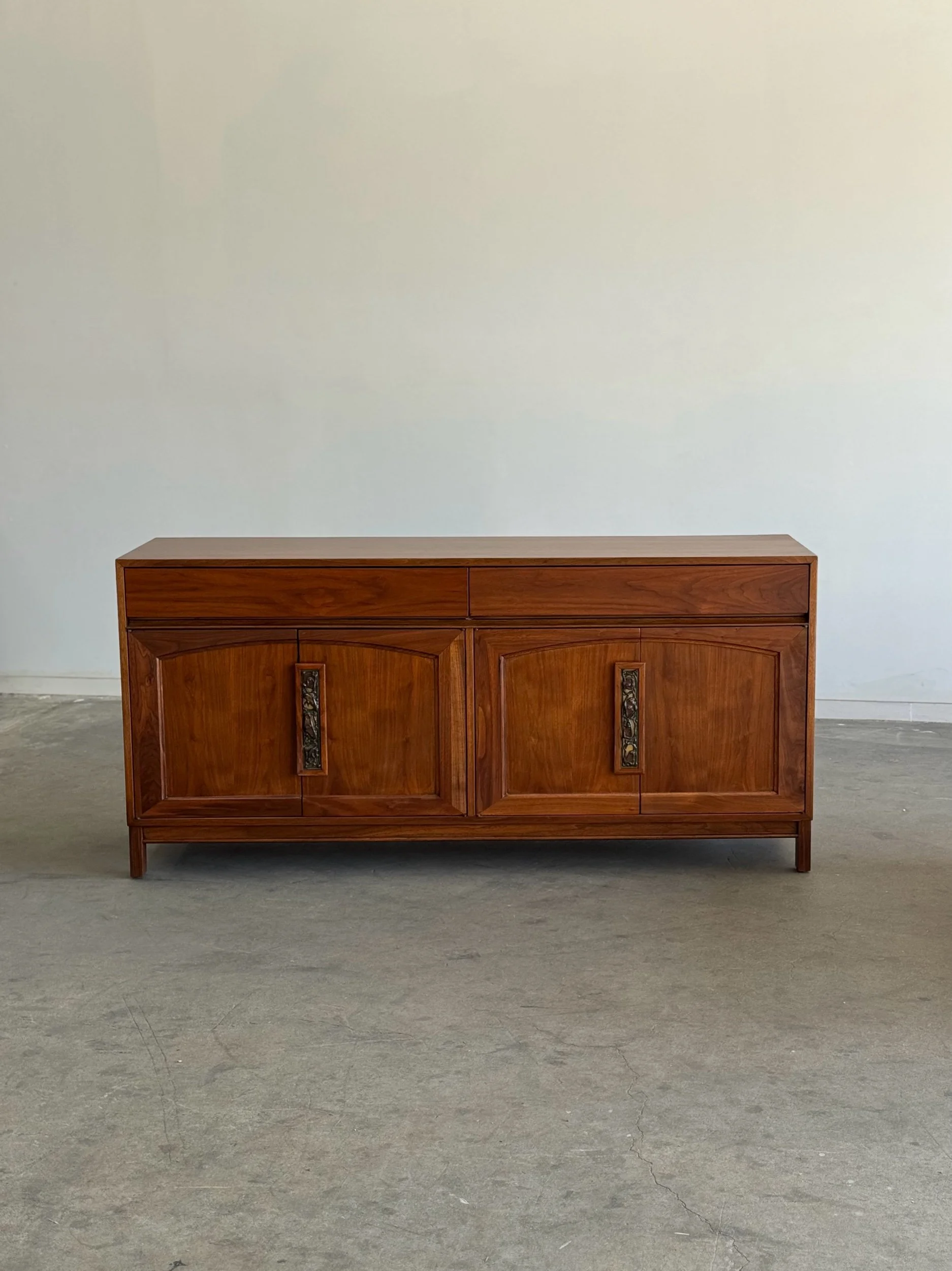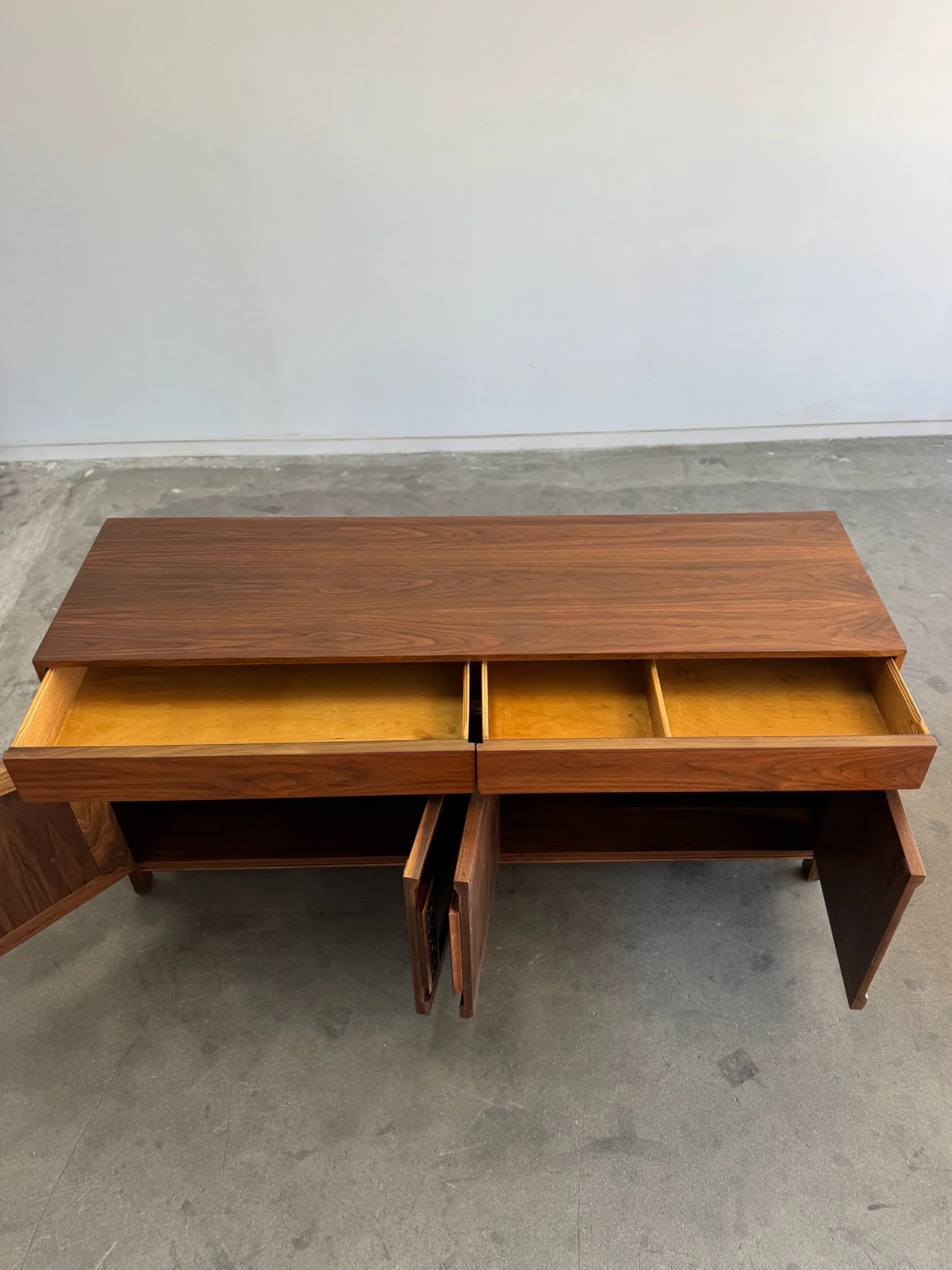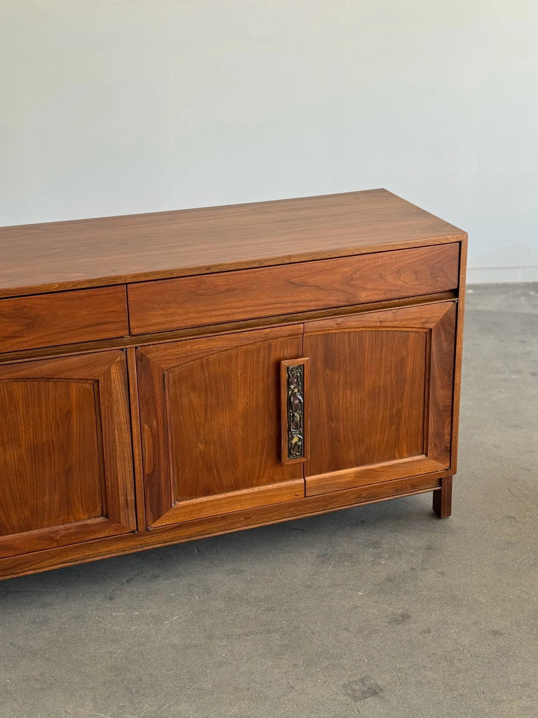 Fully restored walnut credenza in great condition. Item offers sculpted doors, original hardware, and a solid walnut base. Unit is structurally sound and fully functional. Unit offers two removable shelves.