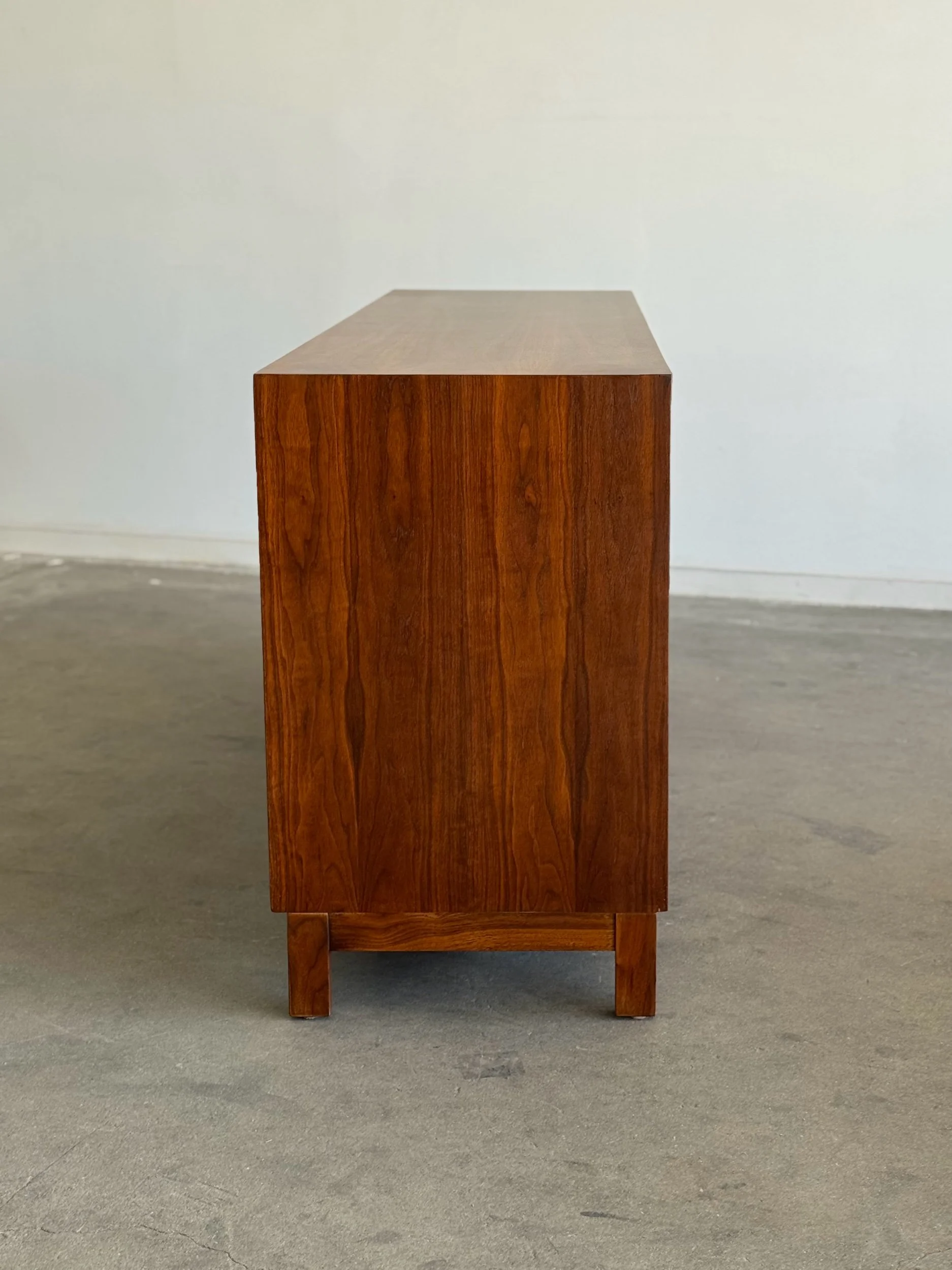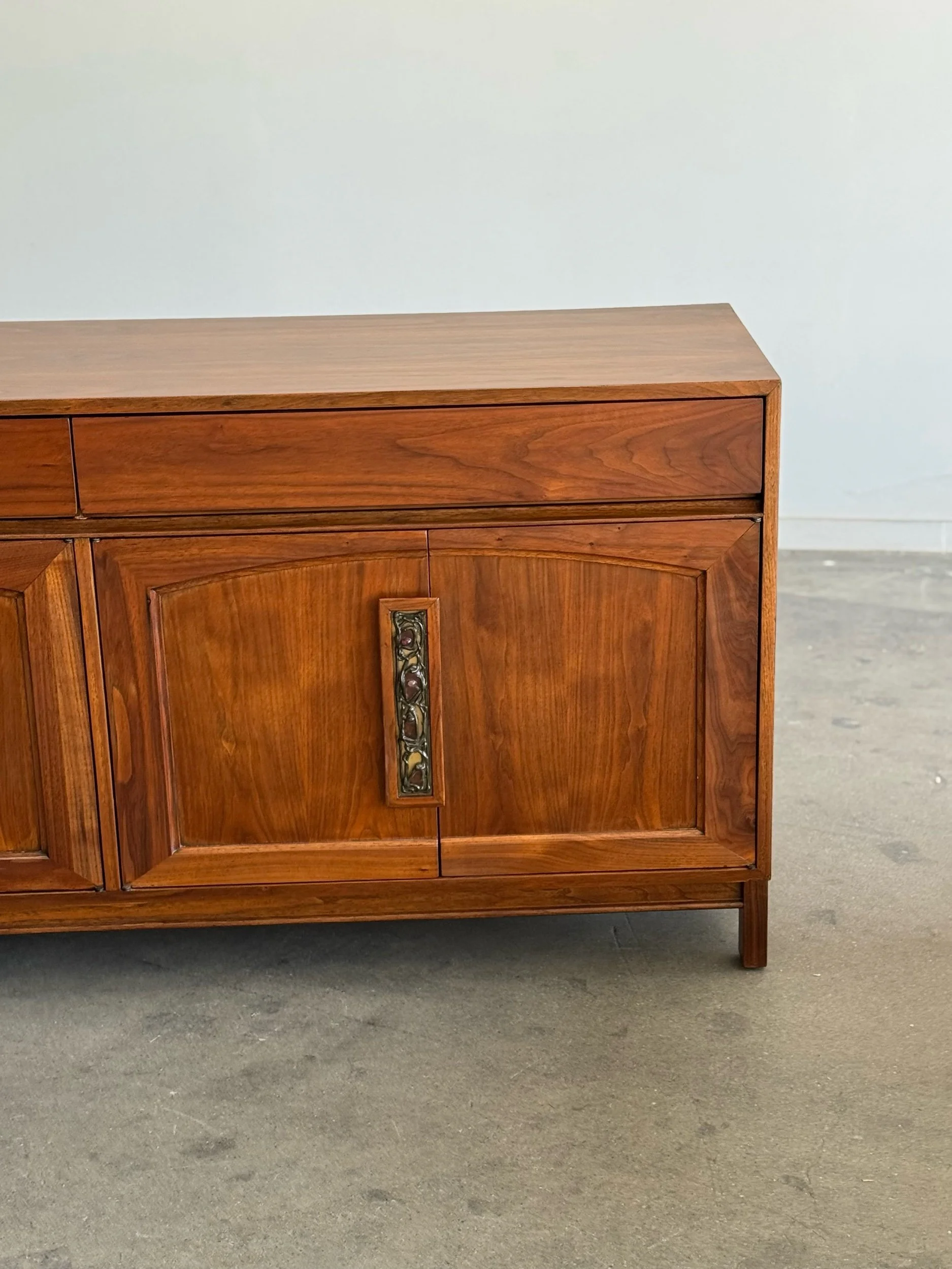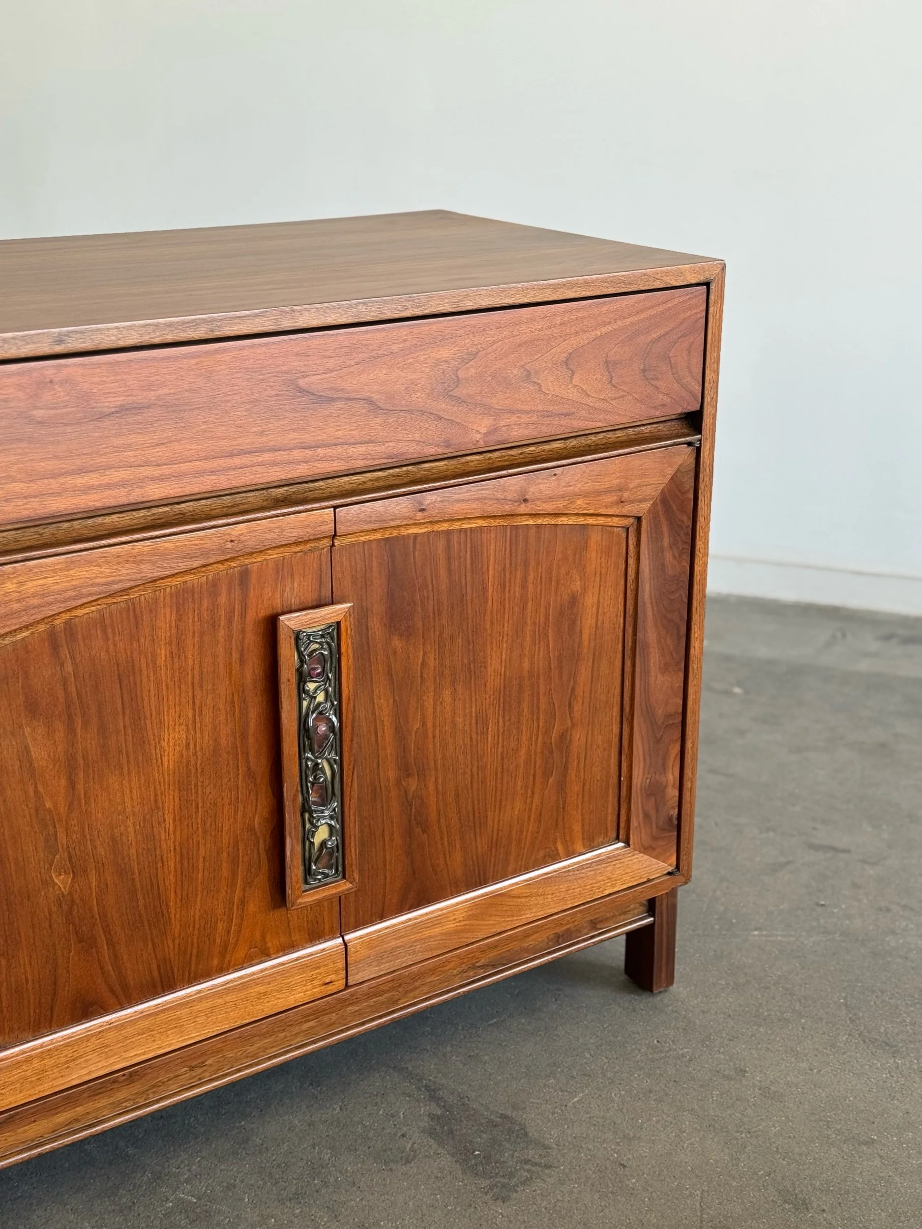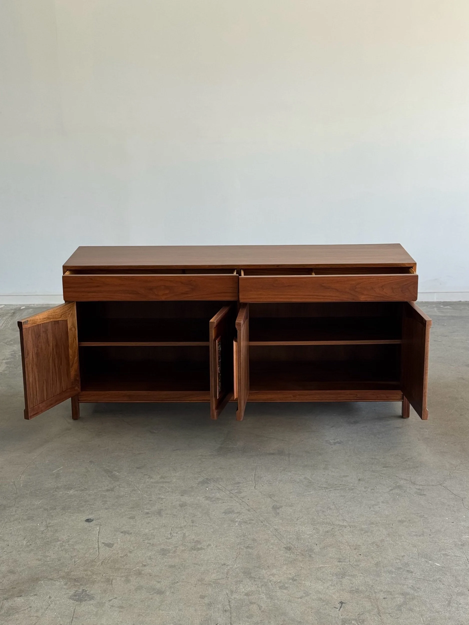Fully restored walnut credenza in great condition. Item offers sculpted doors, original hardware, and a solid walnut base. Unit is structurally sound and fully functional. Unit offers two removable shelves.