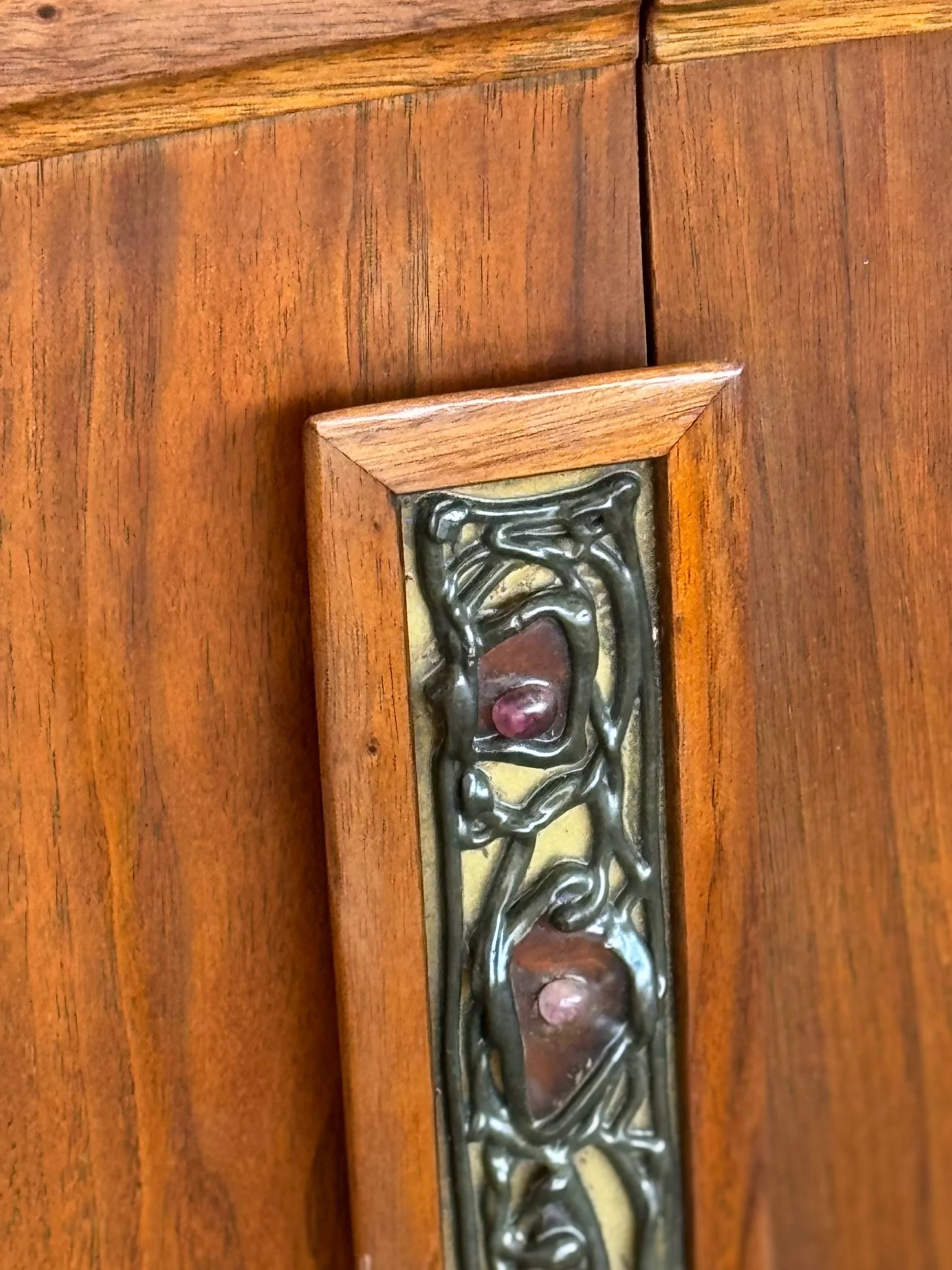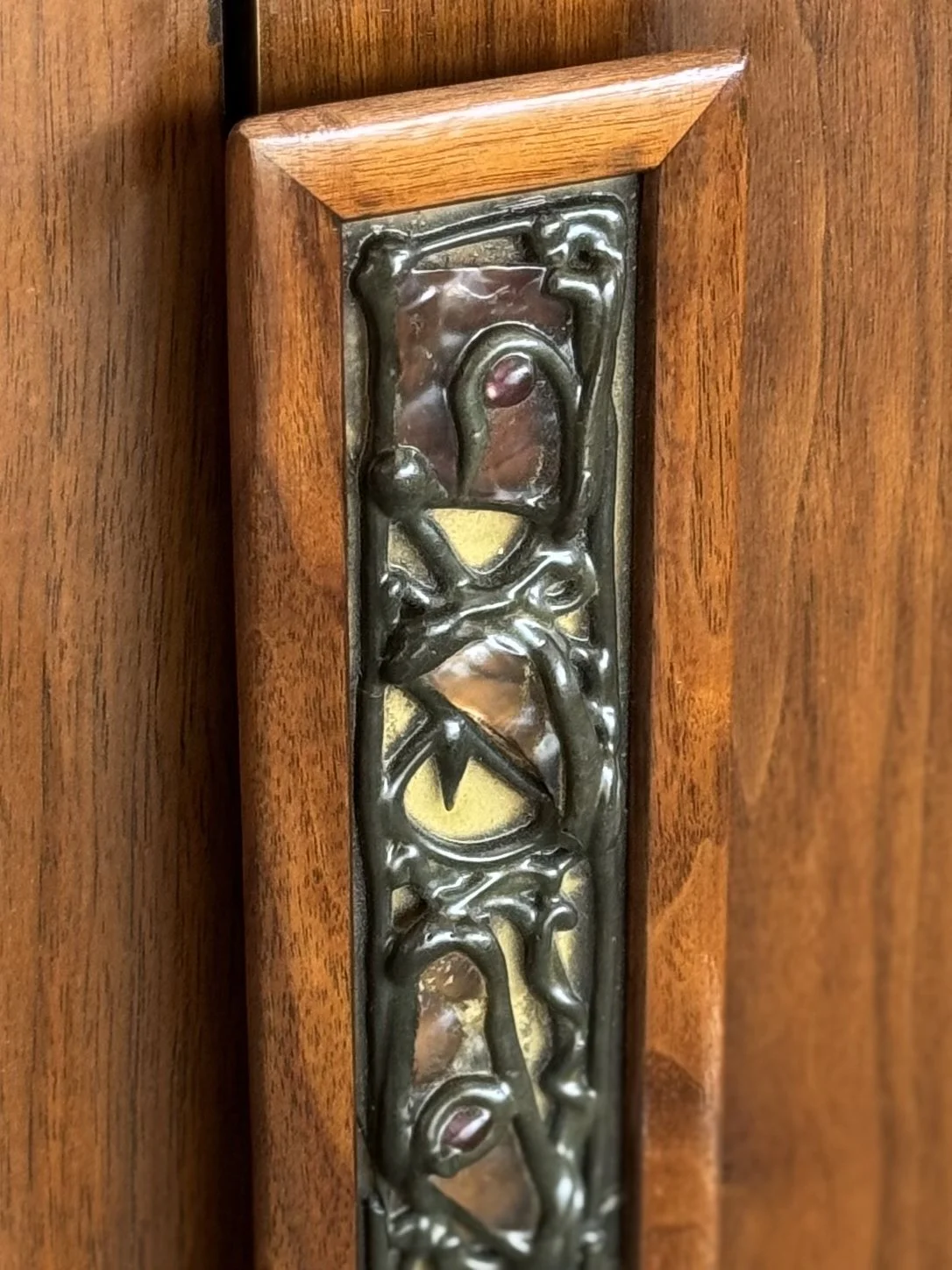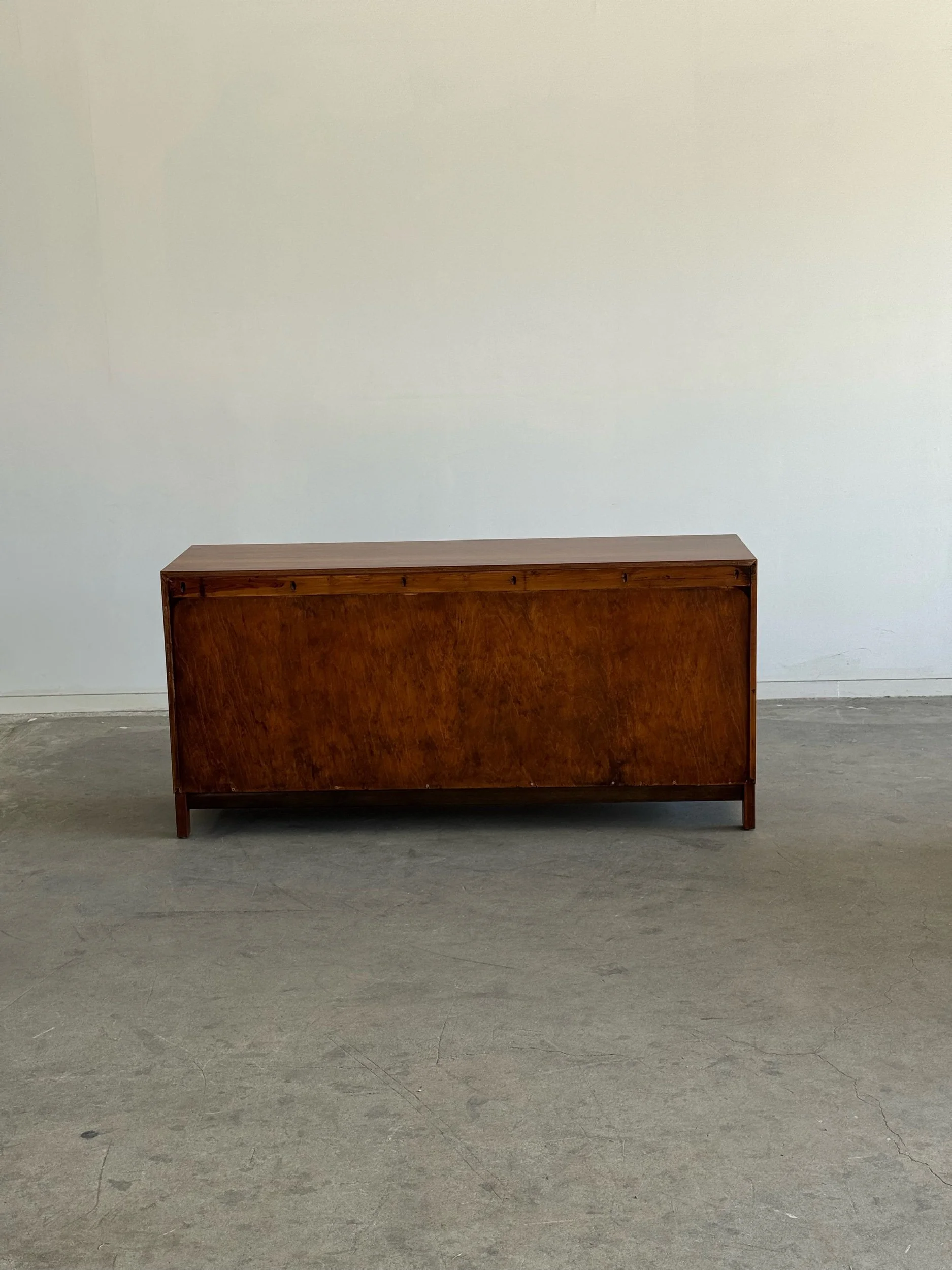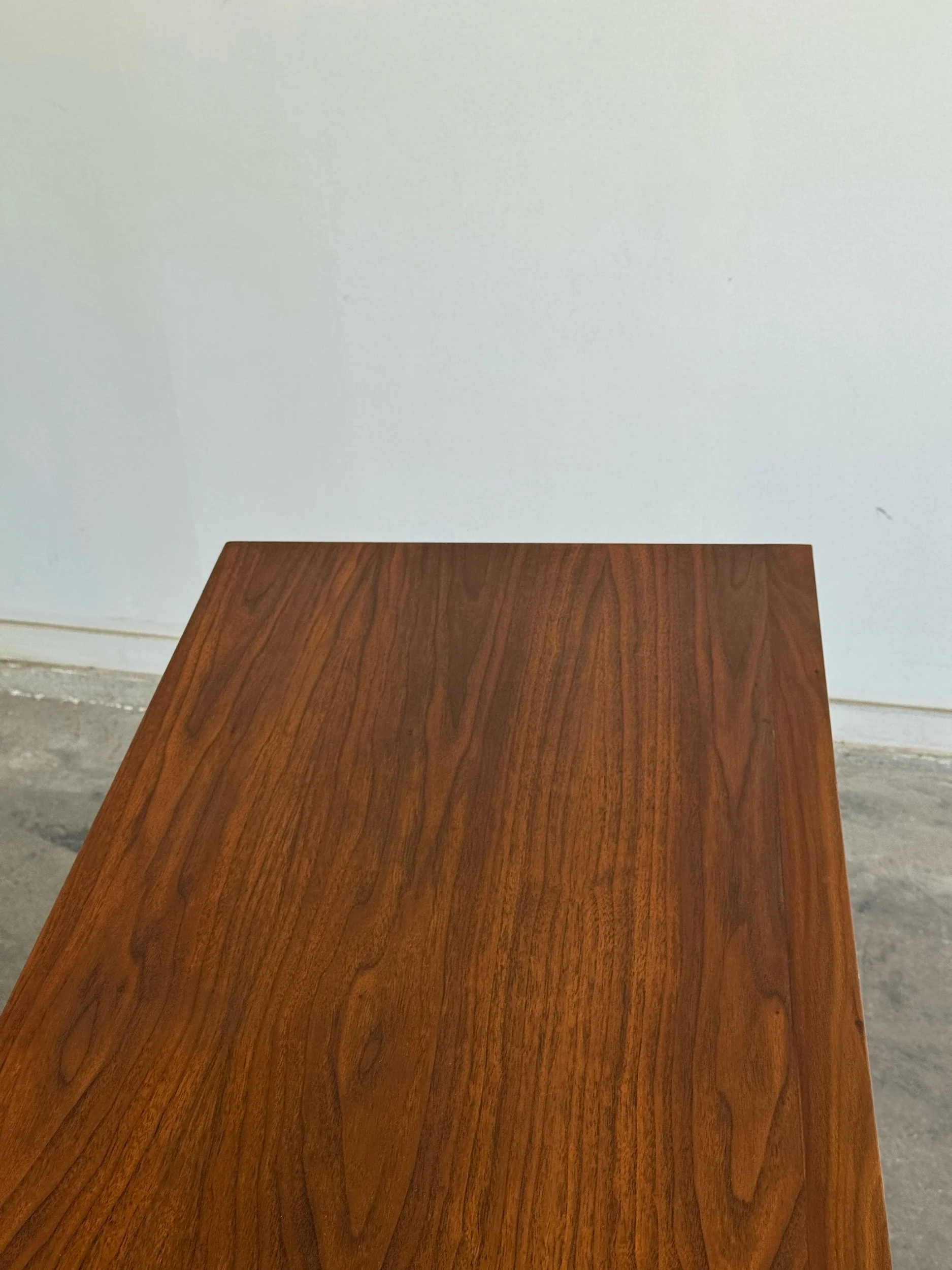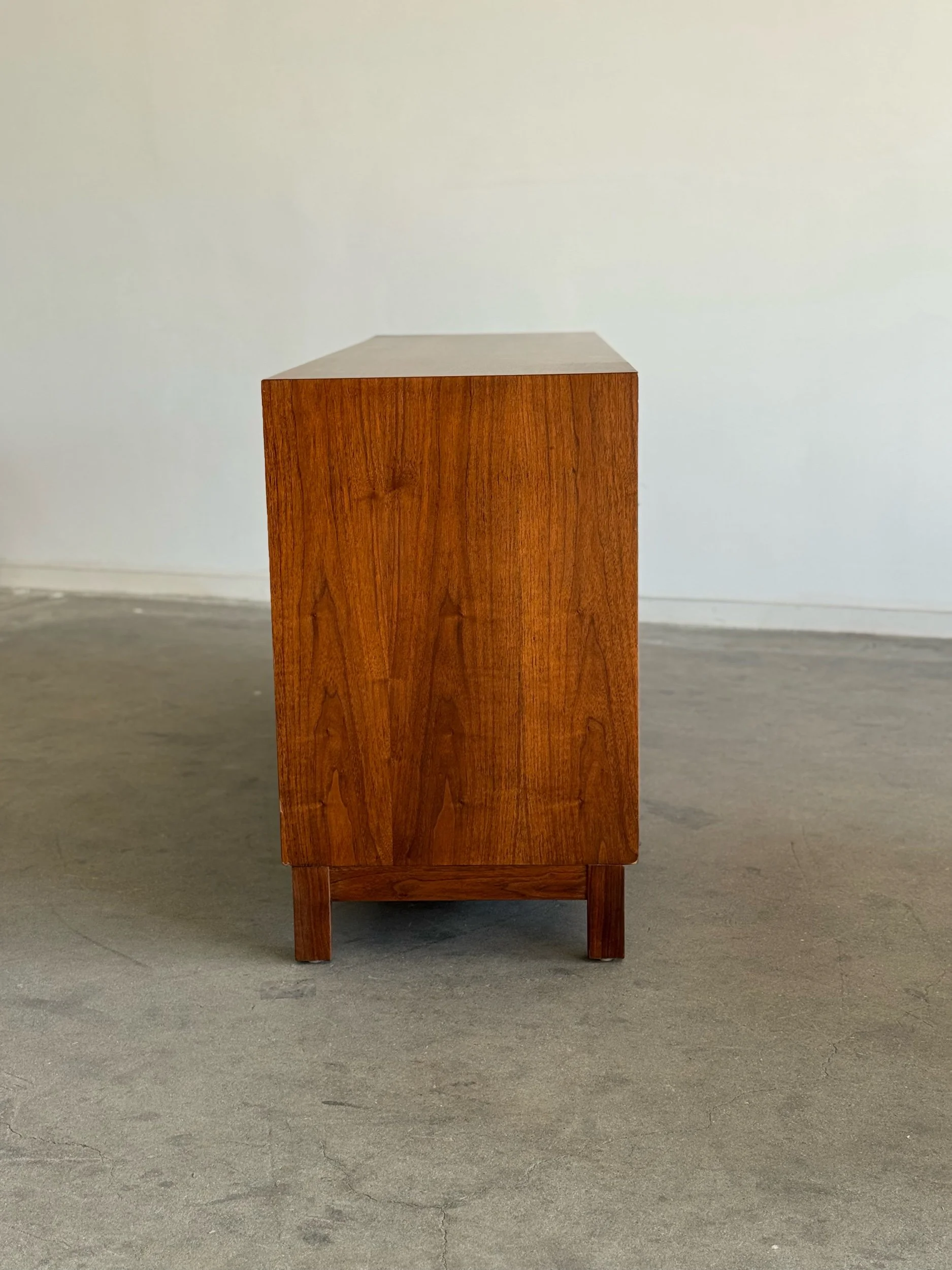 Fully restored walnut credenza in great condition. Item offers sculpted doors, original hardware, and a solid walnut base. Unit is structurally sound and fully functional. Unit offers two removable shelves.