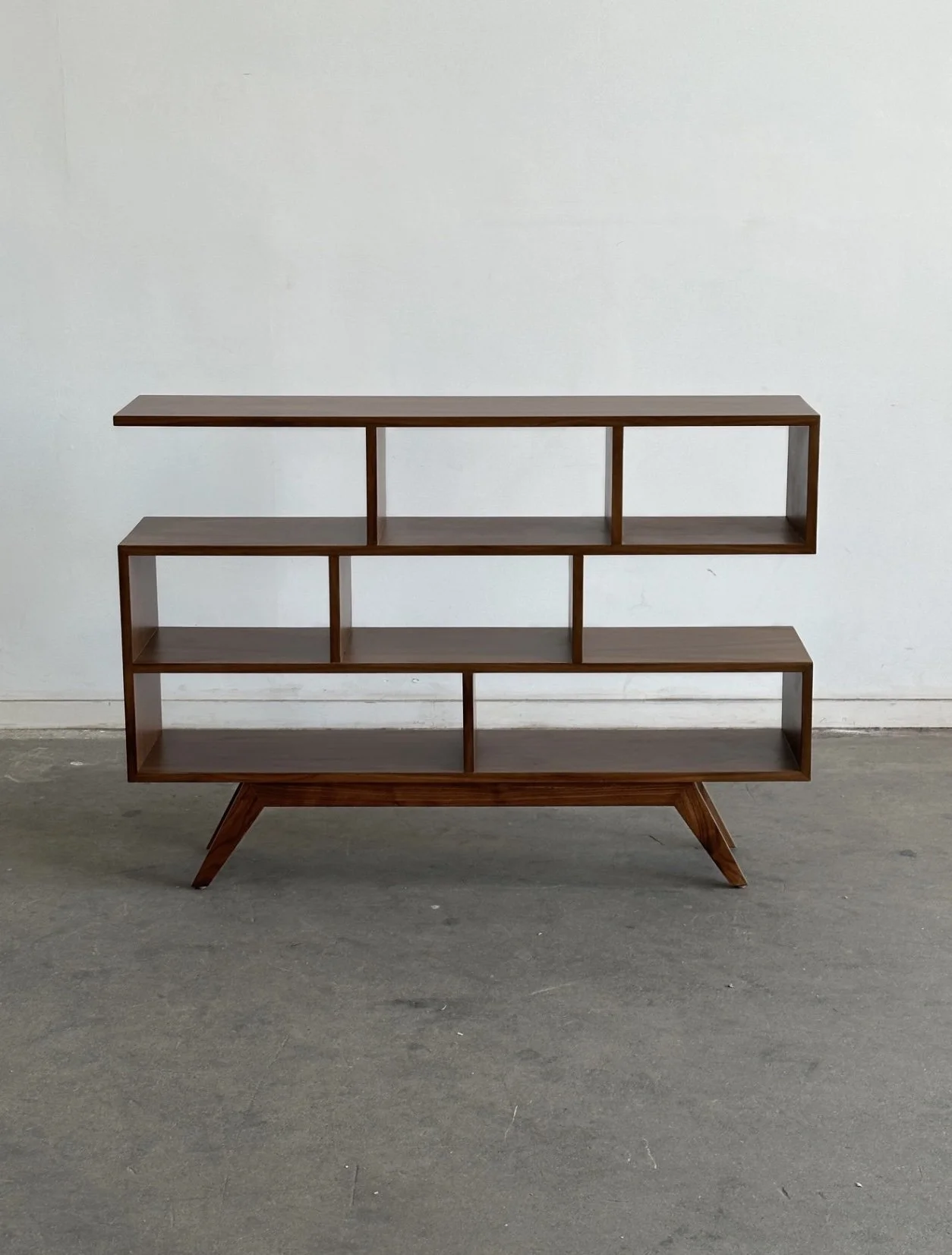This handcrafted asymmetrical petite bookcase offers ample open shelving, with strong vertical and horizontal lines giving it a light architectural feel. Finished in a very light walnut stain that highlights the woods natural grain and warm tonal variation.