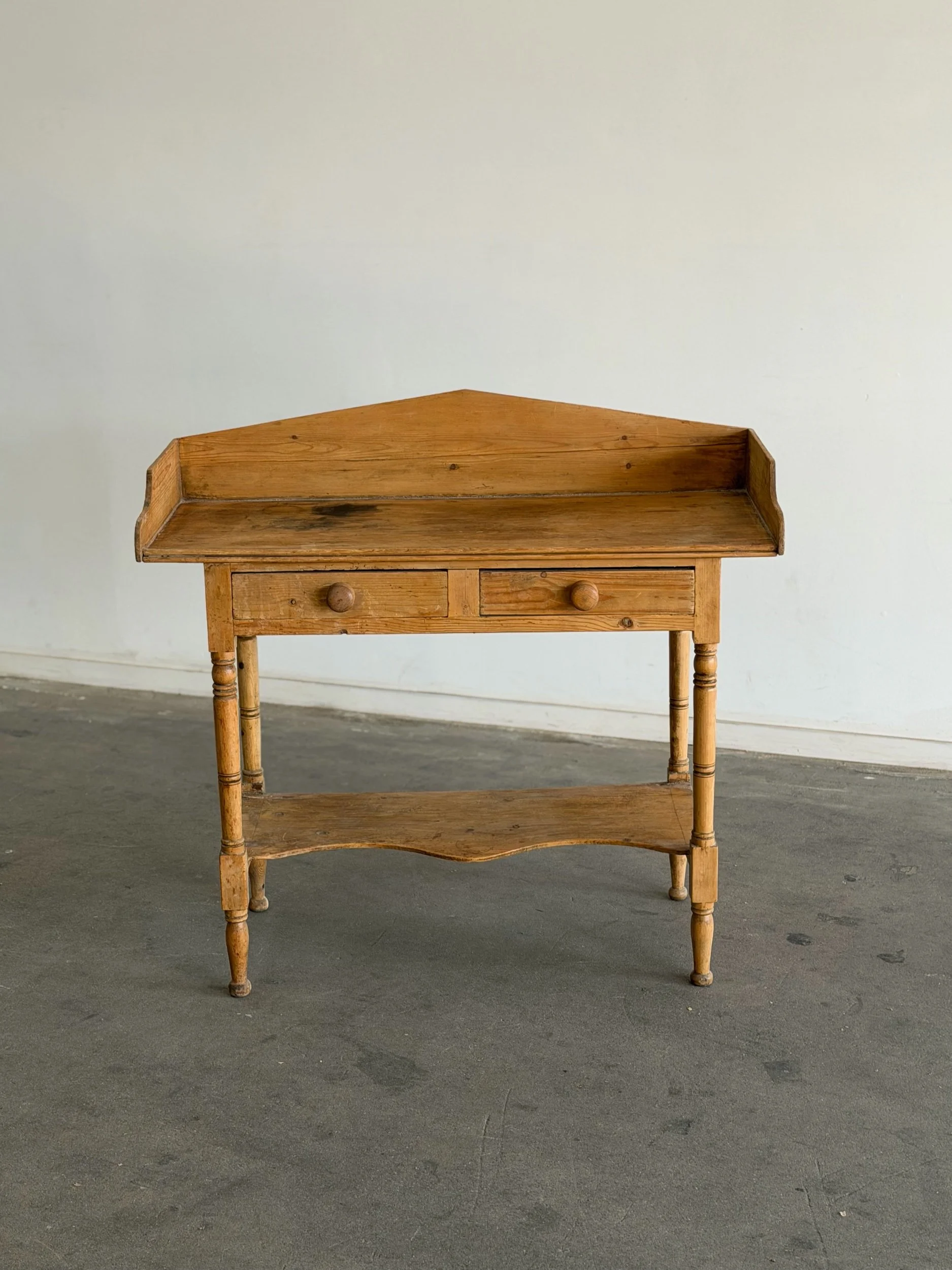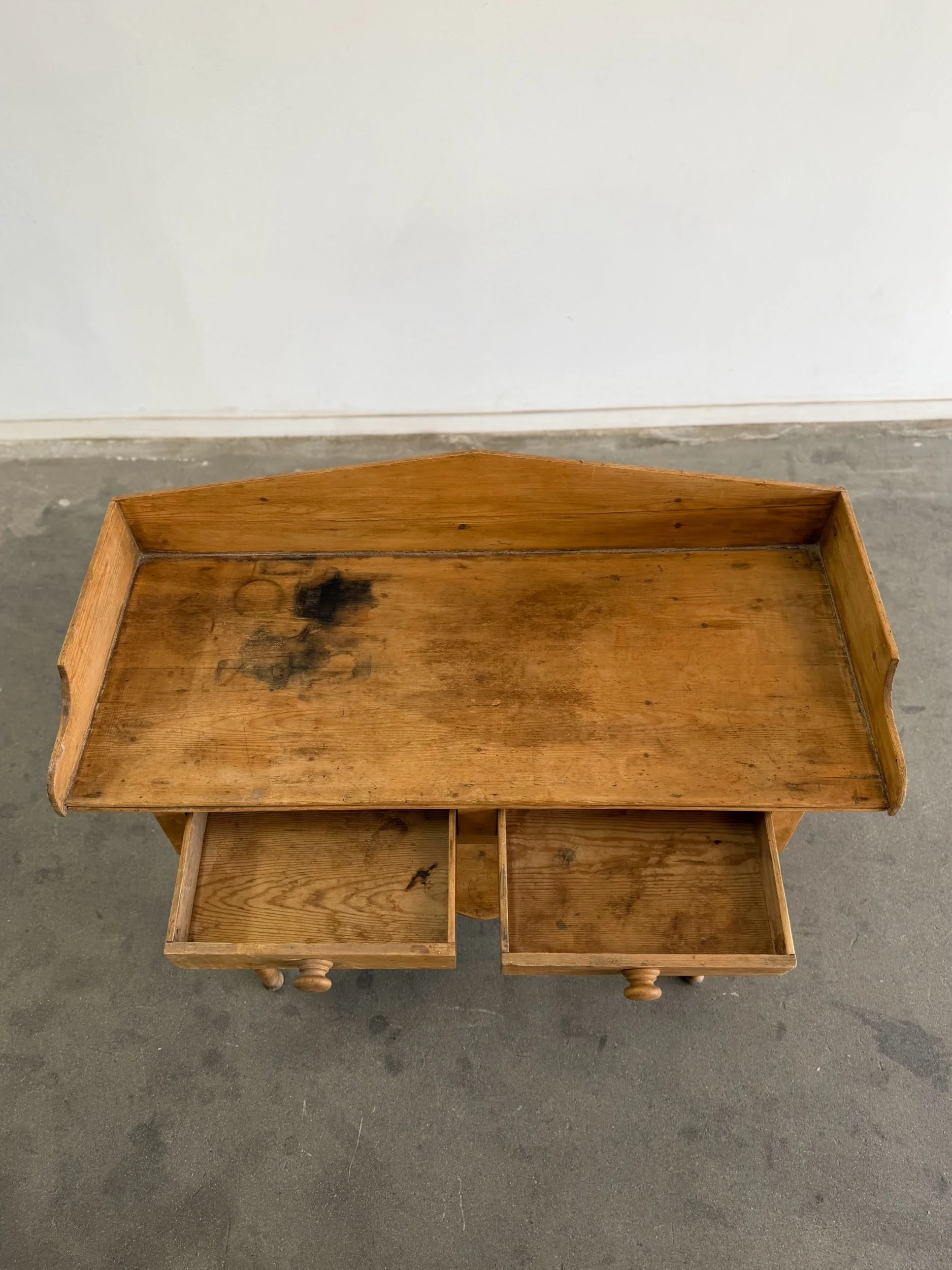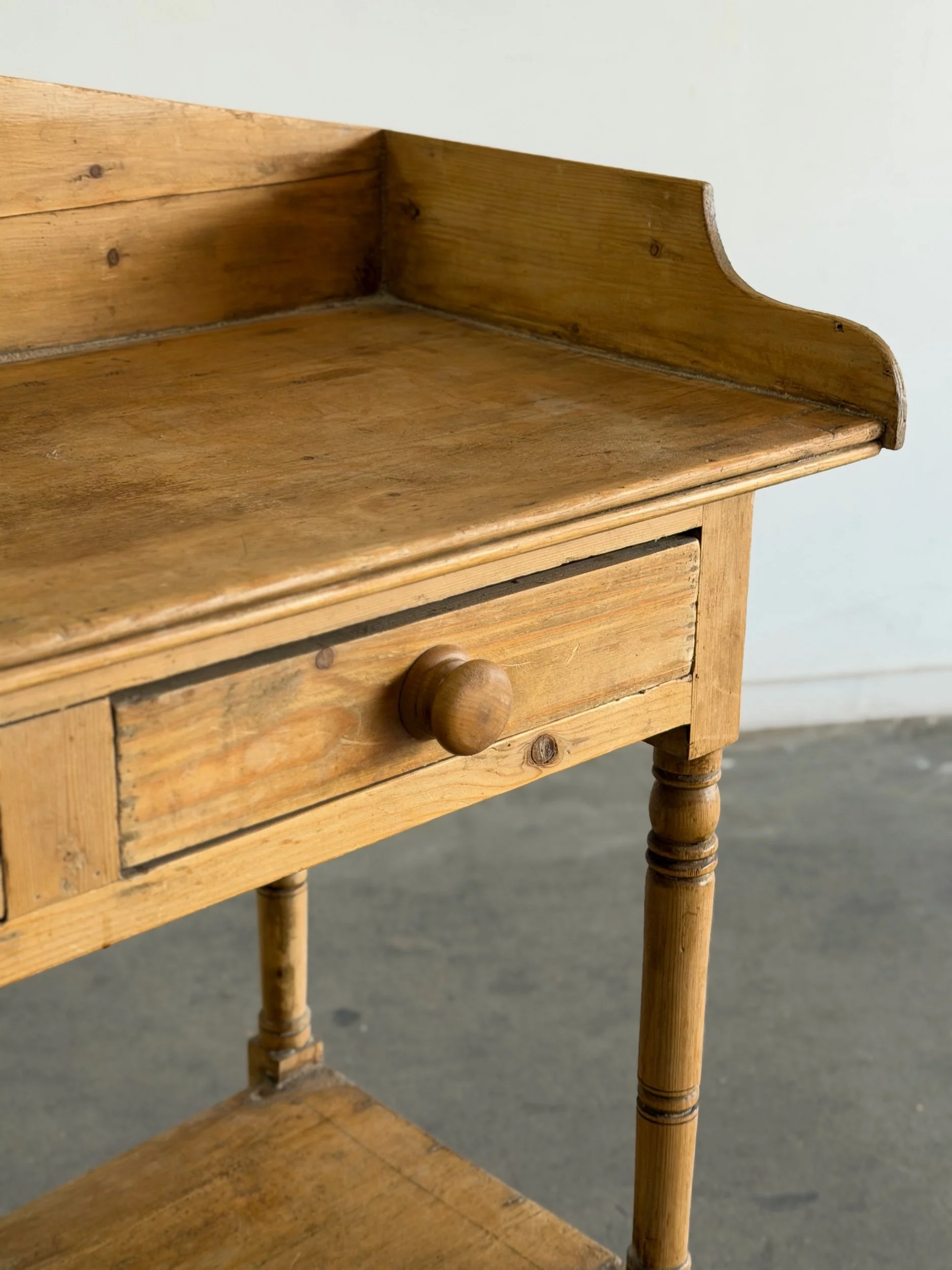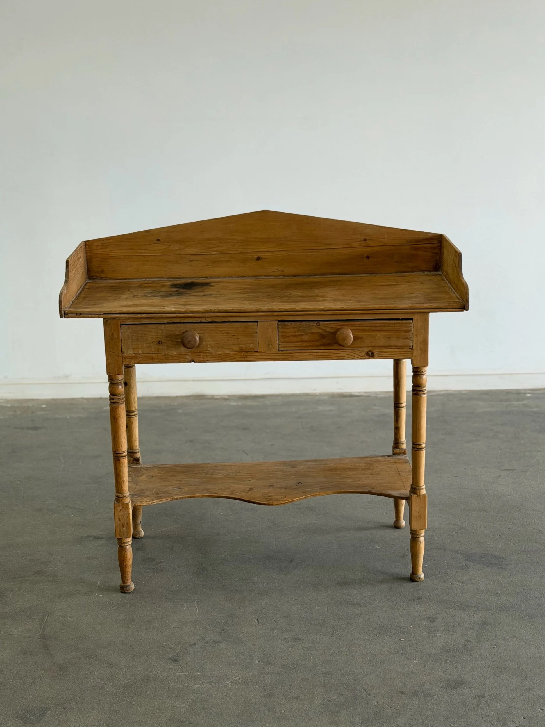 This antique solid pine console table features two small drawers with wooden knobs, and delicate turned legs. The markings and natural patina throughout consistent with age and wear add to the character of this piece.