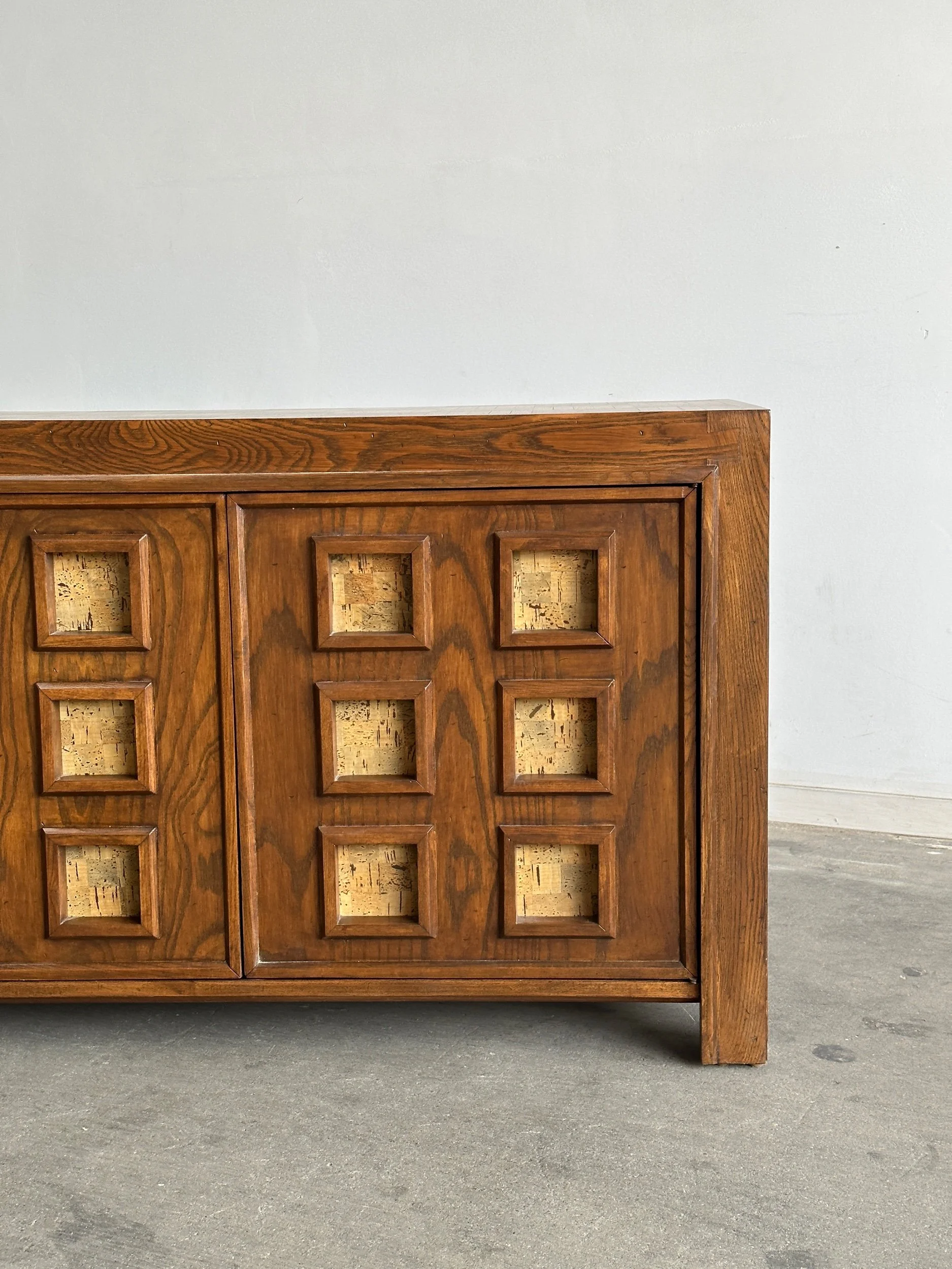 This bold geometric credenza crafted in solid oak and stained in a light honey, features sculptural paneled doors with a warm cork inlay. The surface of this piece displays a parquet pattern highlighting the natural variation of the wood. On the inside this credenza offers generous storage with a drawer and ample shelf storage.