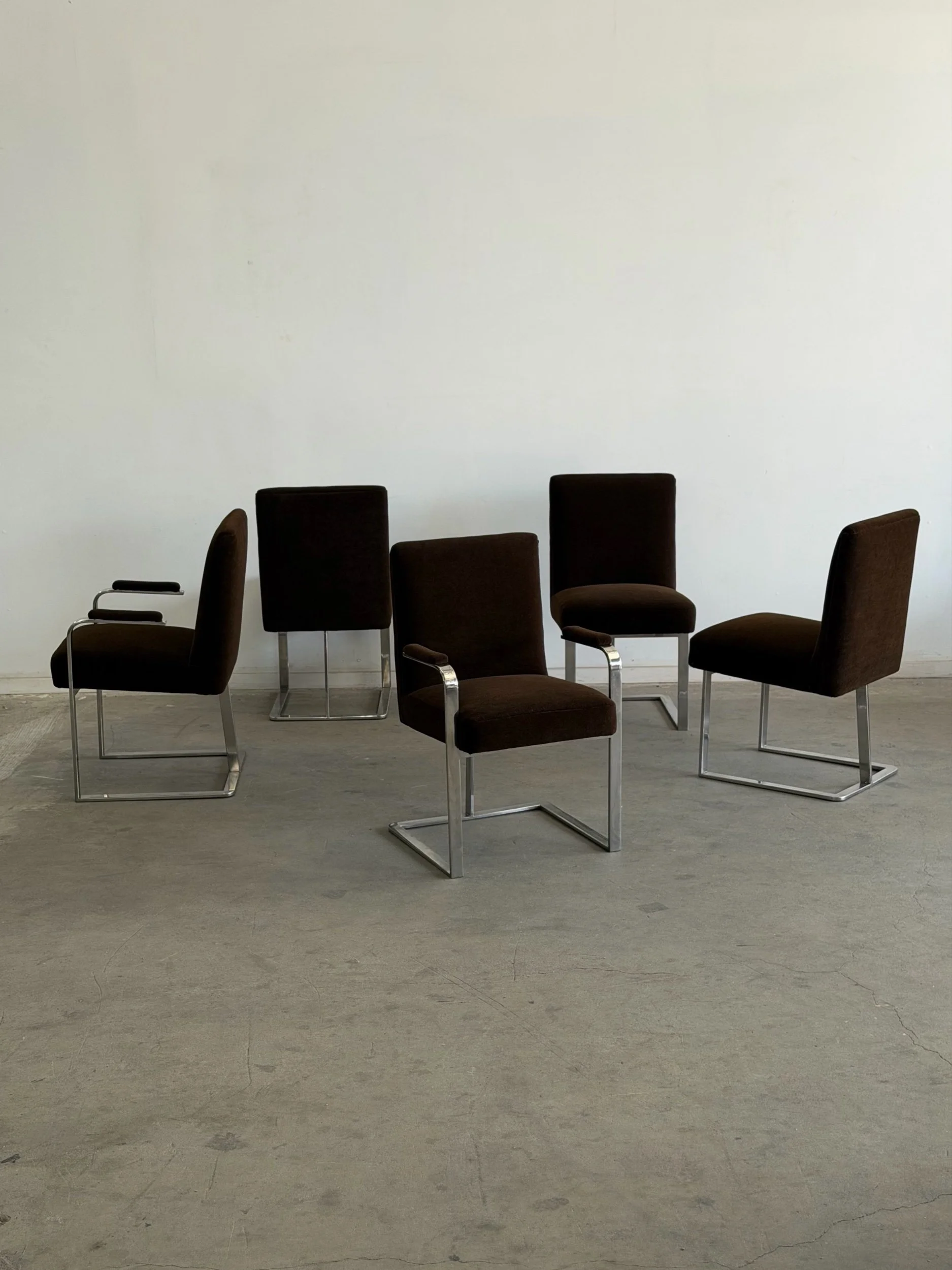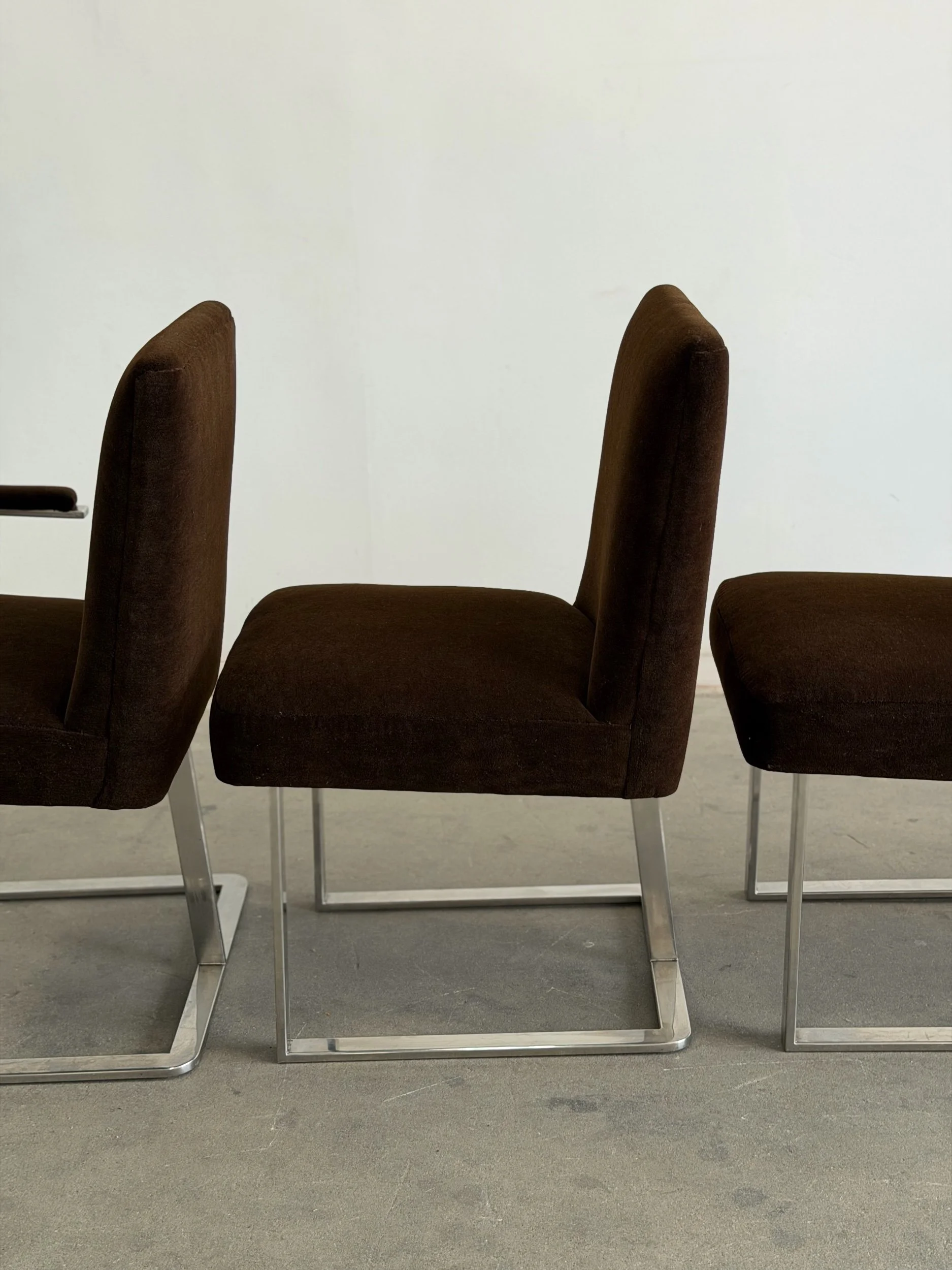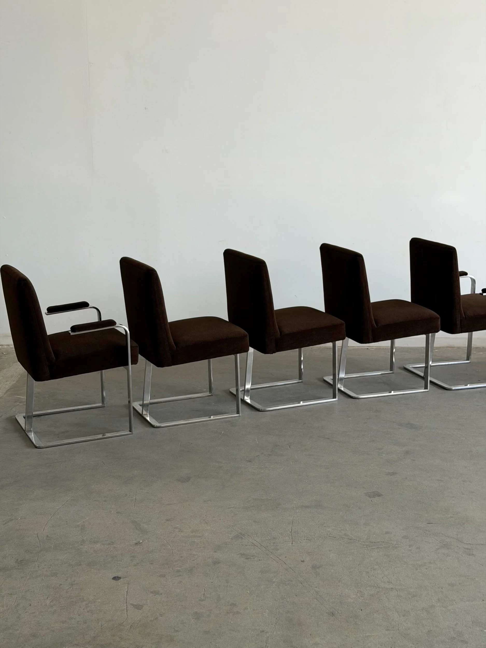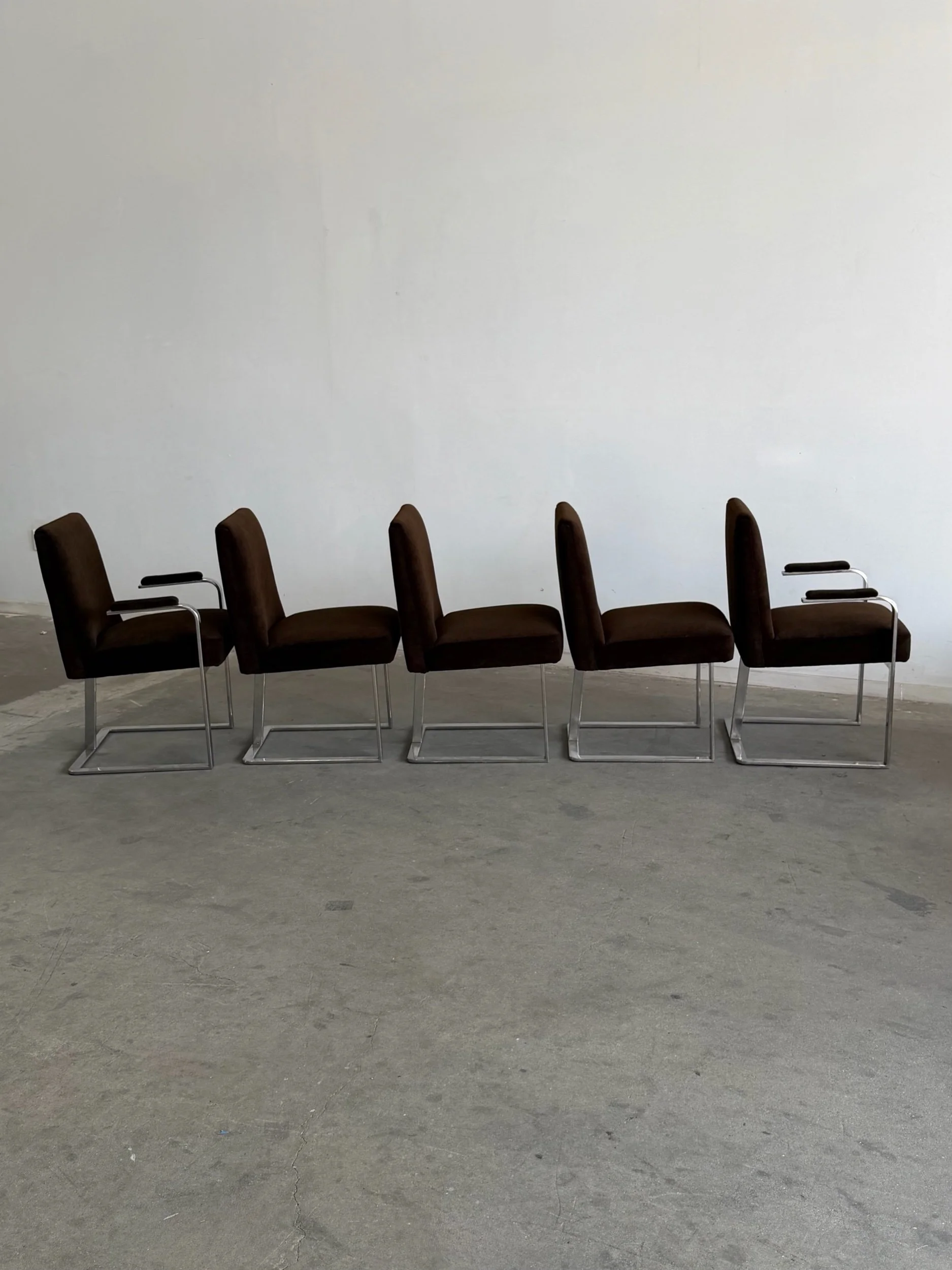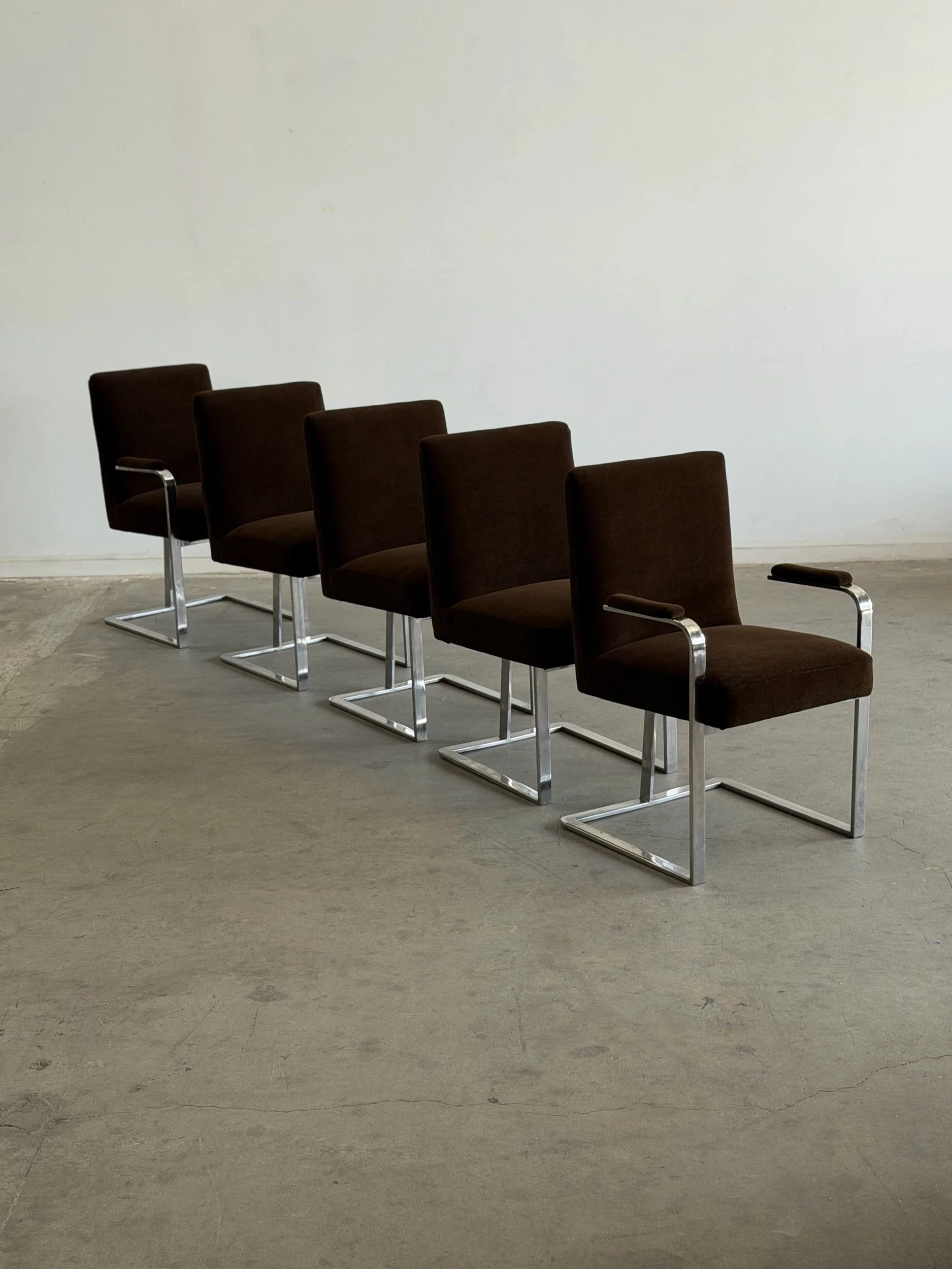 This set of five dining chairs by Milo Baughman feature a timeless cantilever chrome base contrasted with deep chocolate upholstery. This set has two armchairs and 3 armless chairs, the chairs with arms have gently curved upholstered armrests.