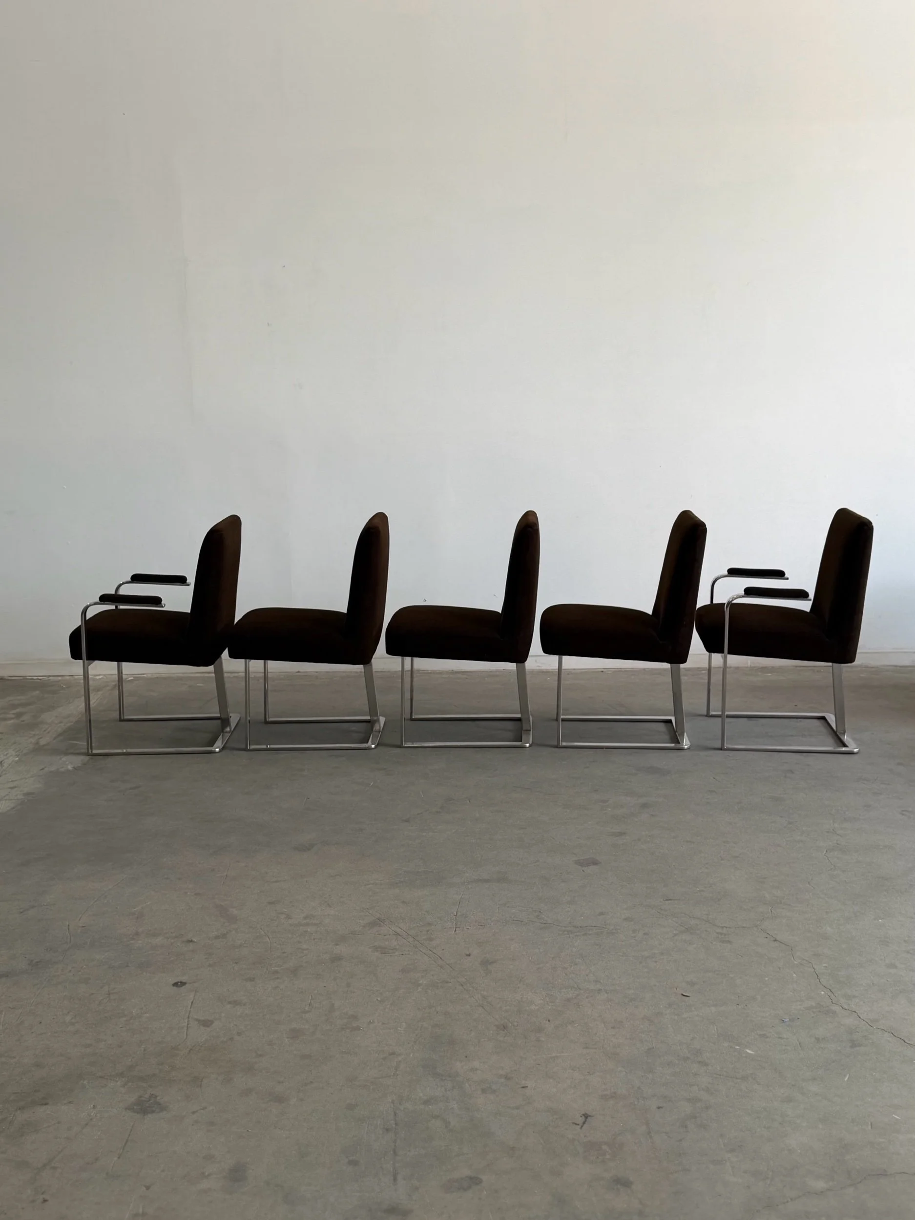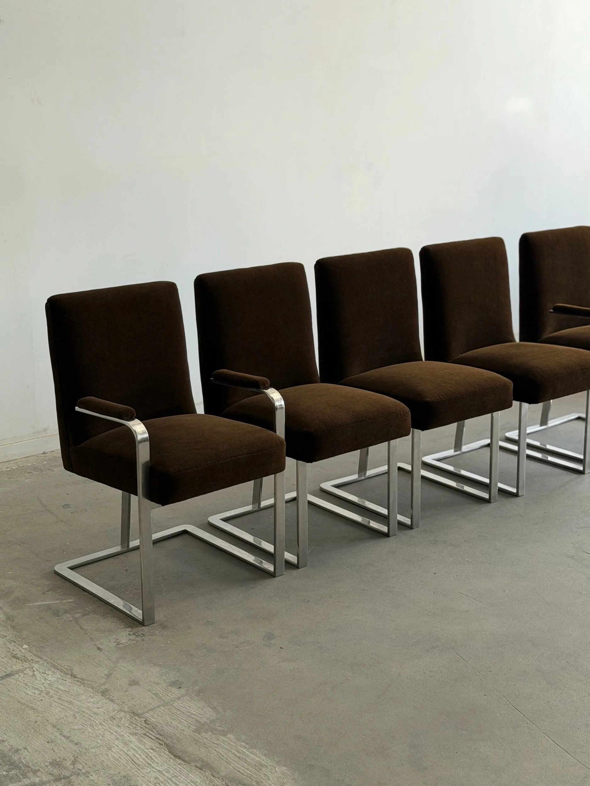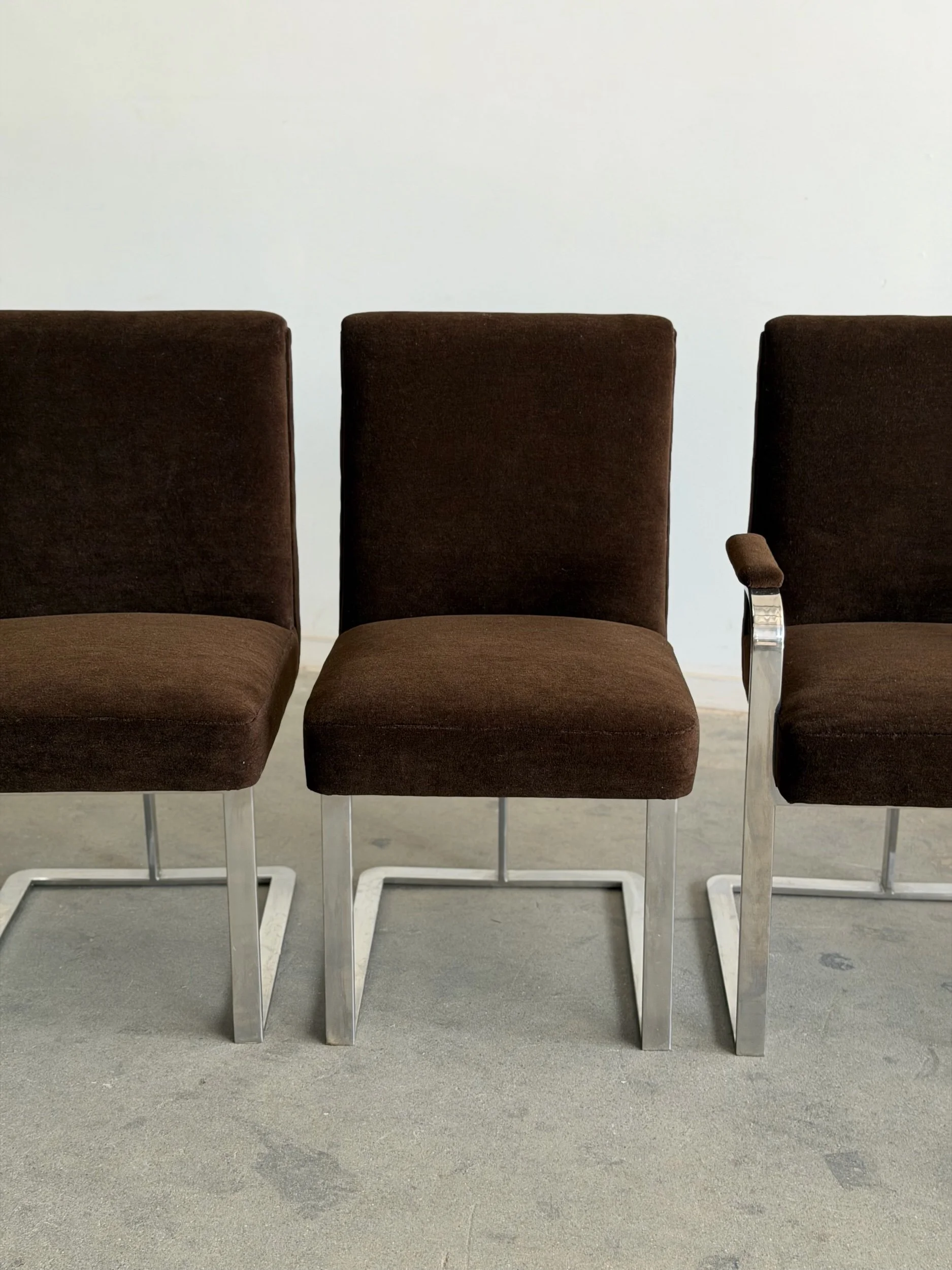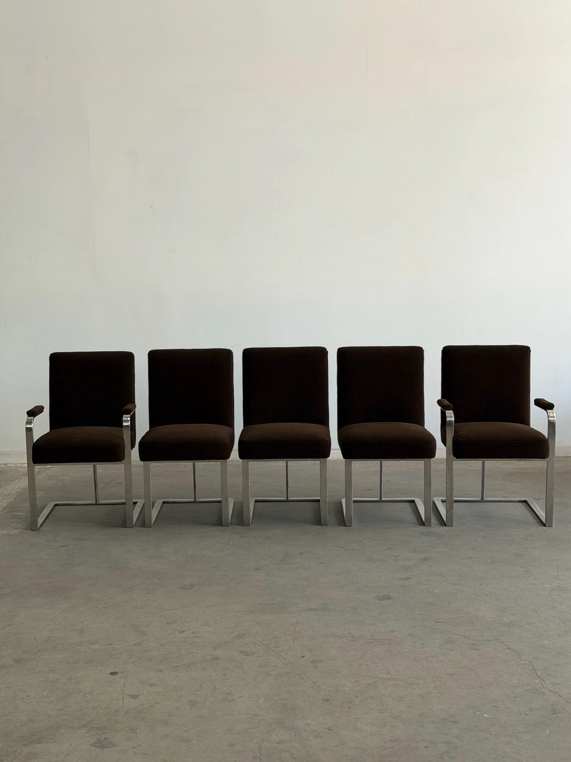 This set of five dining chairs by Milo Baughman feature a timeless cantilever chrome base contrasted with deep chocolate upholstery. This set has two armchairs and 3 armless chairs, the chairs with arms have gently curved upholstered armrests.