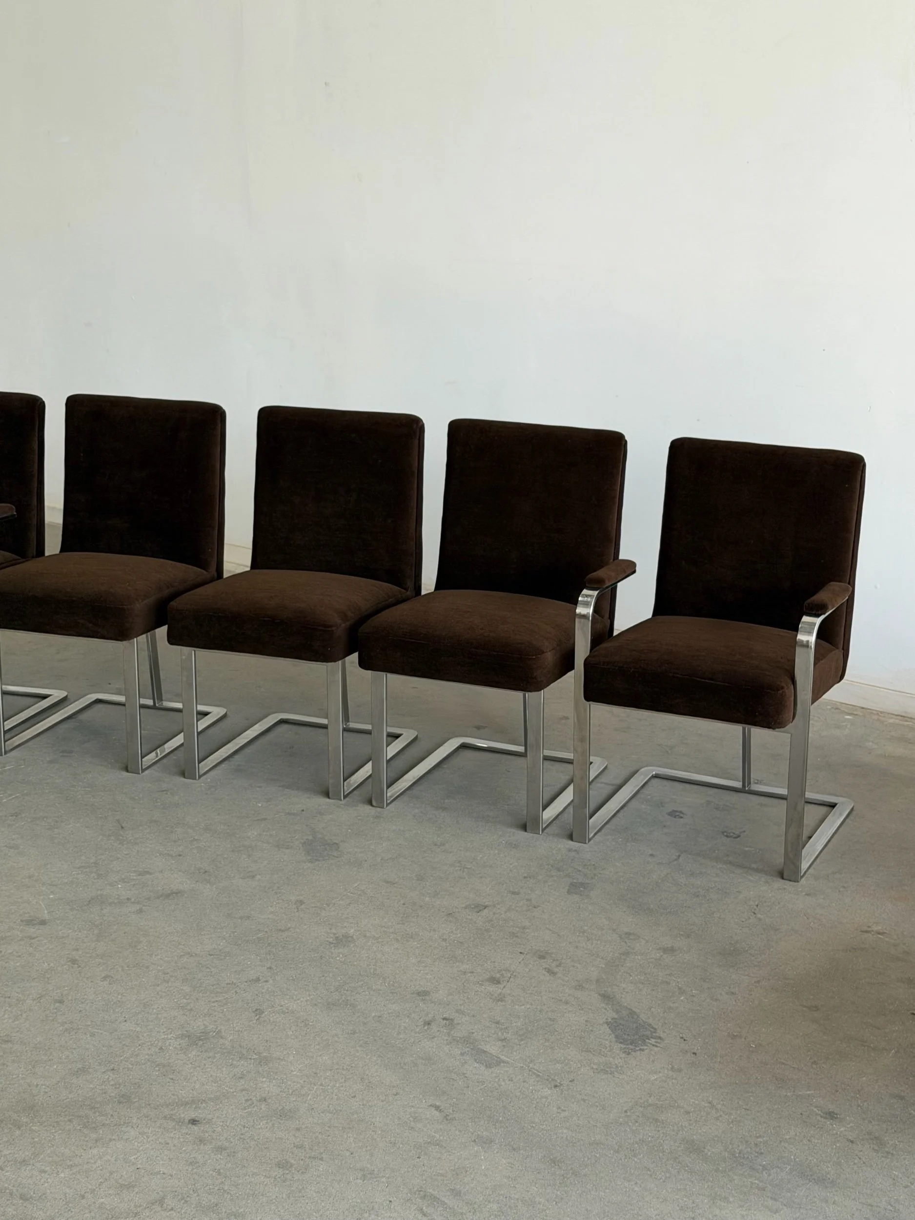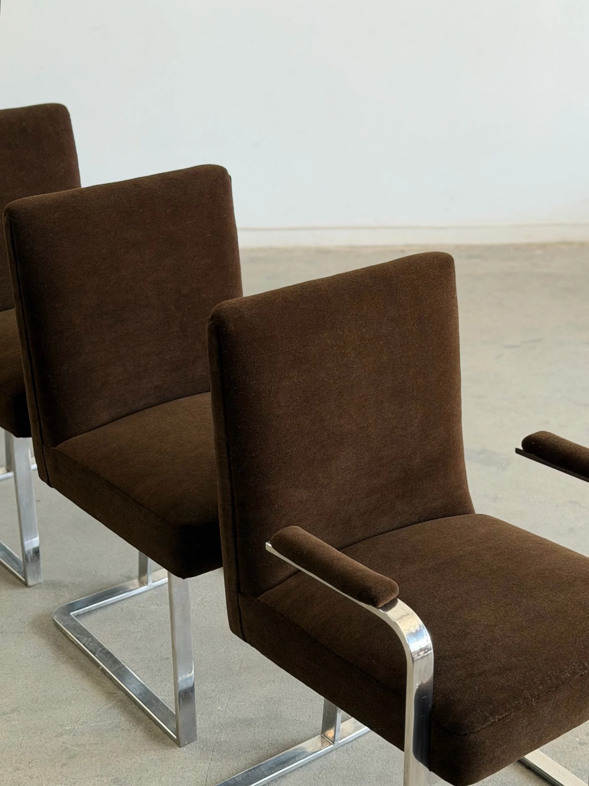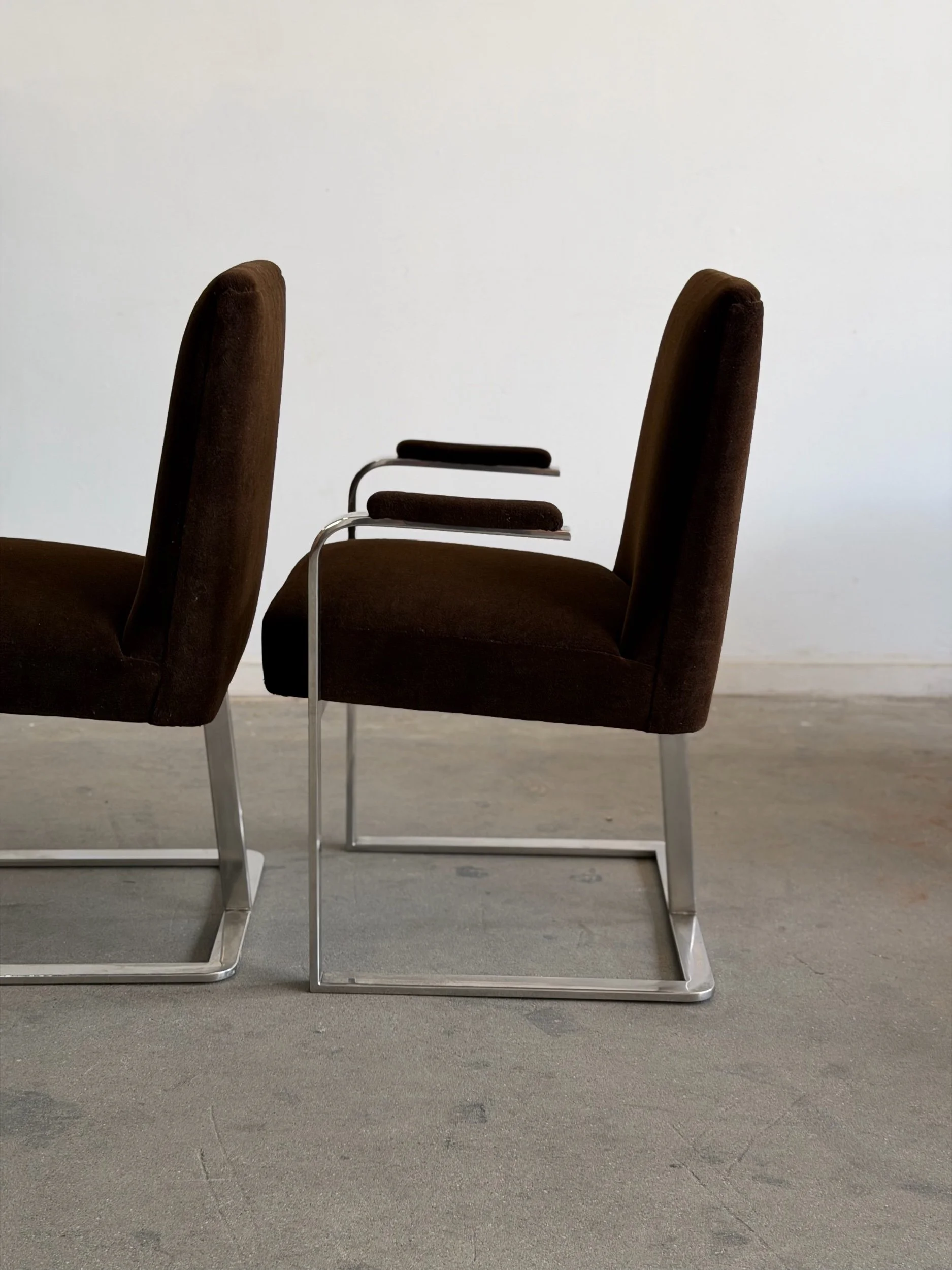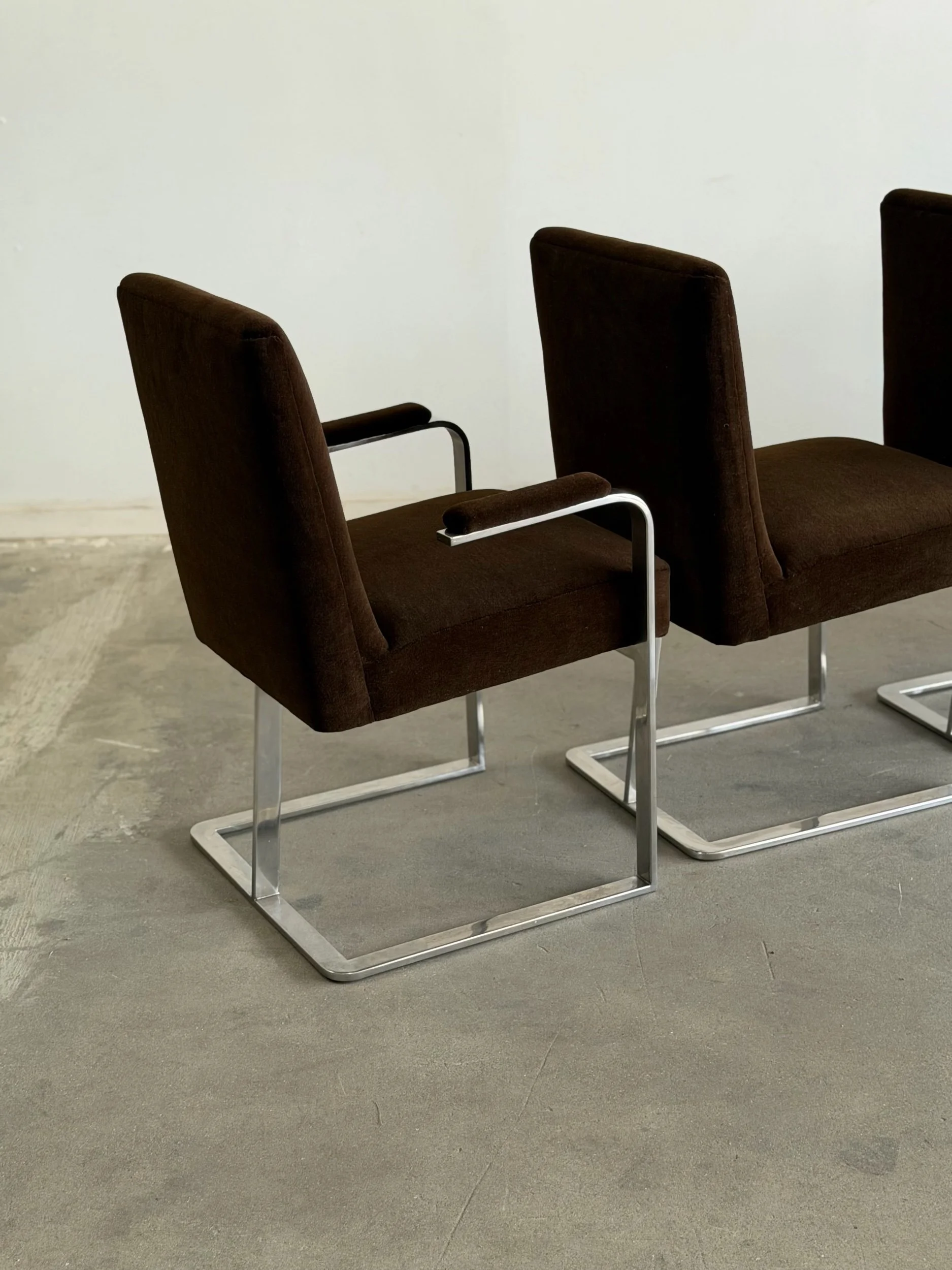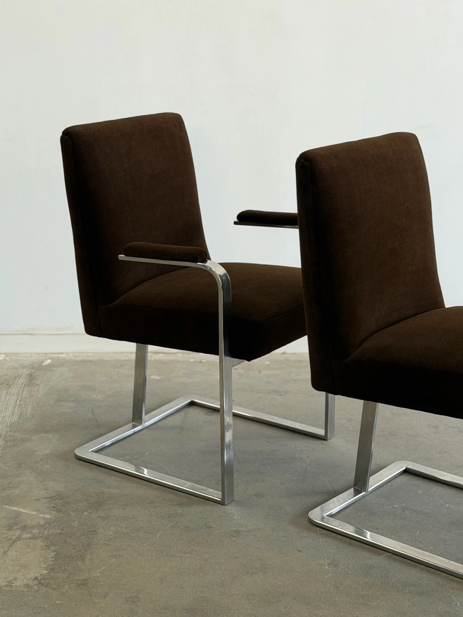 This set of five dining chairs by Milo Baughman feature a timeless cantilever chrome base contrasted with deep chocolate upholstery. This set has two armchairs and 3 armless chairs, the chairs with arms have gently curved upholstered armrests.