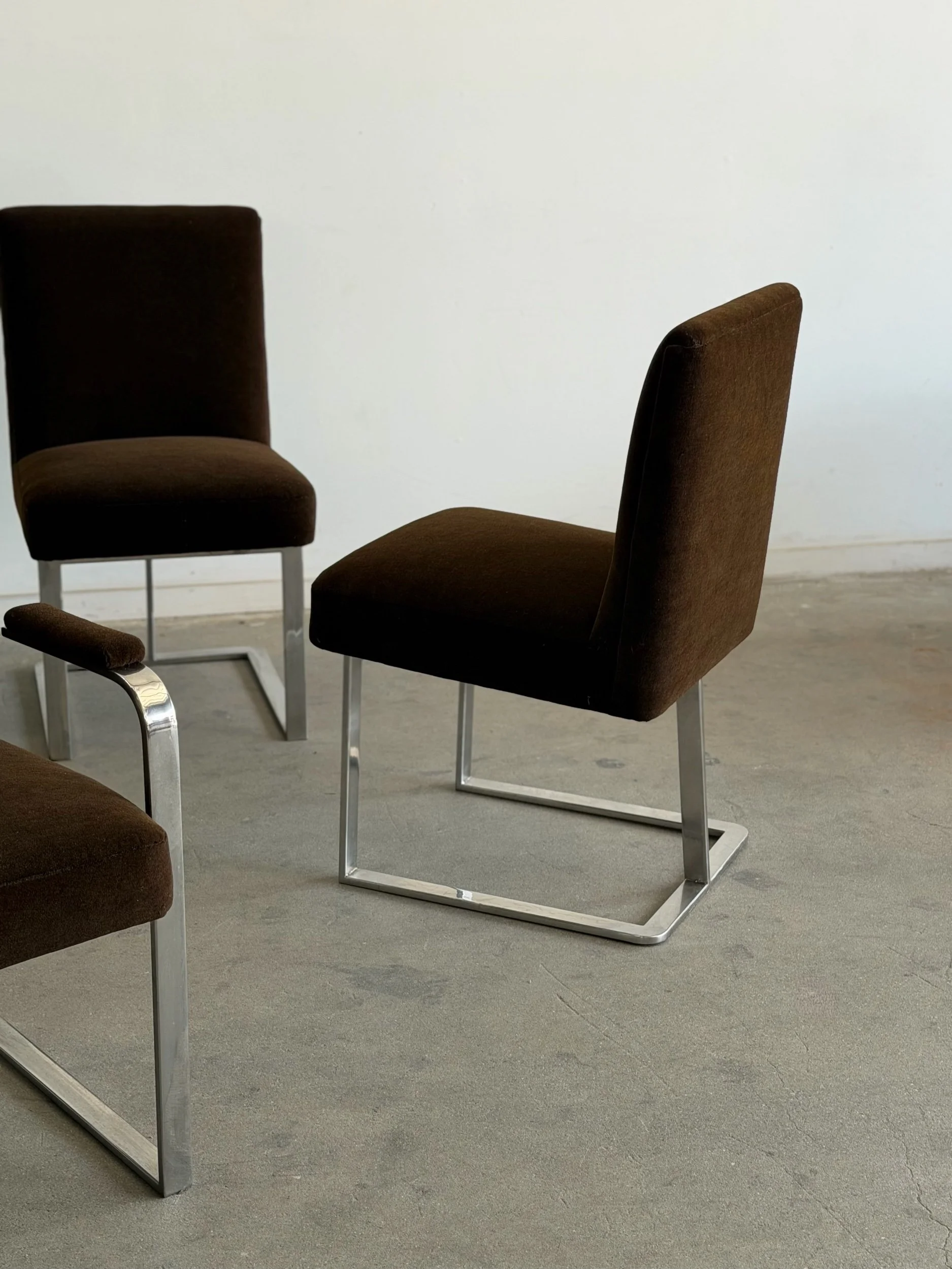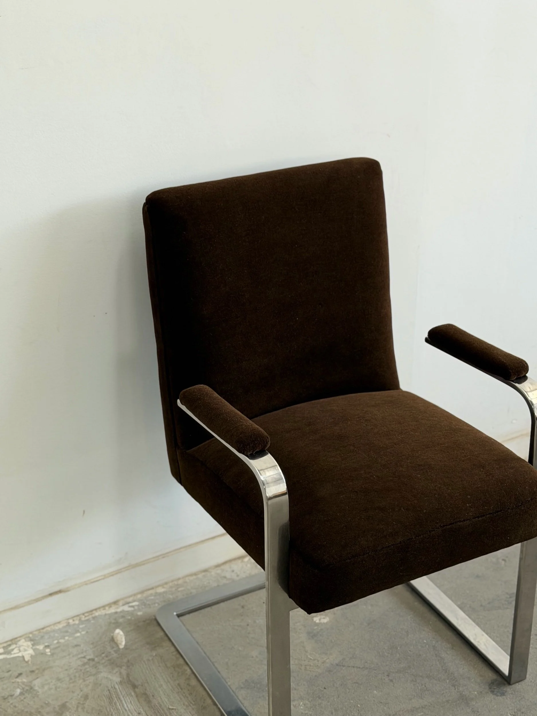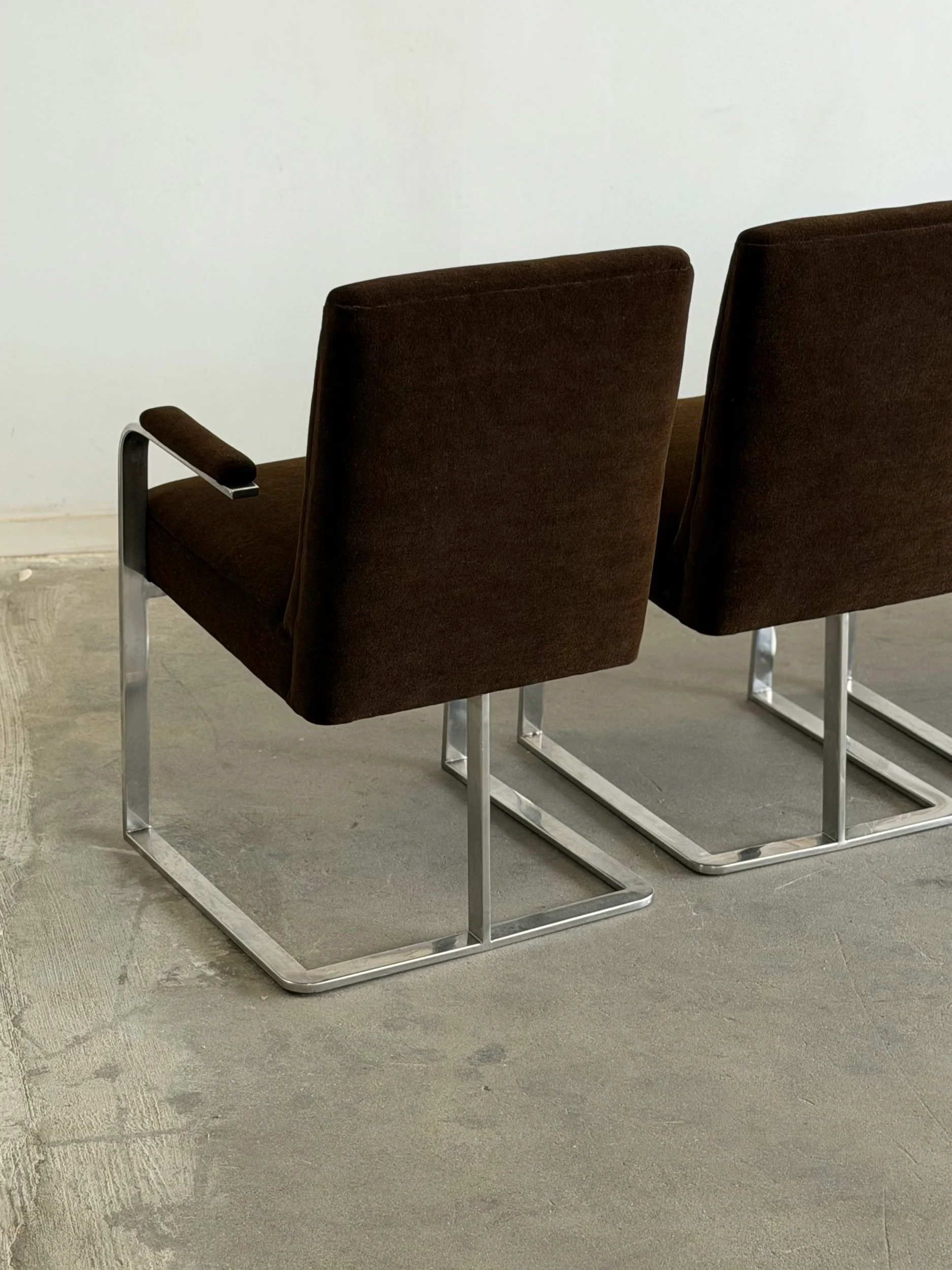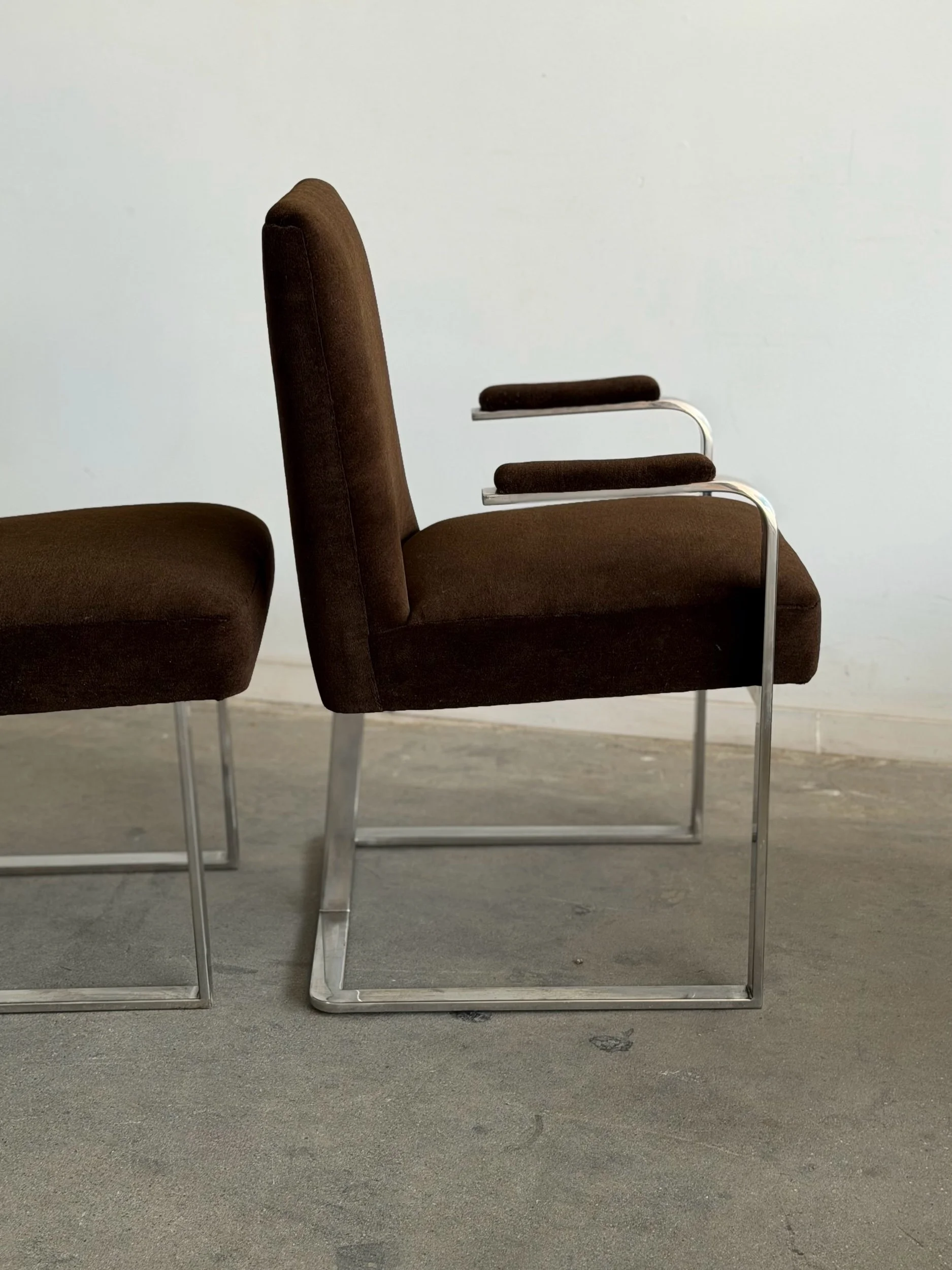 This set of five dining chairs by Milo Baughman feature a timeless cantilever chrome base contrasted with deep chocolate upholstery. This set has two armchairs and 3 armless chairs, the chairs with arms have gently curved upholstered armrests.