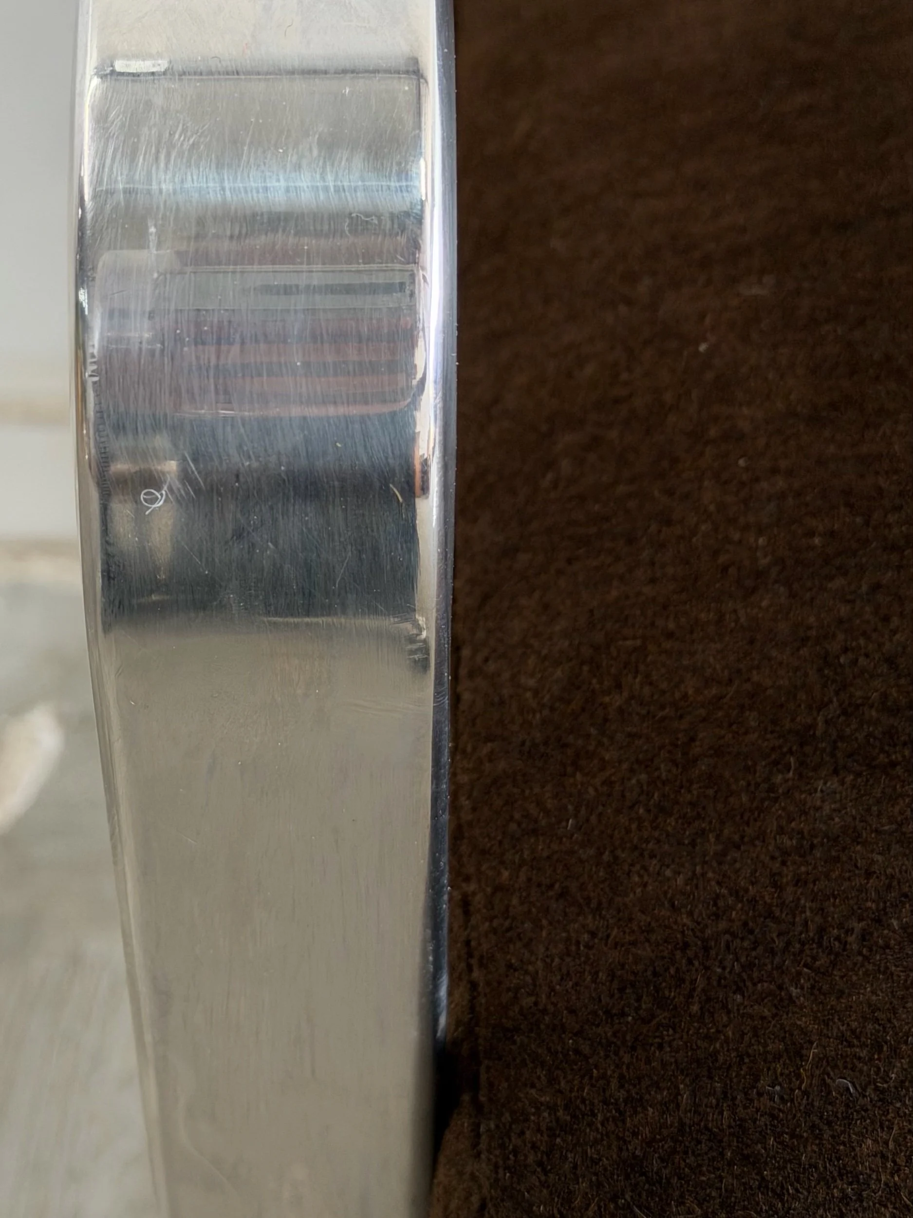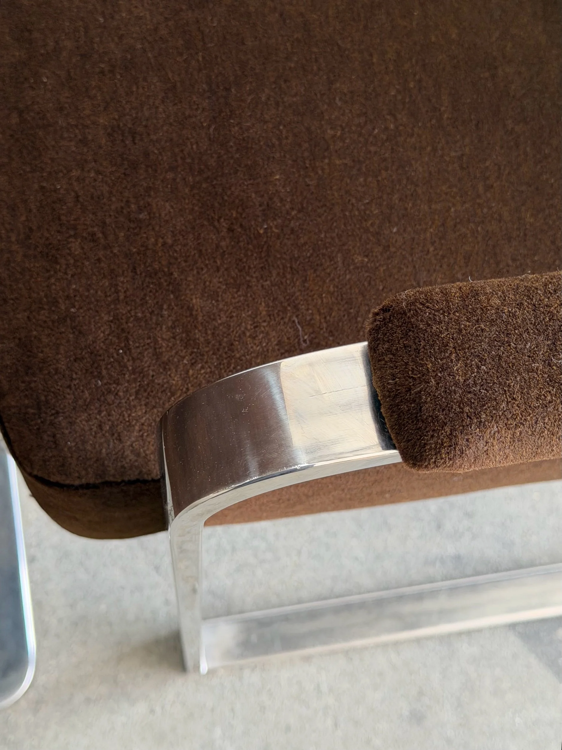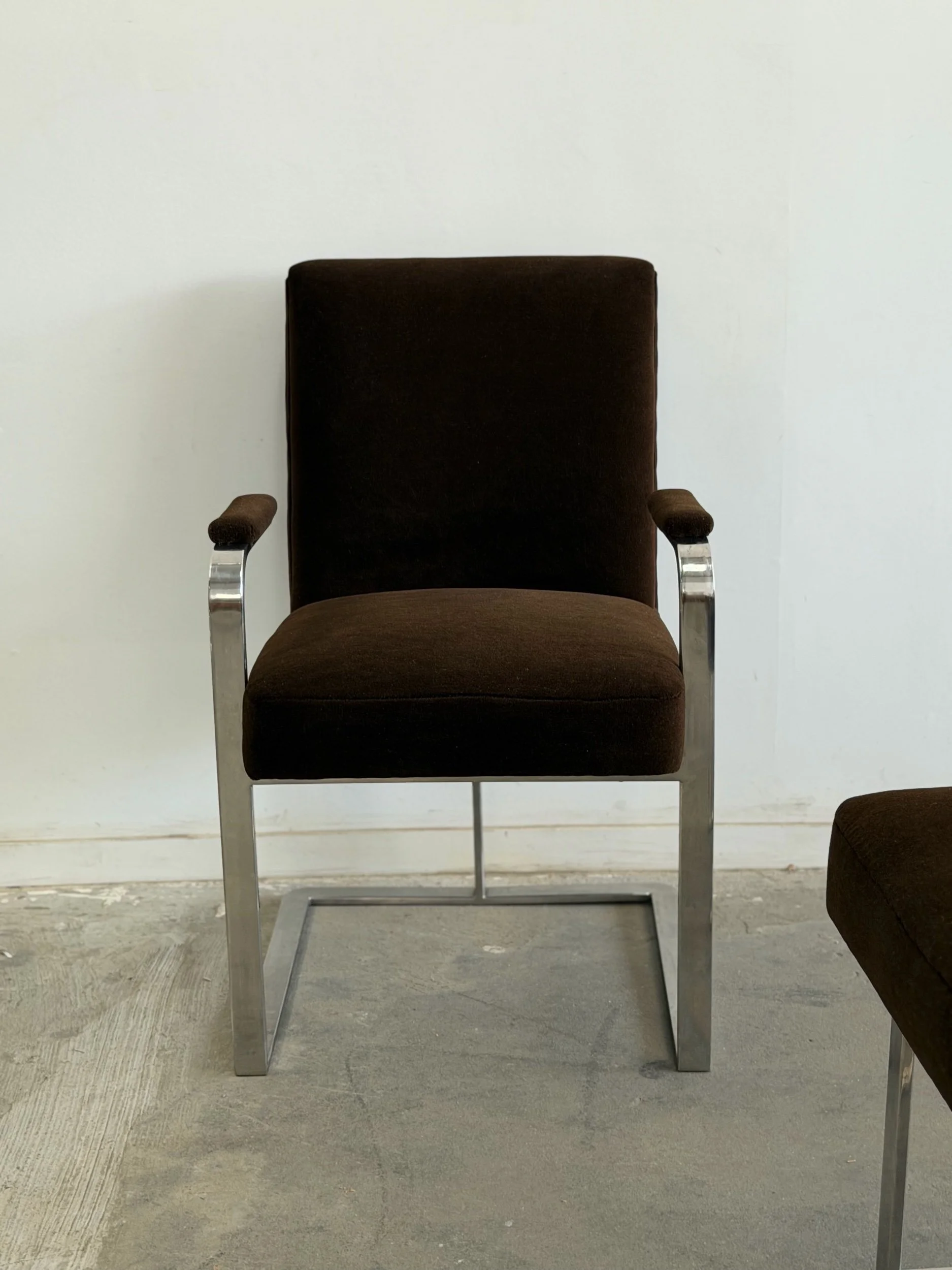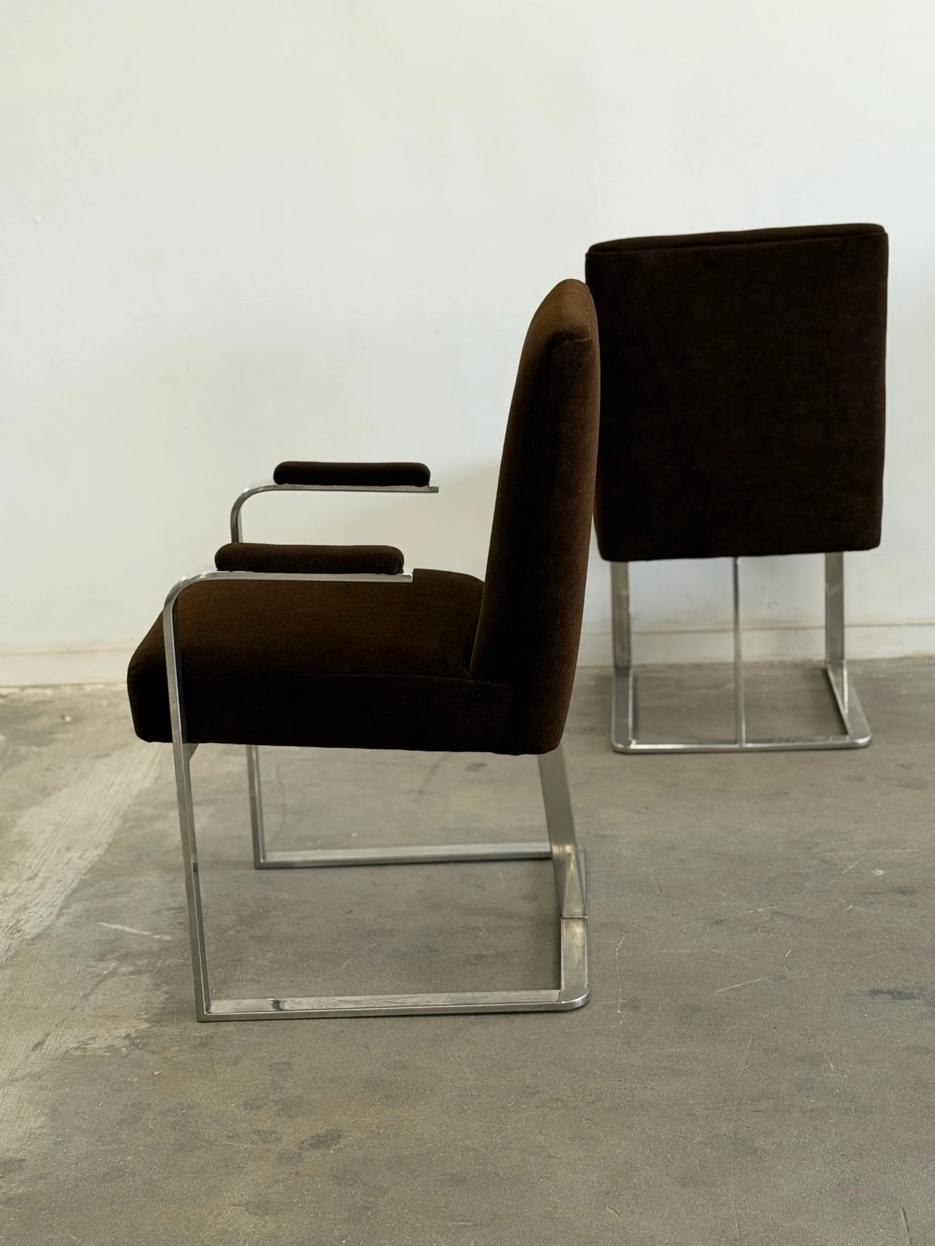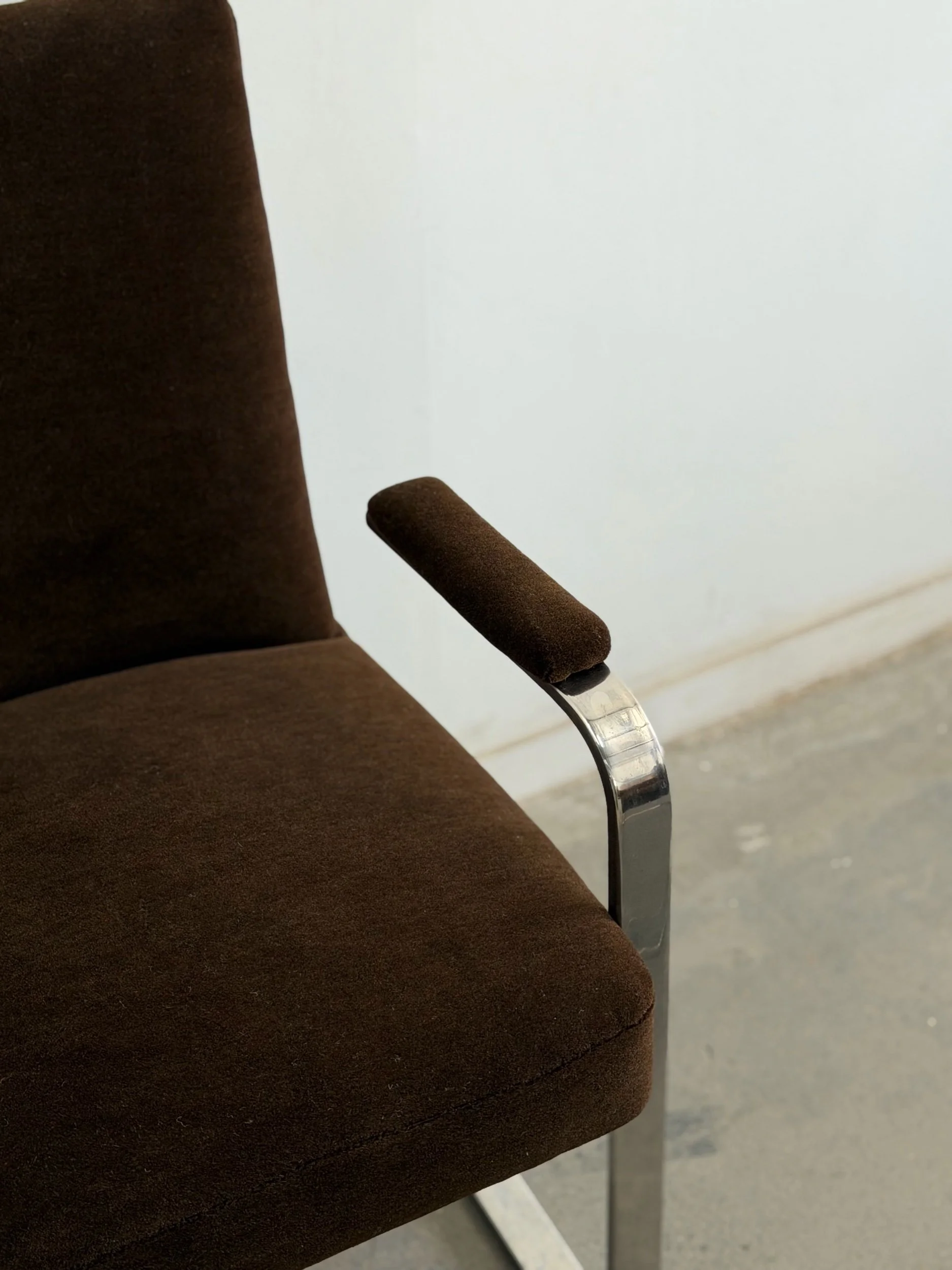 This set of five dining chairs by Milo Baughman feature a timeless cantilever chrome base contrasted with deep chocolate upholstery. This set has two armchairs and 3 armless chairs, the chairs with arms have gently curved upholstered armrests.