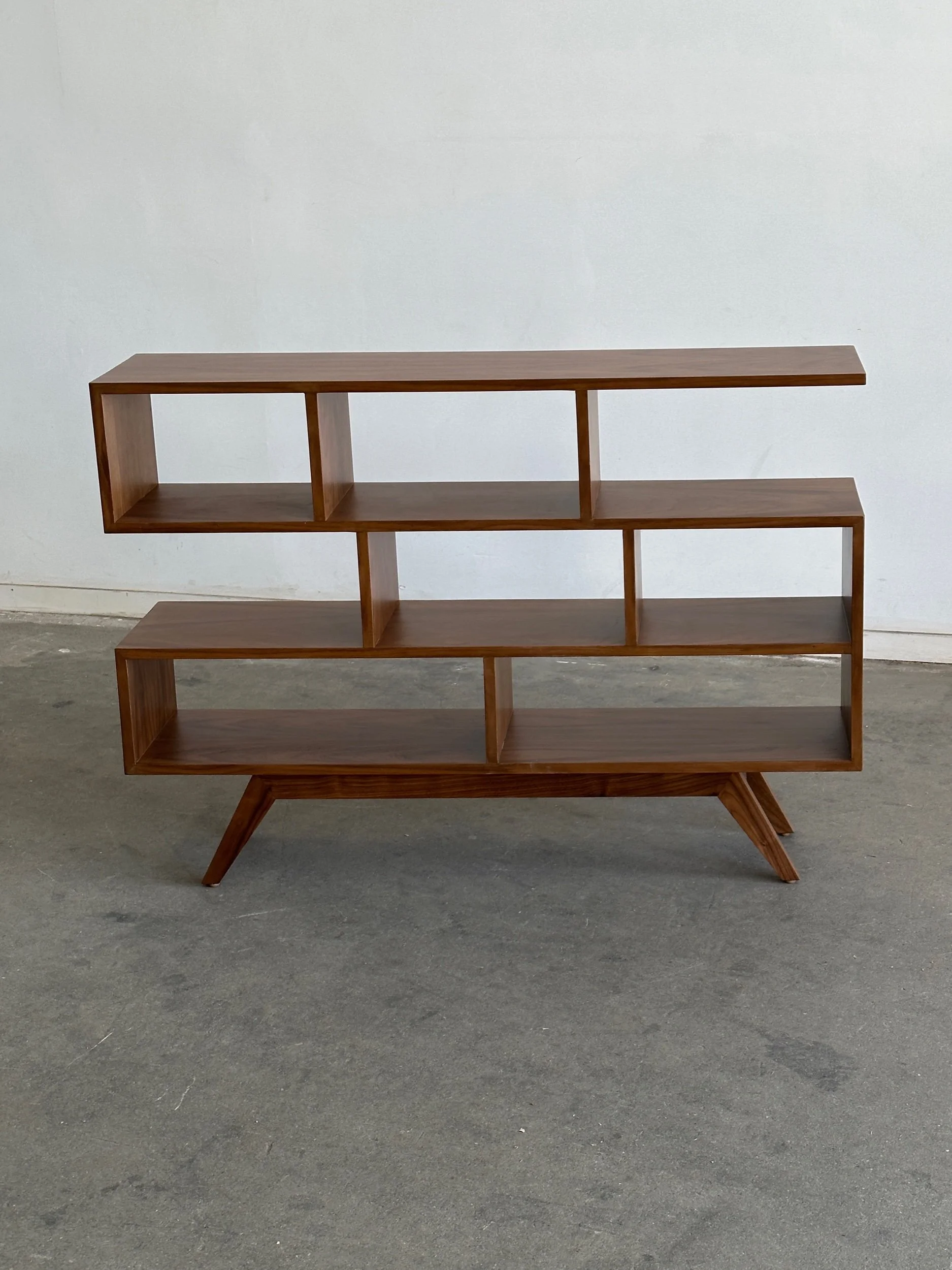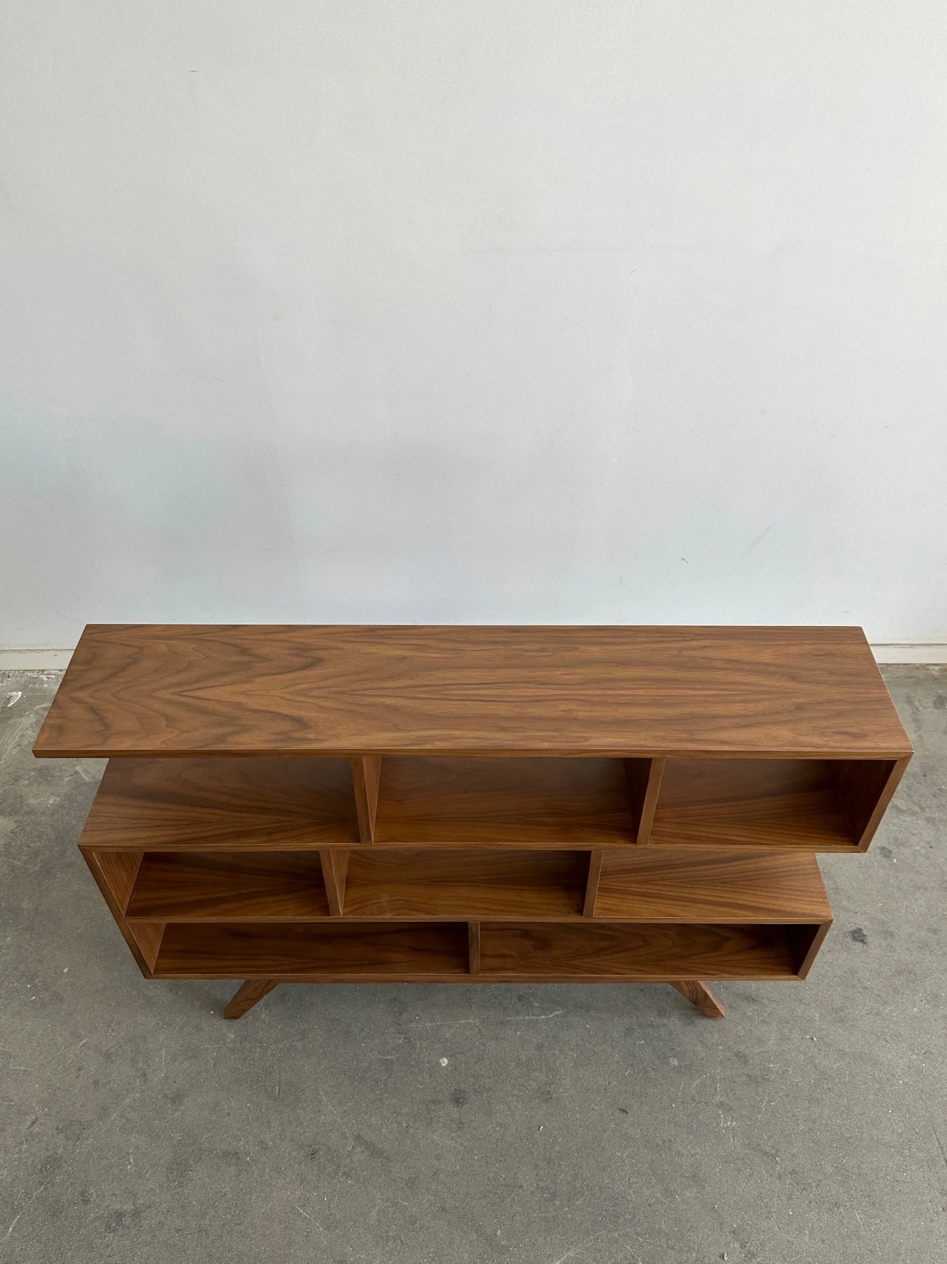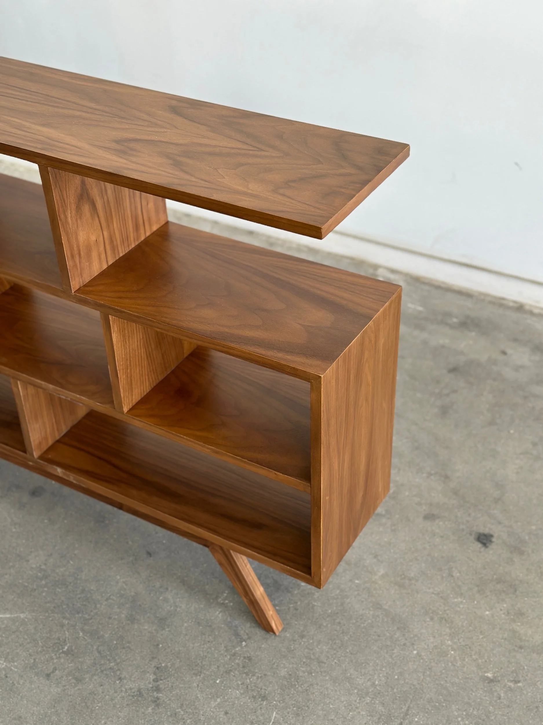 Newly made coffee table in solid oak with protruding legs surfaces. Table is heavy , structural sound , and features a dark honey finish.