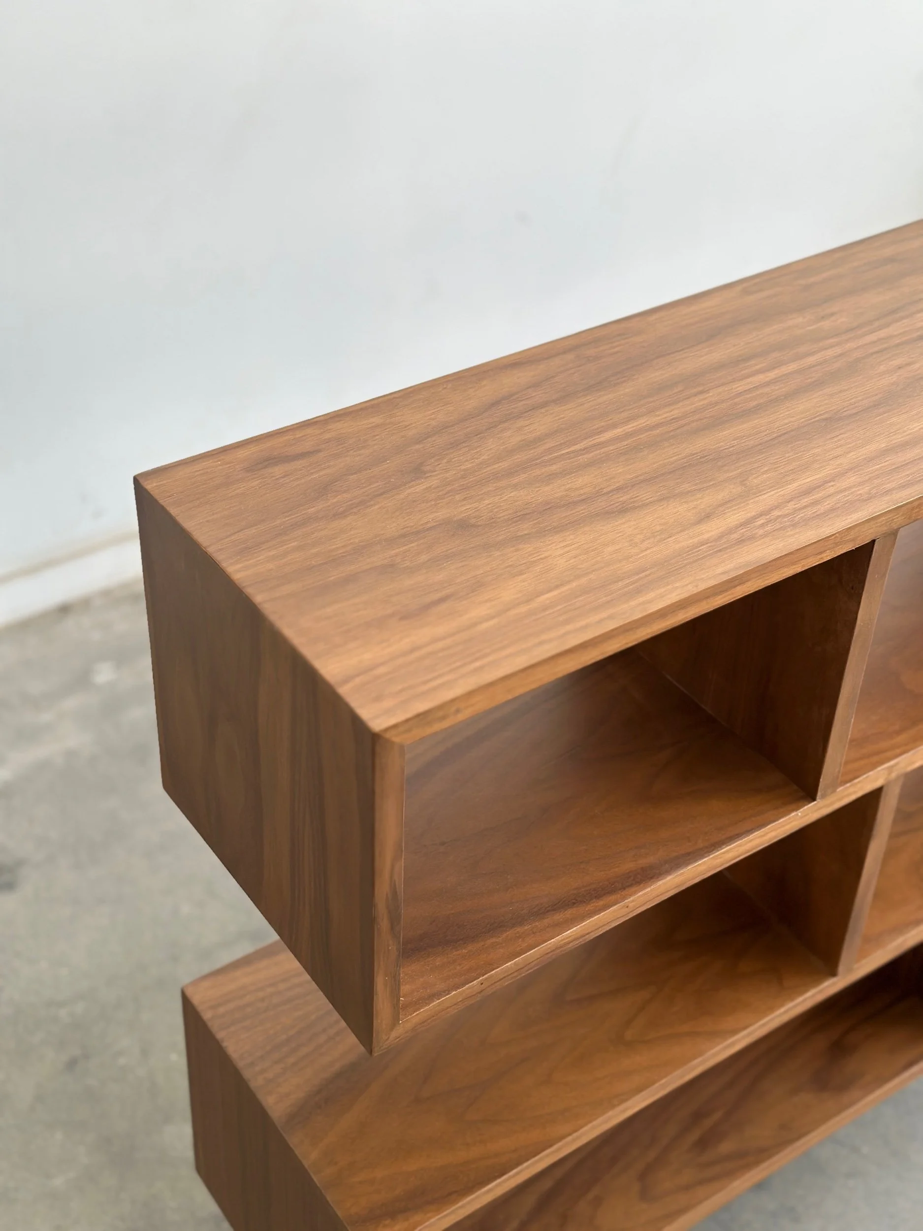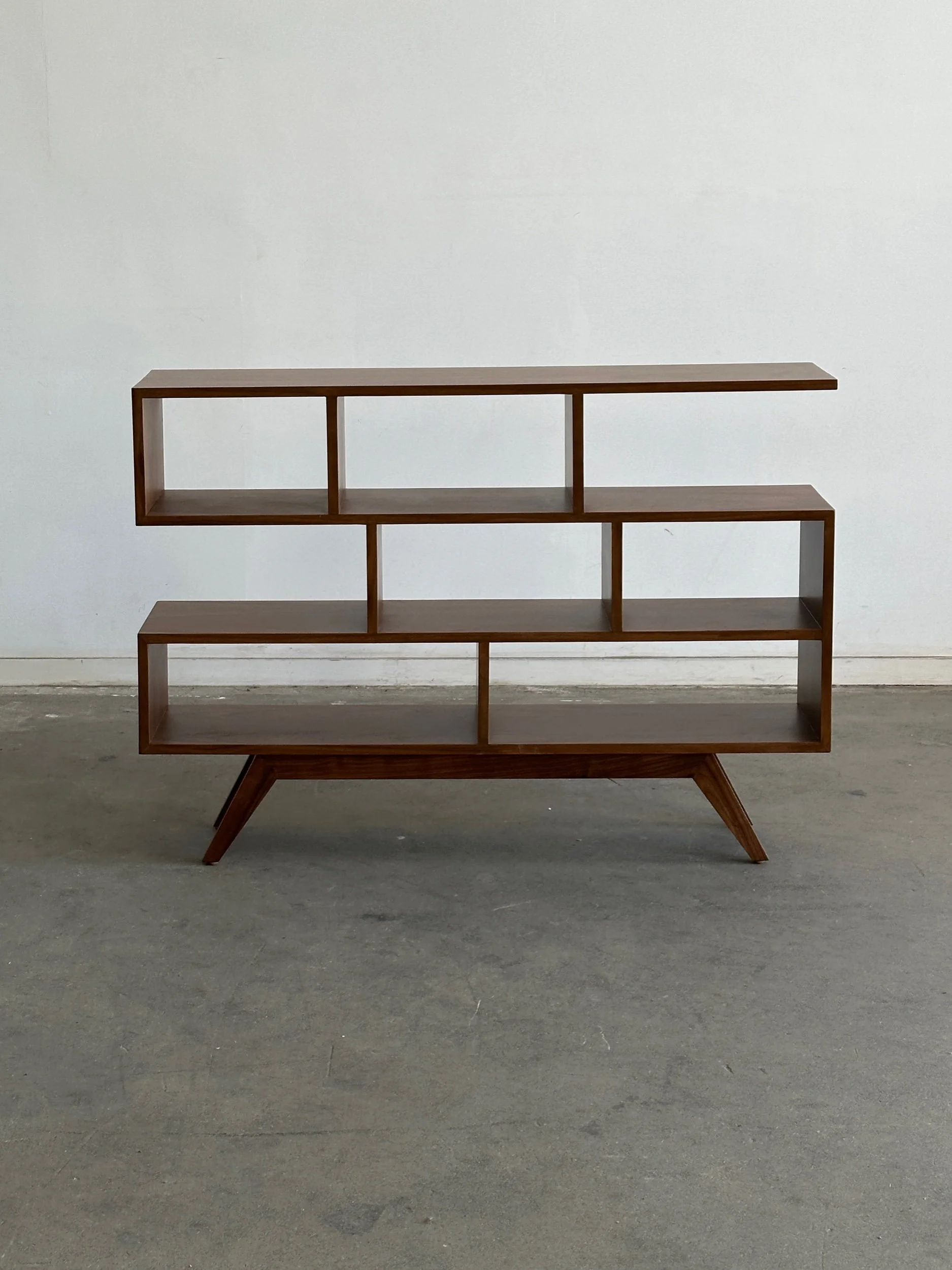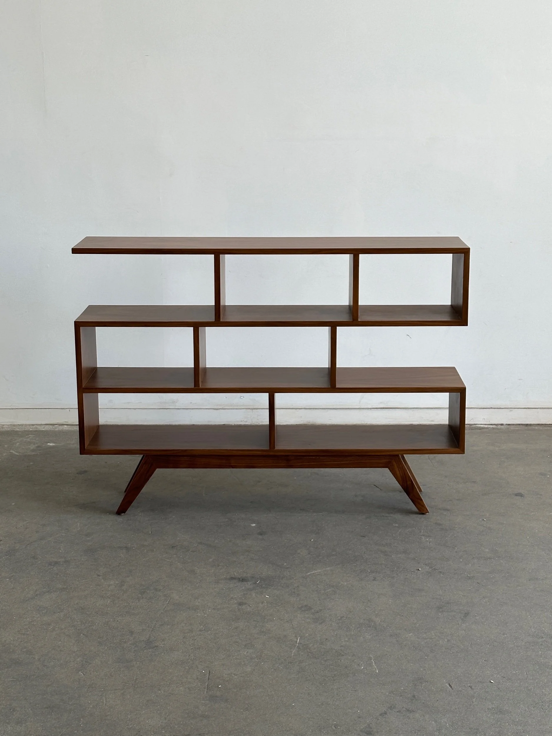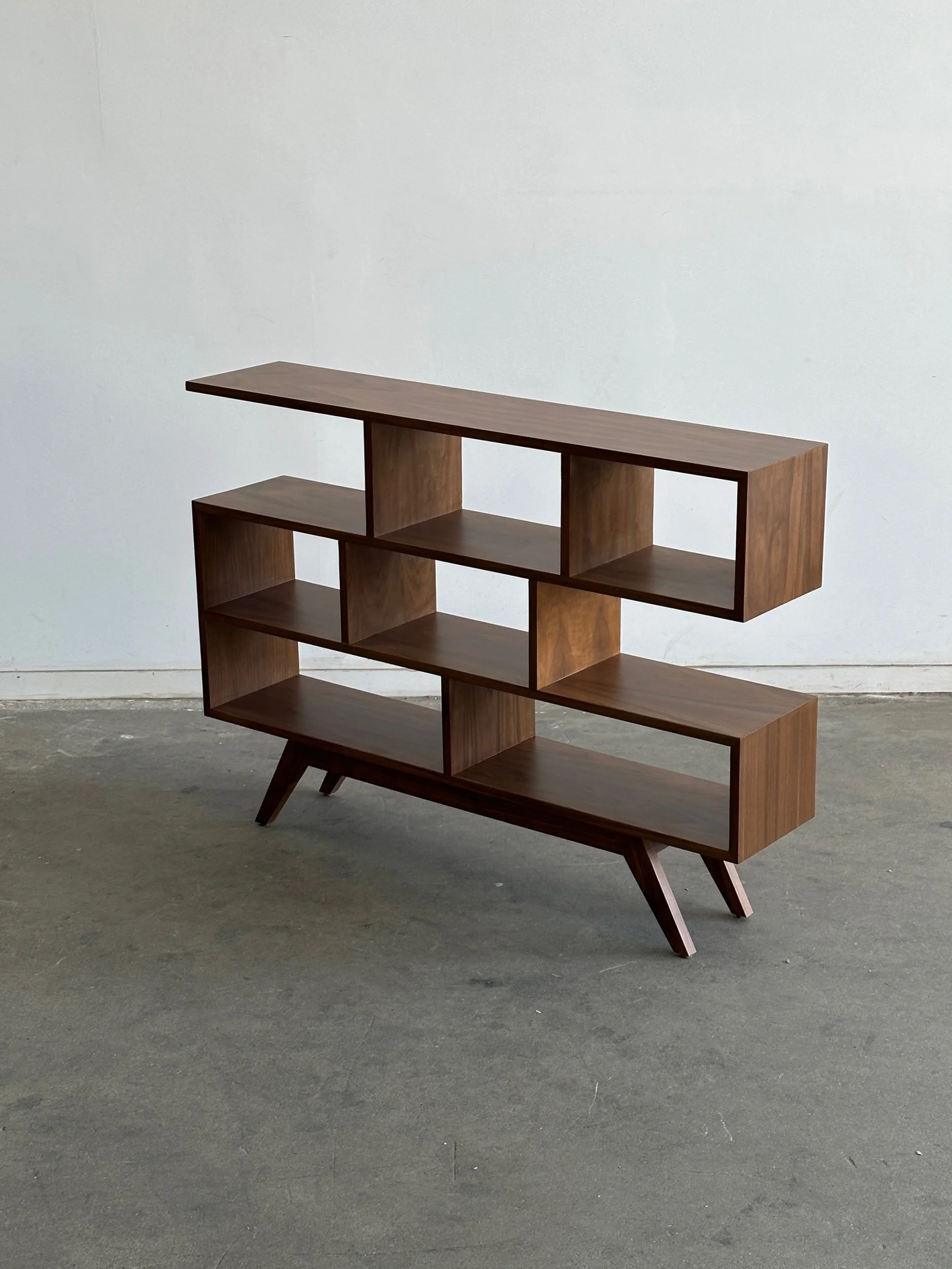 Newly made coffee table in solid oak with protruding legs surfaces. Table is heavy , structural sound , and features a dark honey finish.