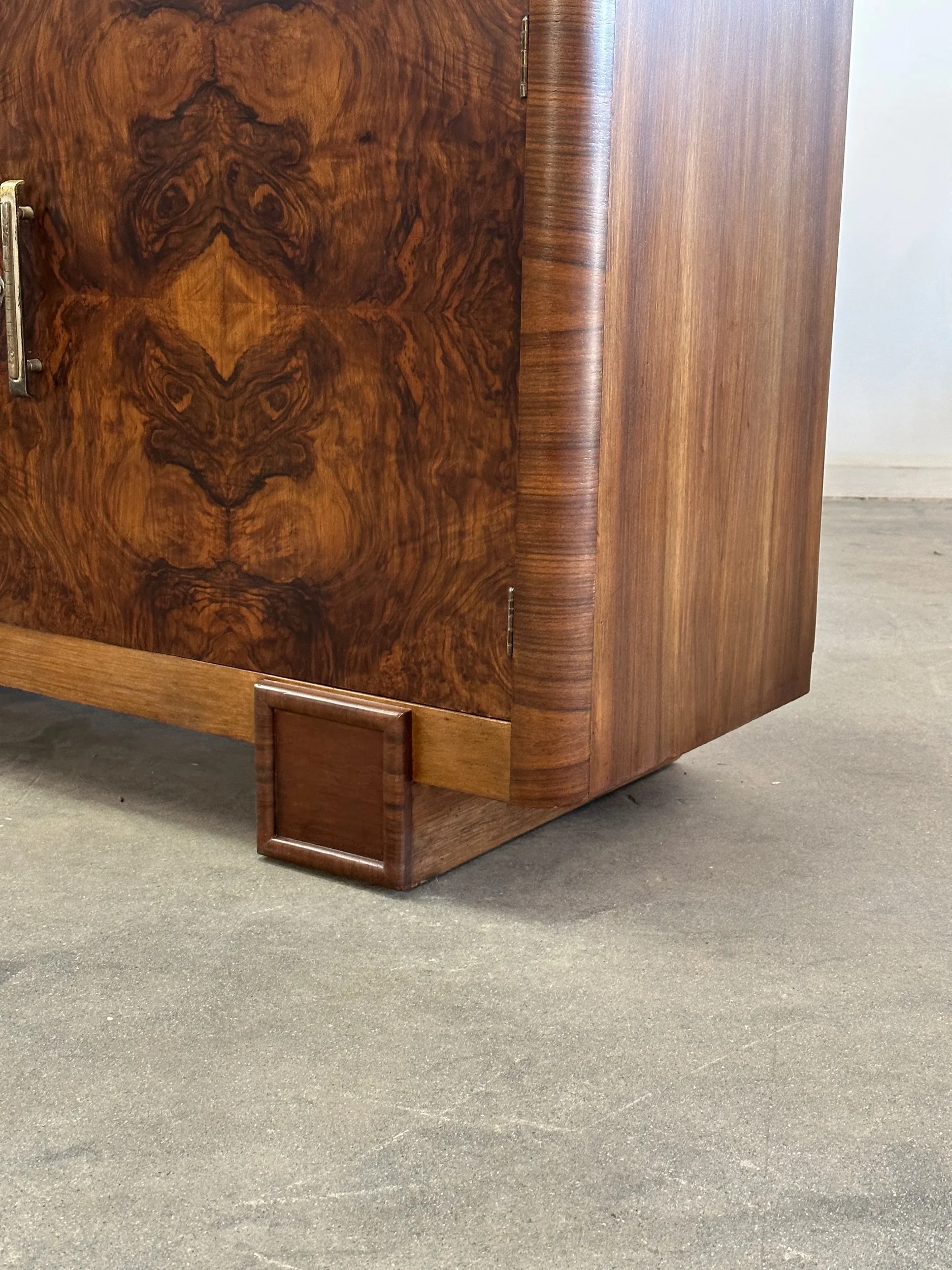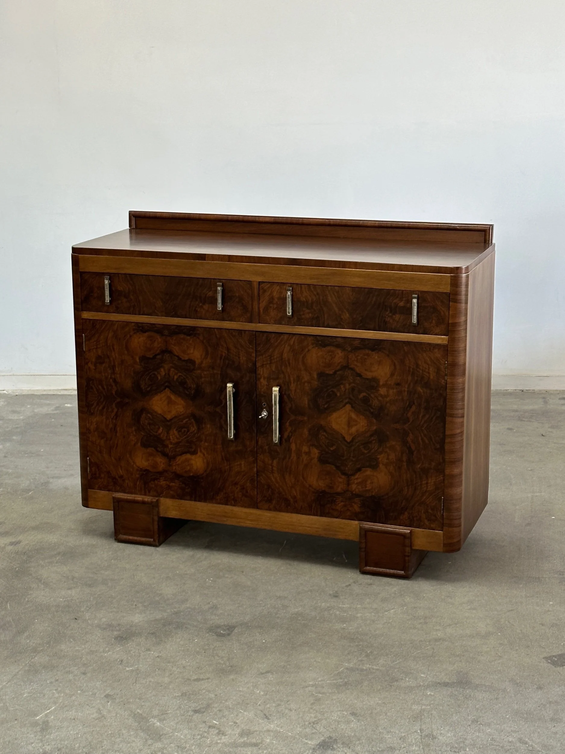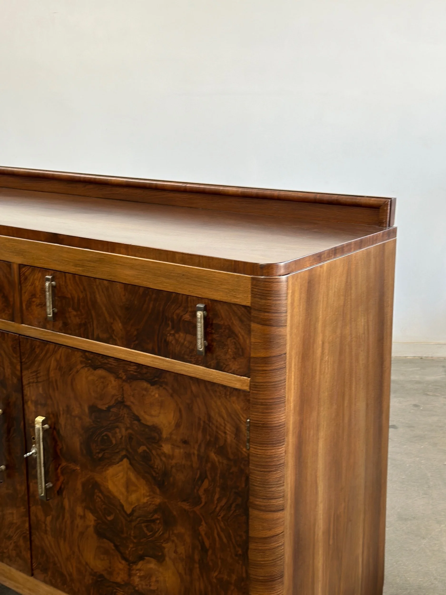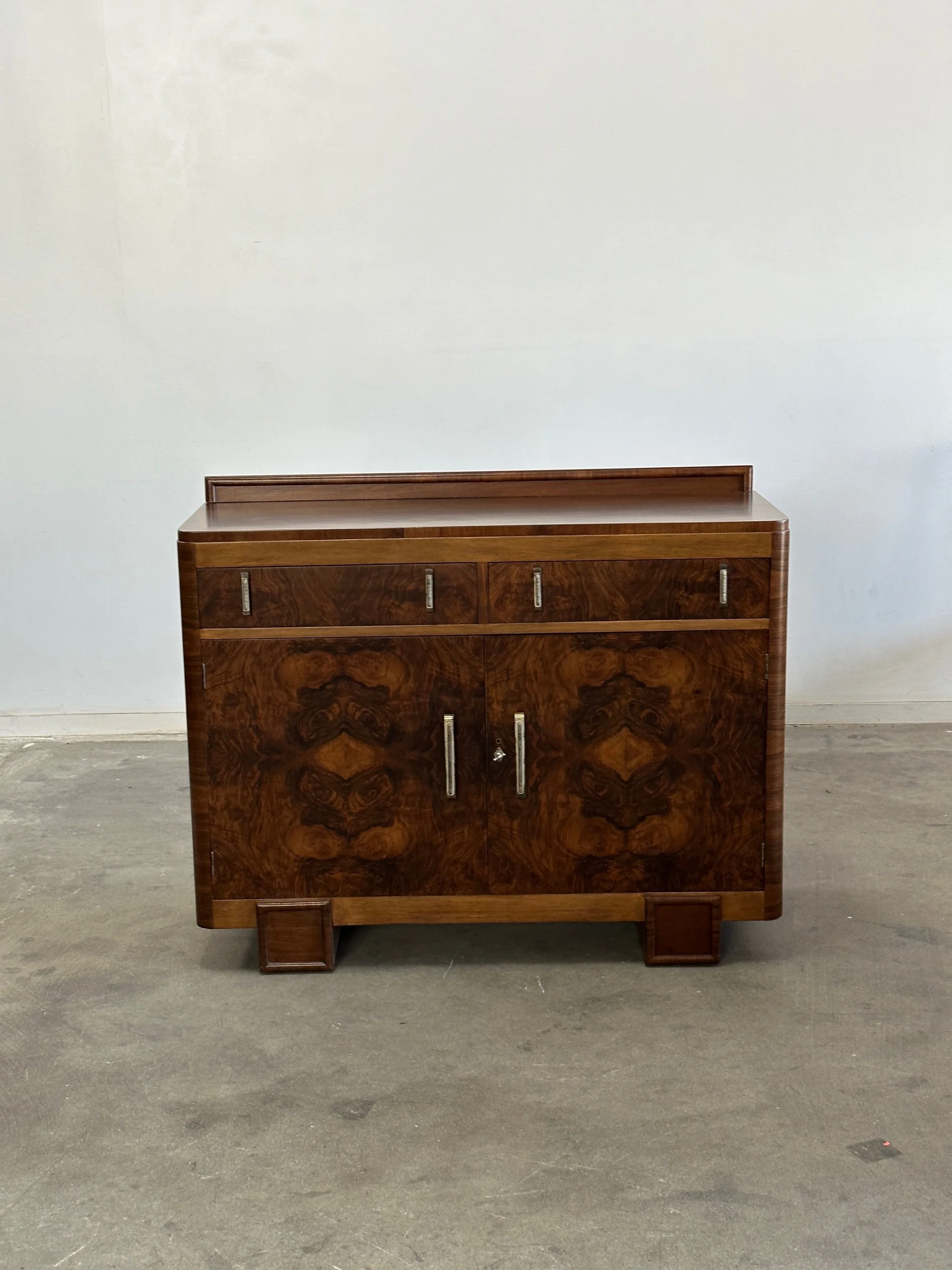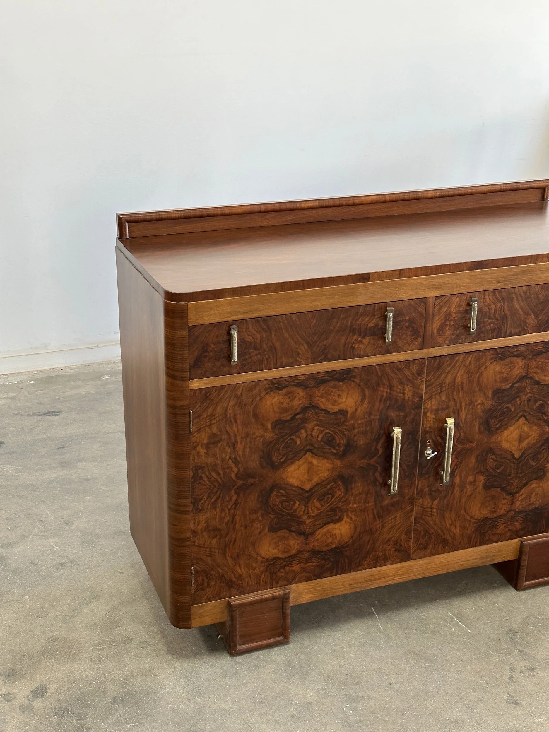 Are deco credenza, fully restored both structurally and aesthetically. Unit features exceptionally Burl wood , square inset feet, a raised back , rounded corners , and original hardware. Item is structurally sound, fully functional, and shows well.
