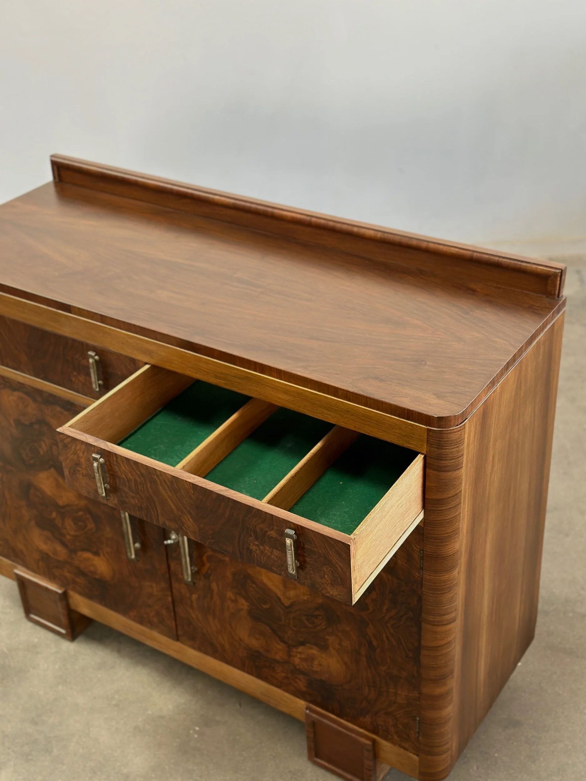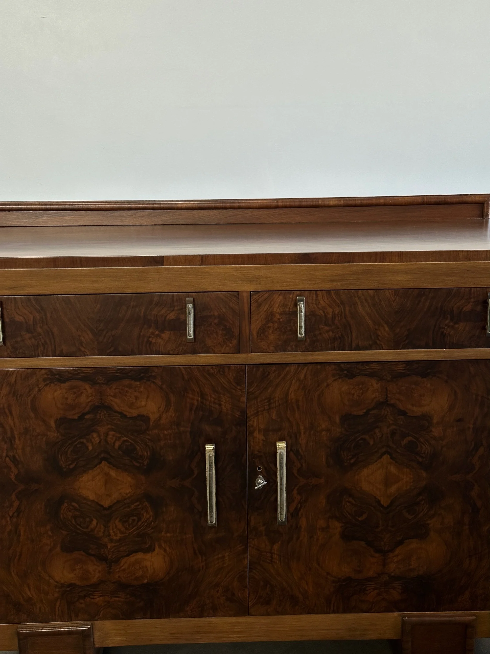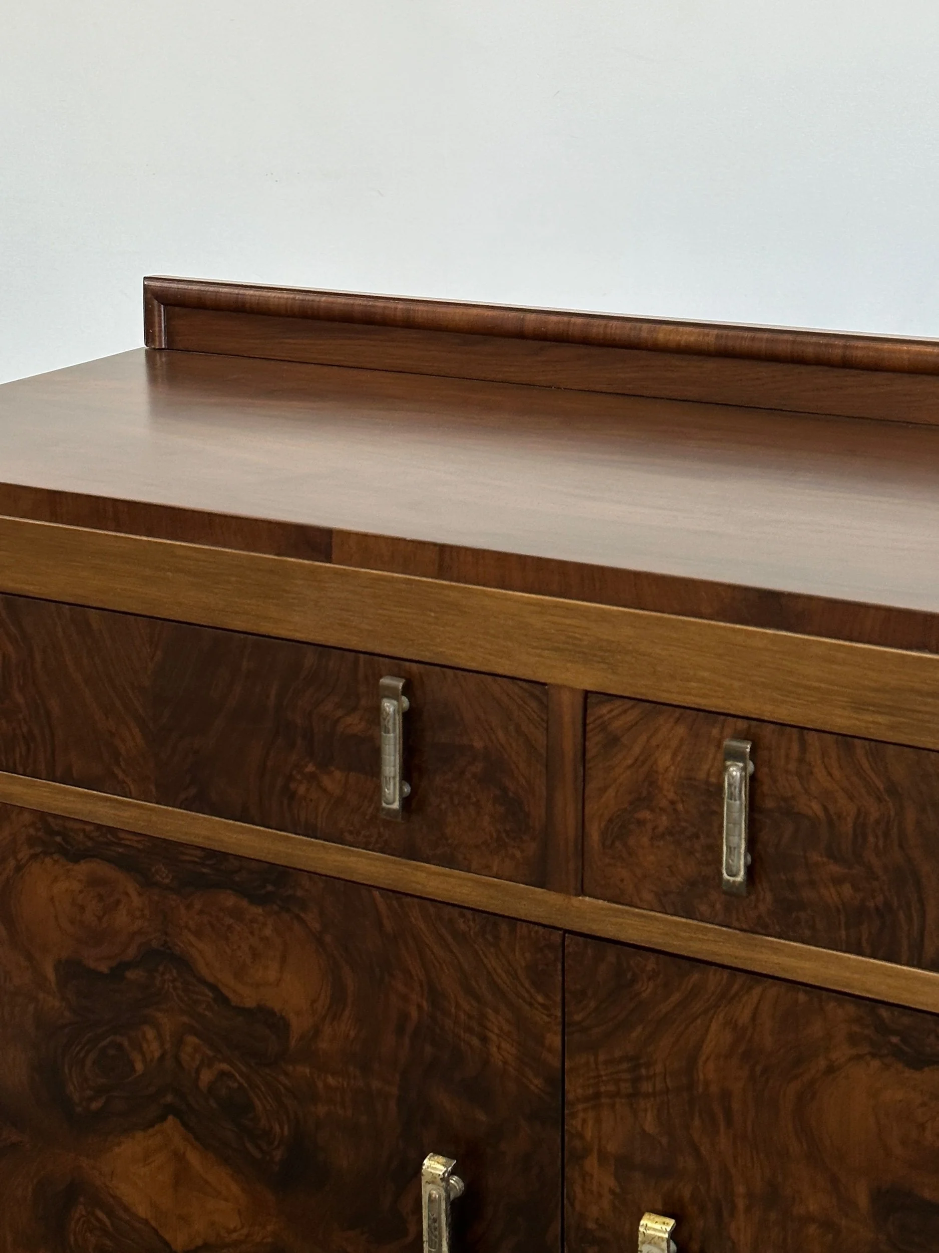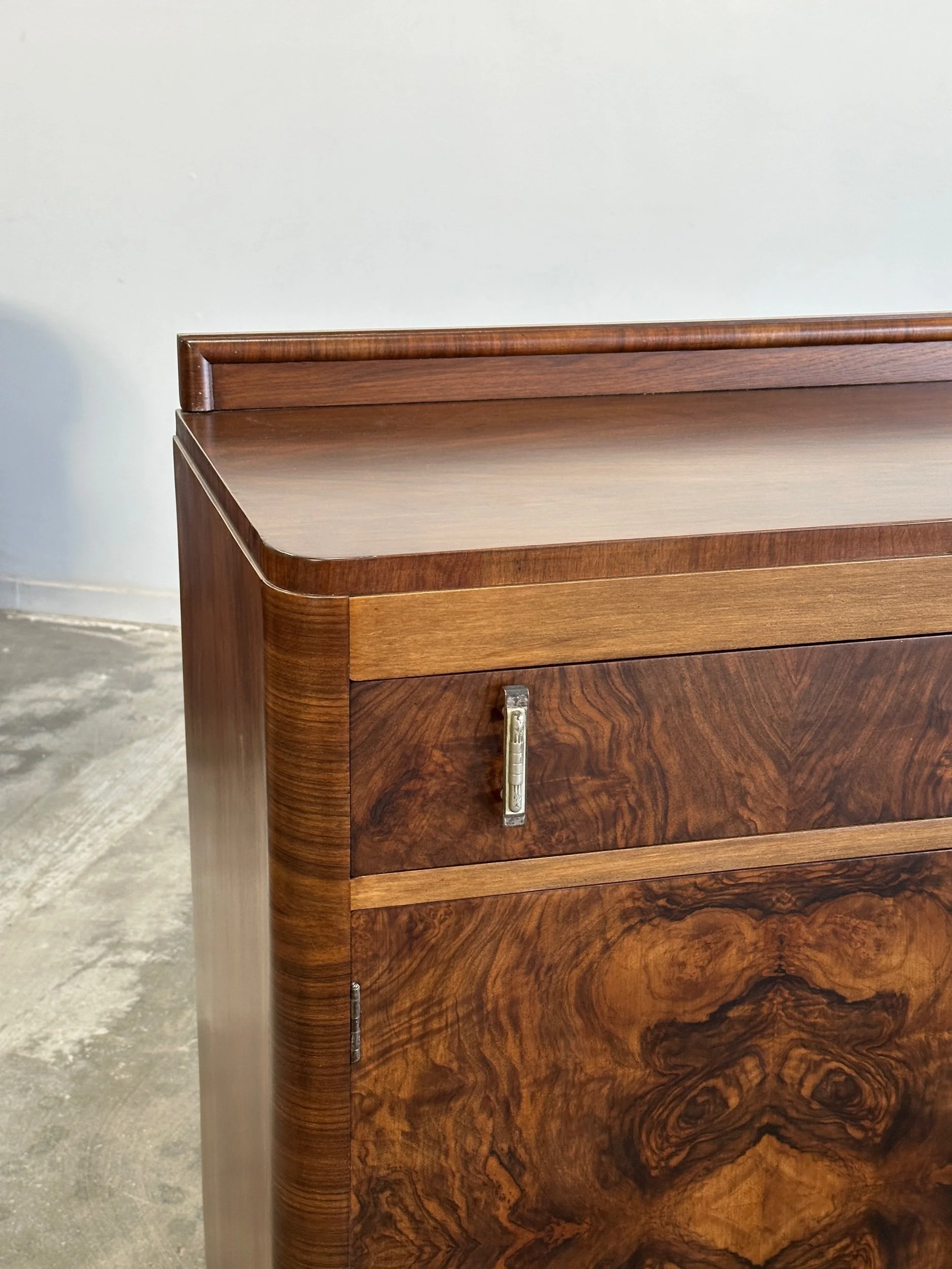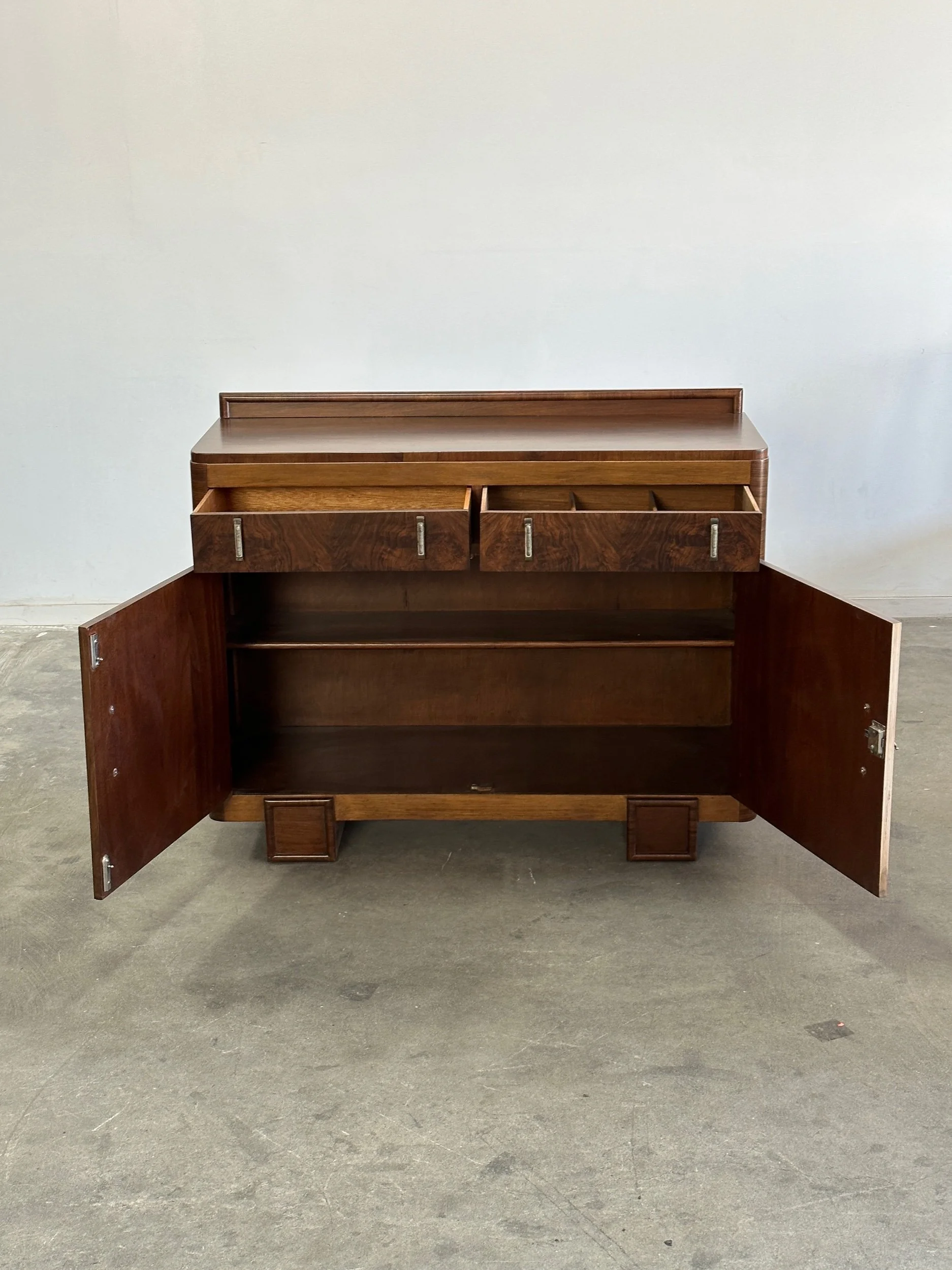 Are deco credenza, fully restored both structurally and aesthetically. Unit features exceptionally Burl wood , square inset feet, a raised back , rounded corners , and original hardware. Item is structurally sound, fully functional, and shows well.