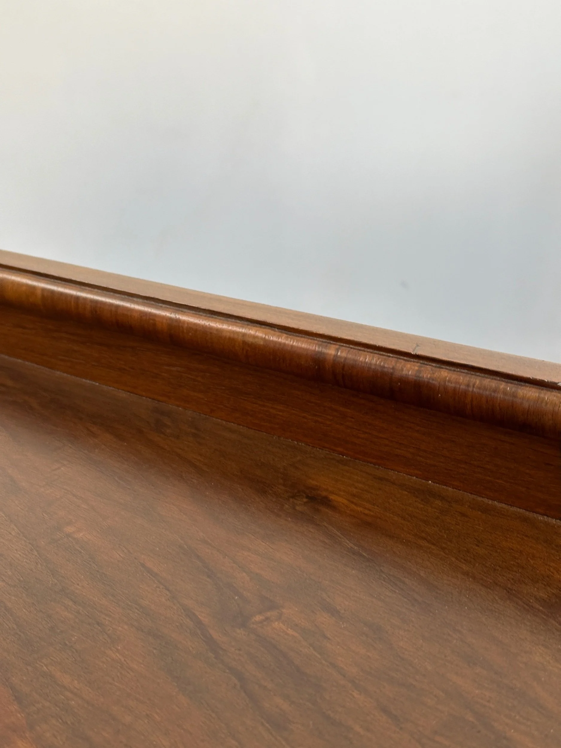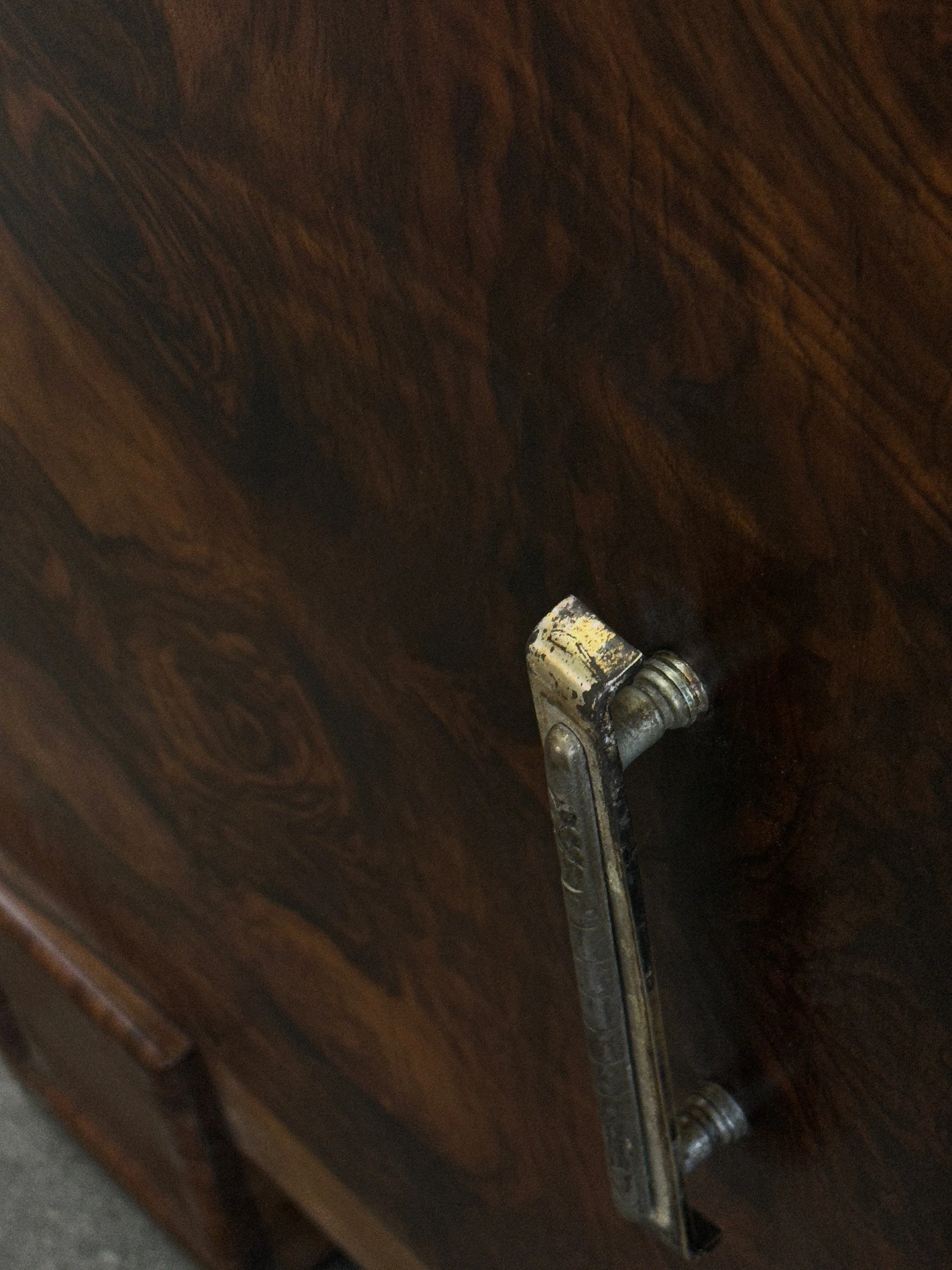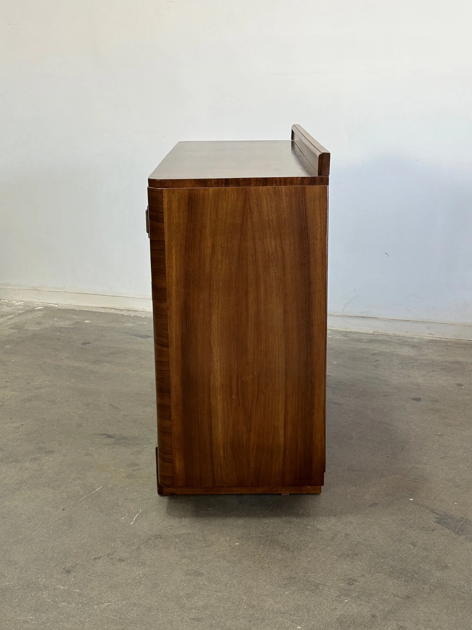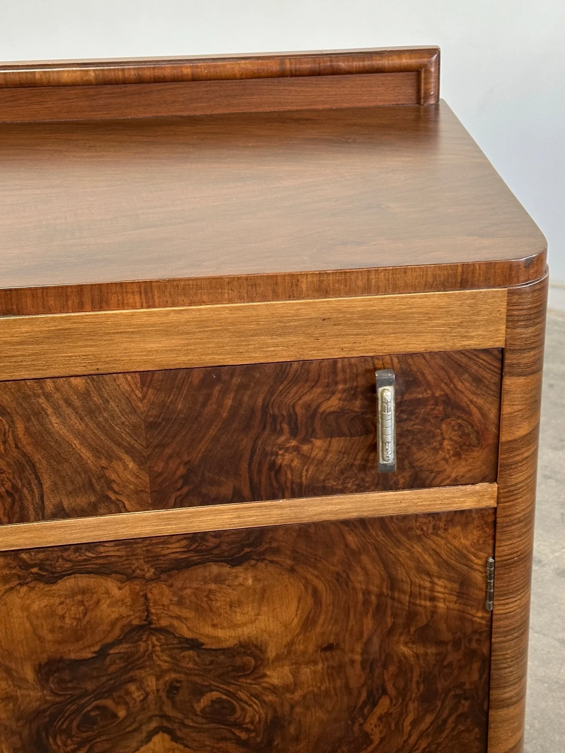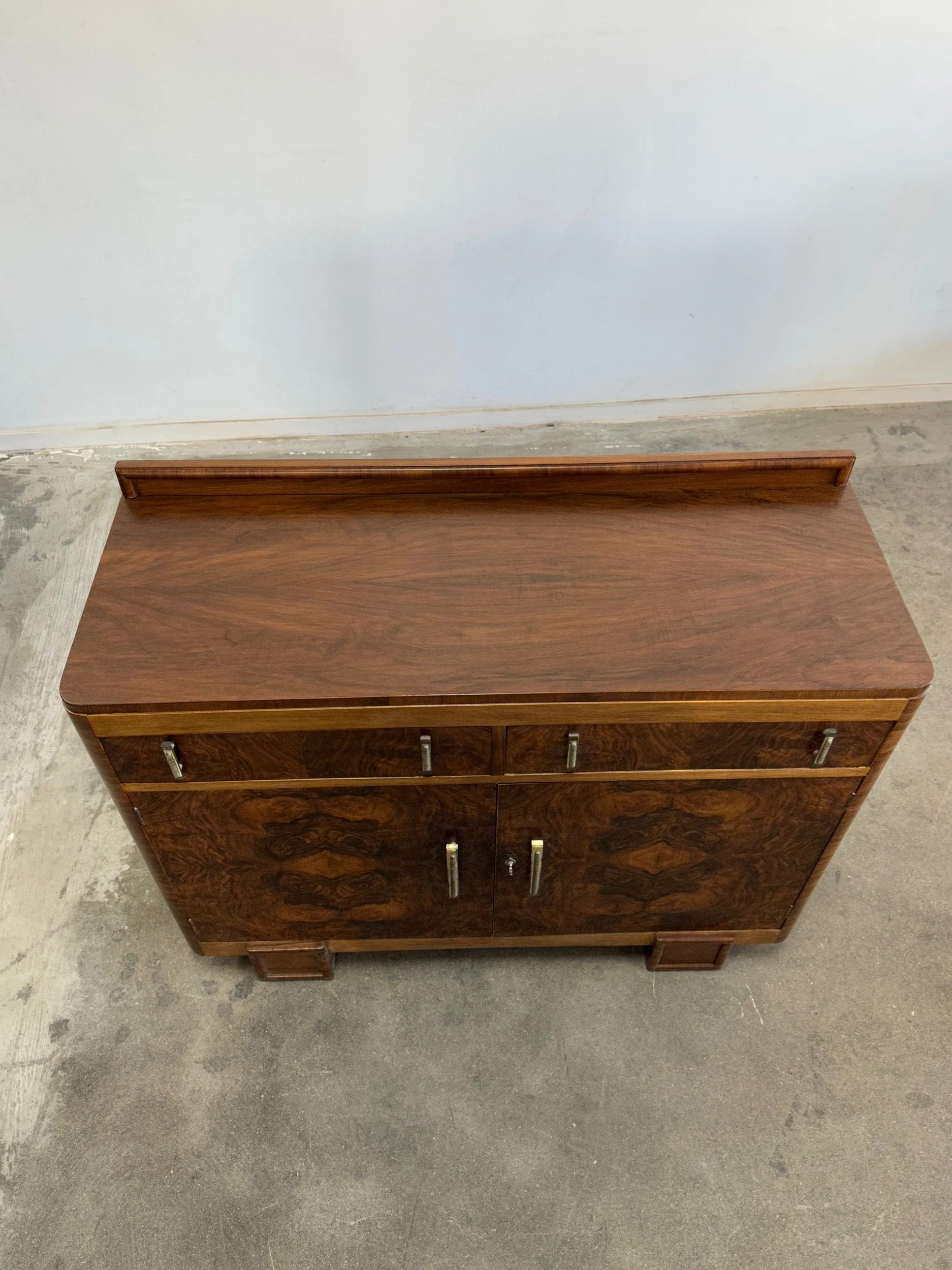 Are deco credenza, fully restored both structurally and aesthetically. Unit features exceptionally Burl wood , square inset feet, a raised back , rounded corners , and original hardware. Item is structurally sound, fully functional, and shows well.