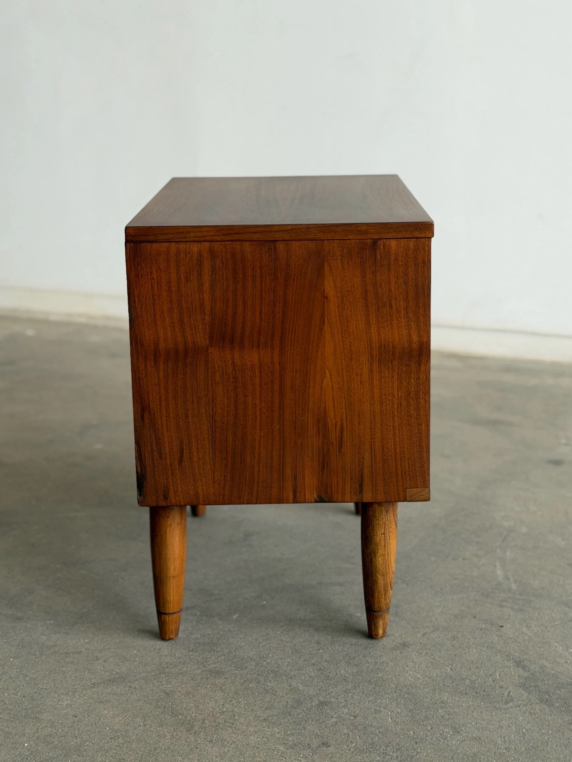 Minimal Walnut nightstand is designed with clean lines and a timeless silhouette. Crafted to highlight the natural richness of the wood, this piece brings warmth, simplicity, and functional elegance to any bedside.