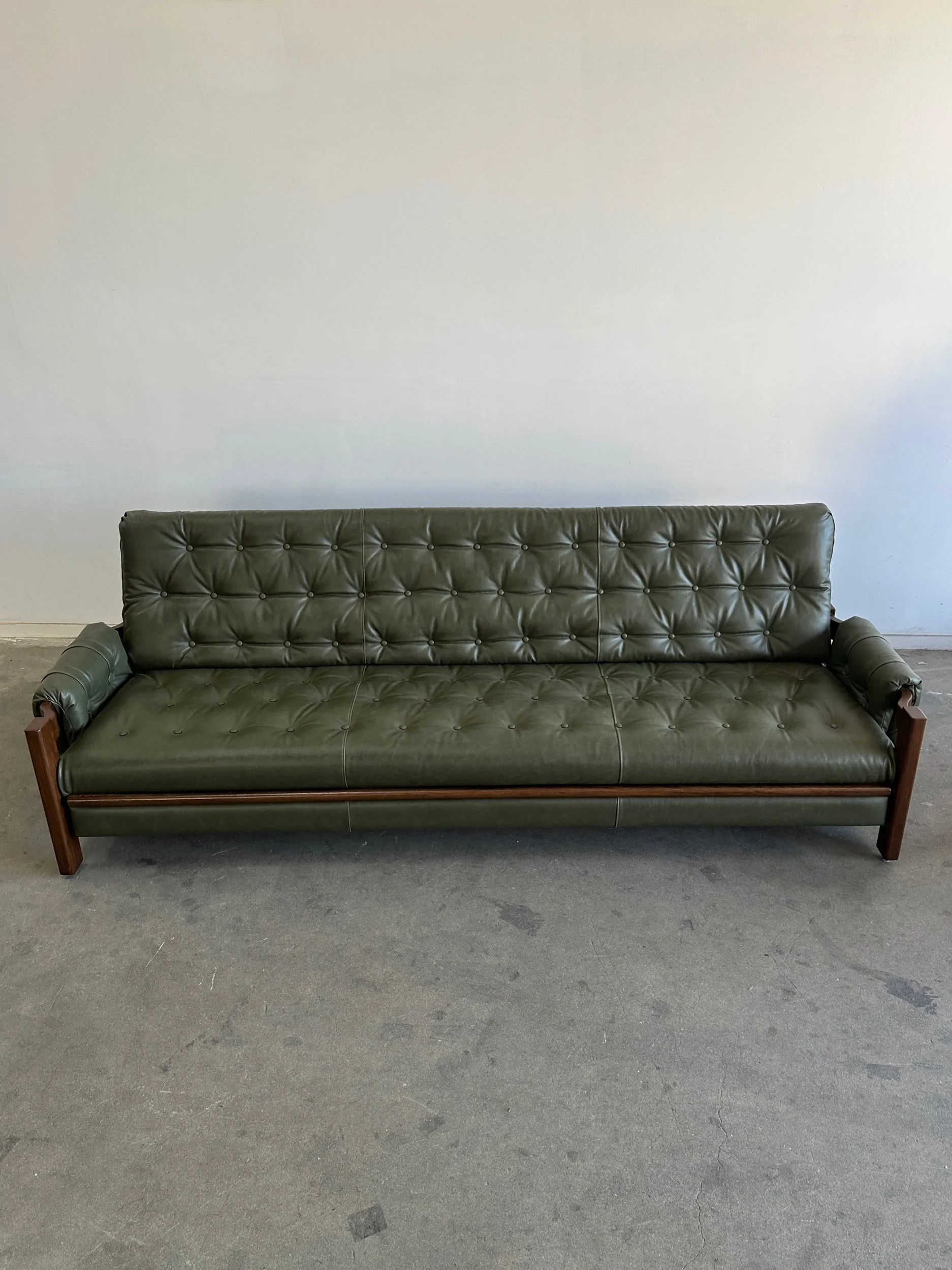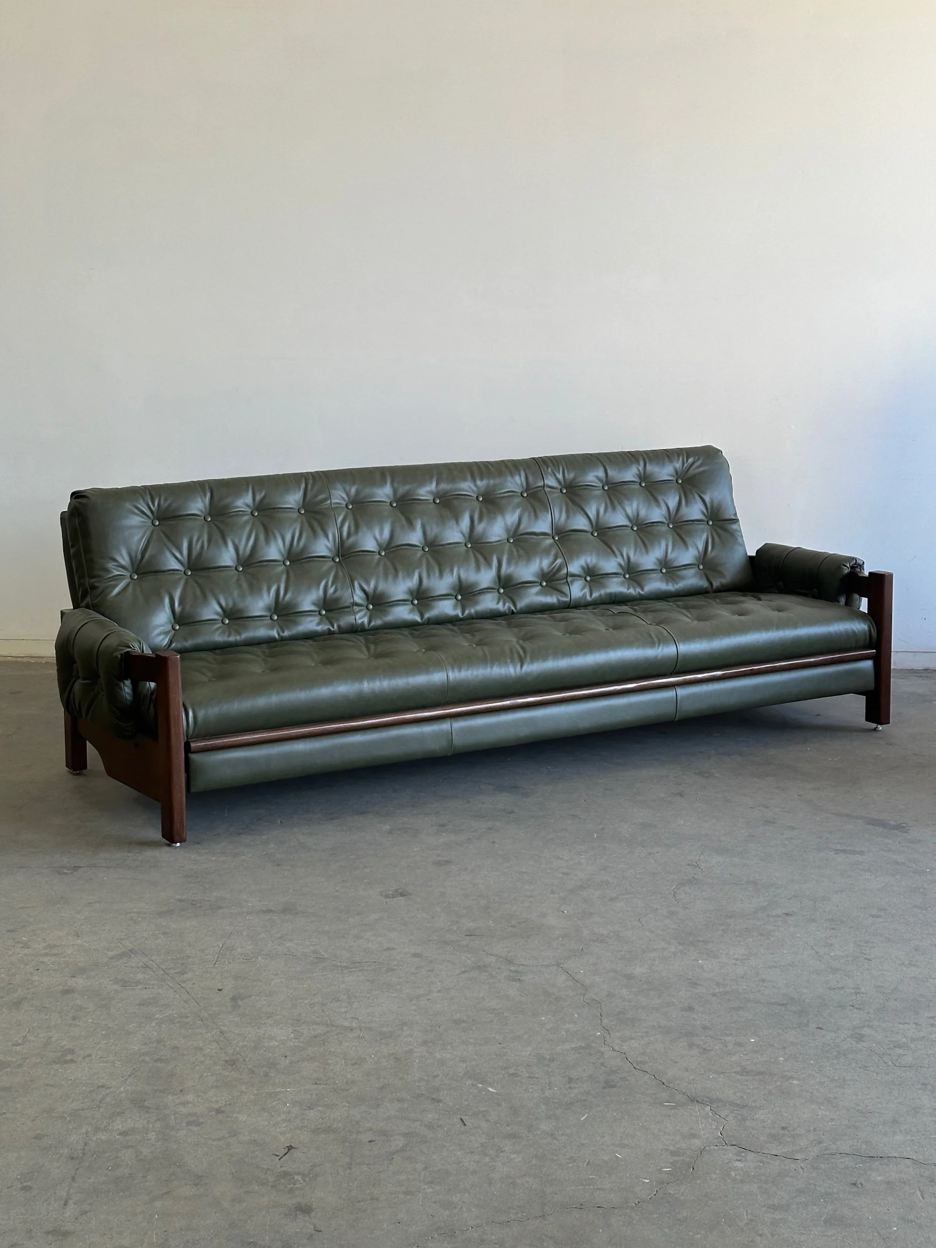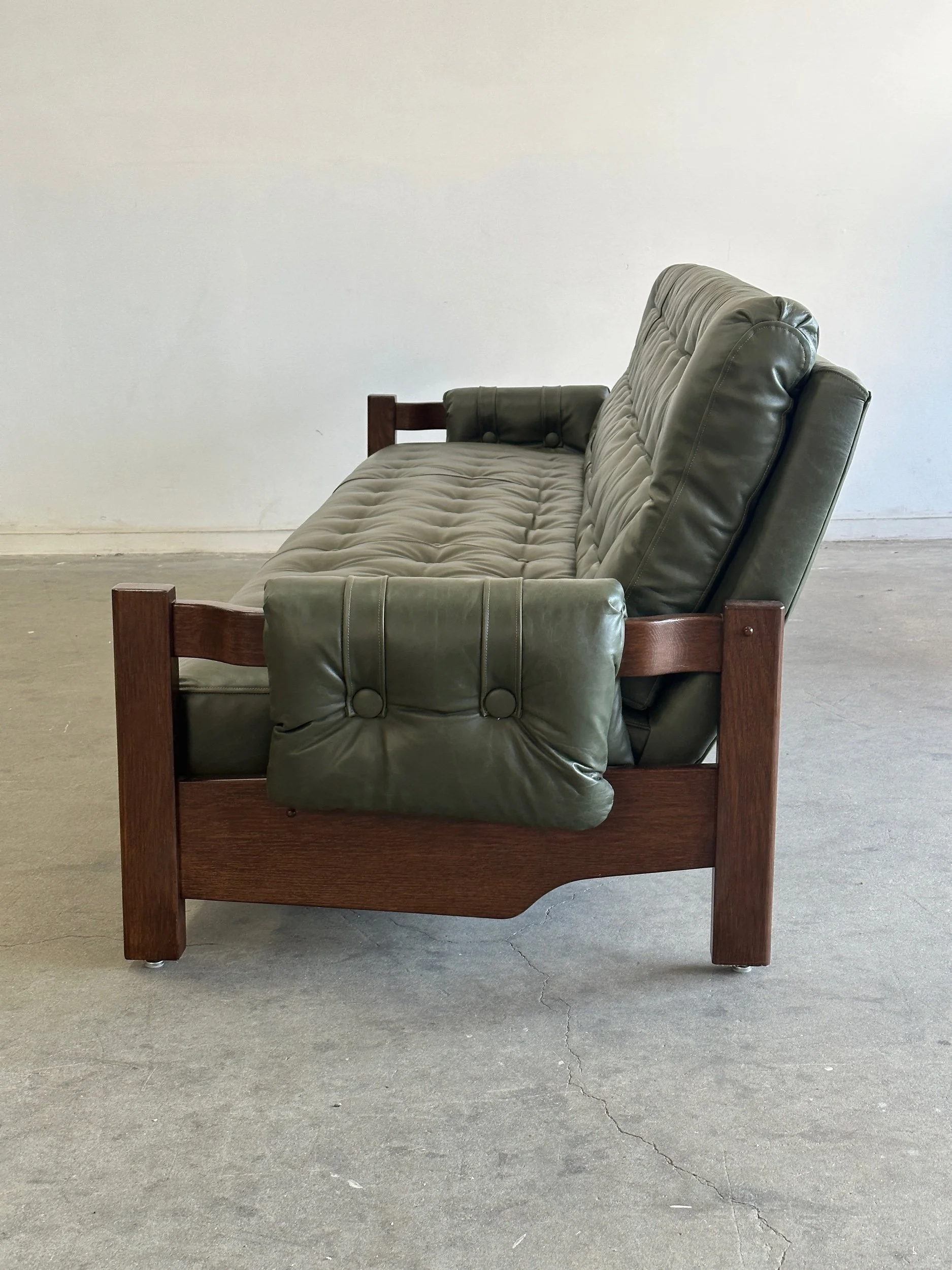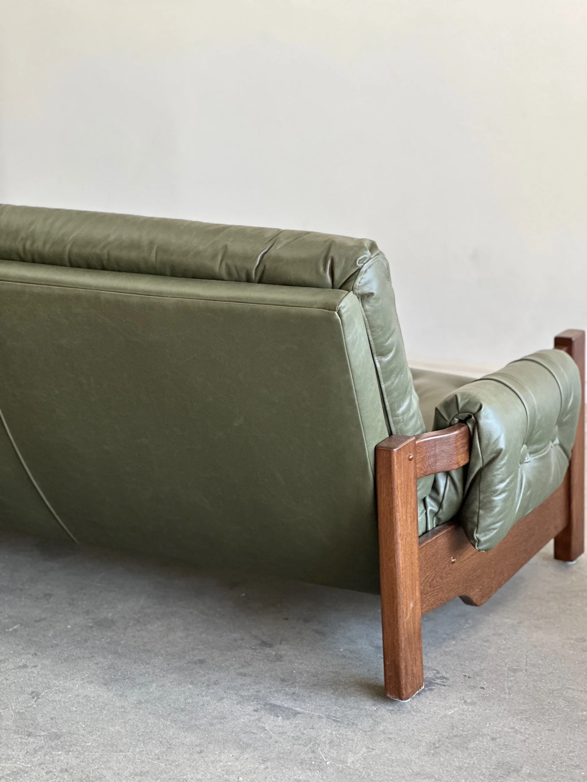 Our take on a Safari Sling Style Sofa. Unit features solid interior framing in Alder, solid white oak arms, premium HR foam , and fresh leather in green. Unit is newly made and has no visible areas of wear. This standard sofa offers ample length and standard depth. Price is for the floor model as shown.