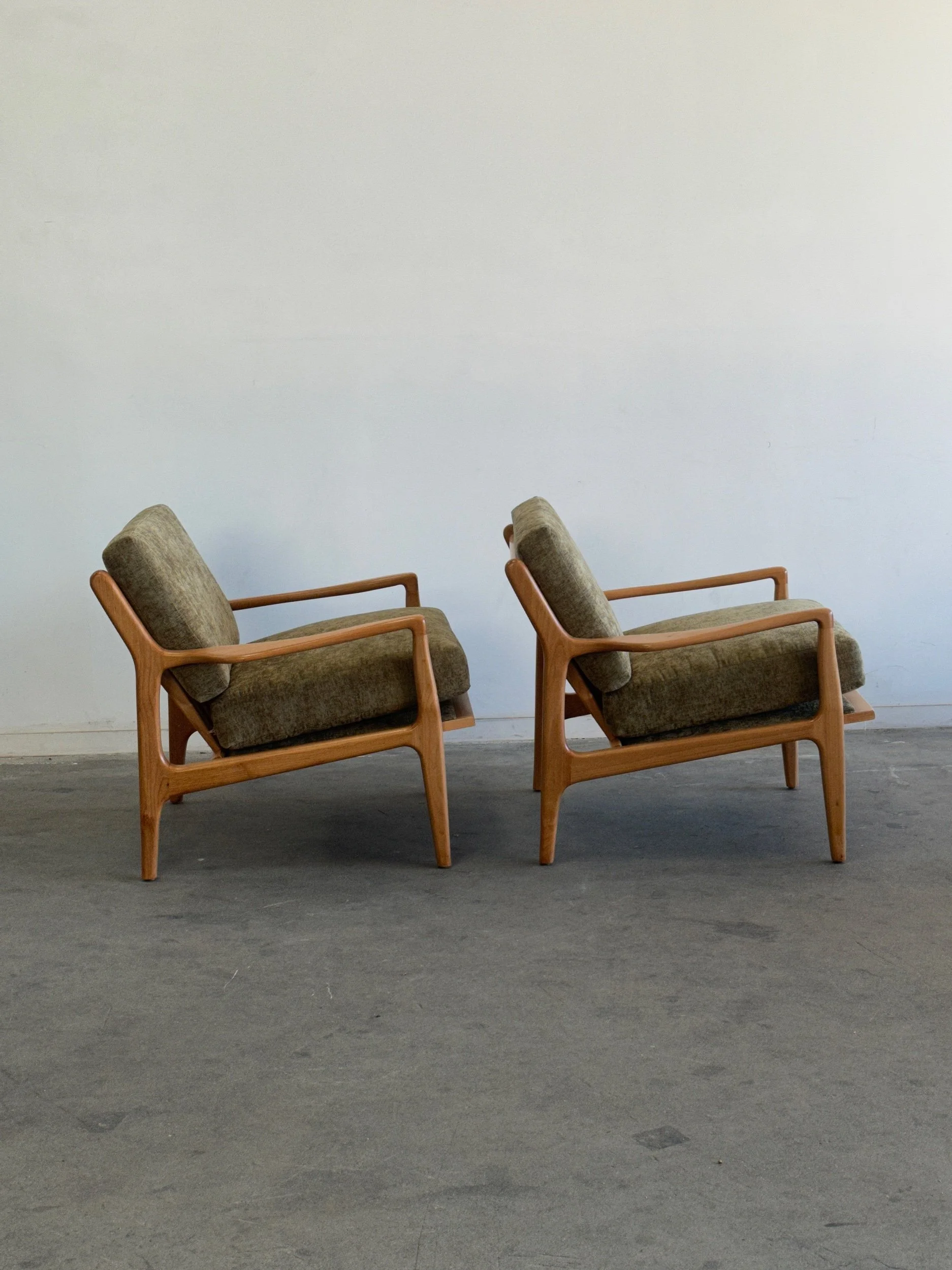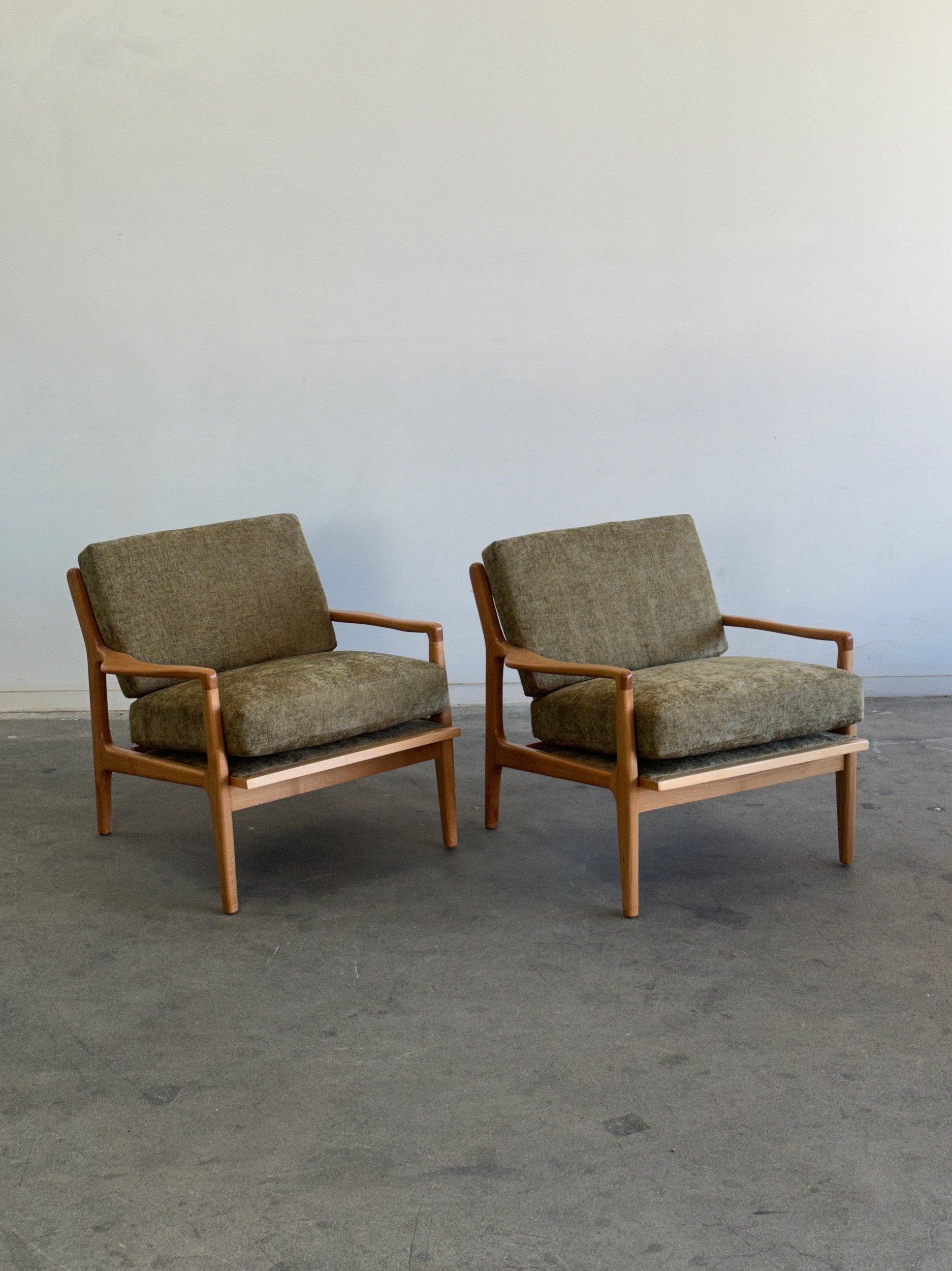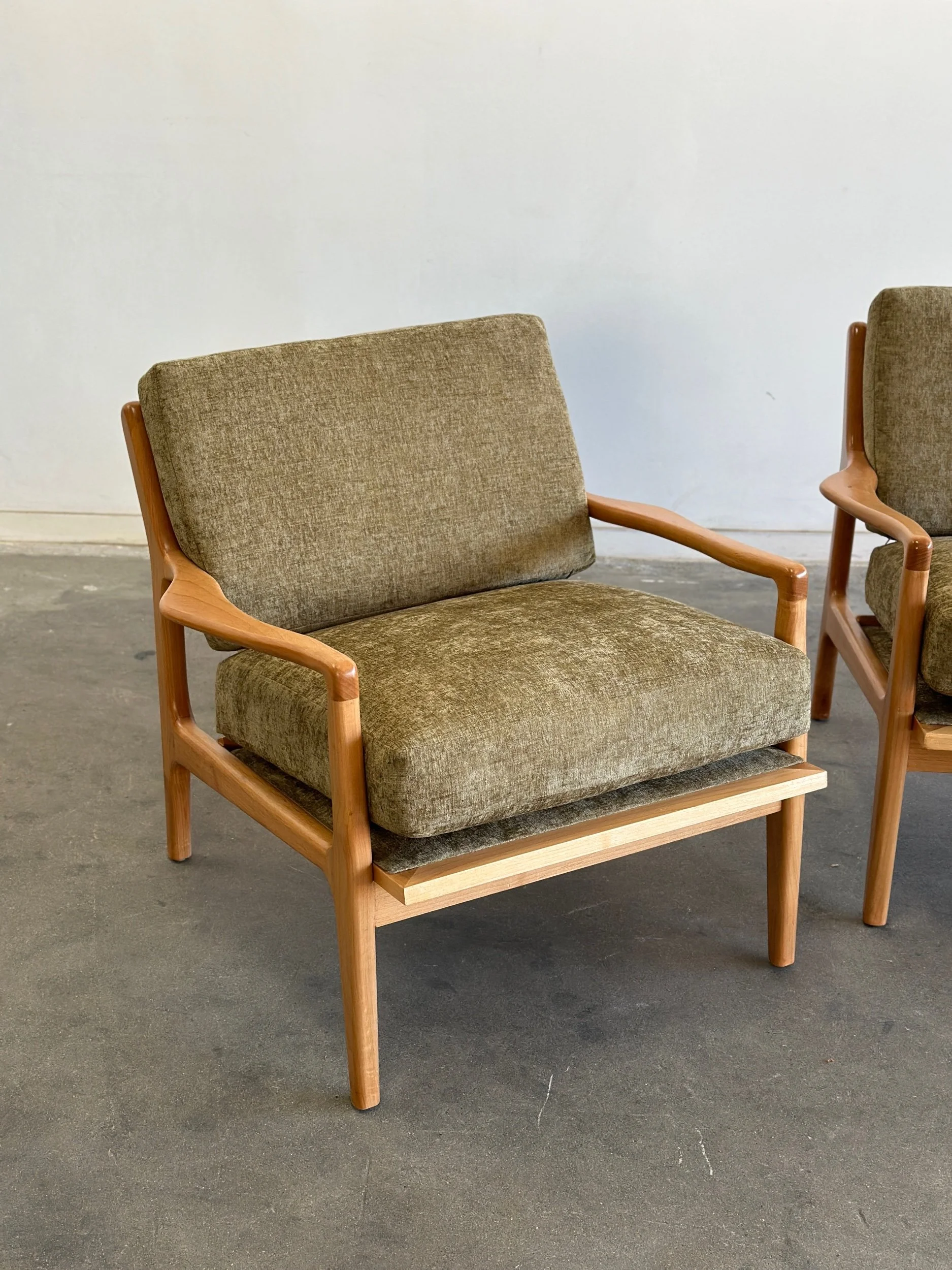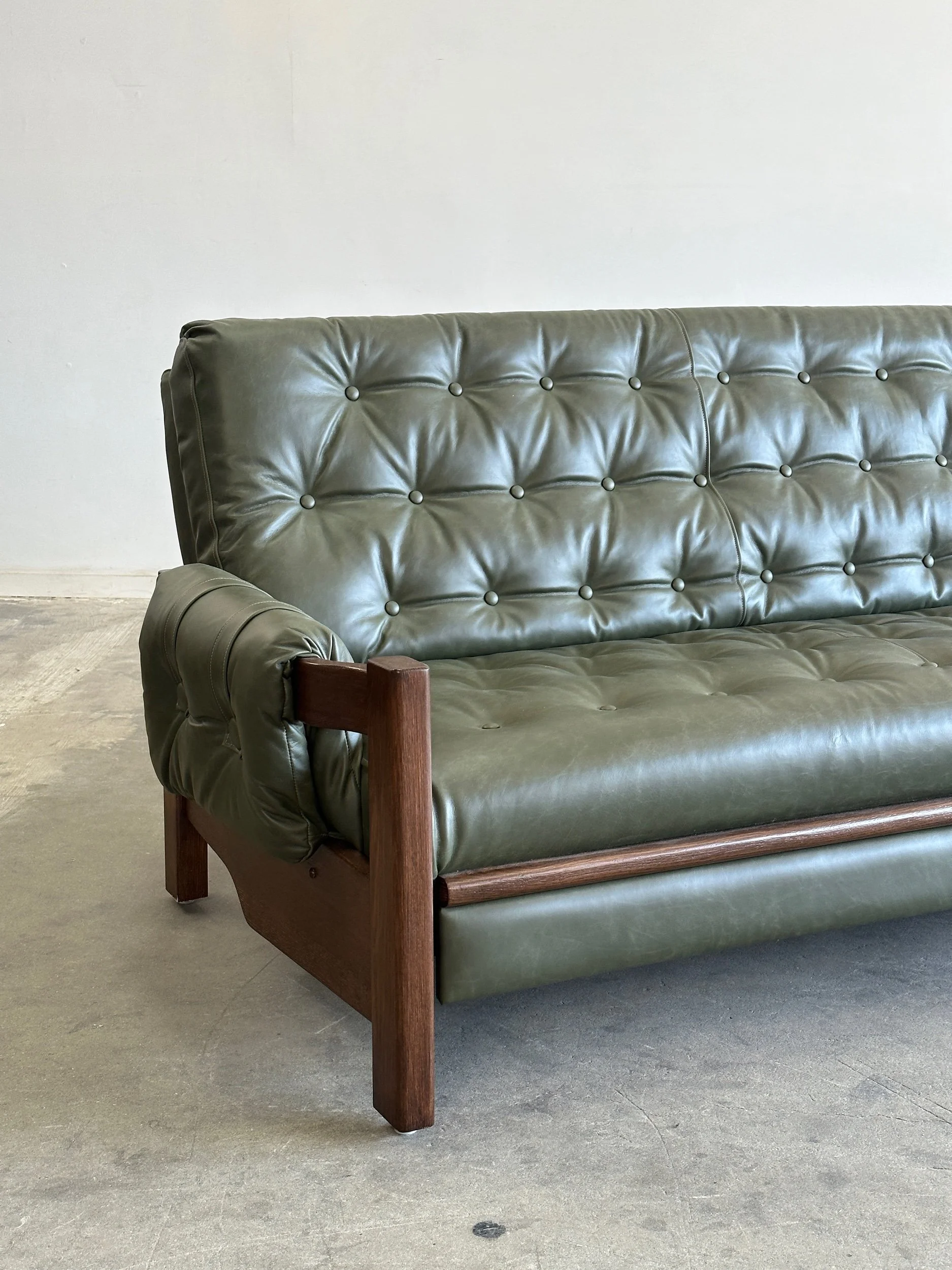 Our take on a Safari Sling Style Sofa. Unit features solid interior framing in Alder, solid white oak arms, premium HR foam , and fresh leather in green. Unit is newly made and has no visible areas of wear. This standard sofa offers ample length and standard depth. Price is for the floor model as shown.