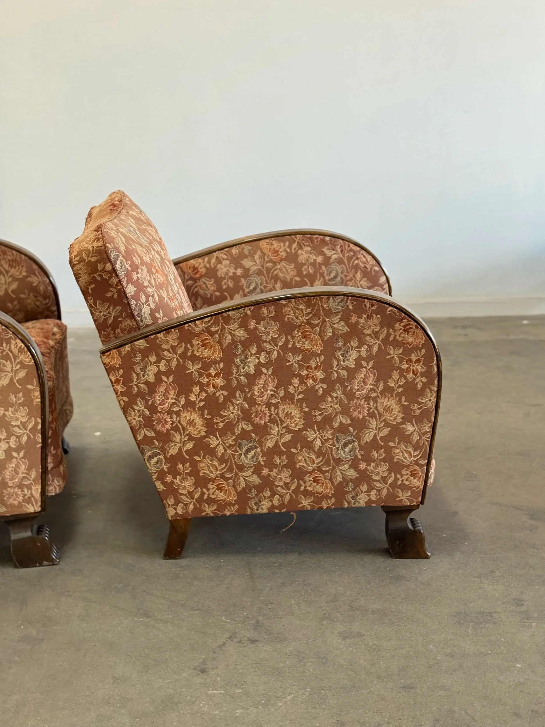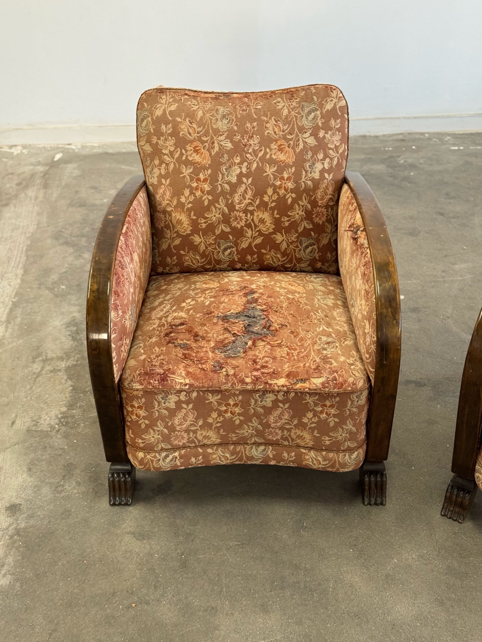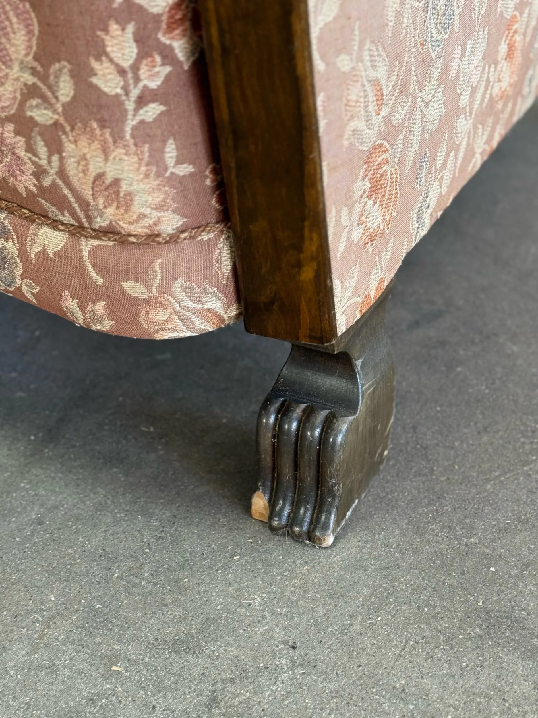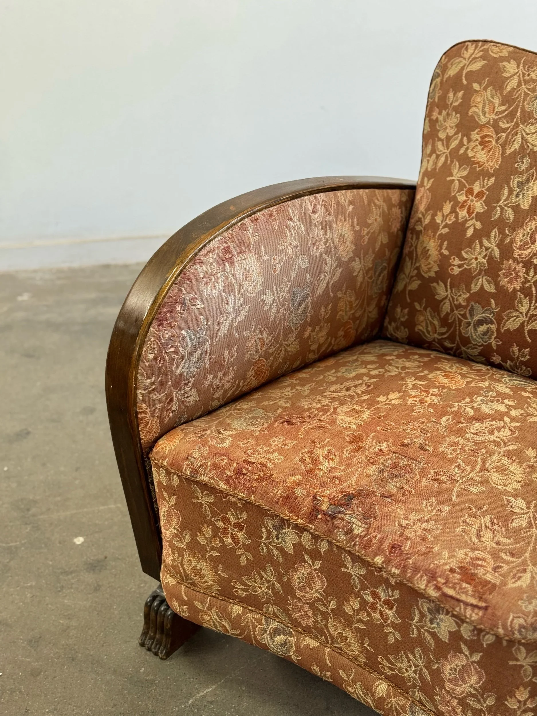 These Art Deco Club chairs feature beautifully curved wood arms, claw like front feet, and classic floral upholstery. The design captures the elegance and craftsmanship of early 20th-century European furniture with their sturdy frames, detailed woodwork, and timeless silhouette. The original floral fabric shows age and wear, making these an ideal project piece for reupholstery.