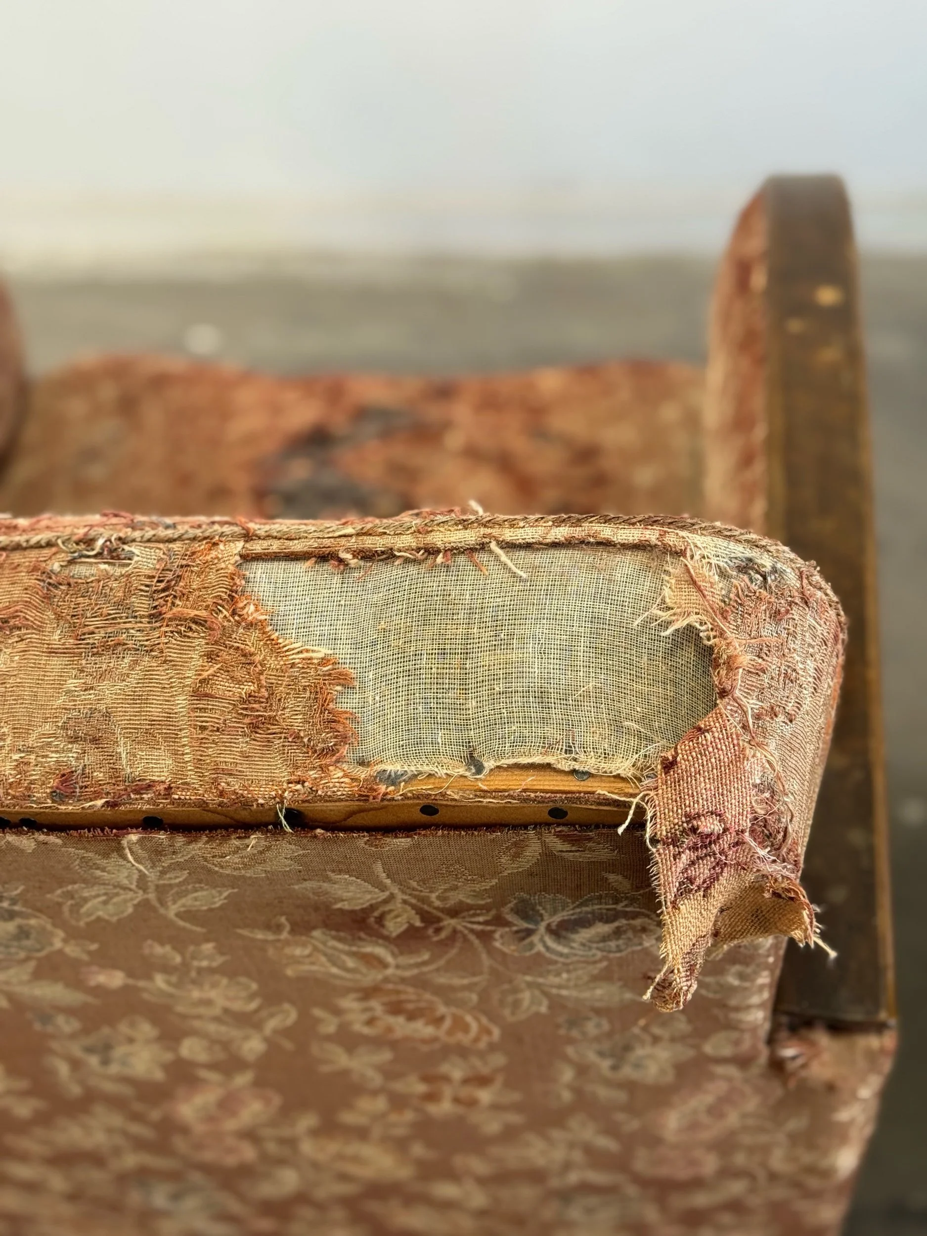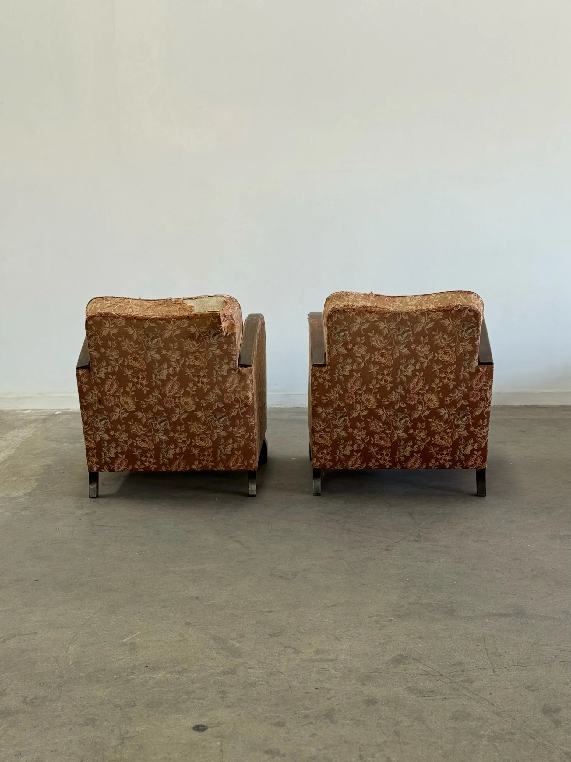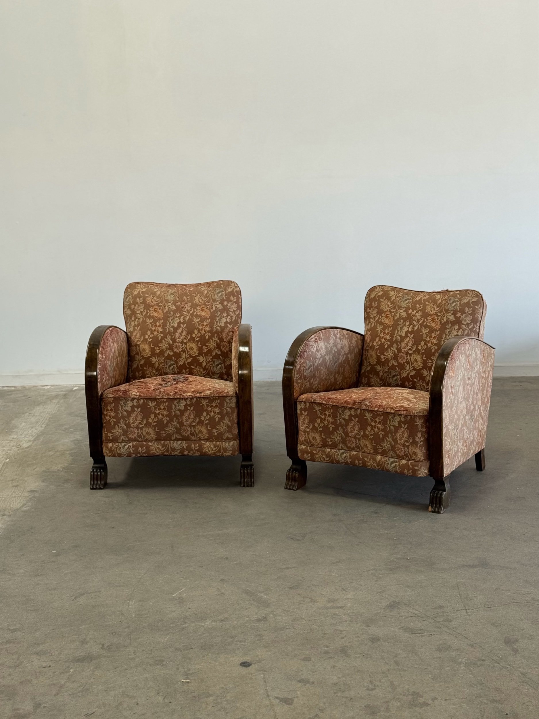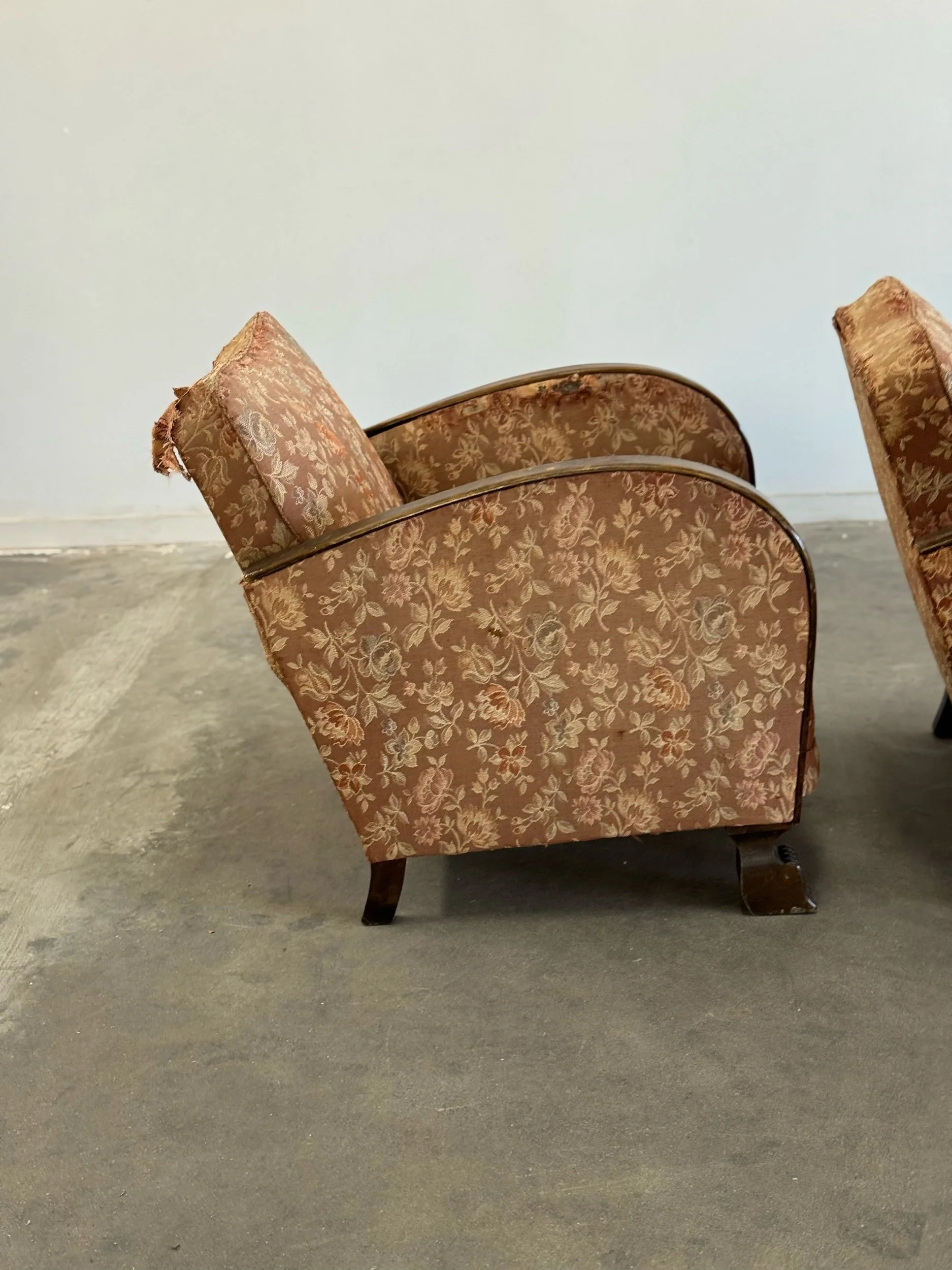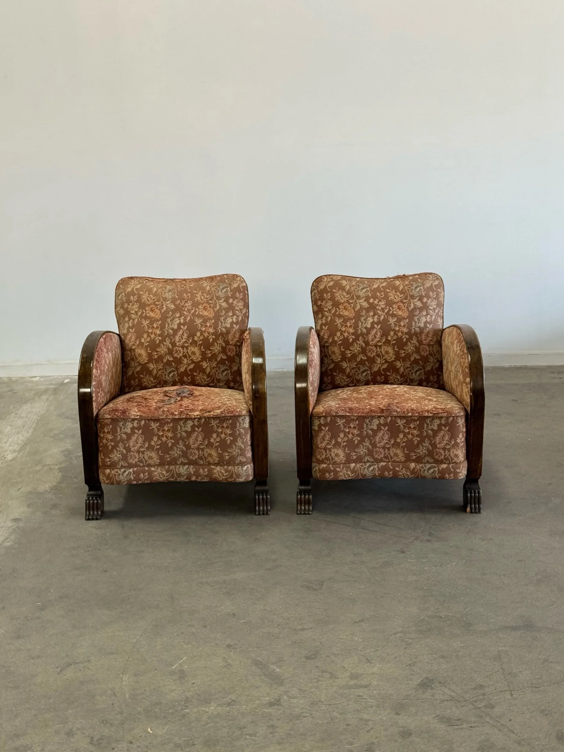 These Art Deco Club chairs feature beautifully curved wood arms, claw like front feet, and classic floral upholstery. The design captures the elegance and craftsmanship of early 20th-century European furniture with their sturdy frames, detailed woodwork, and timeless silhouette. The original floral fabric shows age and wear, making these an ideal project piece for reupholstery.