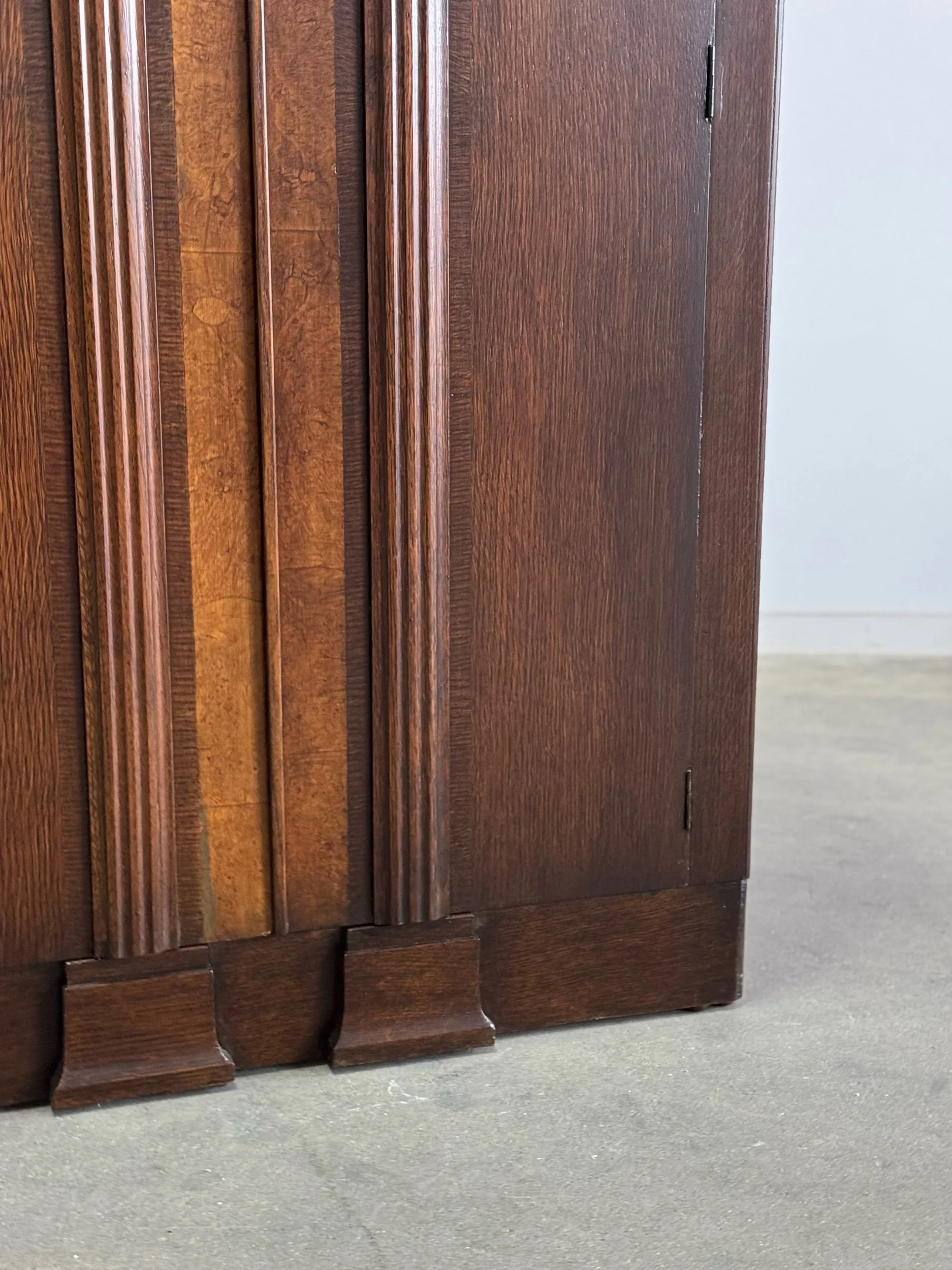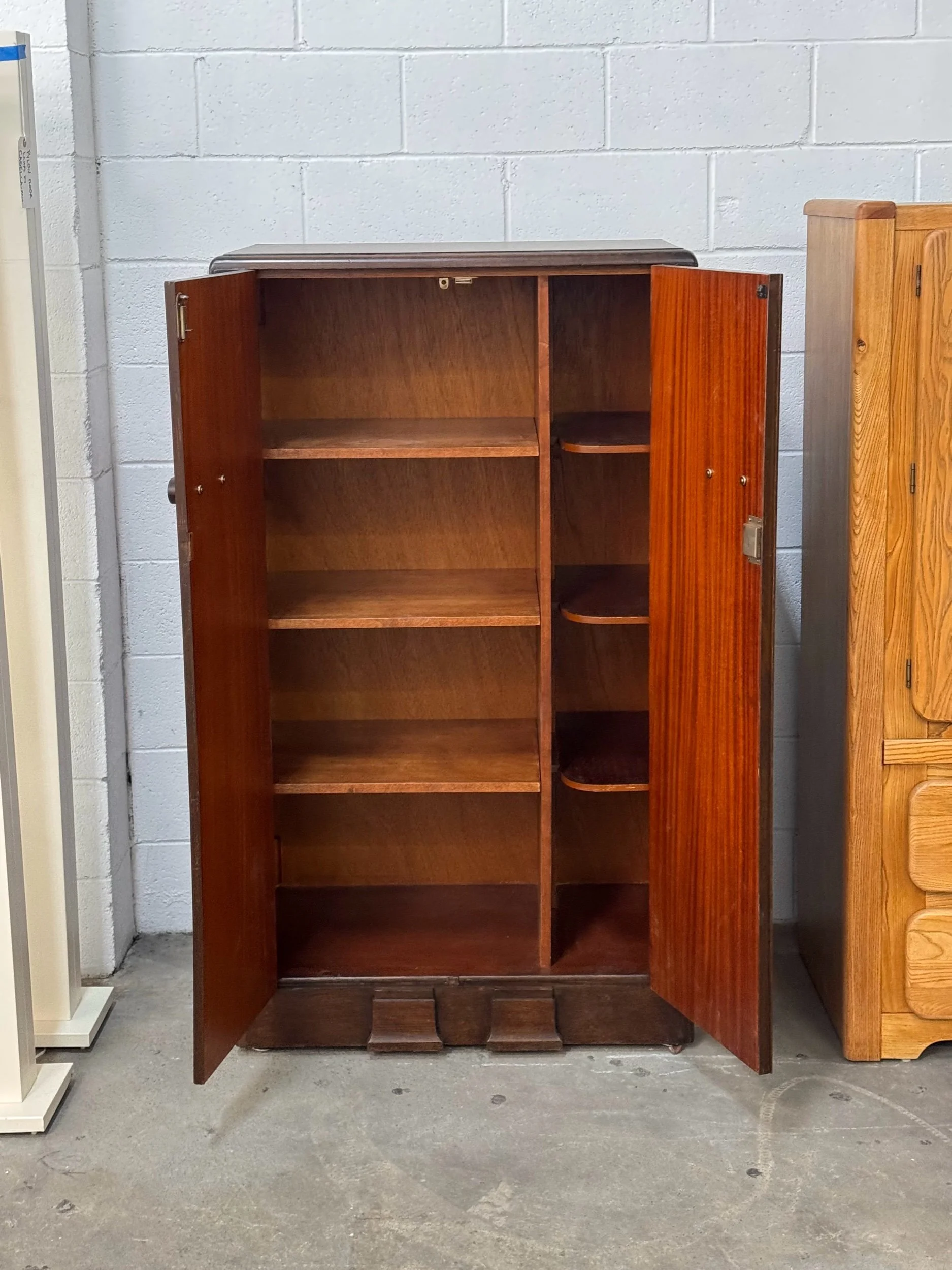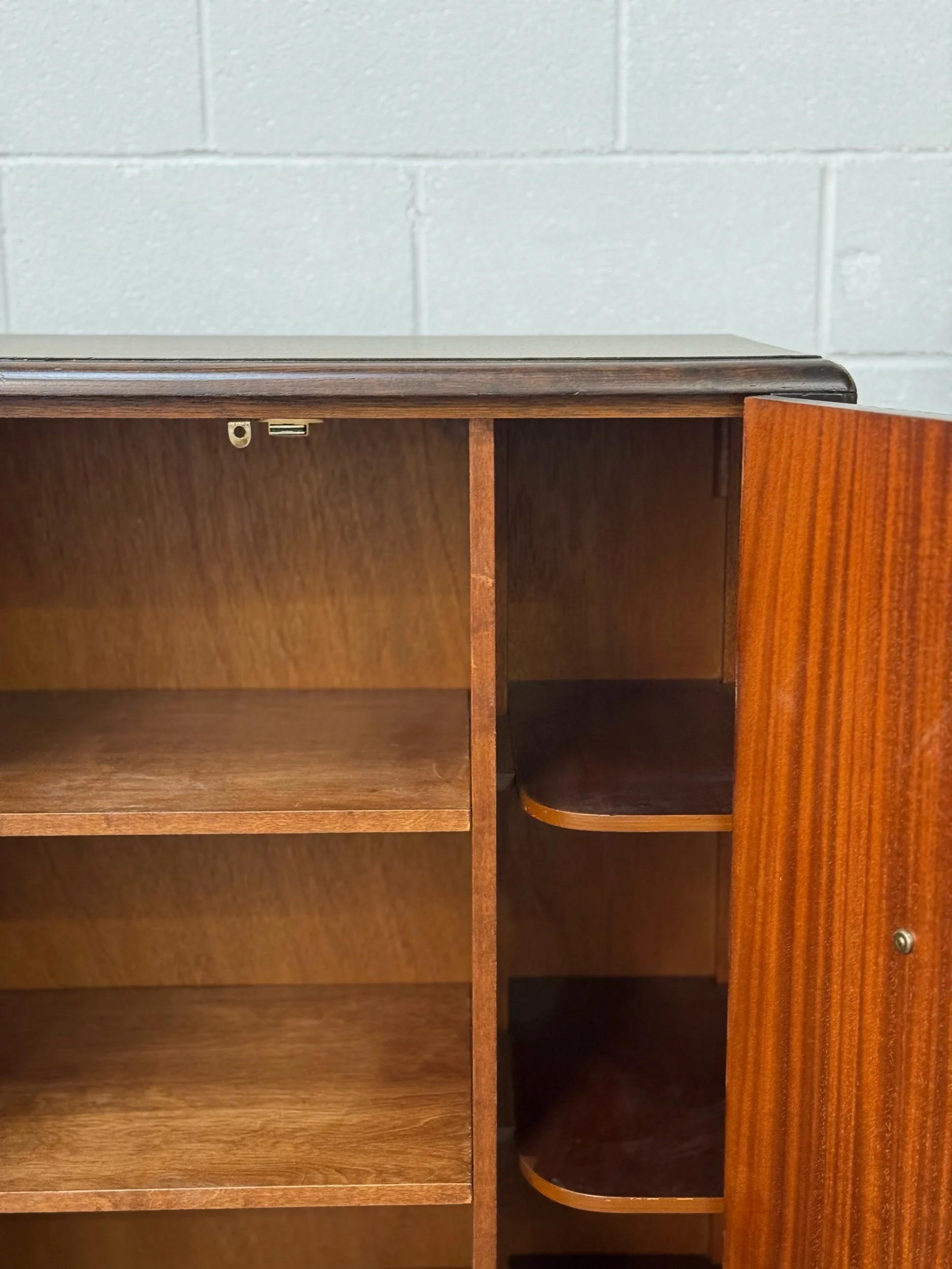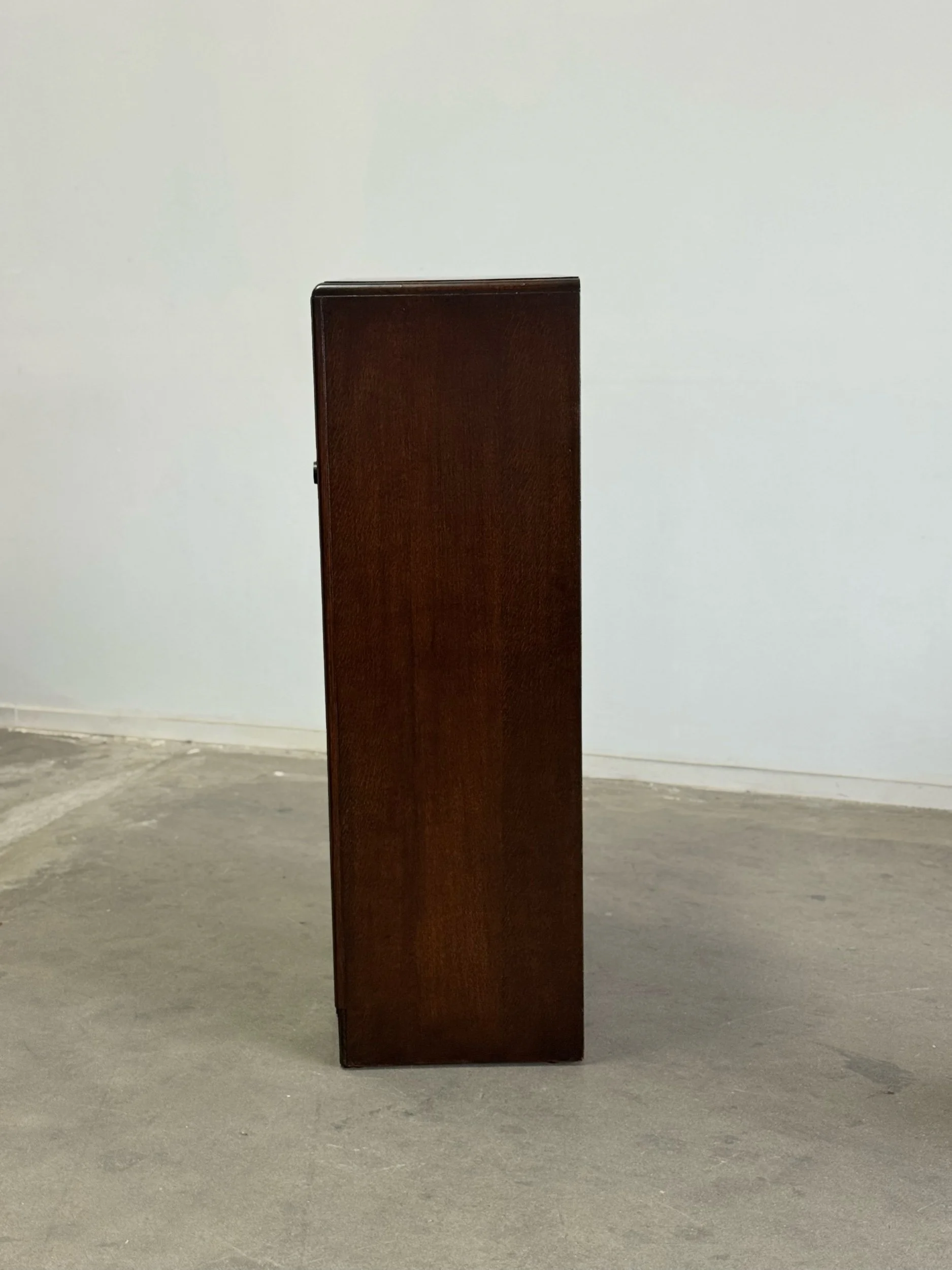 Fully restored bookshelf unit in great condition. Unit features a new medium dark honey finish, a new wooden backing , original hardware , and four removable shelves. Bookcase is in great structural standing and shows well with no major areas of wear.