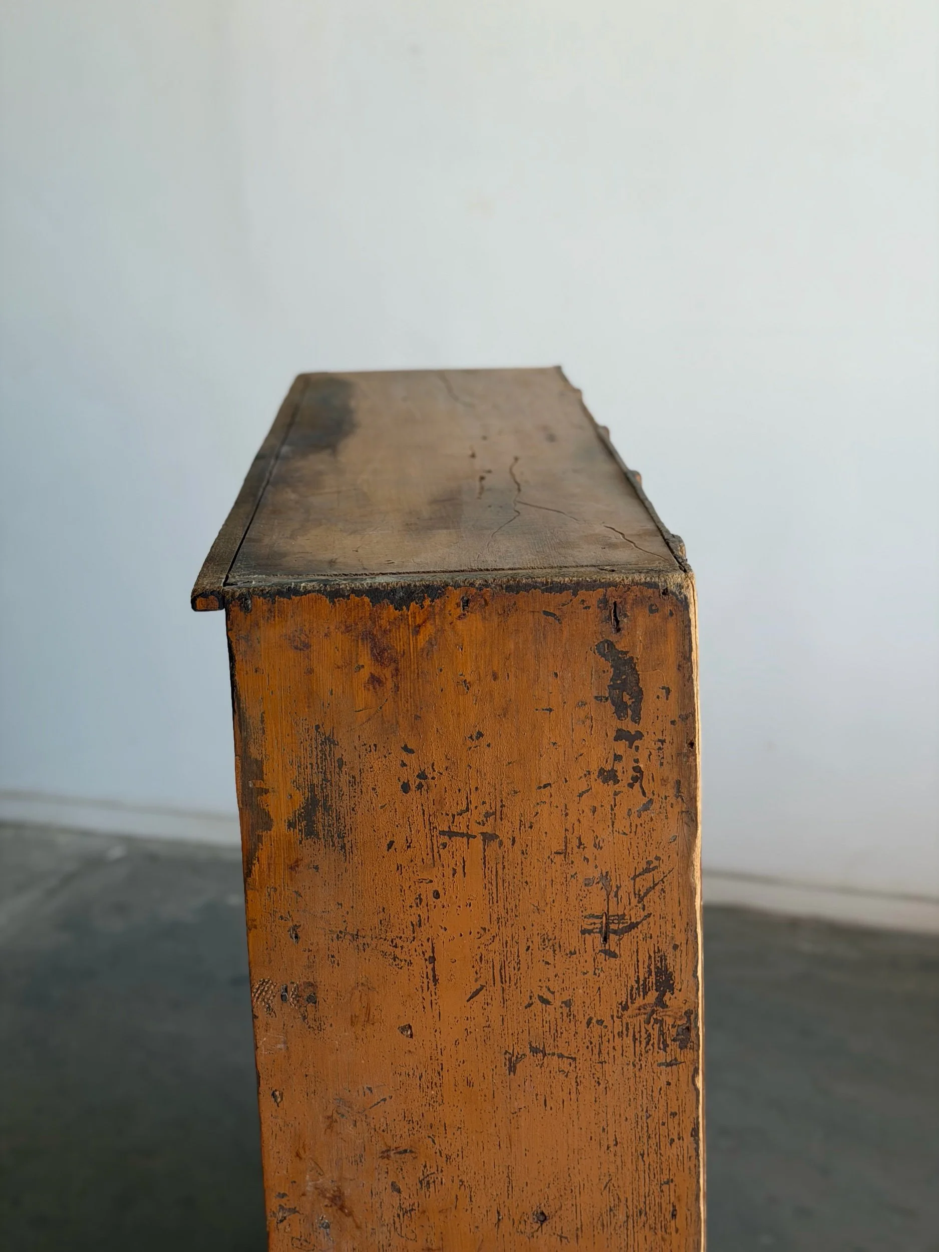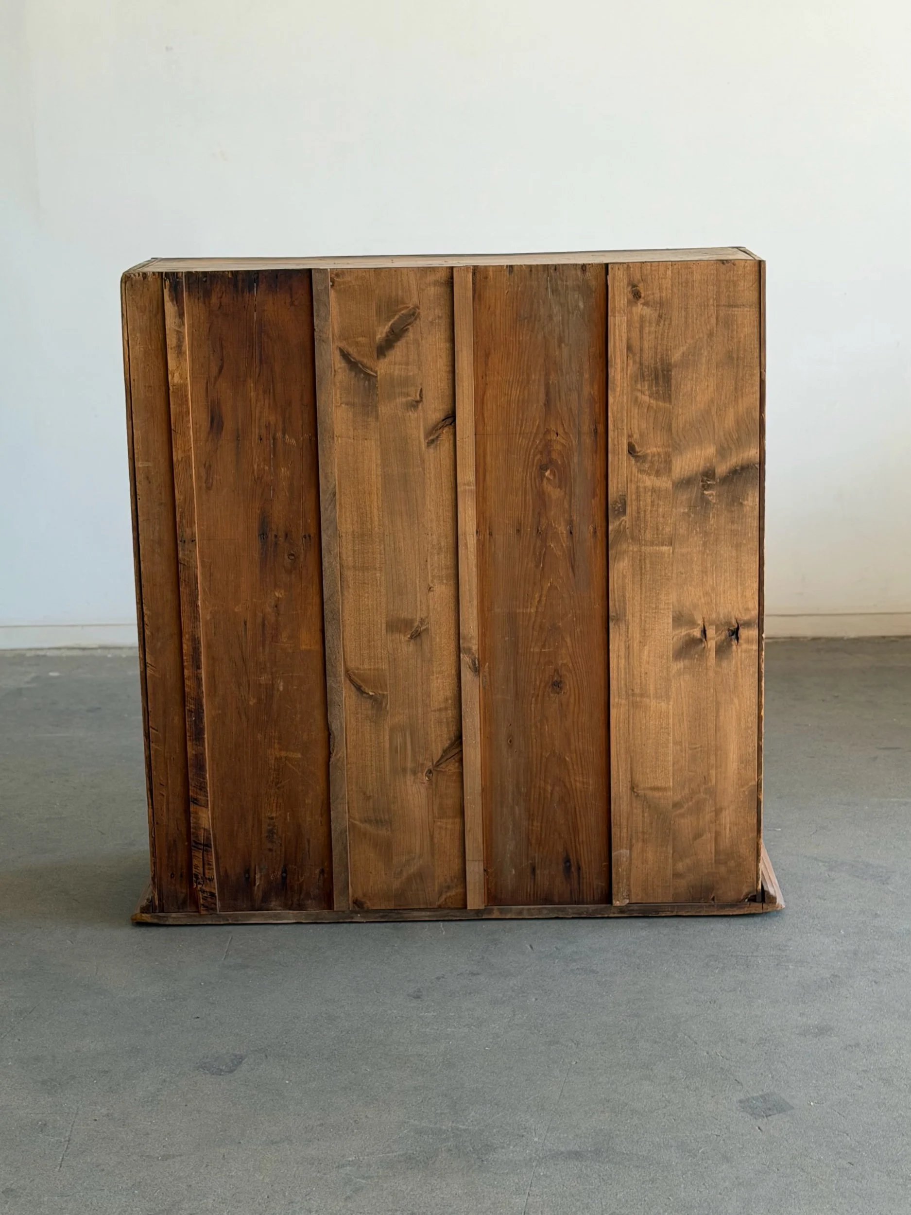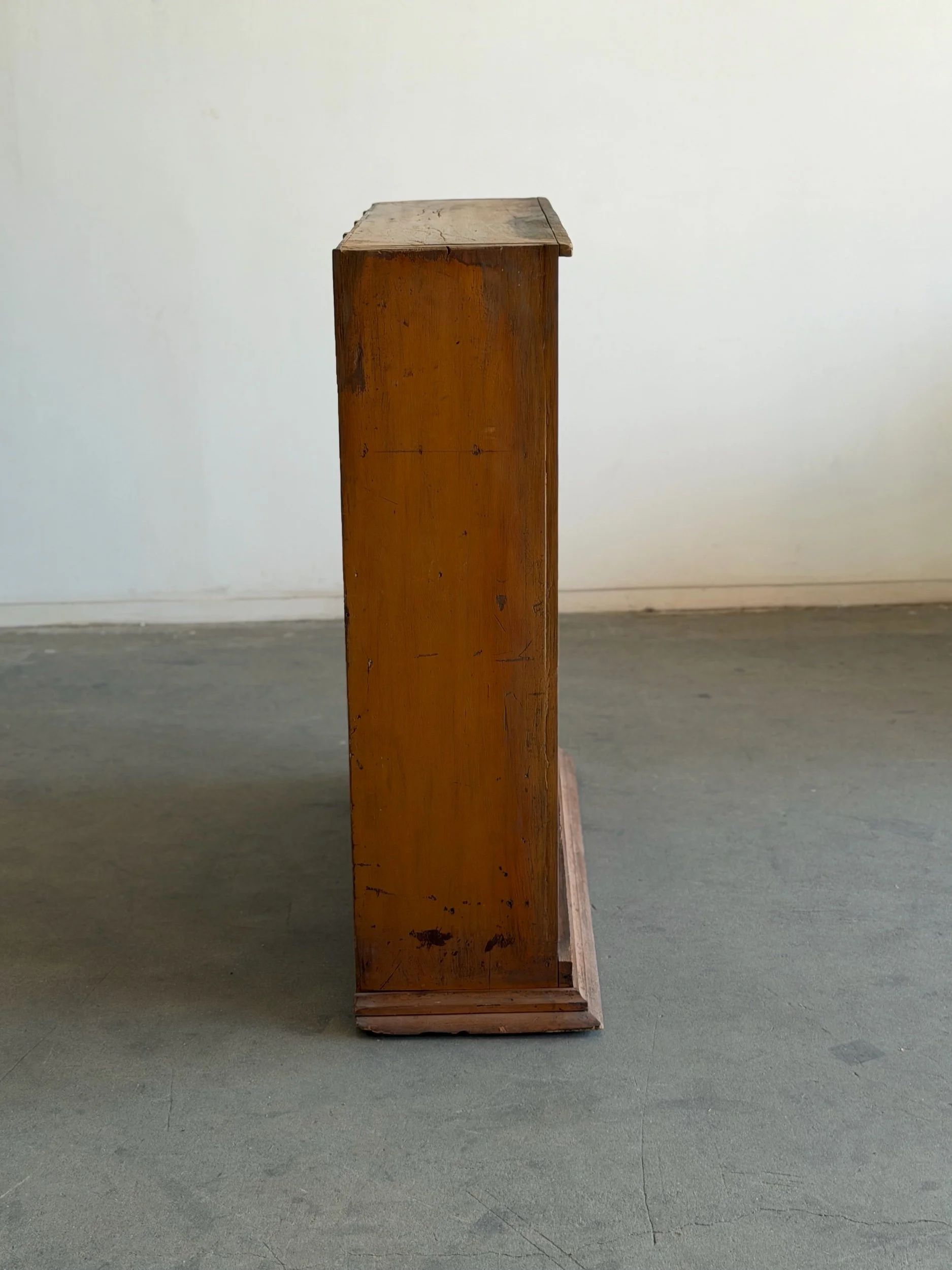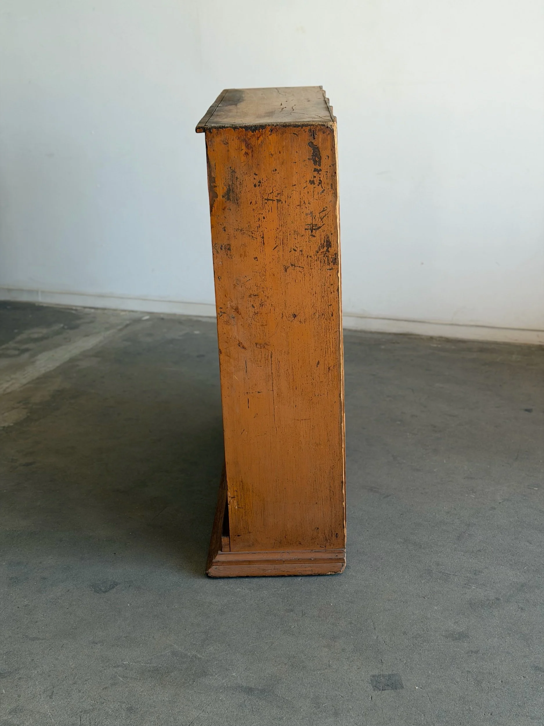 Vintage bookcase structurally restored with original patinated finish. Unit features newly replaced areas of backing , reinforced base trim , and other replaced wooden borders. Item is sound and sturdy with no wobble. Unit has not been refinished.