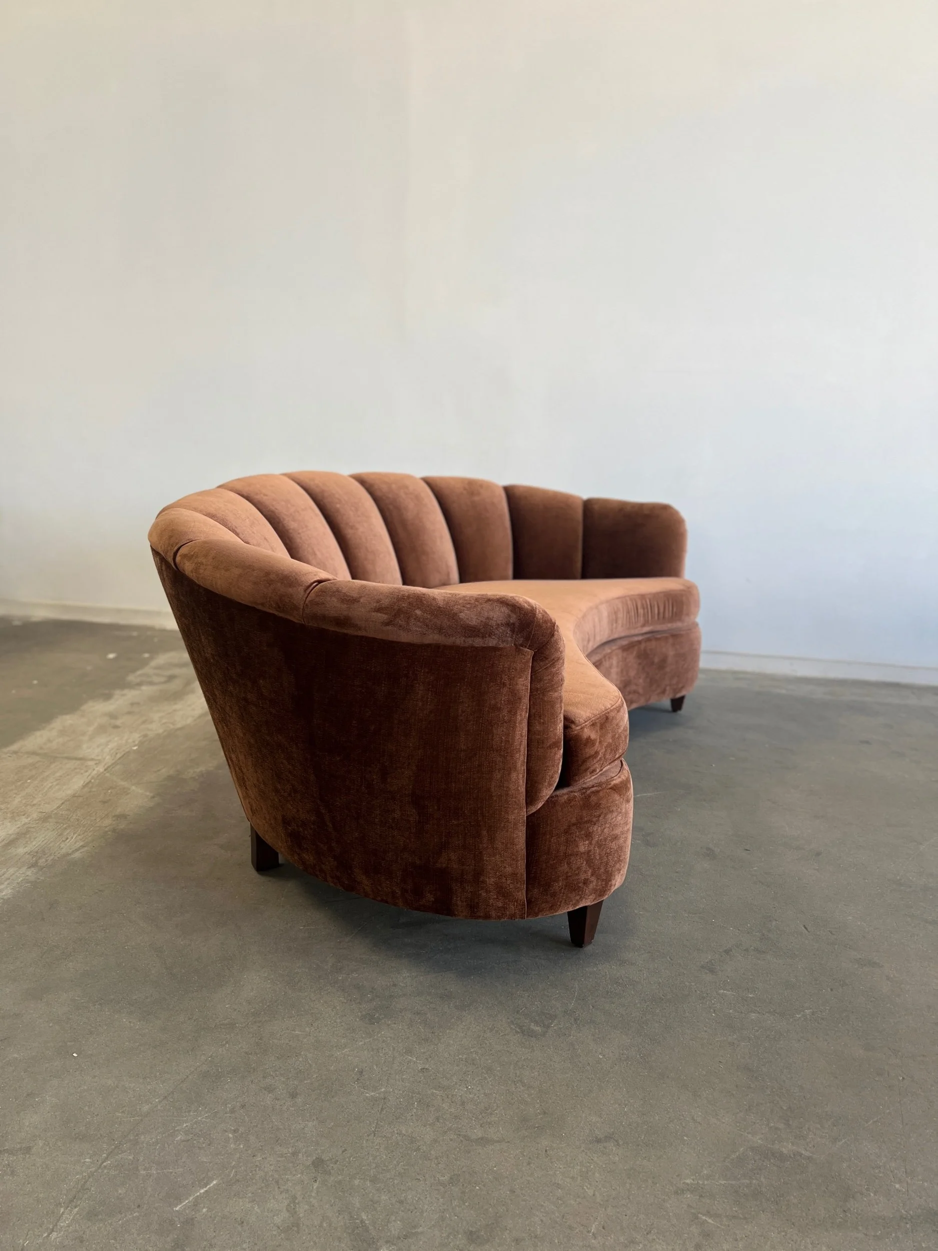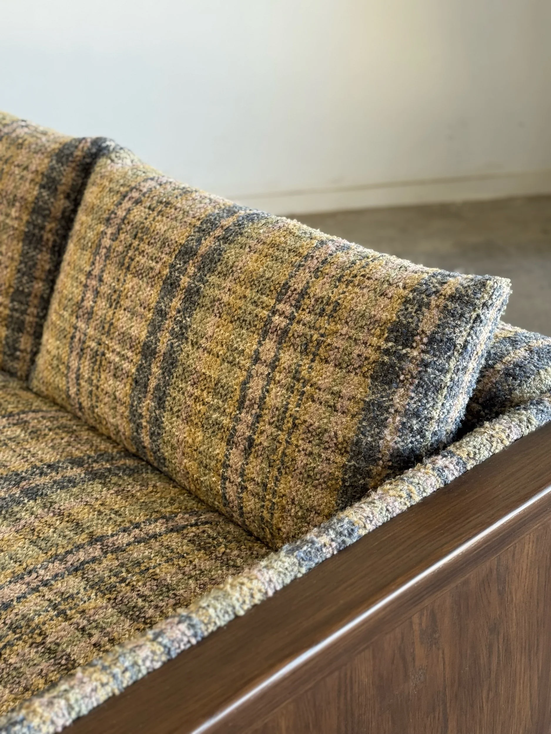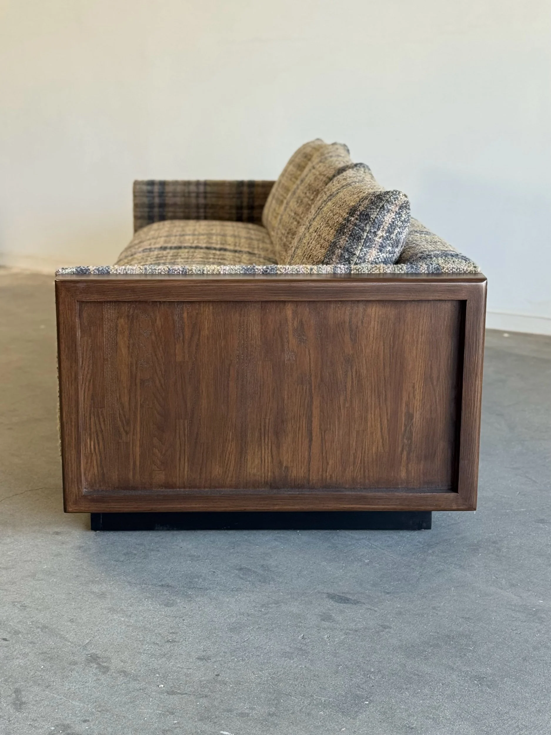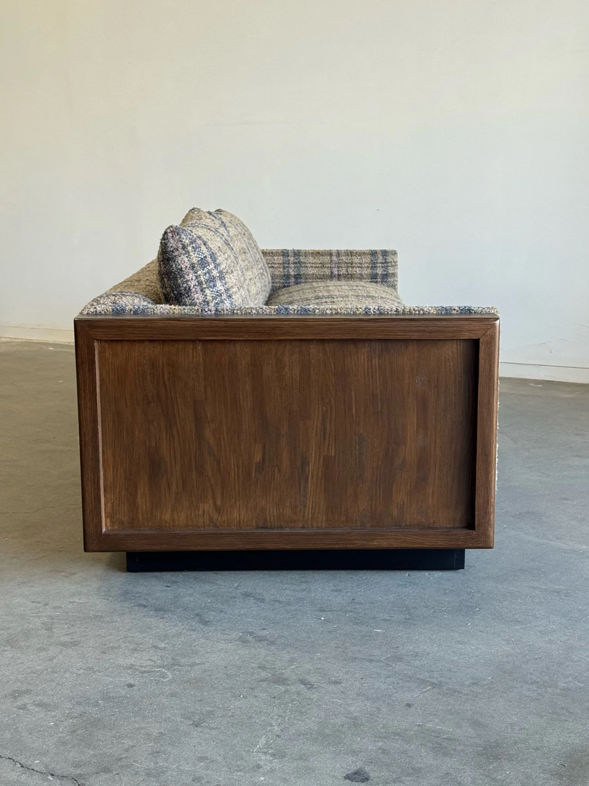 Custom made sectional sofa with solid maple wood with a medium dark walnut stain. Purchase our floor model, upholstered in a dark very durable high pile chenille or customize it to you by sending in your own fabric. 17 yards of fabric necessary.