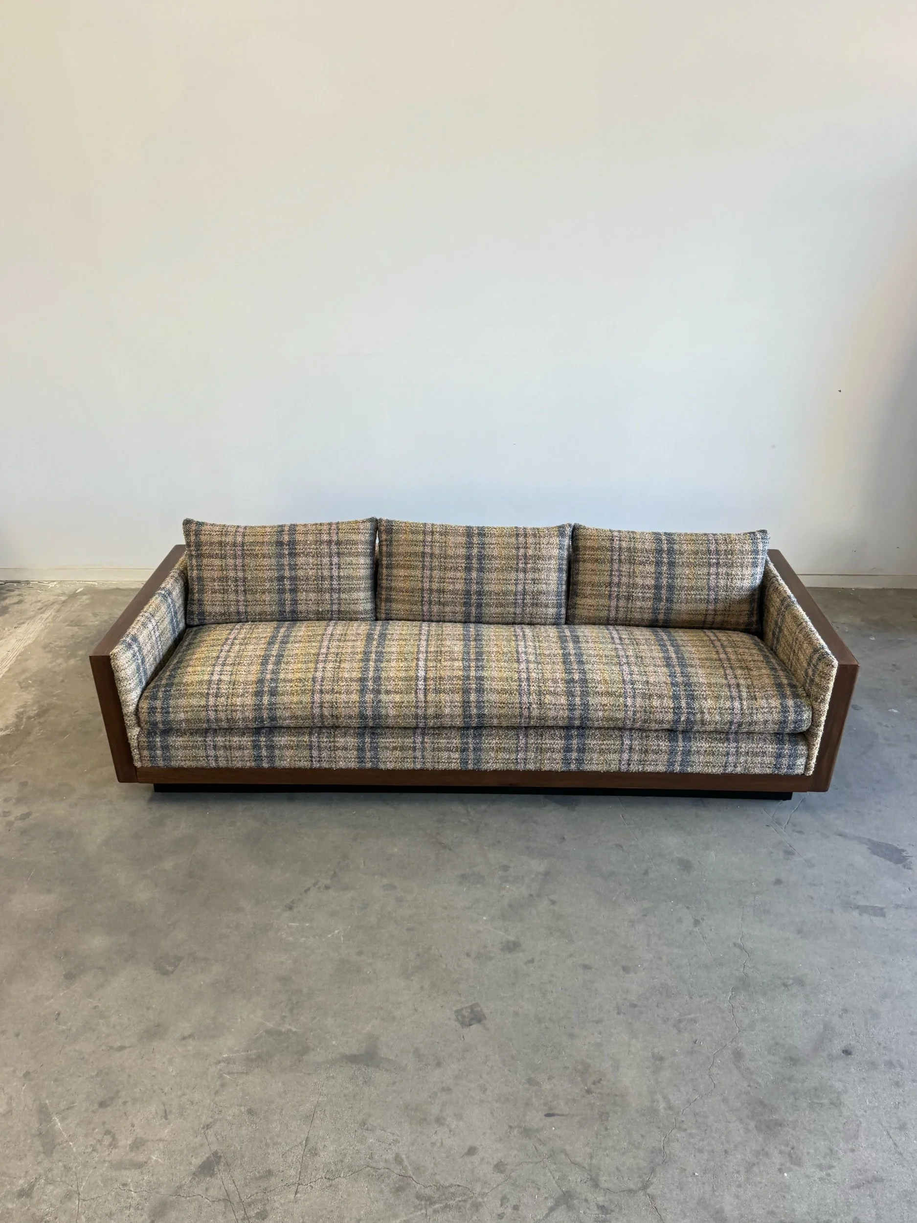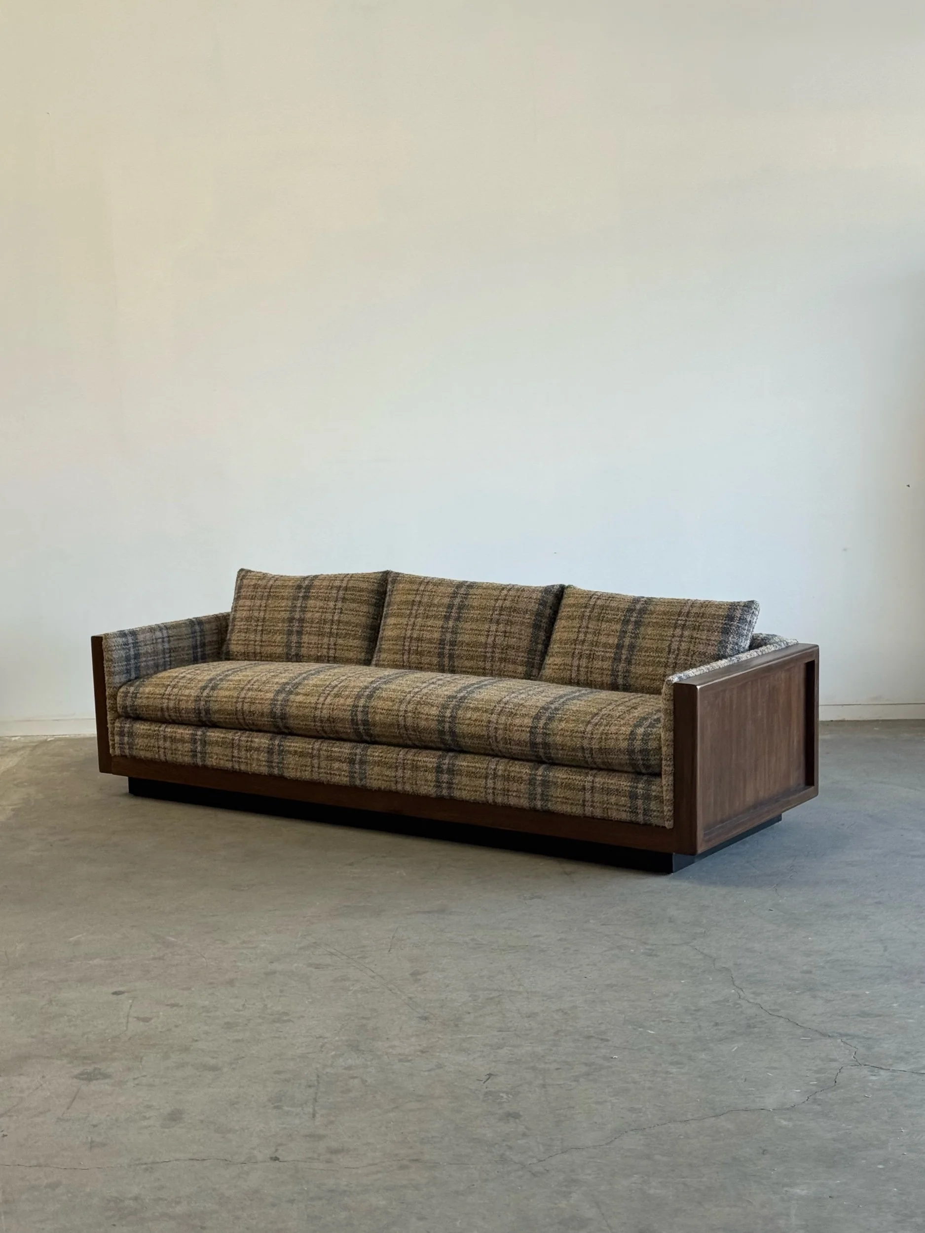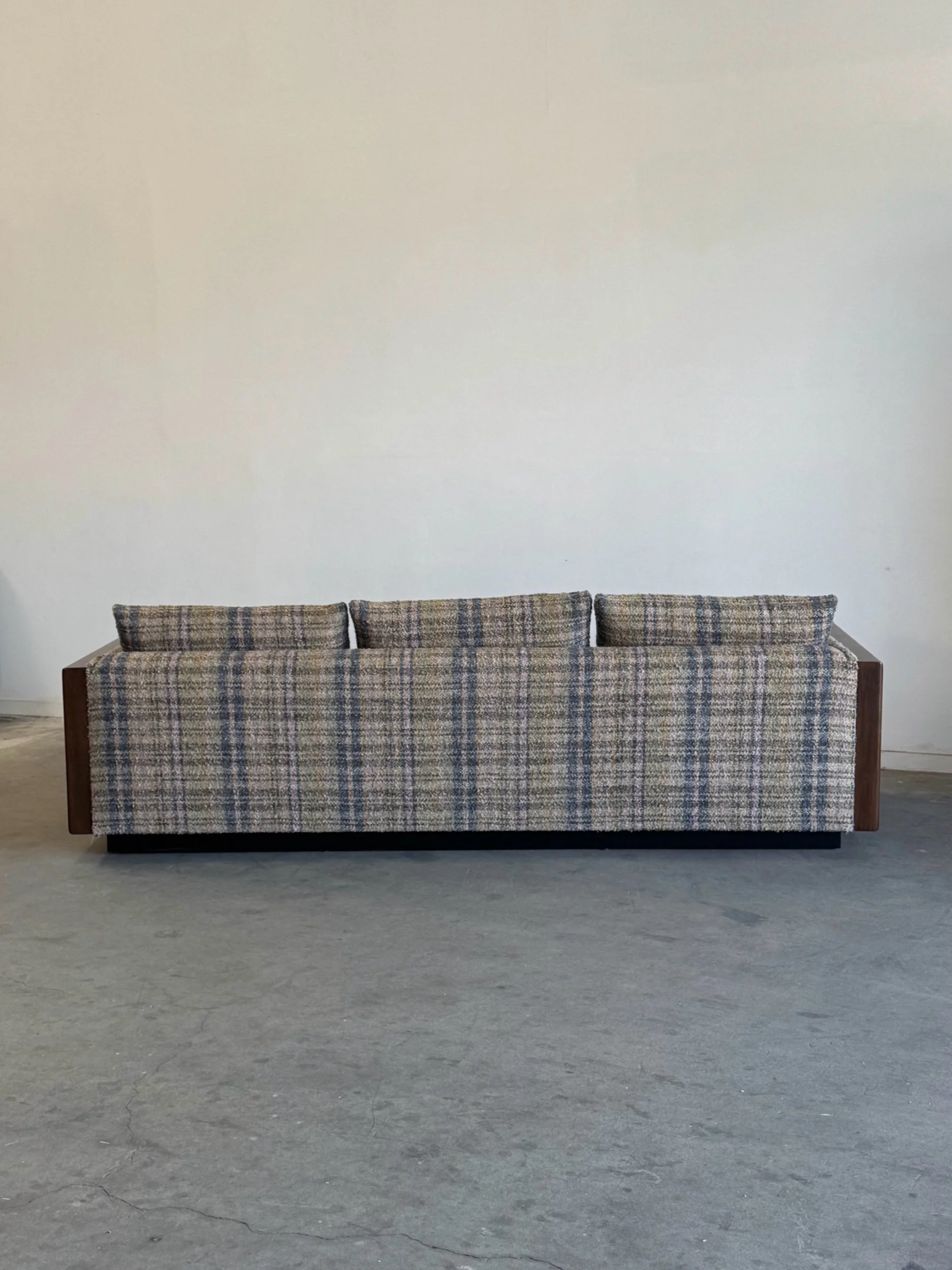 Custom made sectional sofa with solid maple wood with a medium dark walnut stain. Purchase our floor model, upholstered in a dark very durable high pile chenille or customize it to you by sending in your own fabric. 17 yards of fabric necessary.