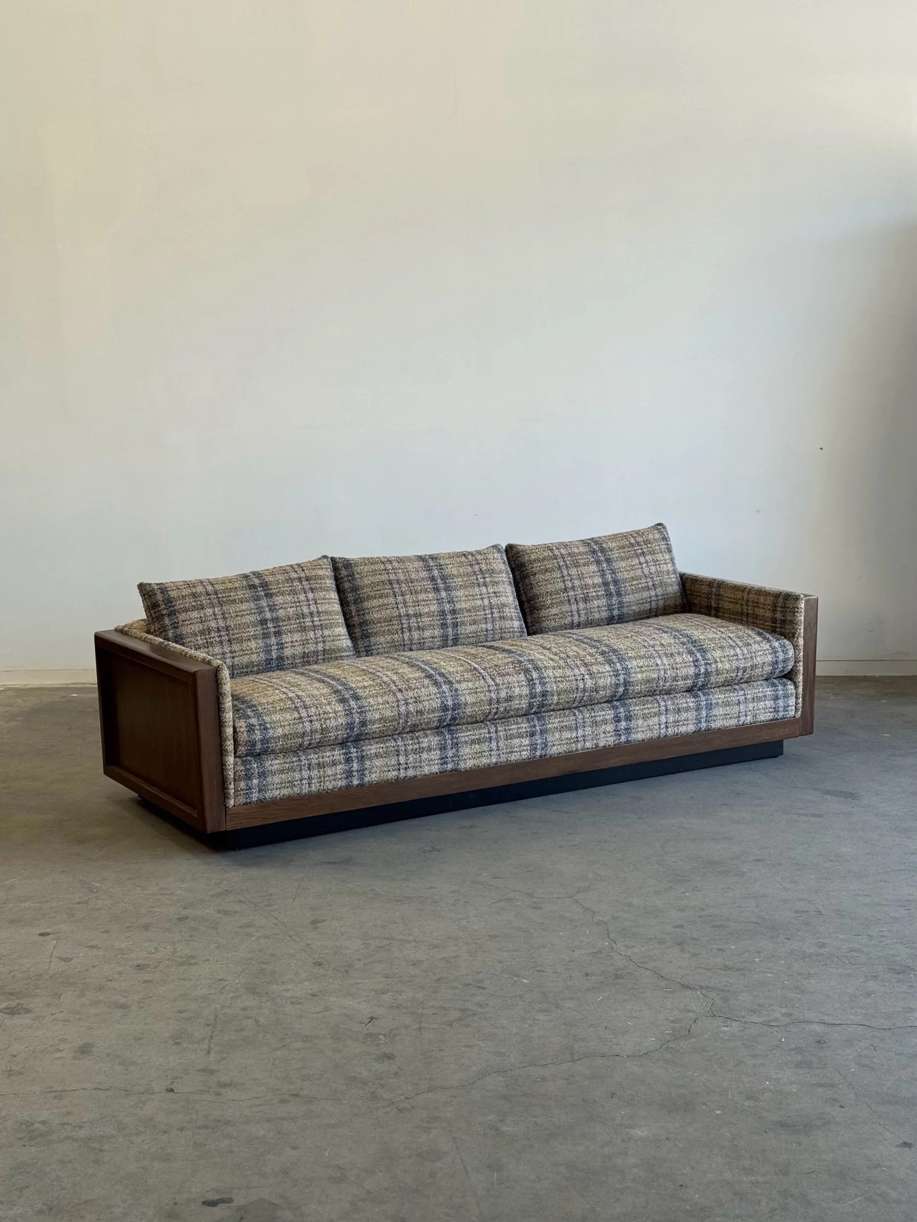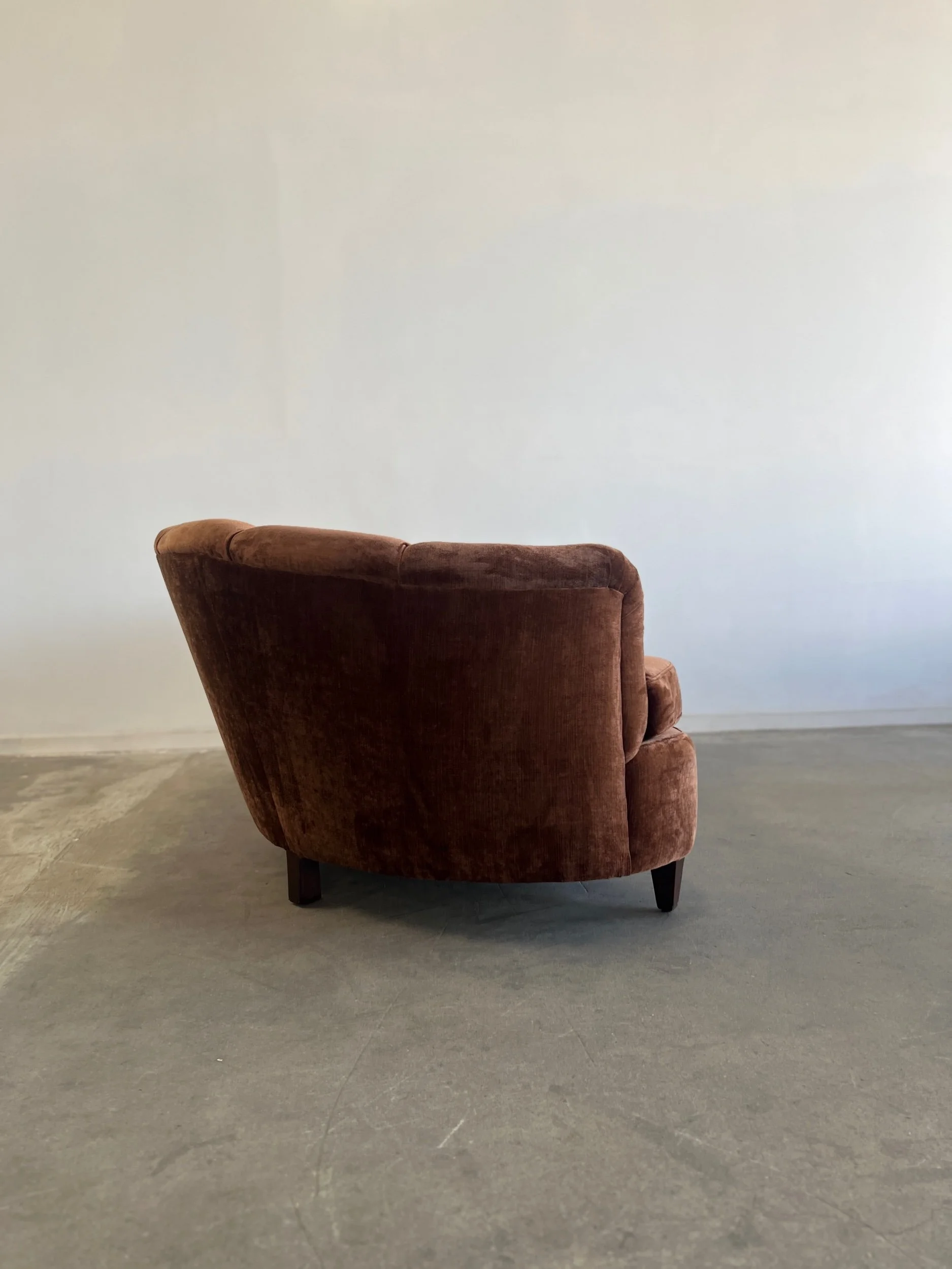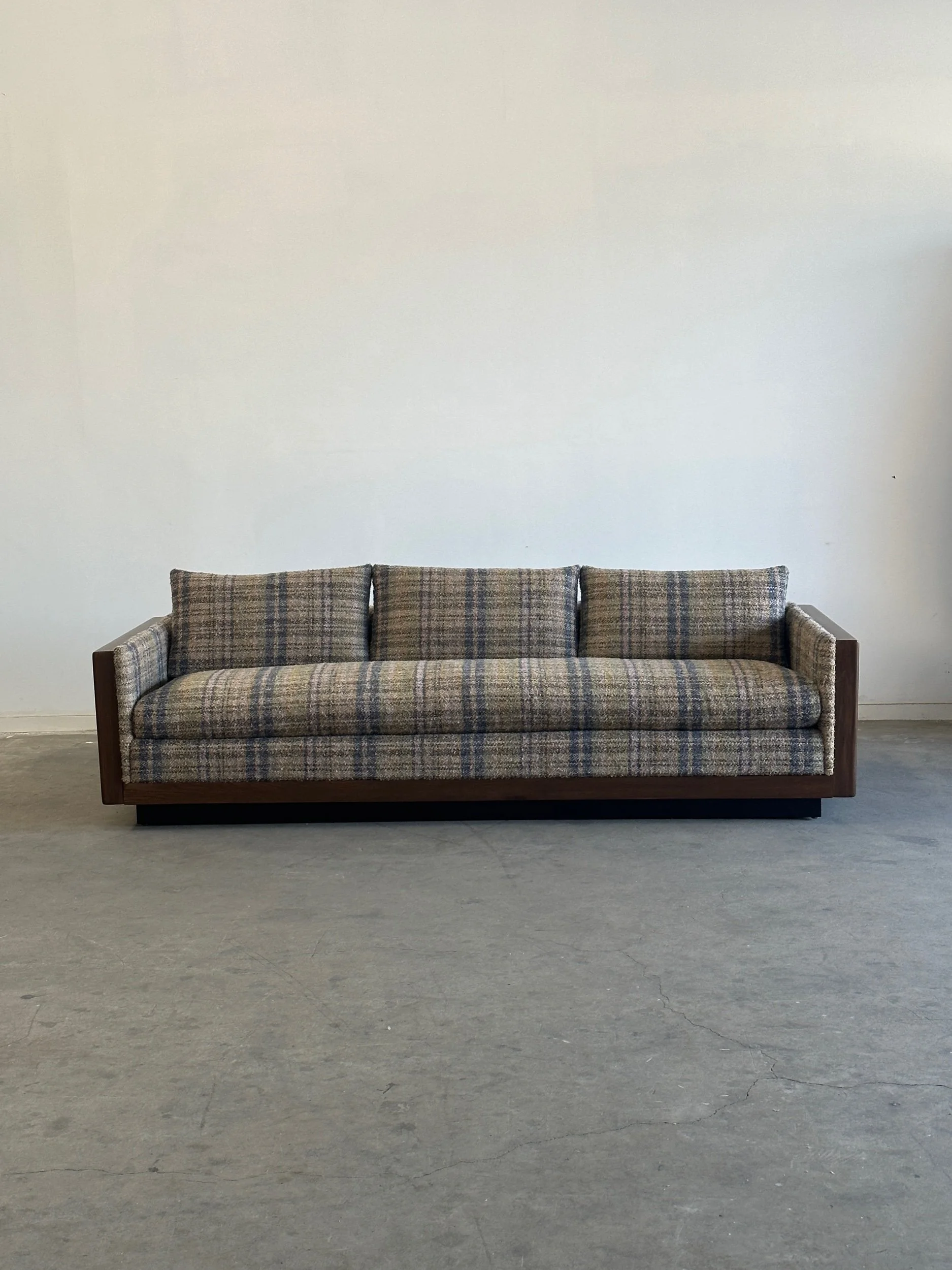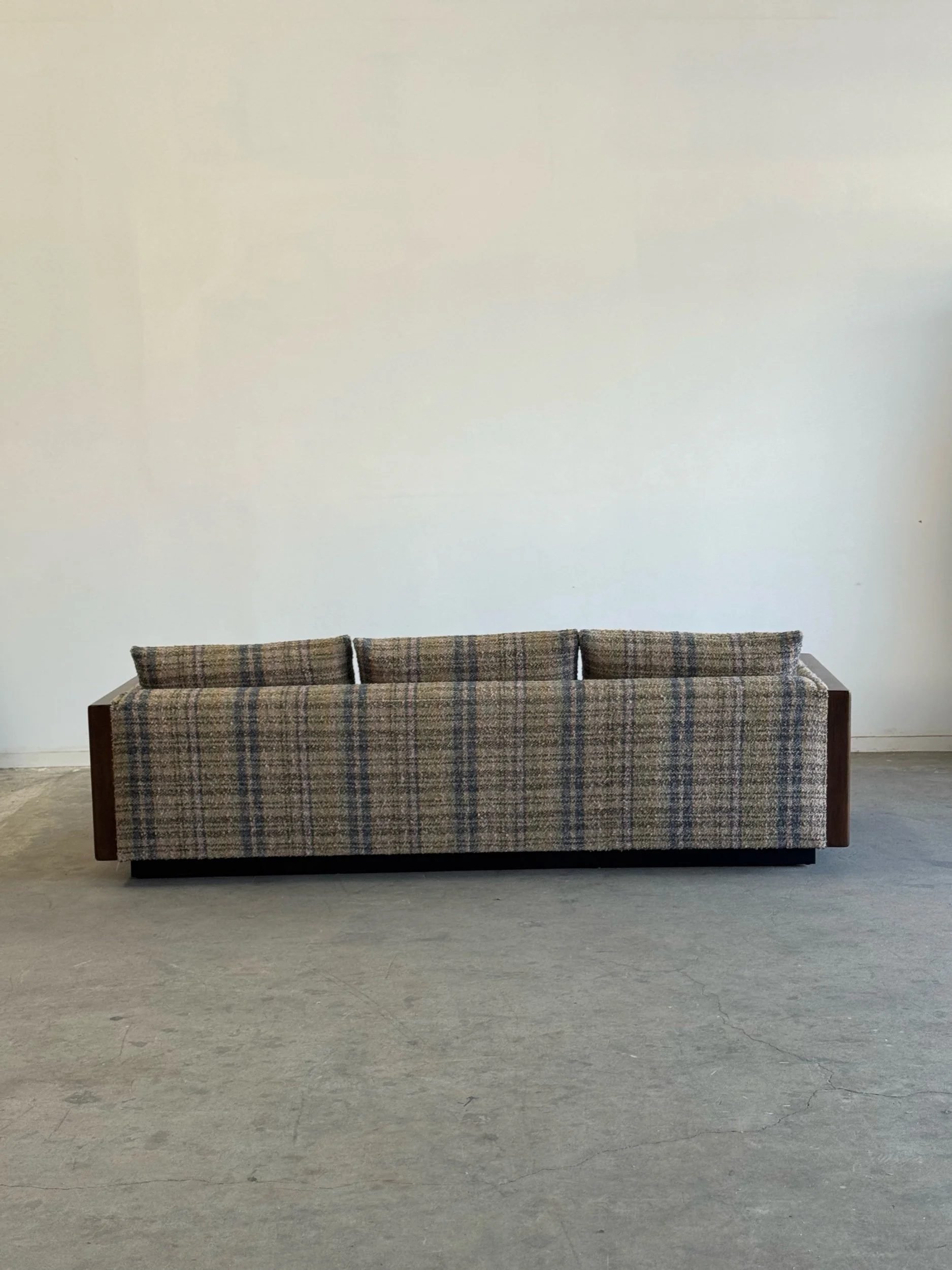 Custom made sectional sofa with solid maple wood with a medium dark walnut stain. Purchase our floor model, upholstered in a dark very durable high pile chenille or customize it to you by sending in your own fabric. 17 yards of fabric necessary.