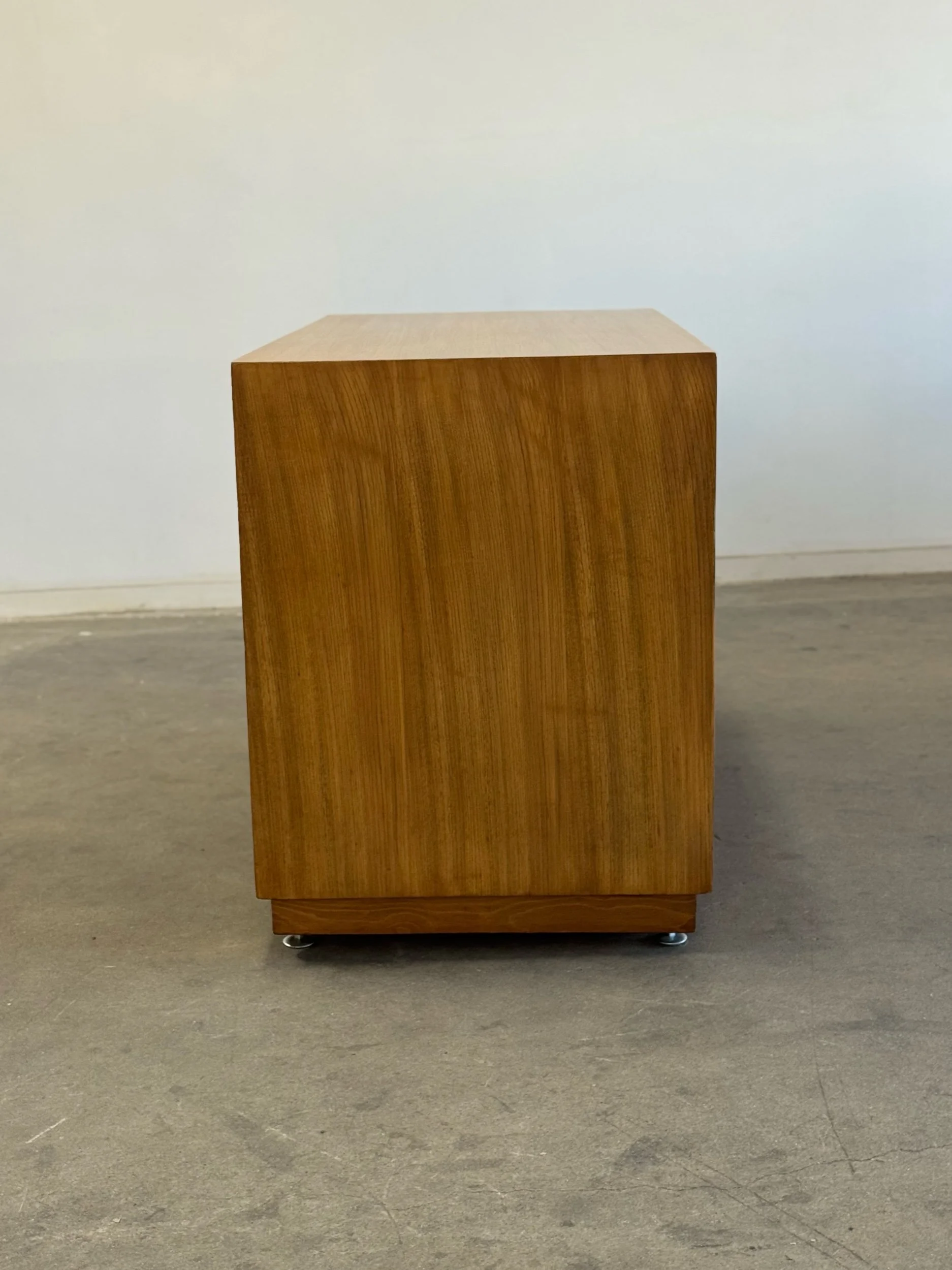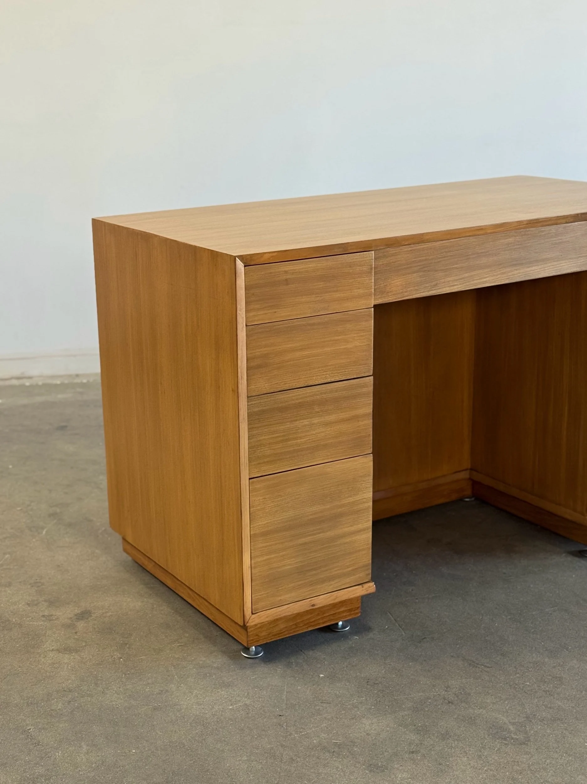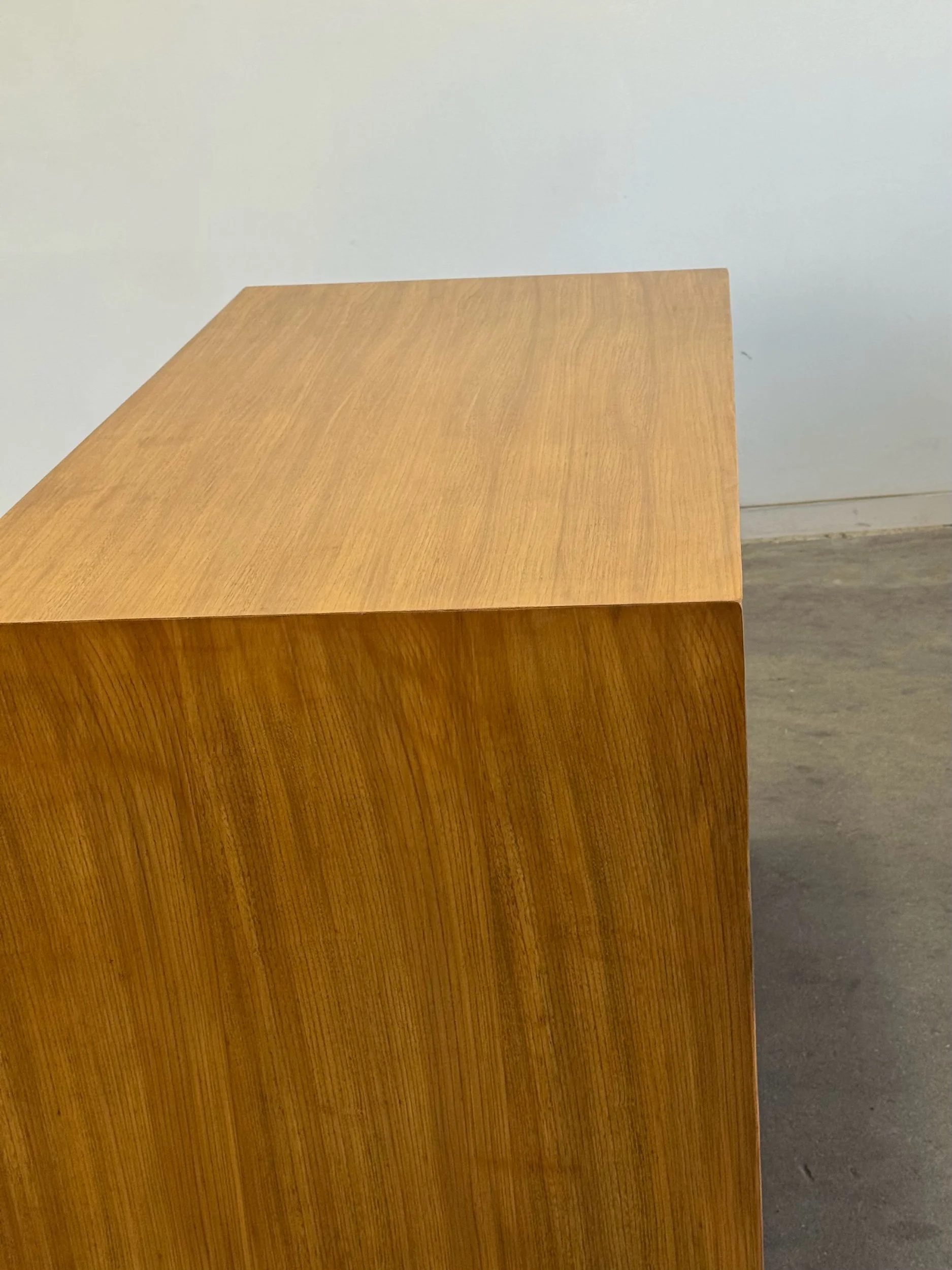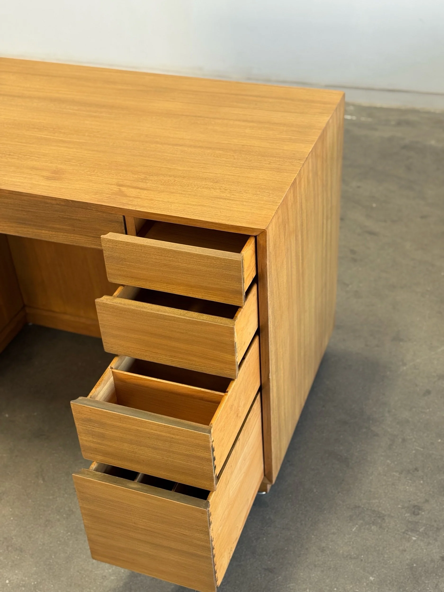 Fully restored cube desk in great condtion. Unit features a minimal design, hidden pulls , ample storage, built in files , bookcase, and new levelers. Desk has a light honey oak finish. Item is strucuturally sound and fully functional.