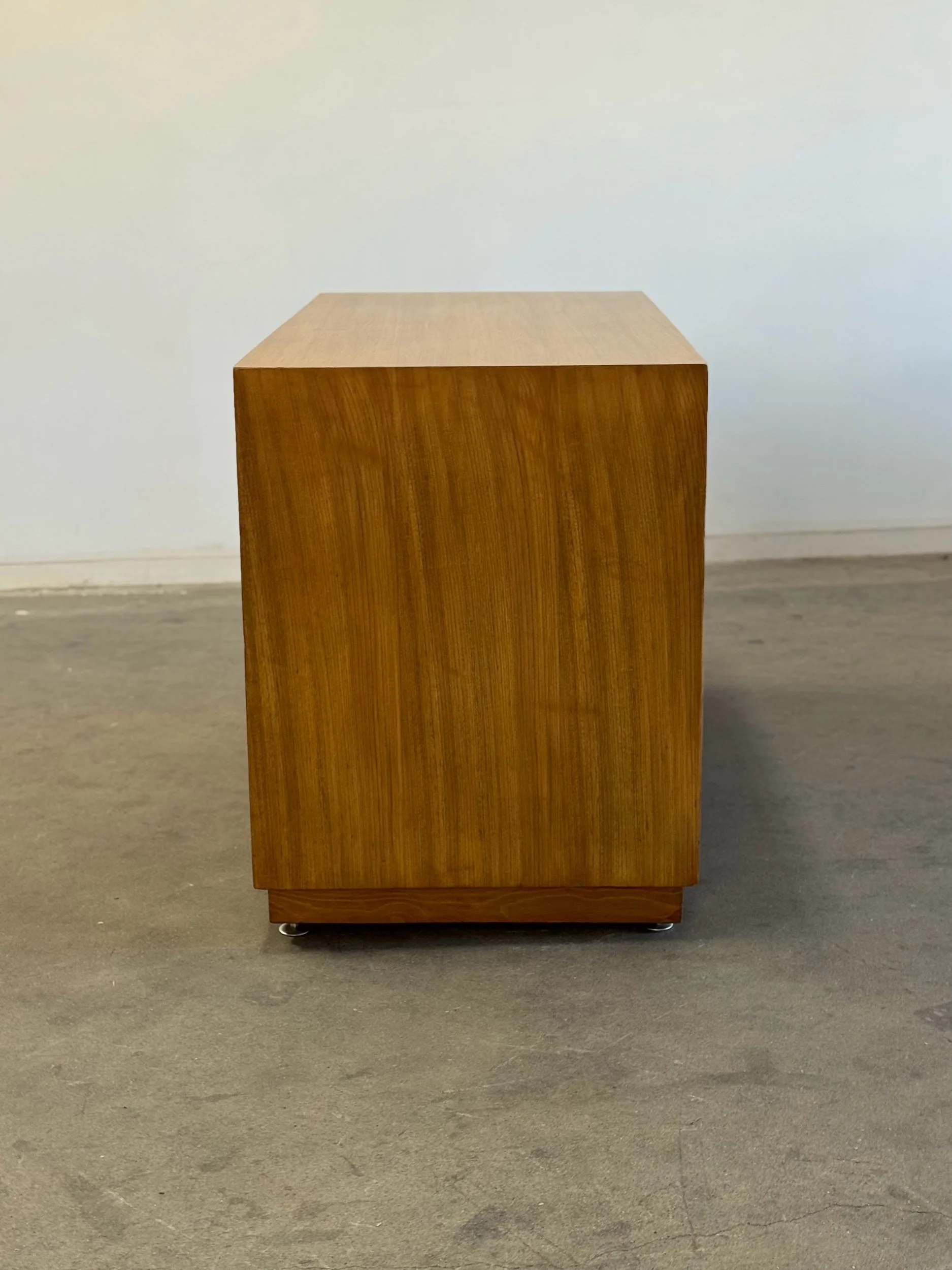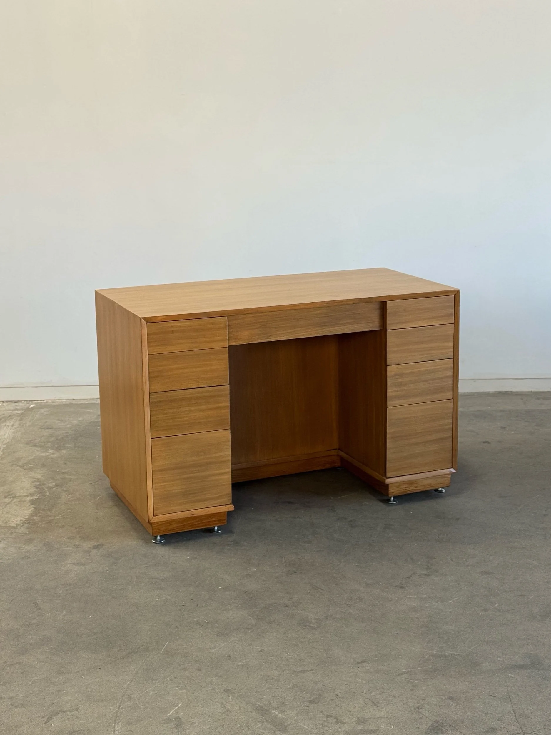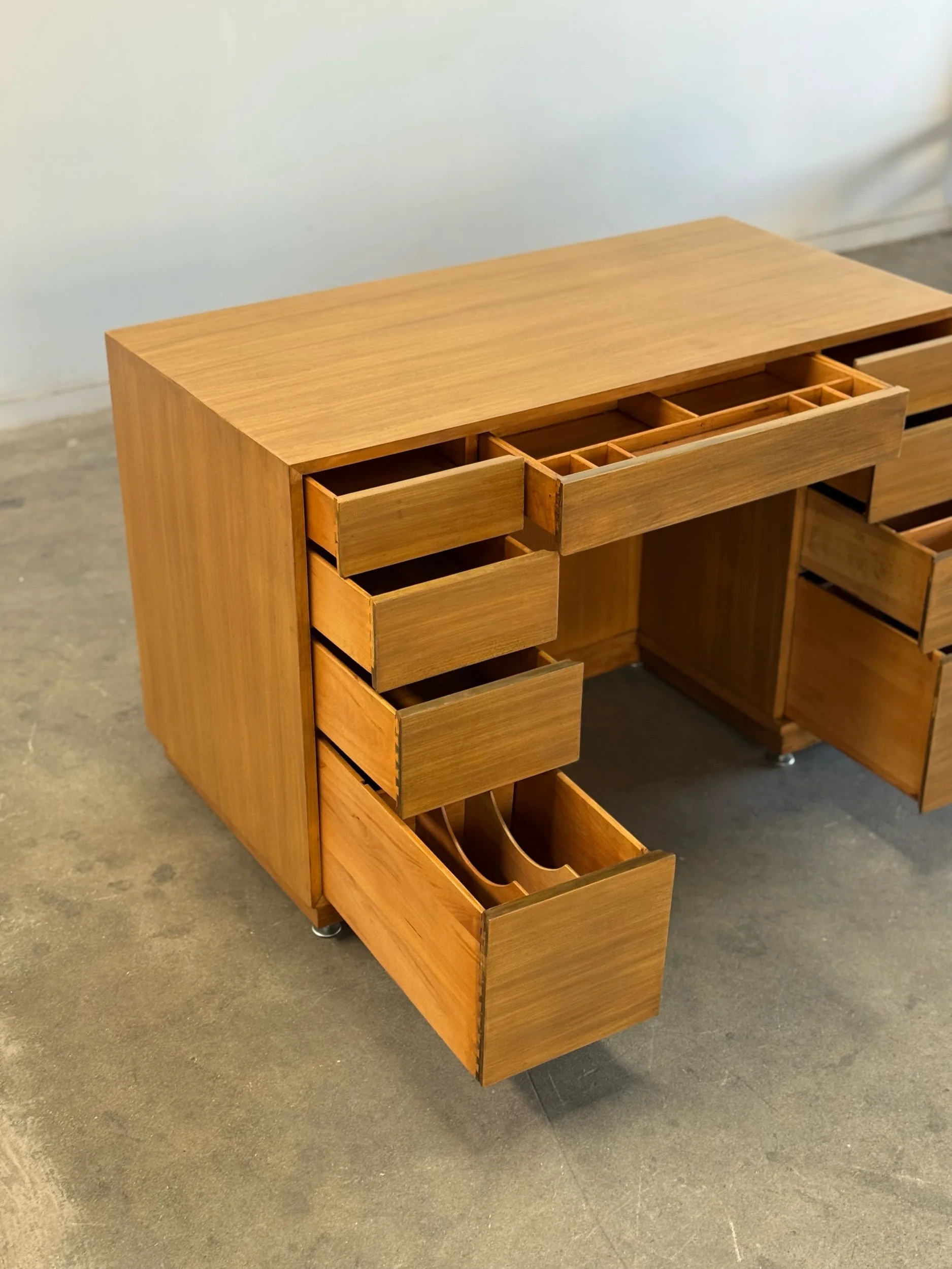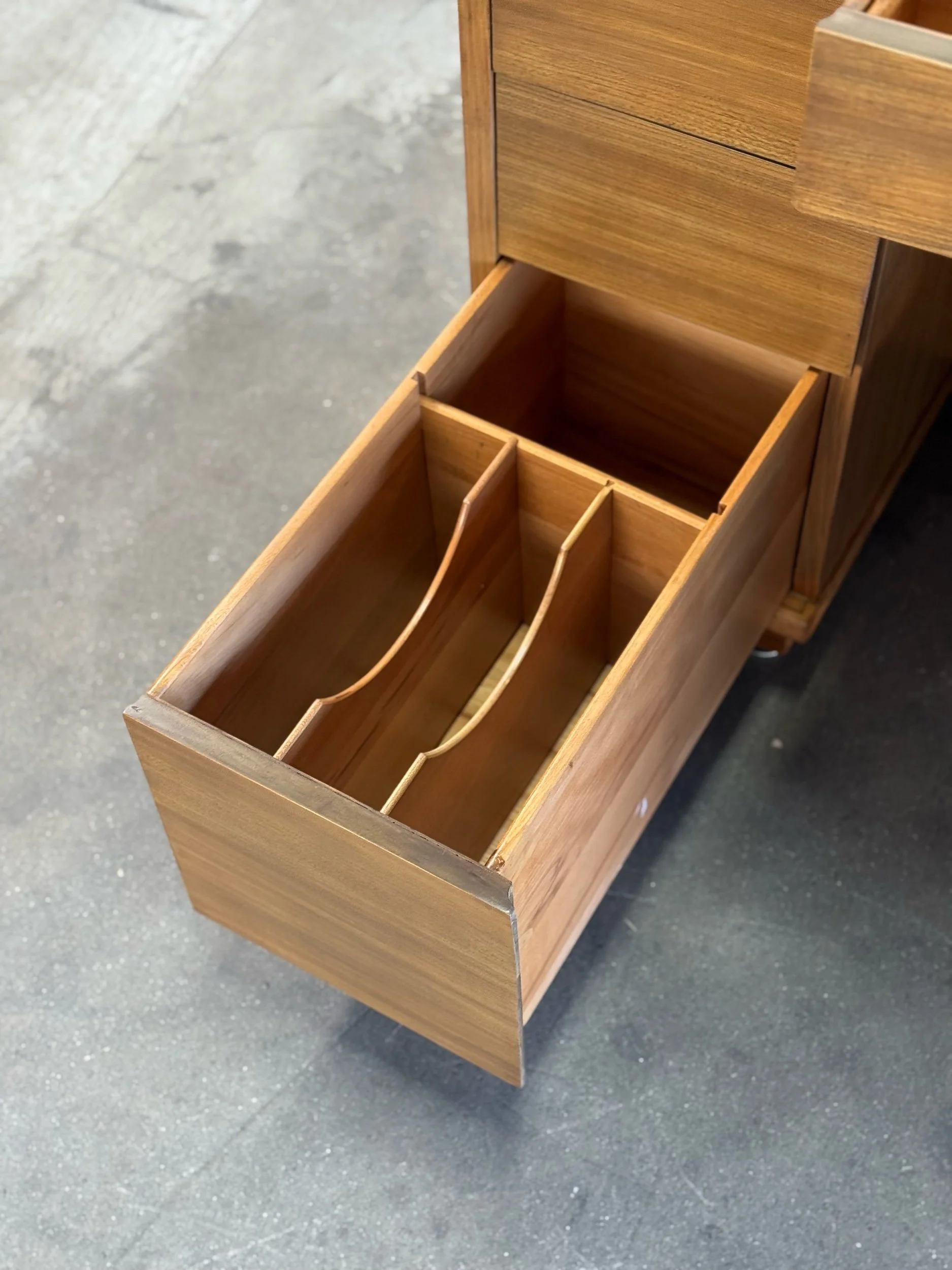 Fully restored cube desk in great condtion. Unit features a minimal design, hidden pulls , ample storage, built in files , bookcase, and new levelers. Desk has a light honey oak finish. Item is strucuturally sound and fully functional.