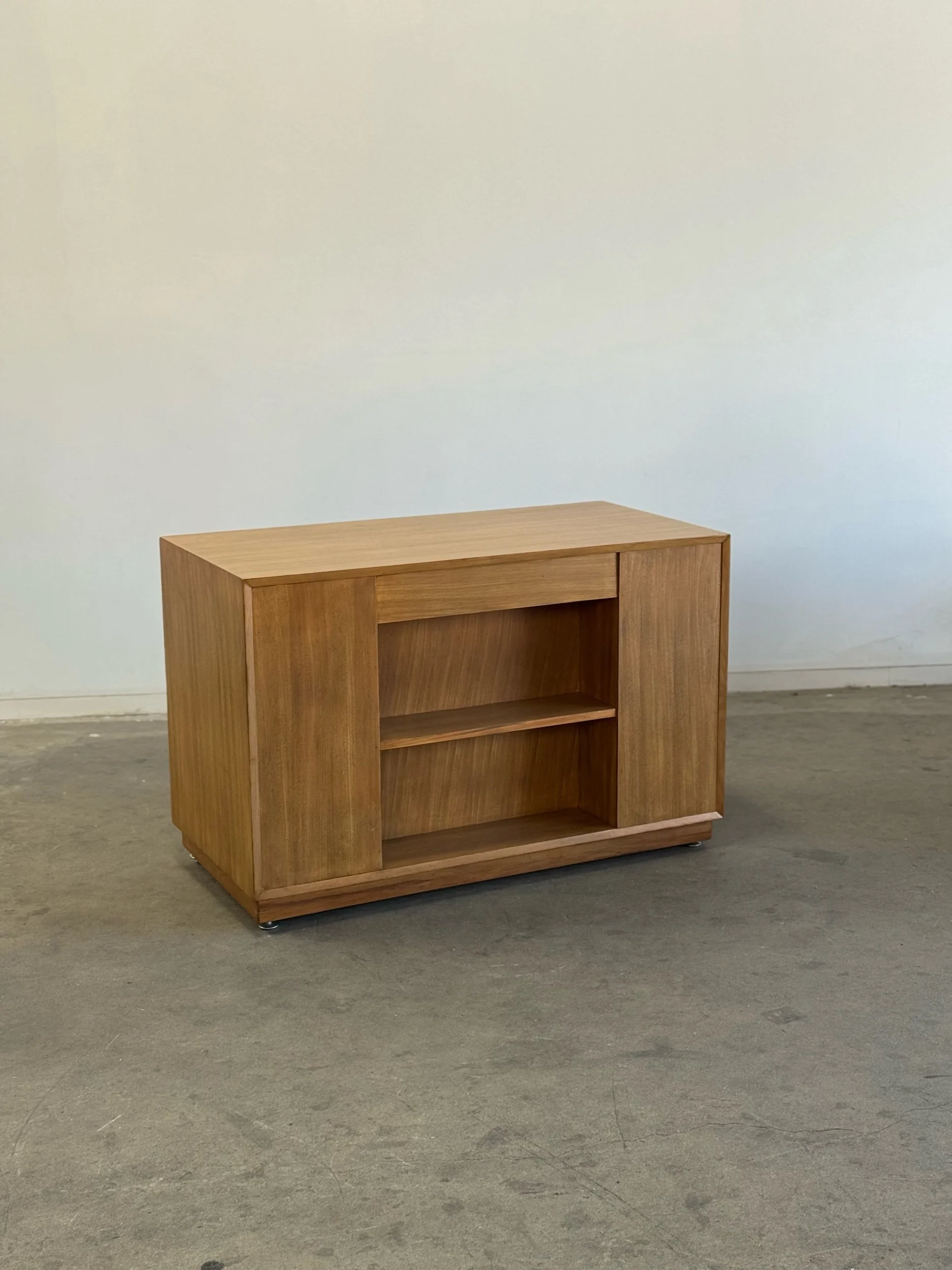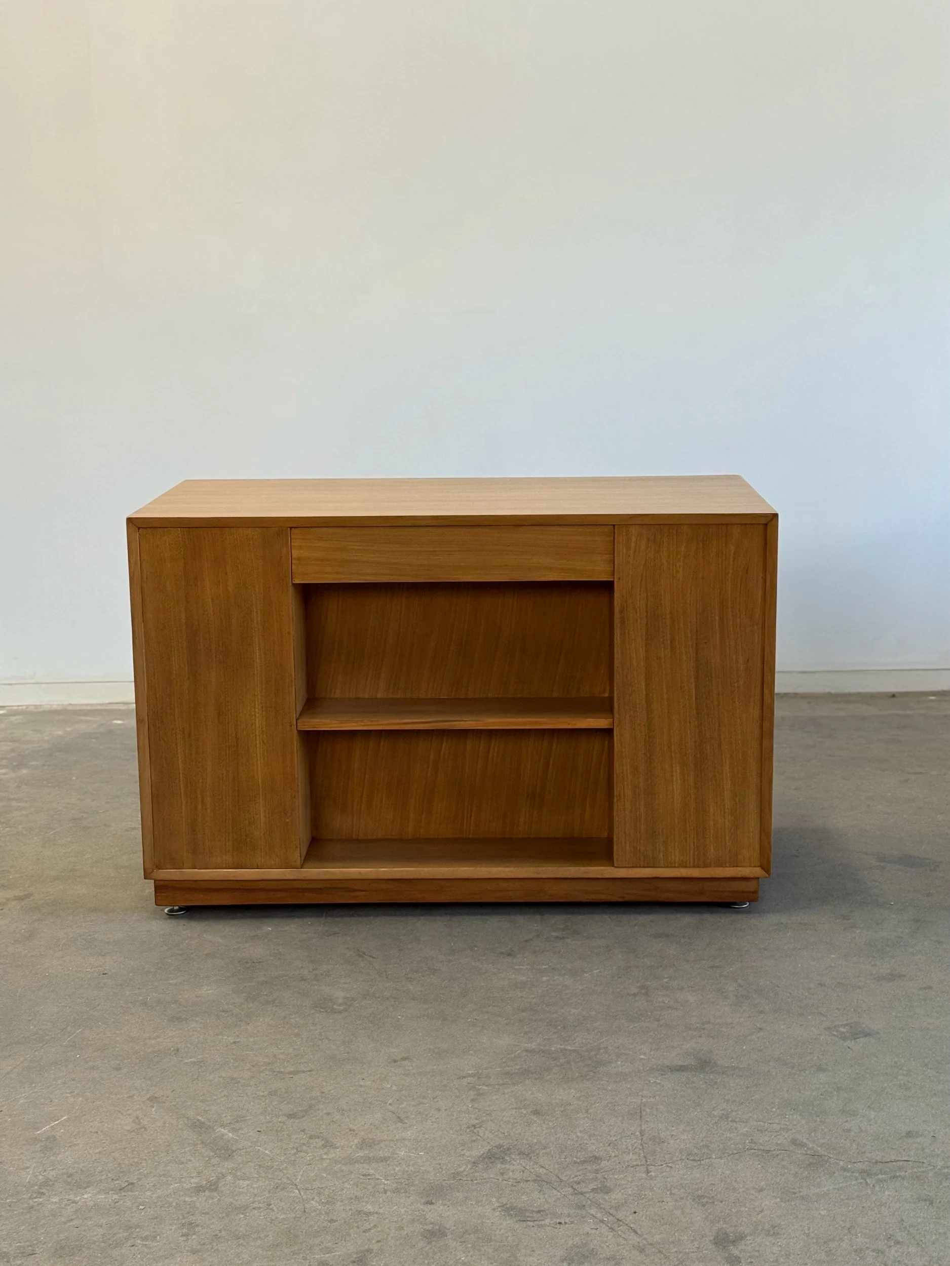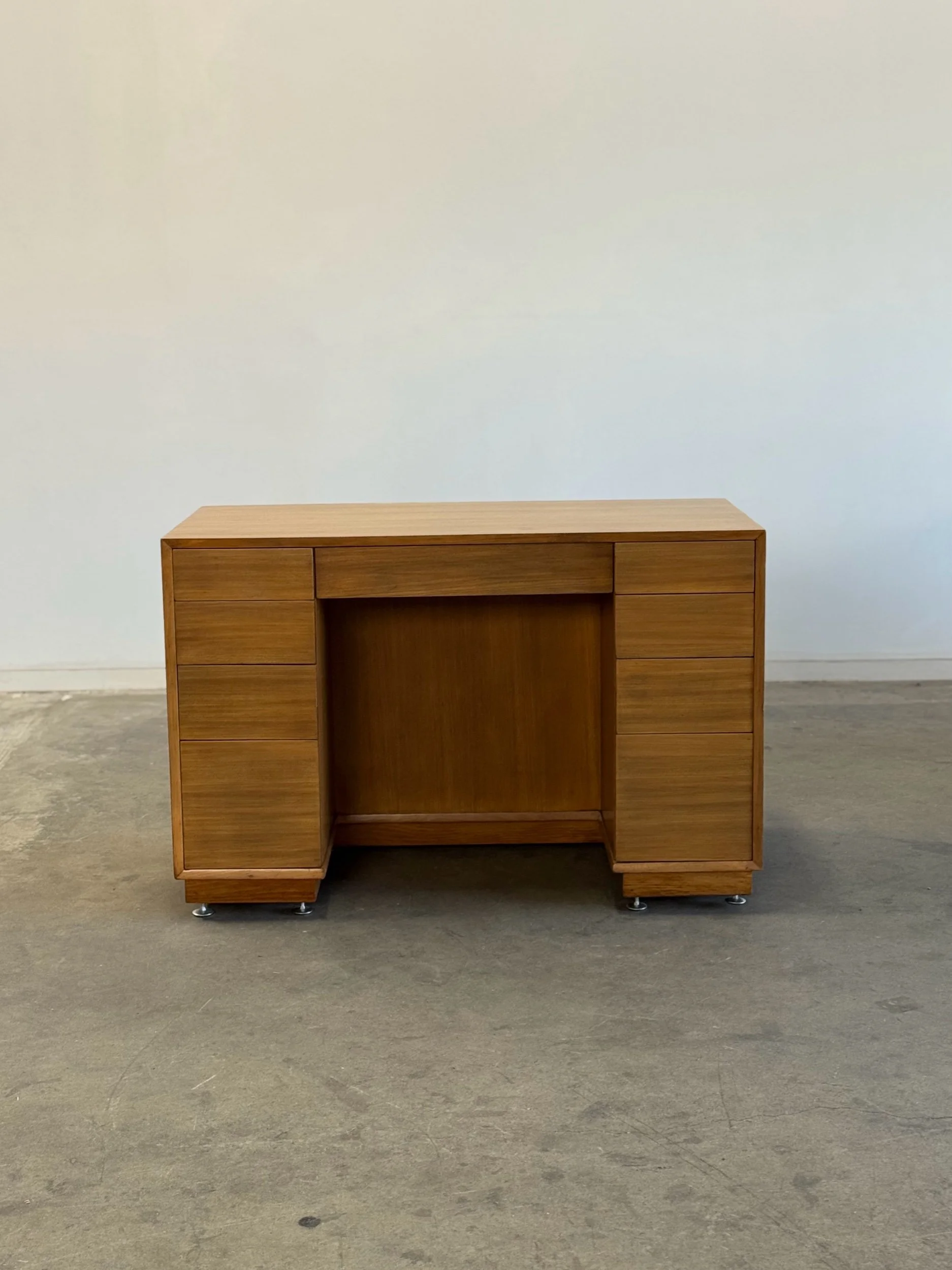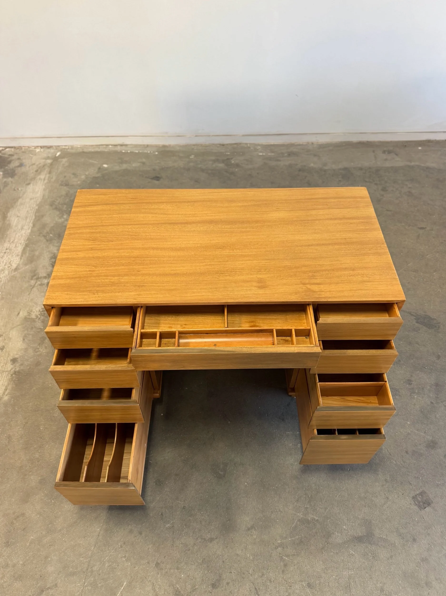 Fully restored cube desk in great condtion. Unit features a minimal design, hidden pulls , ample storage, built in files , bookcase, and new levelers. Desk has a light honey oak finish. Item is strucuturally sound and fully functional.