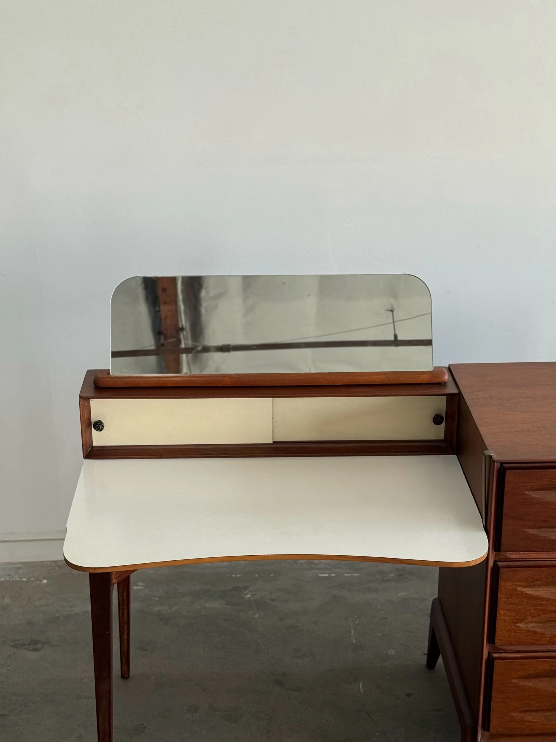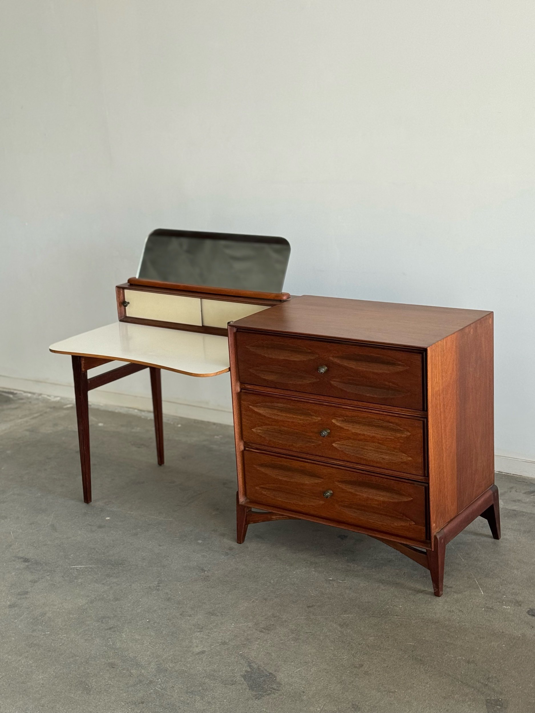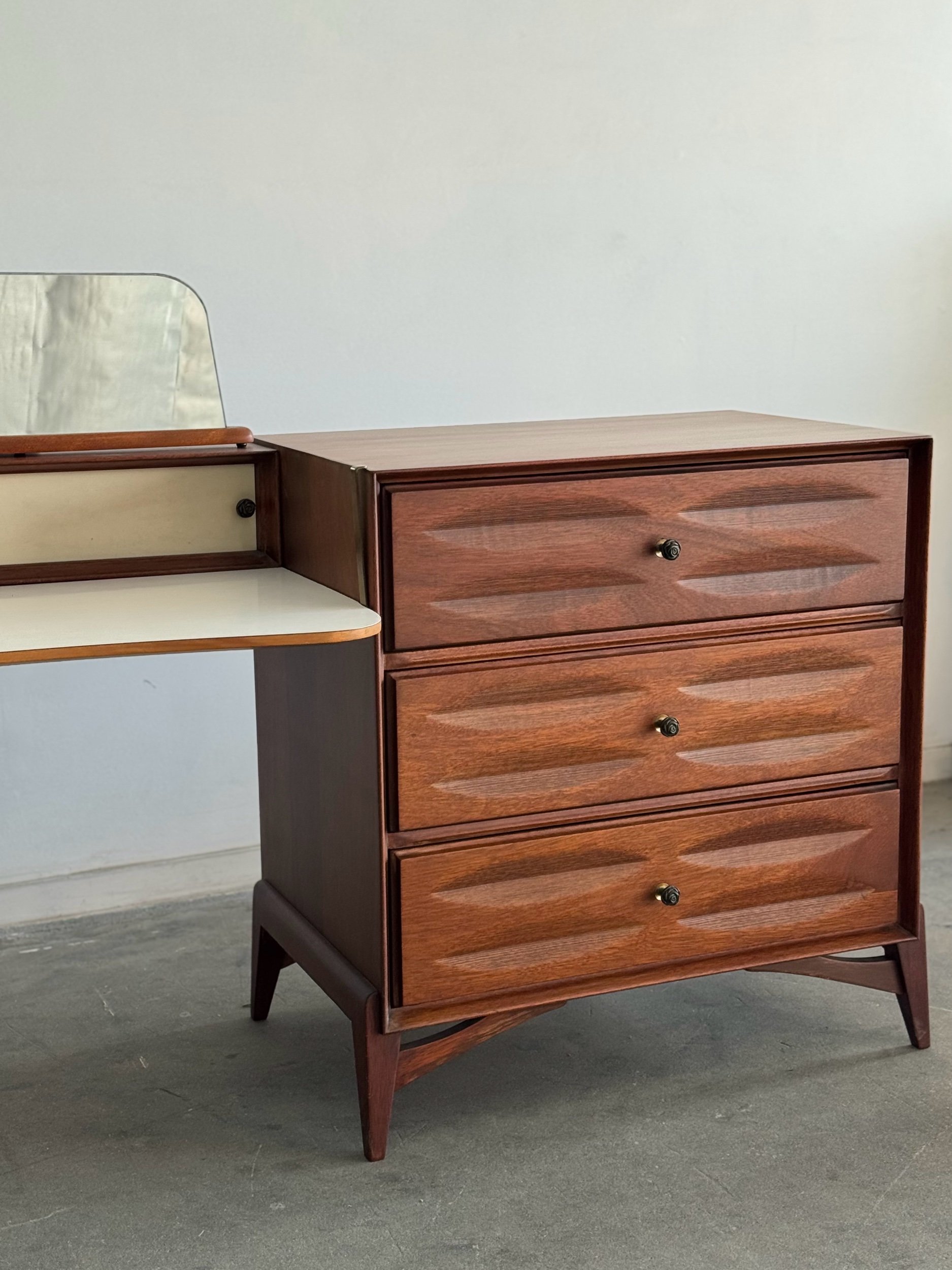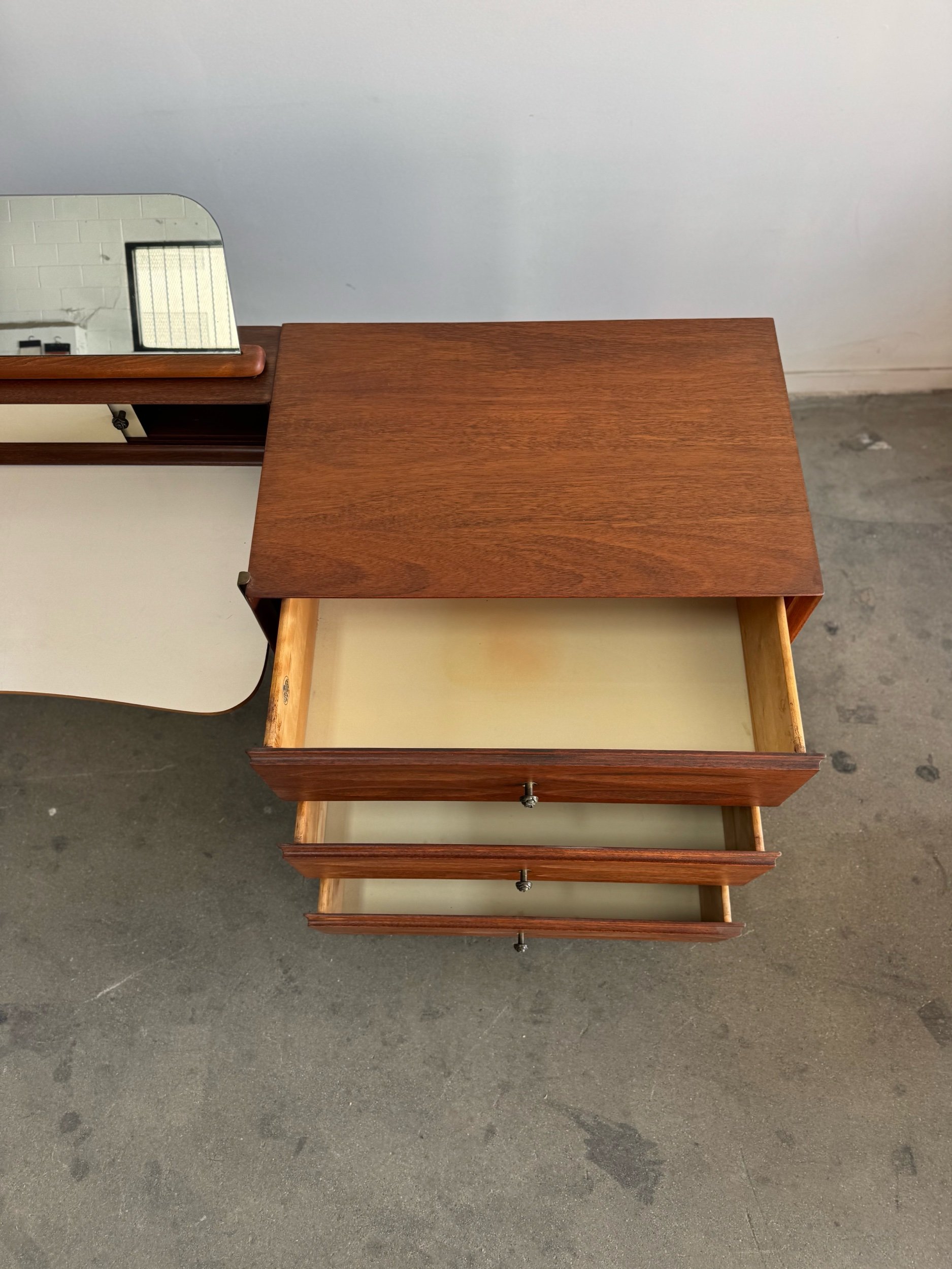 Fully restored rarely seen solid mahogany dresser vanity combo by Heywood Wakefield. Unit features a great sculptural base , exposed joinery , original hardware , removable mirror and storage cubby , and sculpted fronts on lower drawers. This unit is structurally sound and fully functional and is in good original vintage condition. Left side surface is removable for transport , and features a durable white Formica surface.