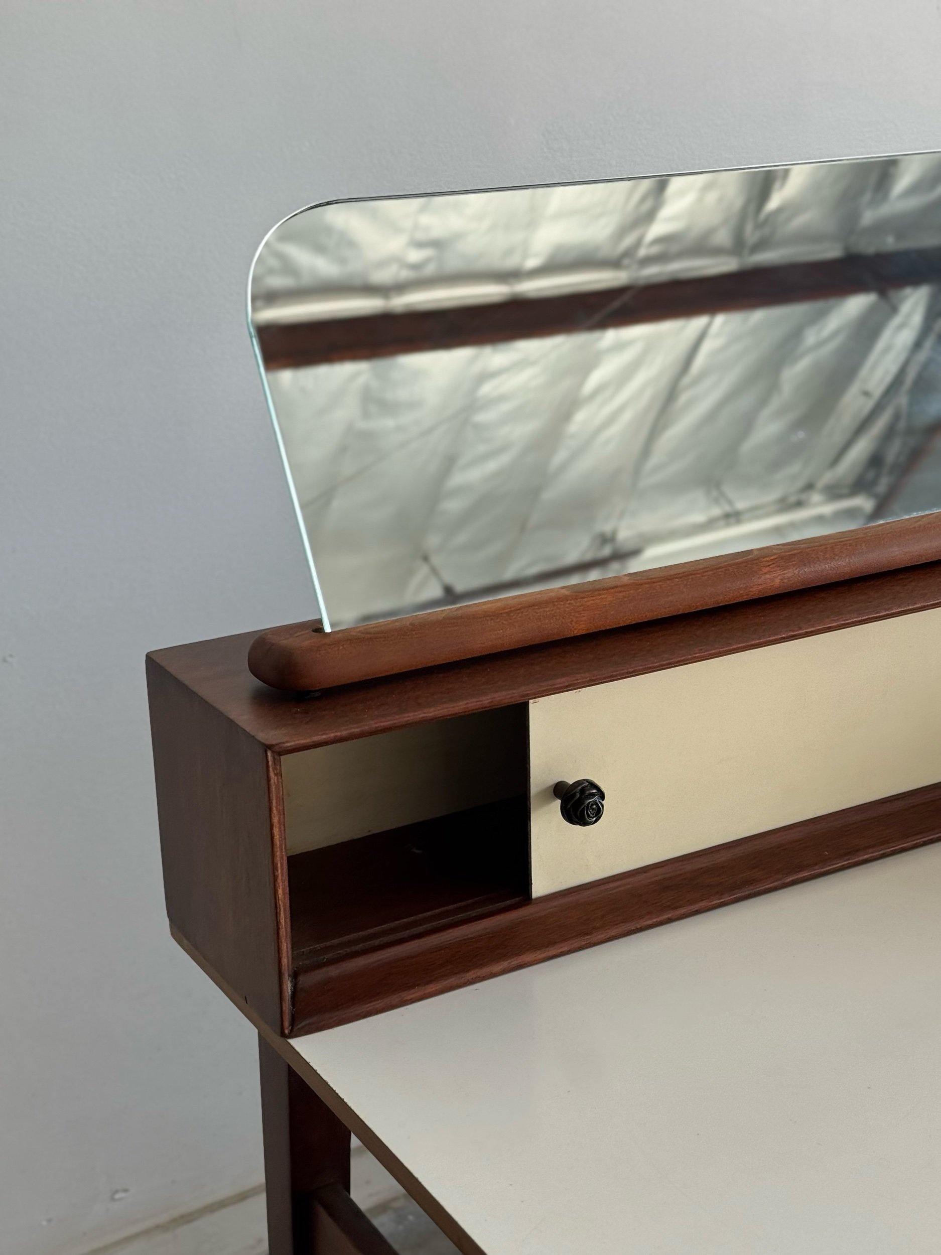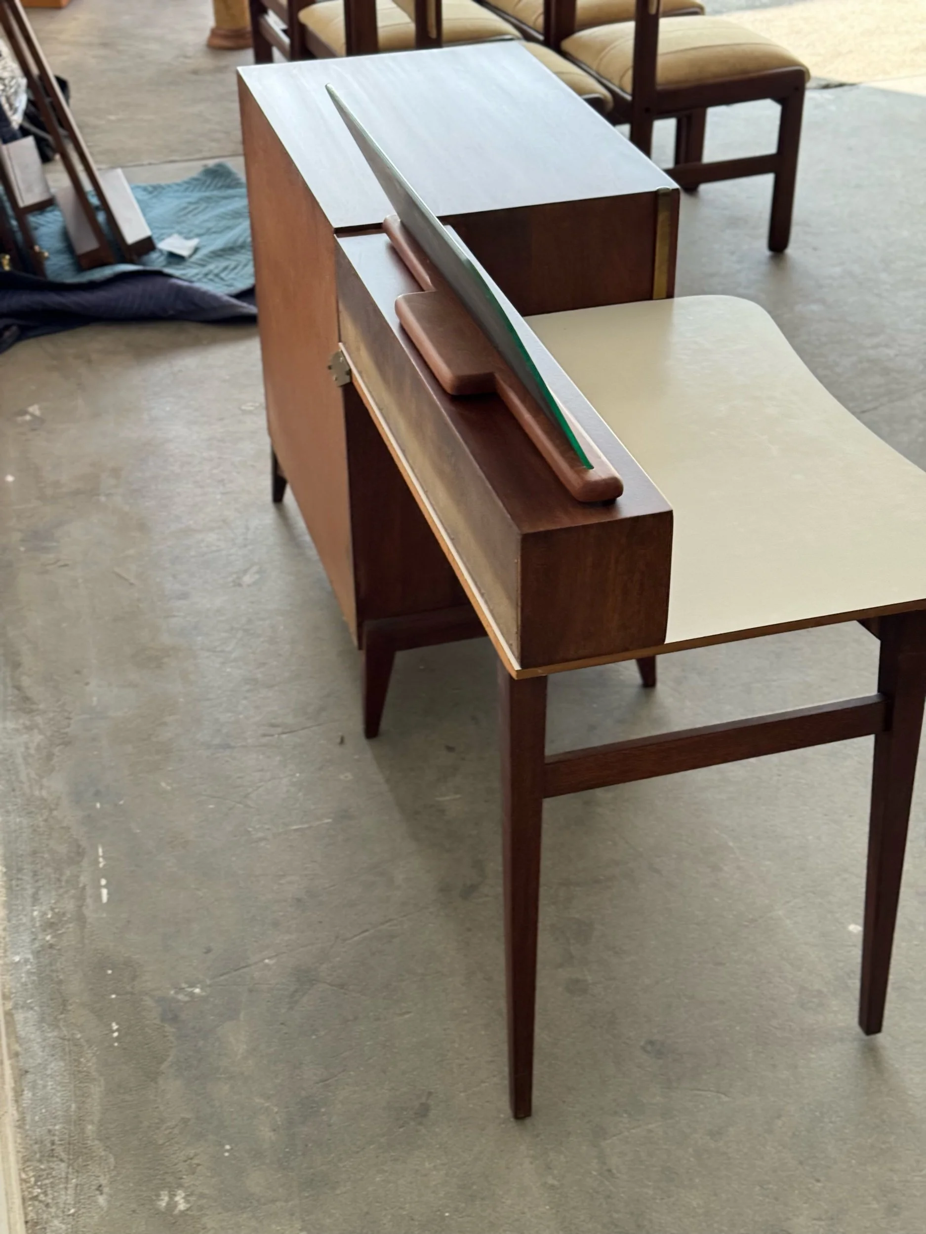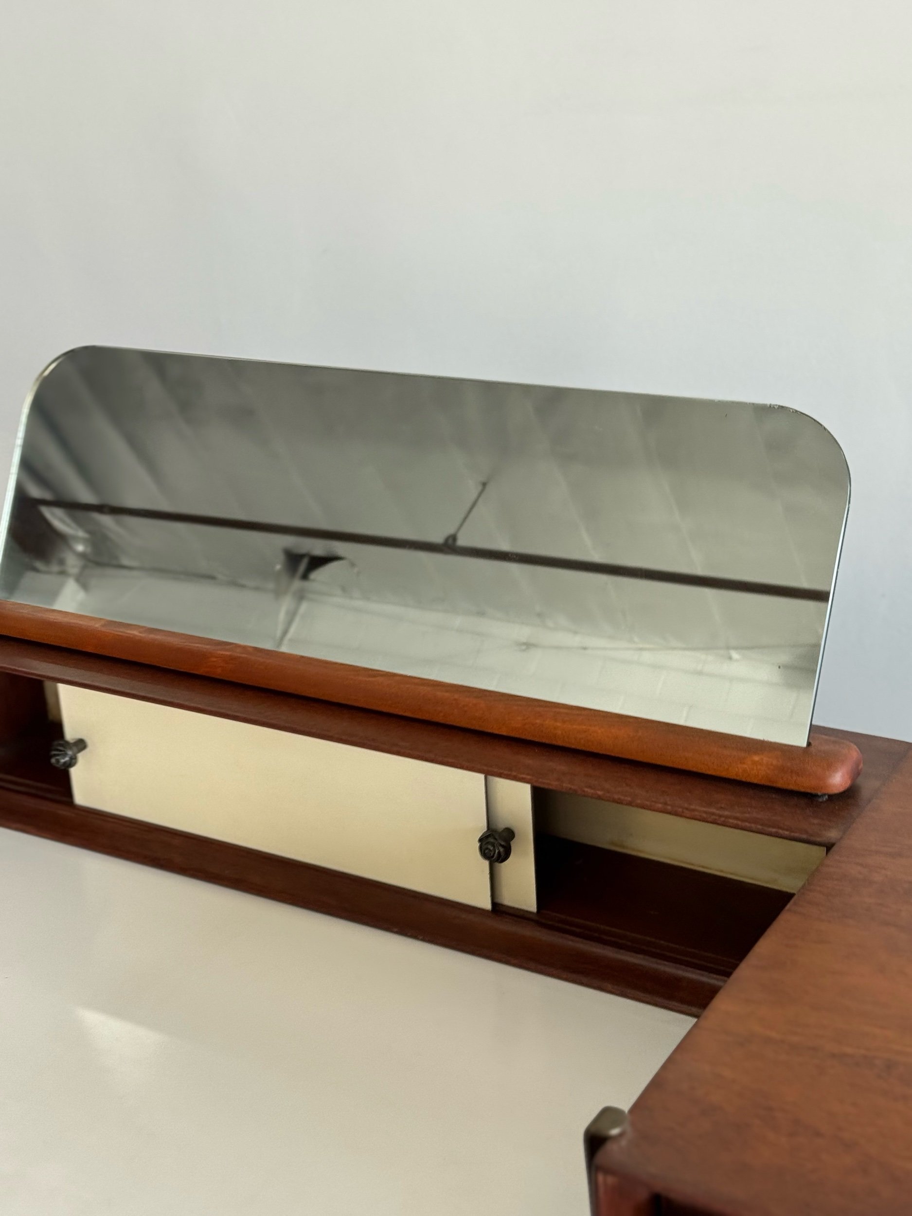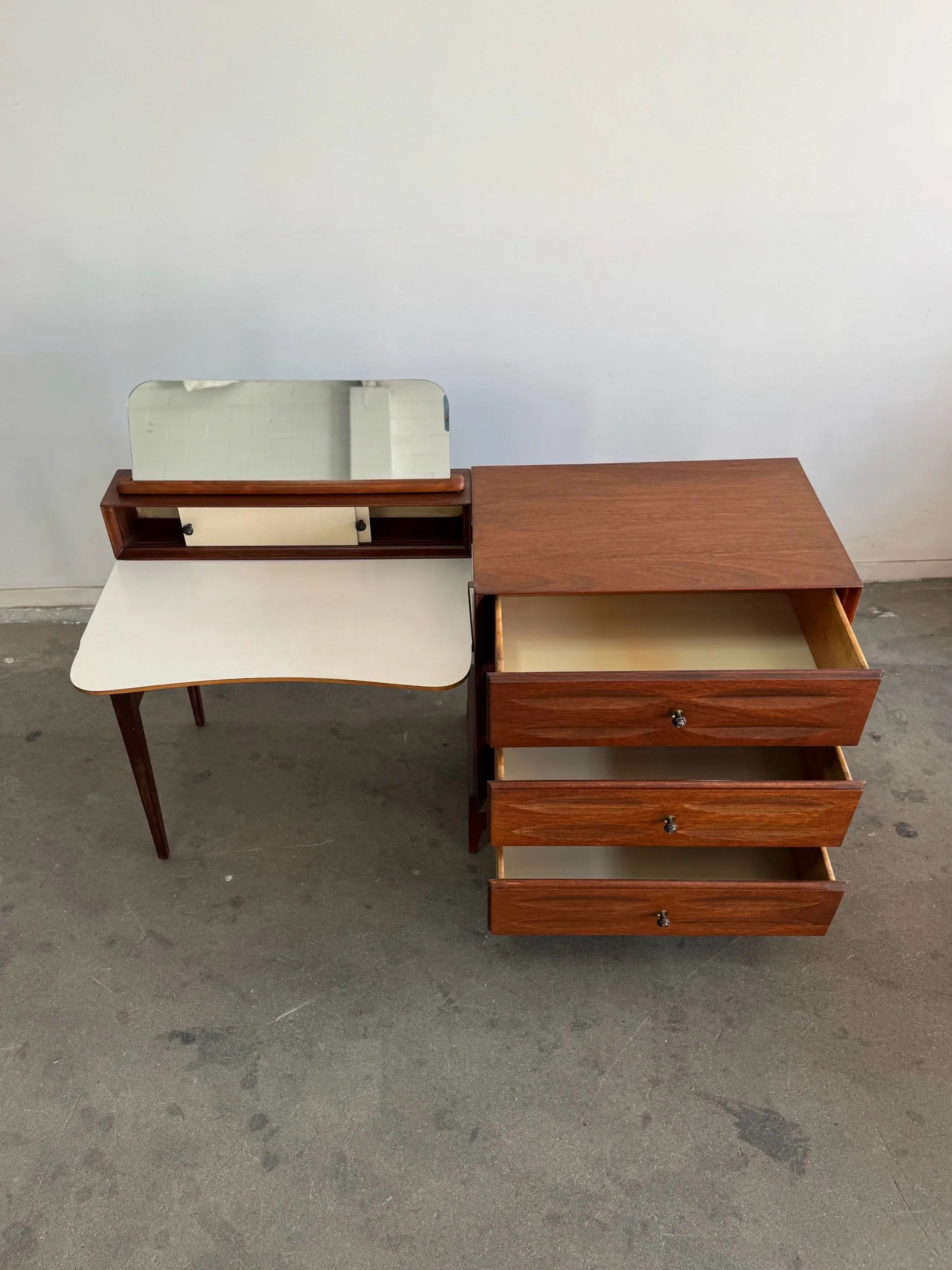 Fully restored rarely seen solid mahogany dresser vanity combo by Heywood Wakefield. Unit features a great sculptural base , exposed joinery , original hardware , removable mirror and storage cubby , and sculpted fronts on lower drawers. This unit is structurally sound and fully functional and is in good original vintage condition. Left side surface is removable for transport , and features a durable white Formica surface.
