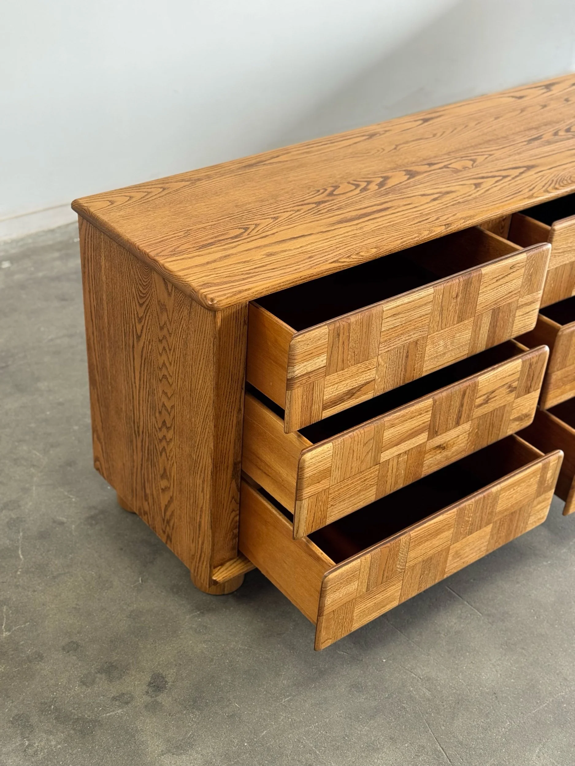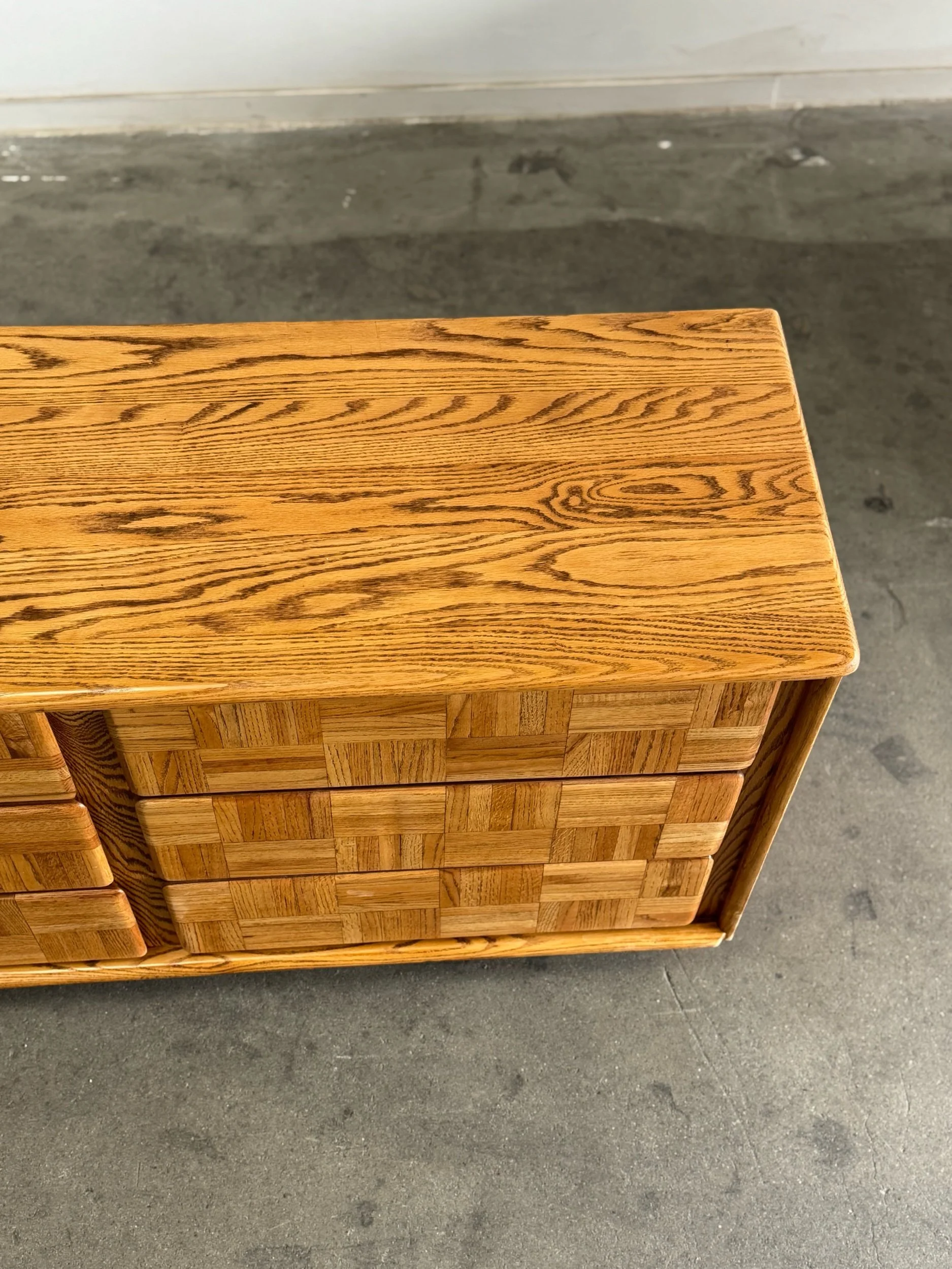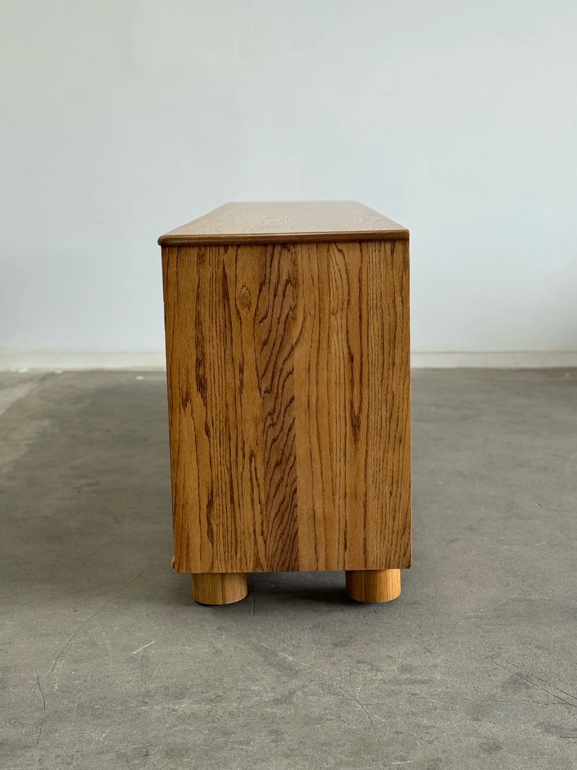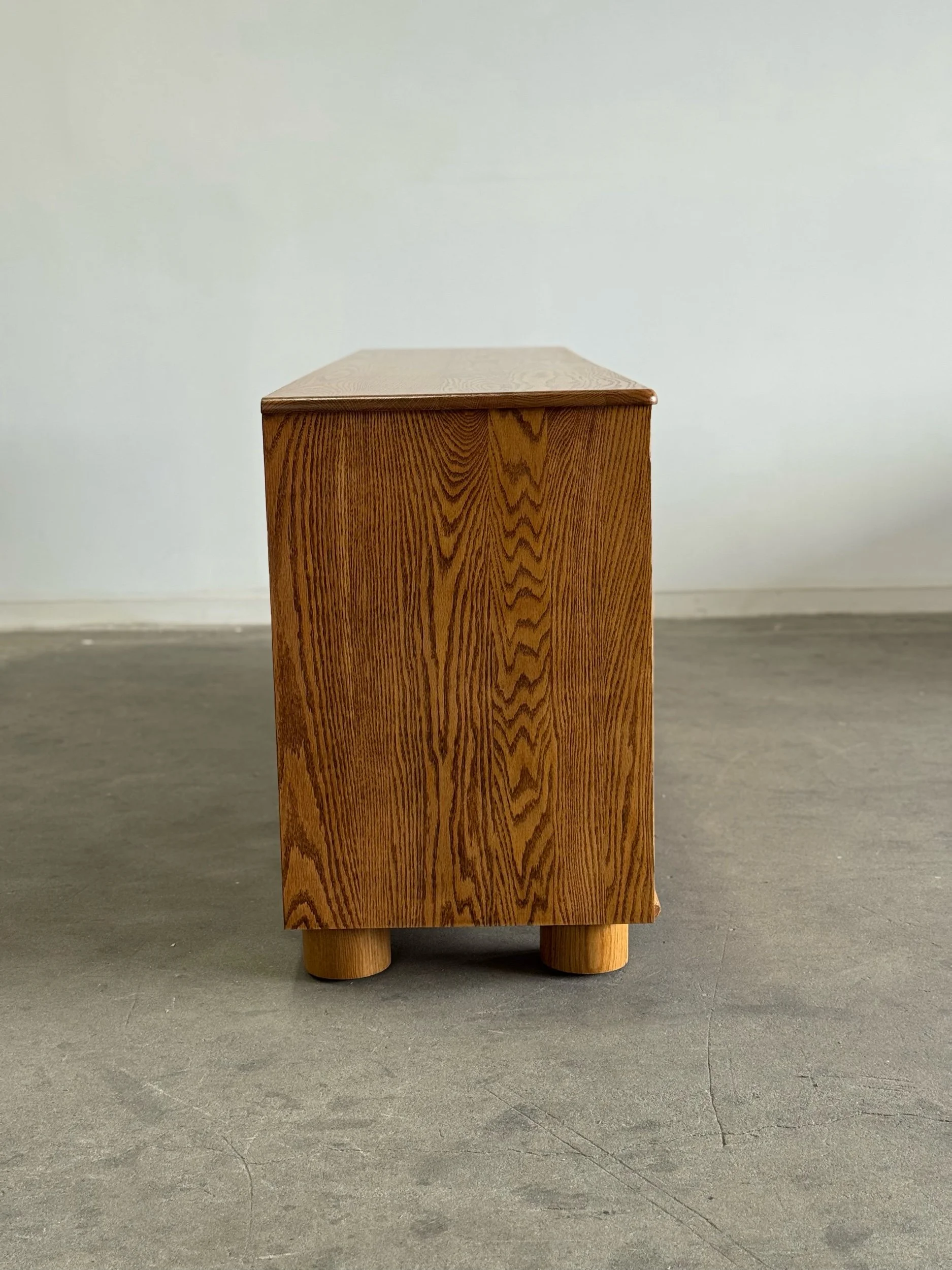 Fully restored post modern triple dresser. Dresser is structurally sound and fully functional. Unit features rounded edges , solid oak construction, cylinder oak legs and extra center support legs with new stretcher for lasting support . This dresser also has new wooden backing. Unit shows very well and has been clear coated to show natural hues.