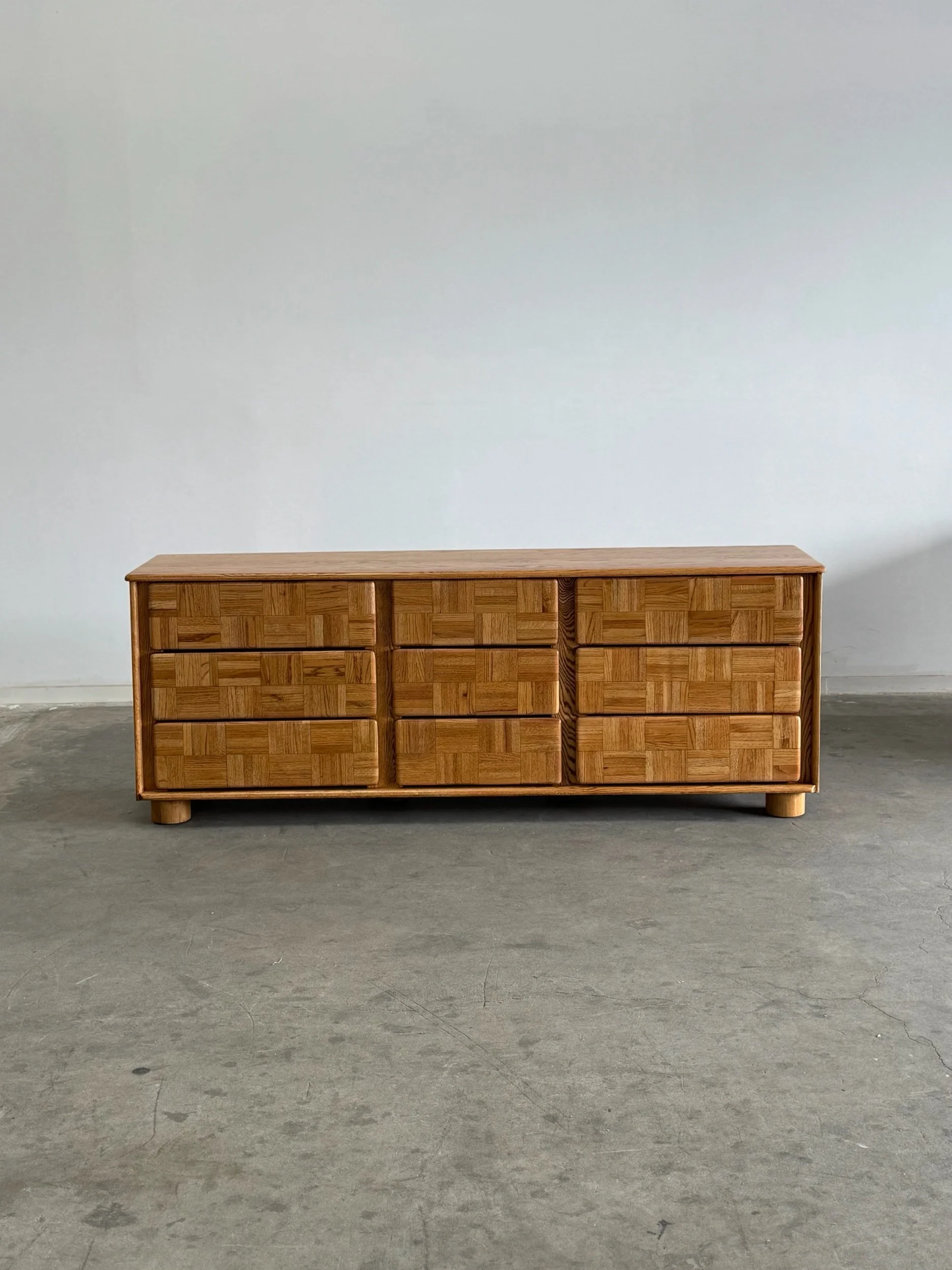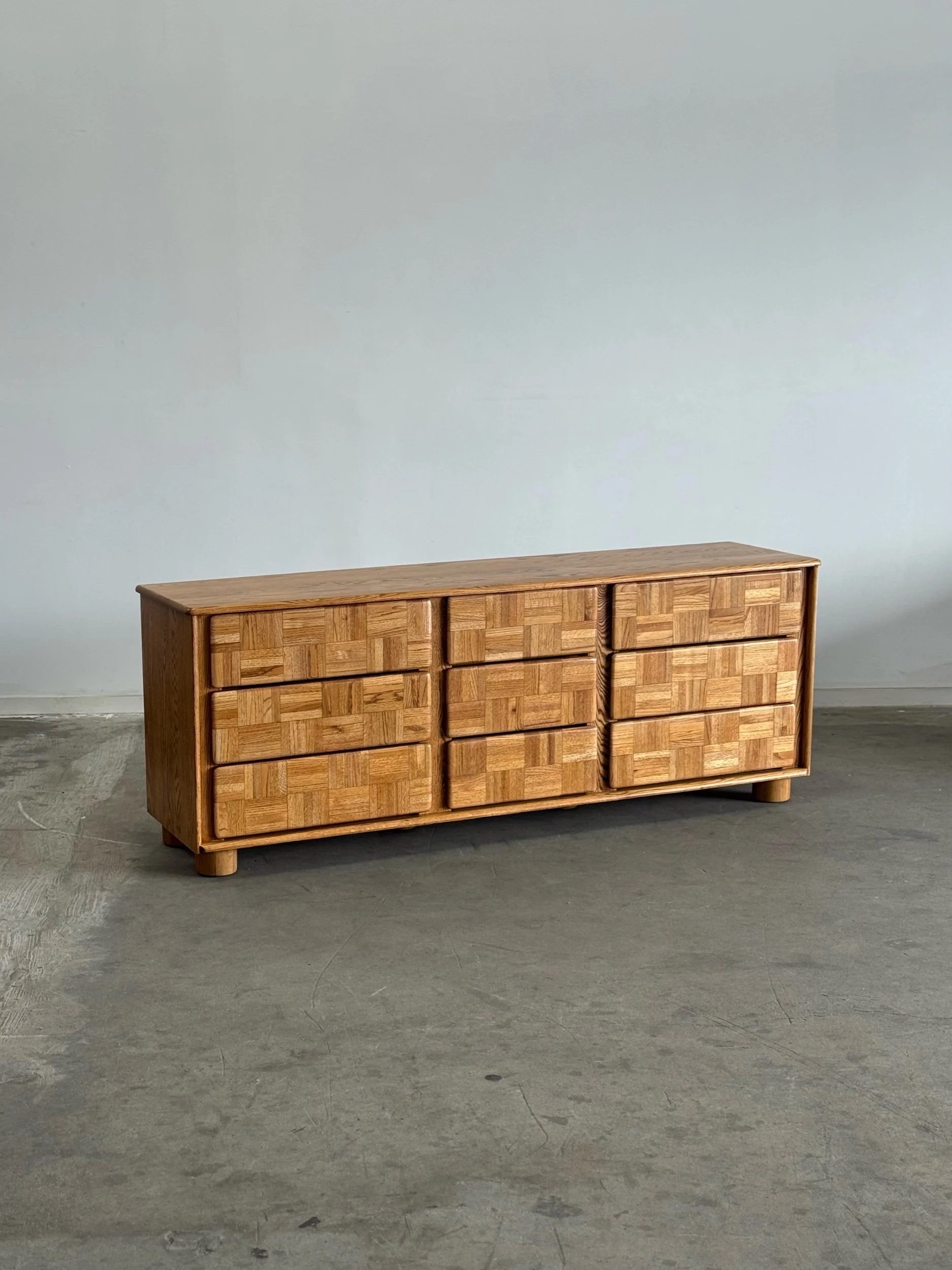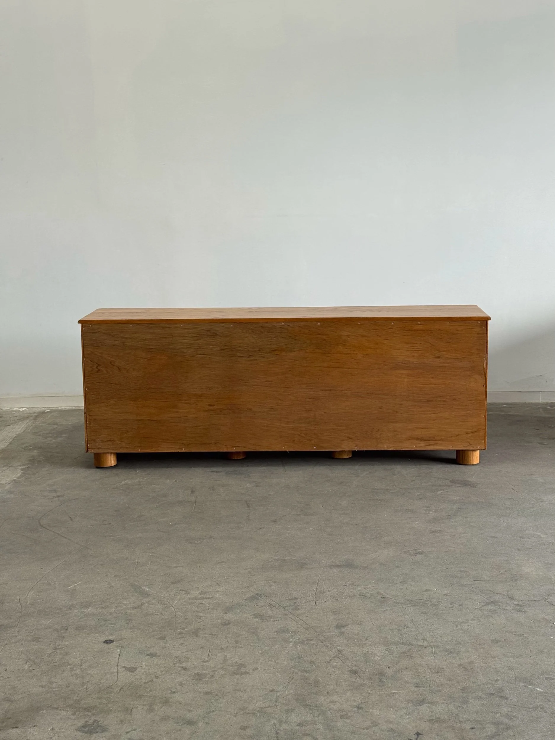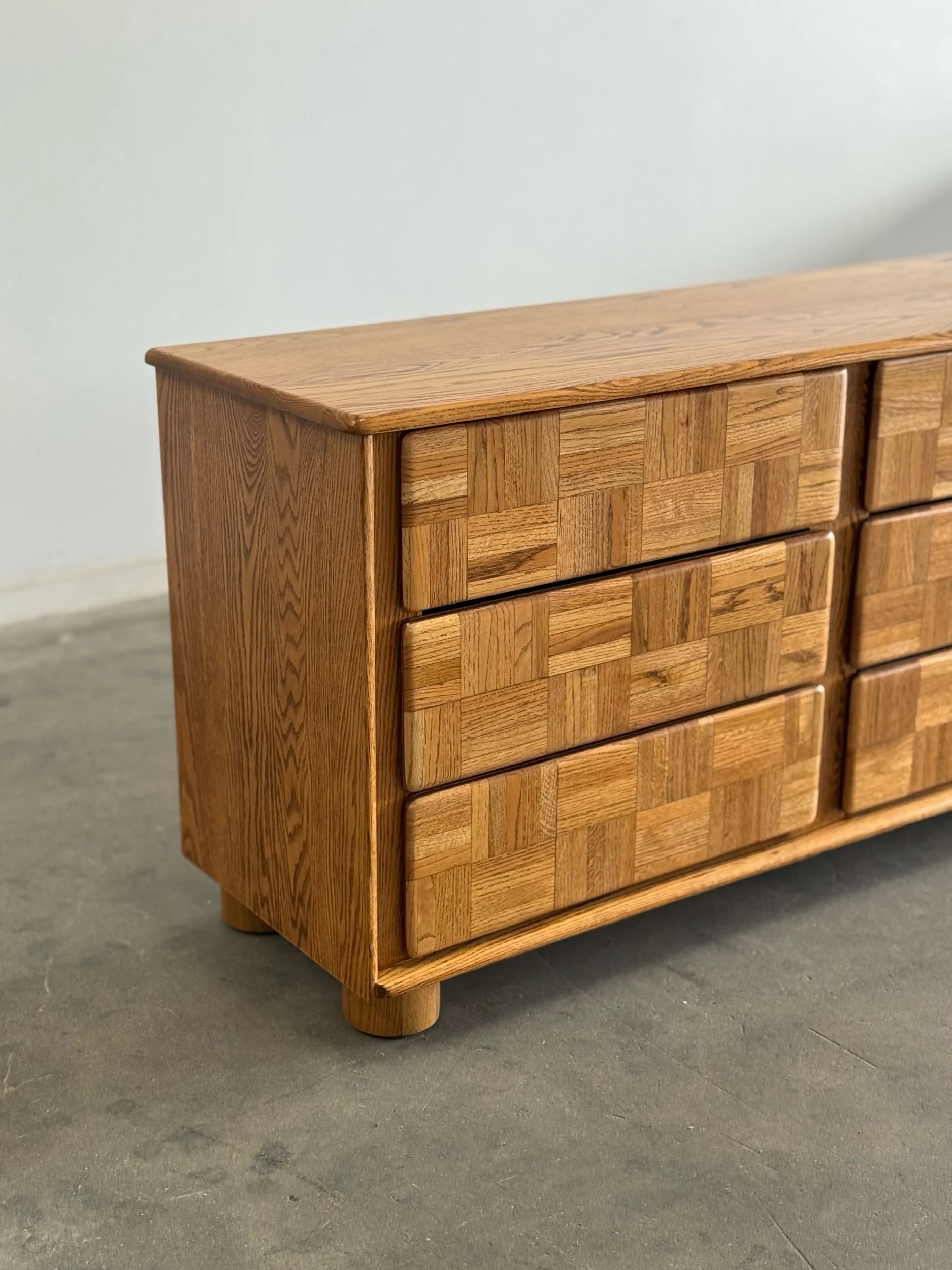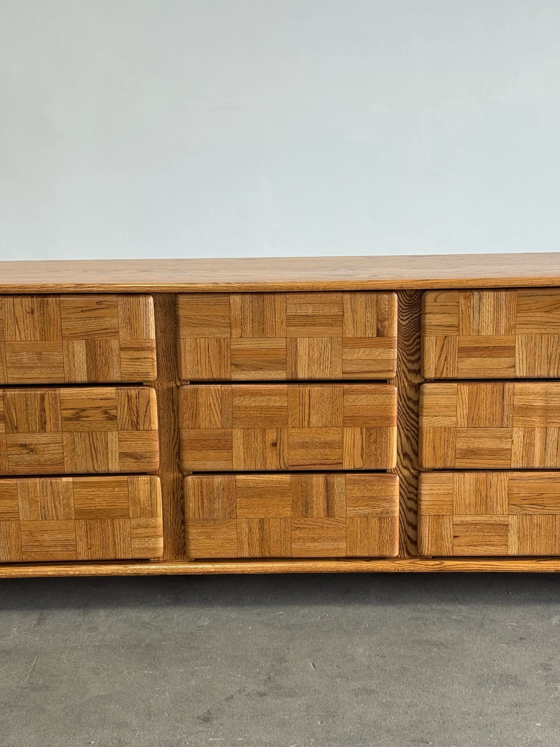 Fully restored post modern triple dresser. Dresser is structurally sound and fully functional. Unit features rounded edges , solid oak construction, cylinder oak legs and extra center support legs with new stretcher for lasting support . This dresser also has new wooden backing. Unit shows very well and has been clear coated to show natural hues.