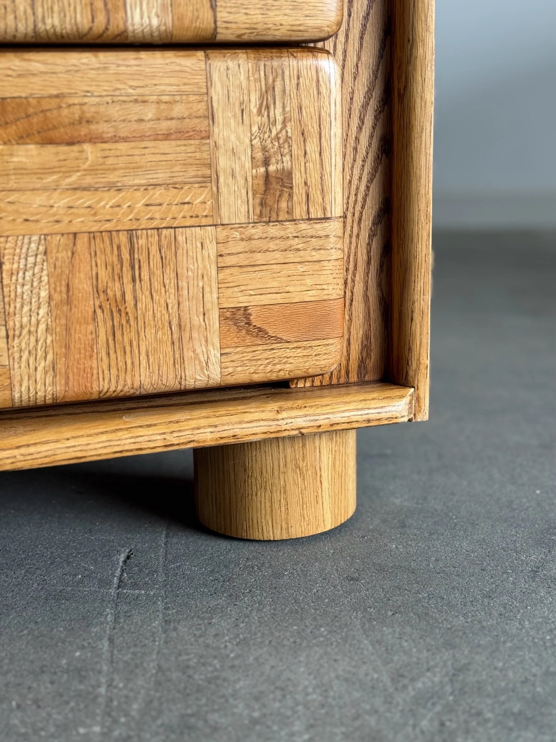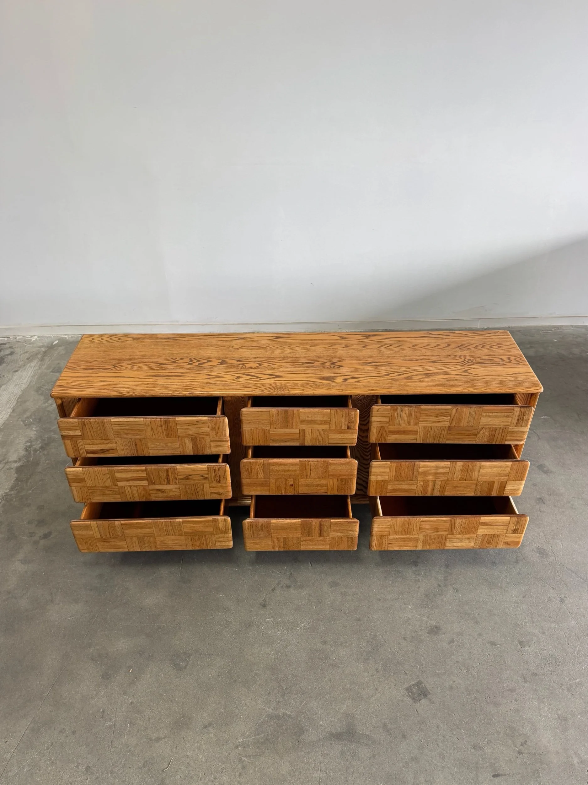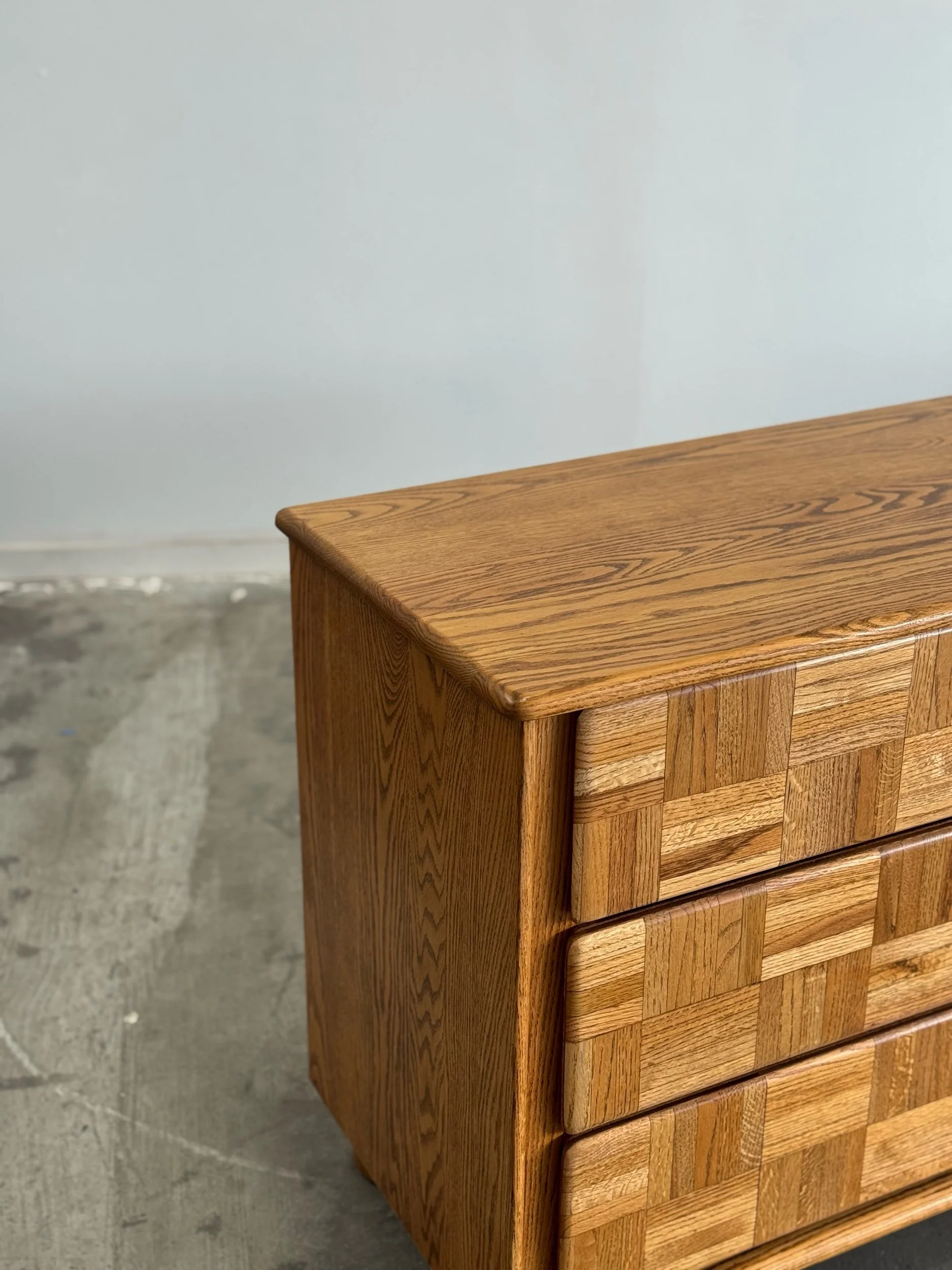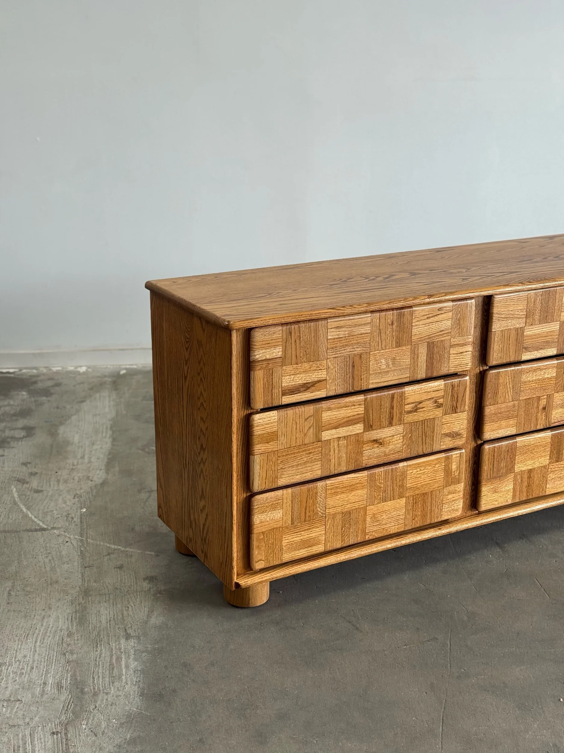 Fully restored post modern triple dresser. Dresser is structurally sound and fully functional. Unit features rounded edges , solid oak construction, cylinder oak legs and extra center support legs with new stretcher for lasting support . This dresser also has new wooden backing. Unit shows very well and has been clear coated to show natural hues.
