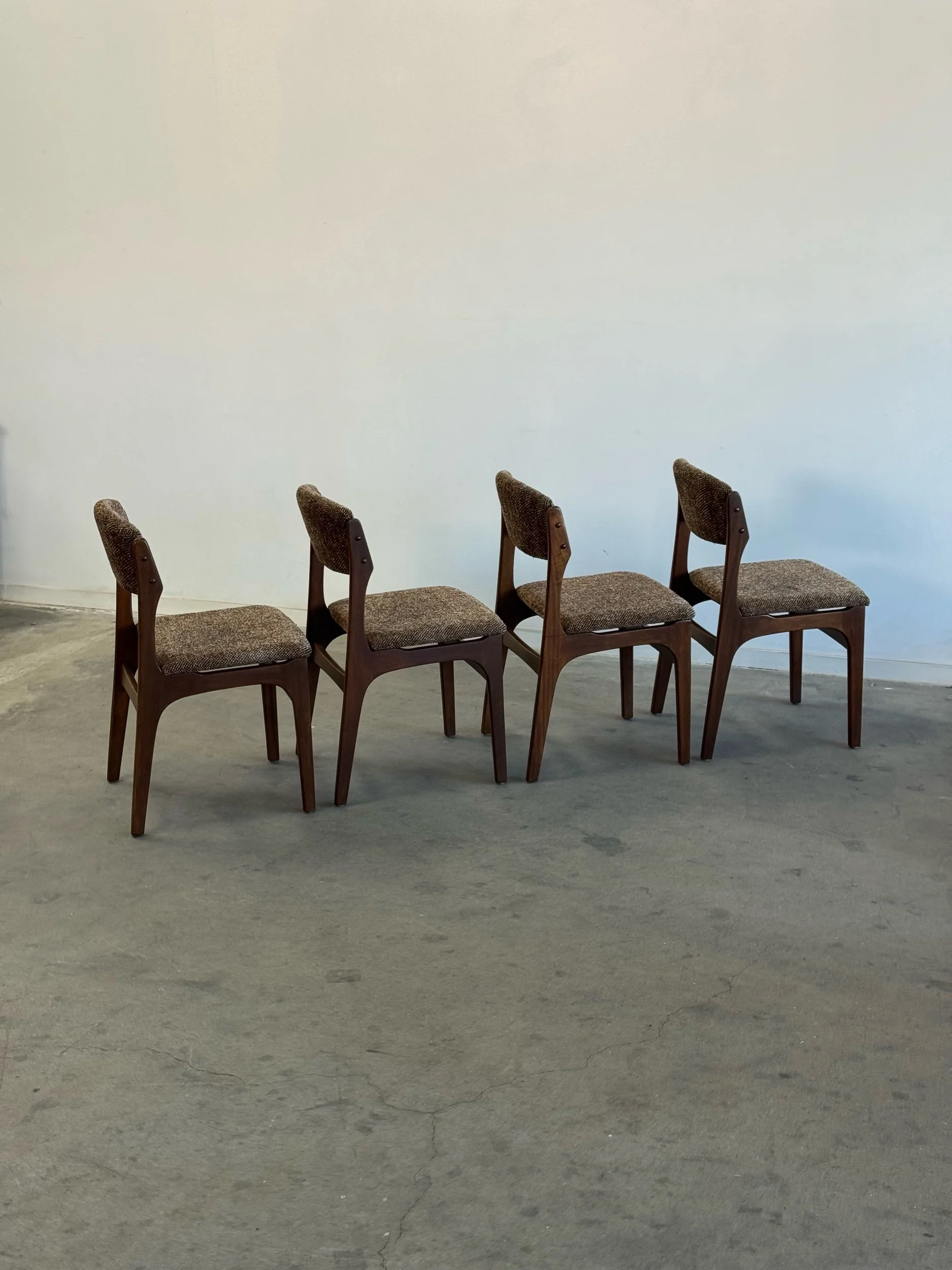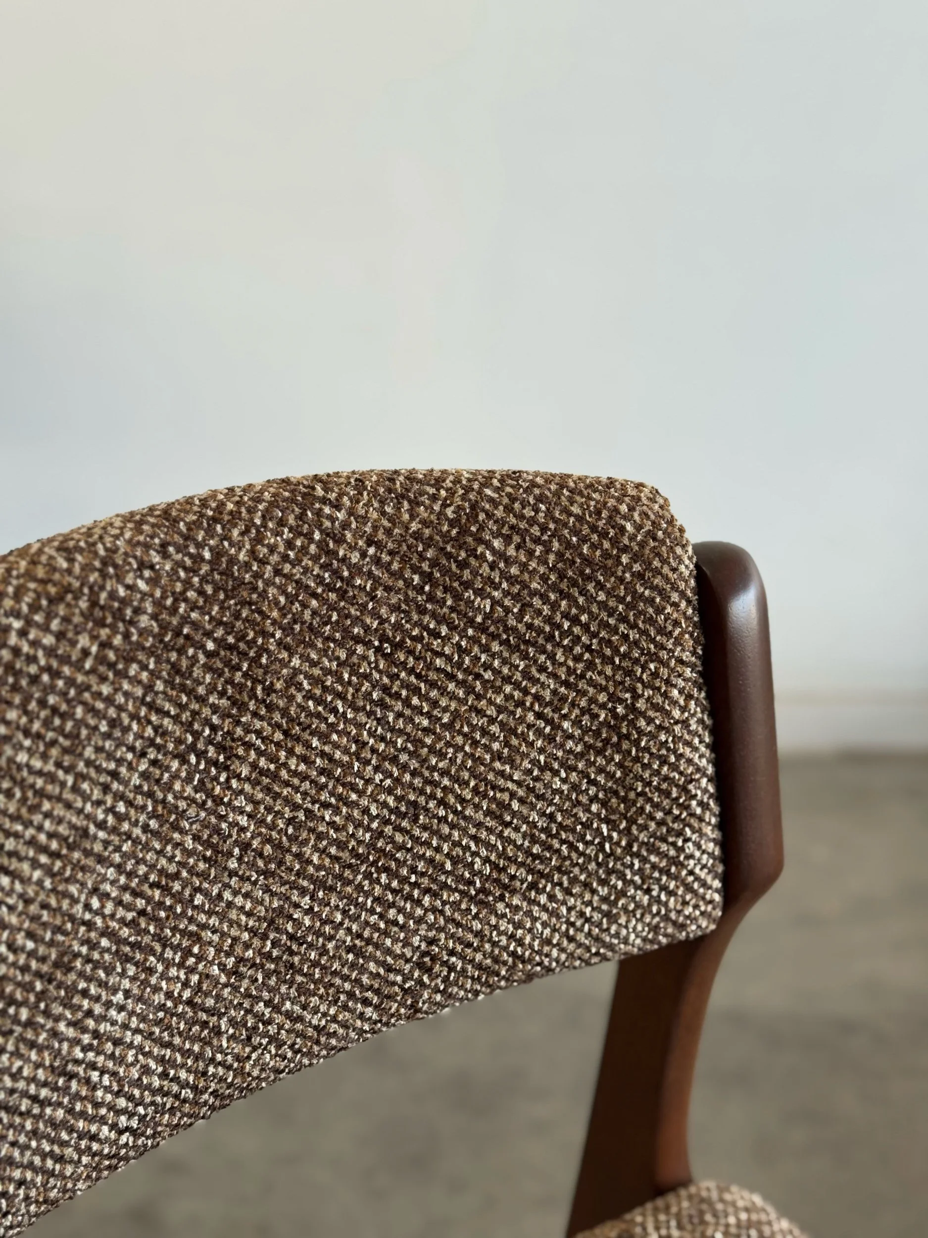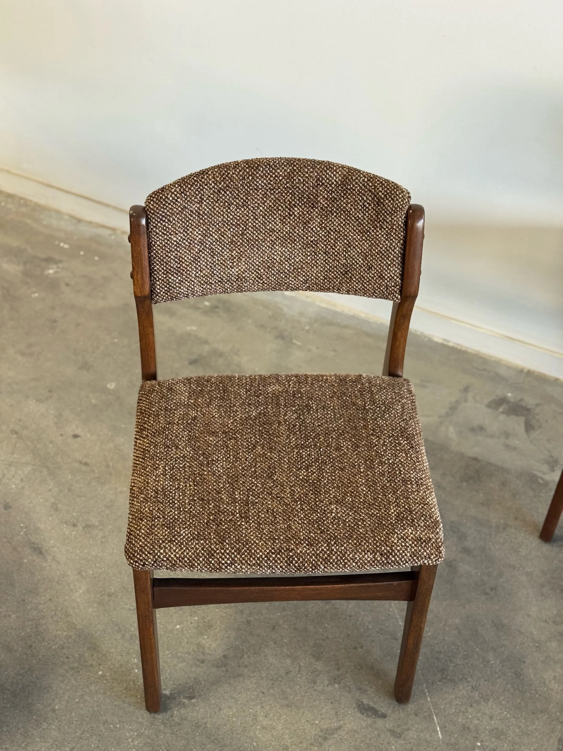 A beautifully crafted set of four mid-century dining chairs featuring sculpted walnut stained frames and textured woven upholstery in a rich, neutral brown tone. The design combines clean Danish-inspired lines with sturdy craftsmanship, offering both comfort and timeless appeal. Chairs have been fully restored through refinishing and new upholstery.