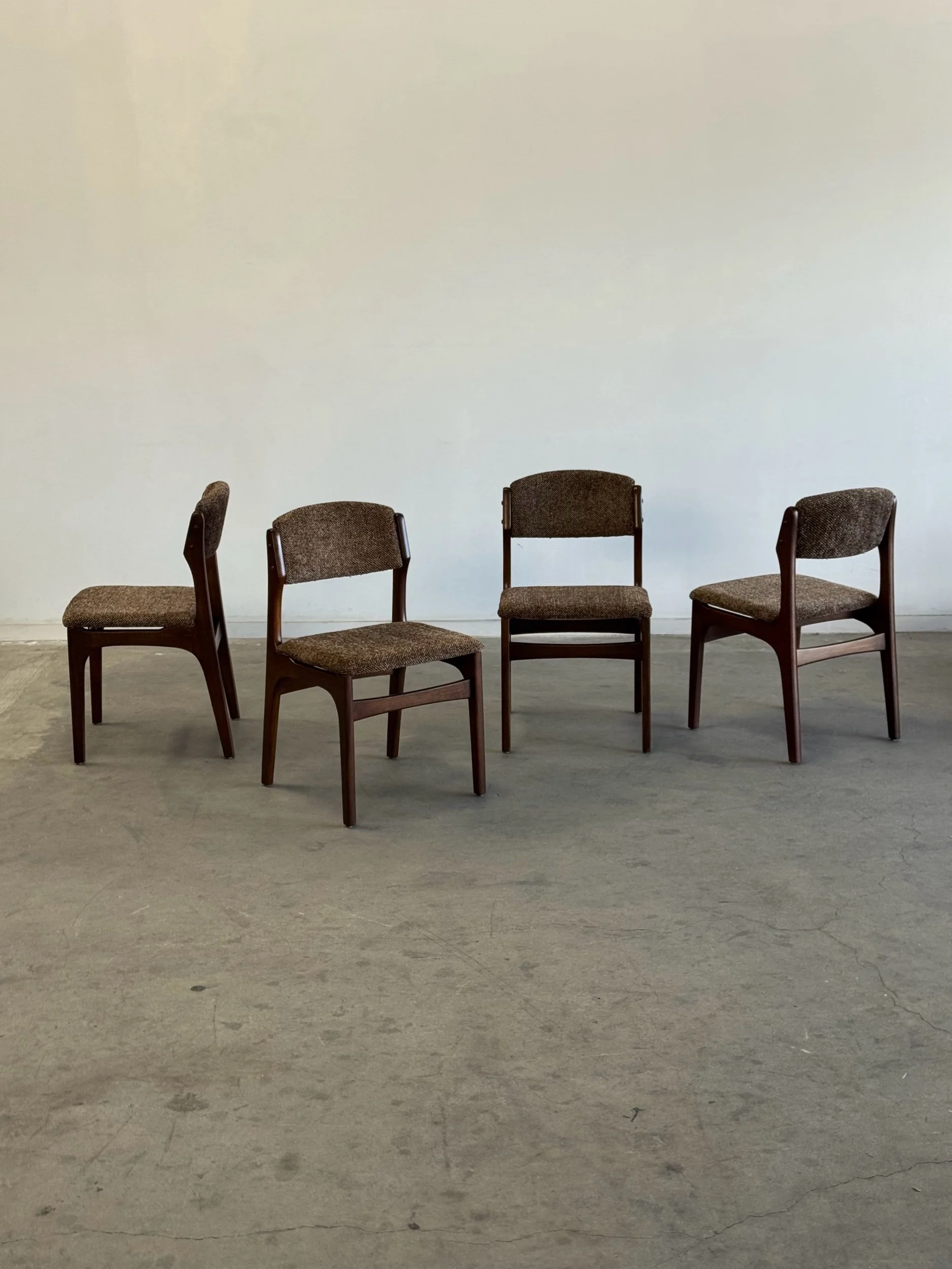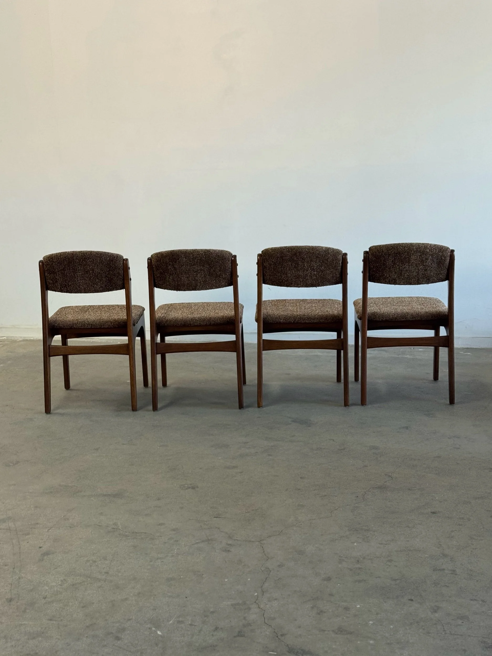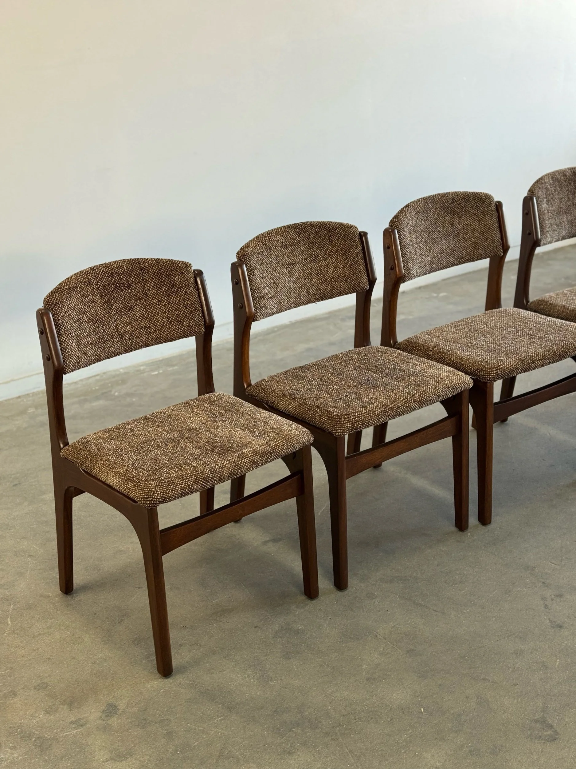 A beautifully crafted set of four mid-century dining chairs featuring sculpted walnut stained frames and textured woven upholstery in a rich, neutral brown tone. The design combines clean Danish-inspired lines with sturdy craftsmanship, offering both comfort and timeless appeal. Chairs have been fully restored through refinishing and new upholstery.