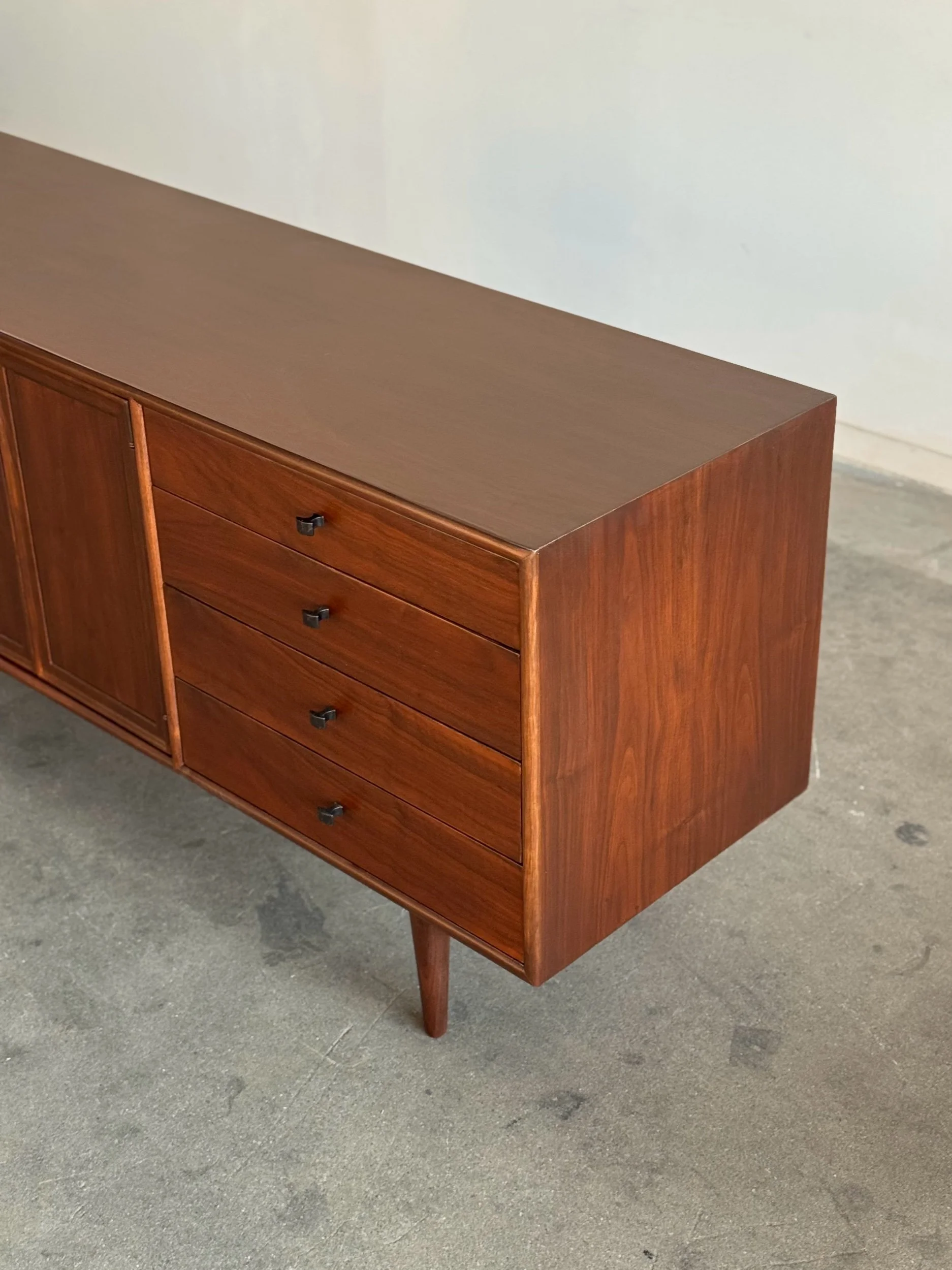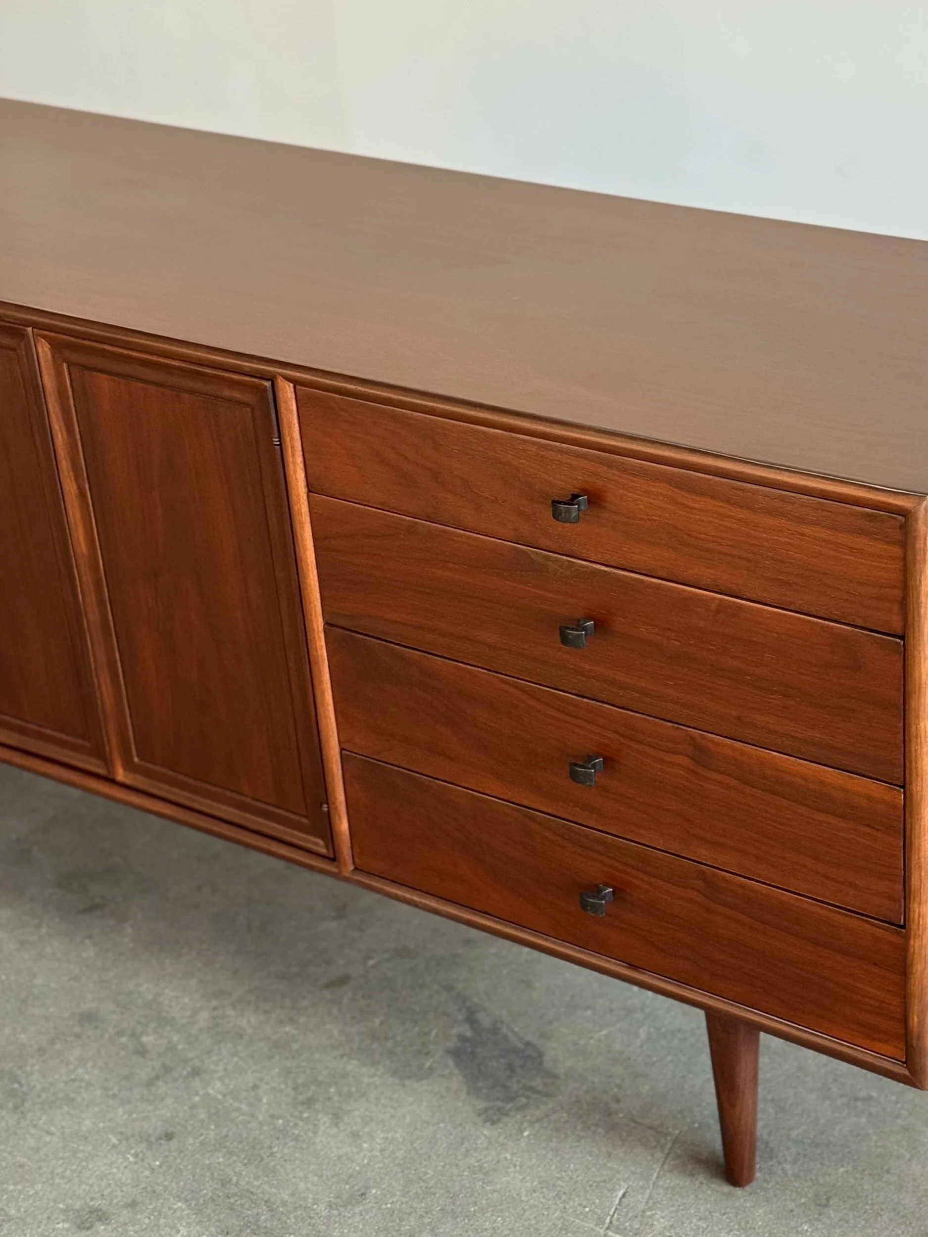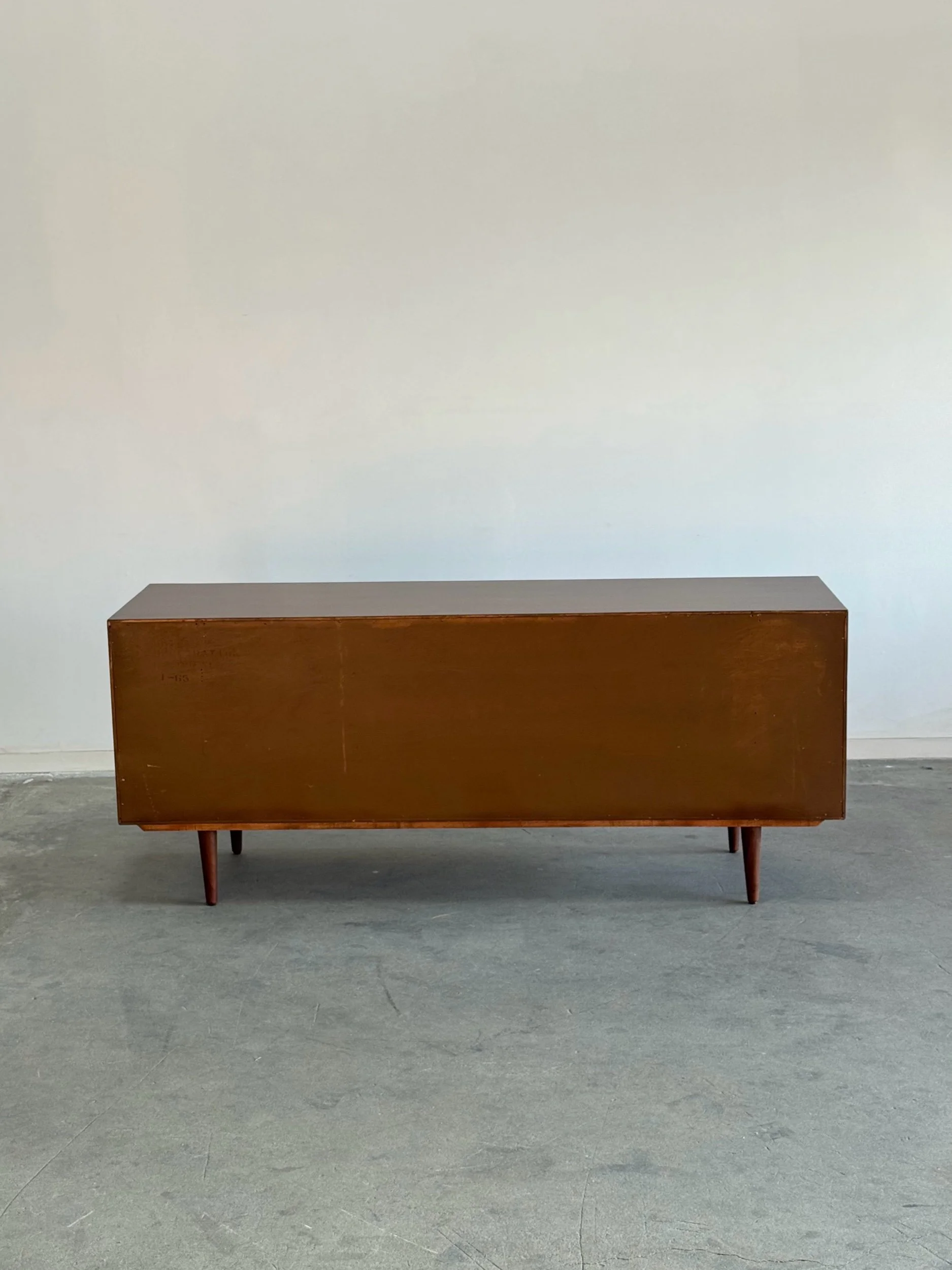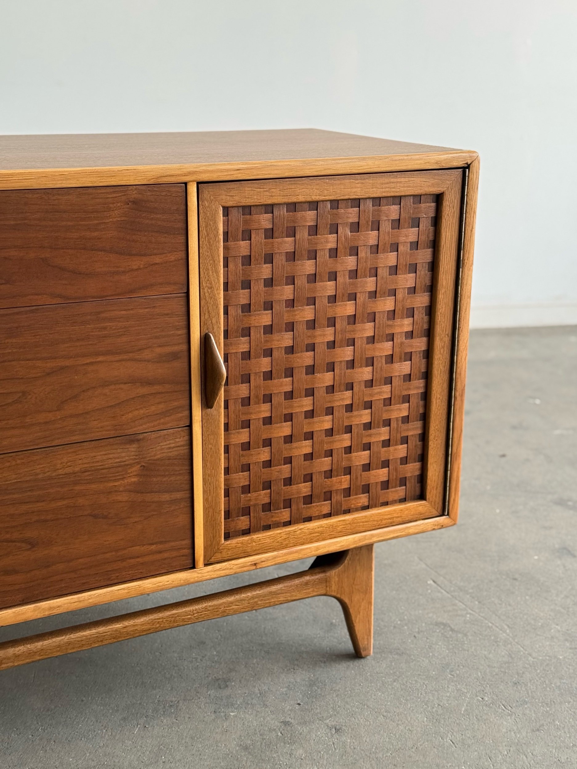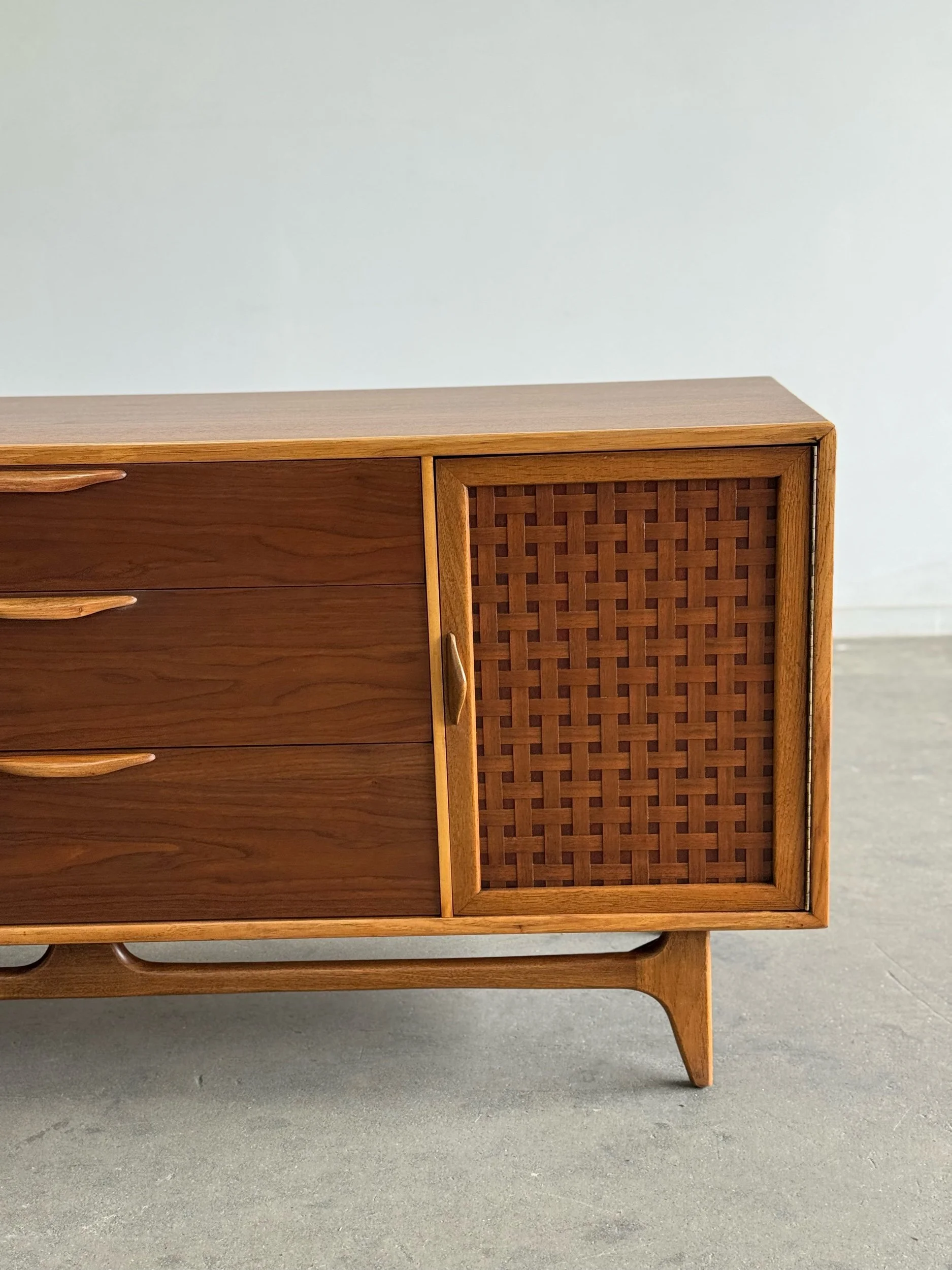 Lane credenza restored both structurally and aesthetically. Unit features wonderful sculpted pulls, woven detailed doors, and sturdy base with plenty of cross bars. Unit shows well and has been clear coated to show natural hues.