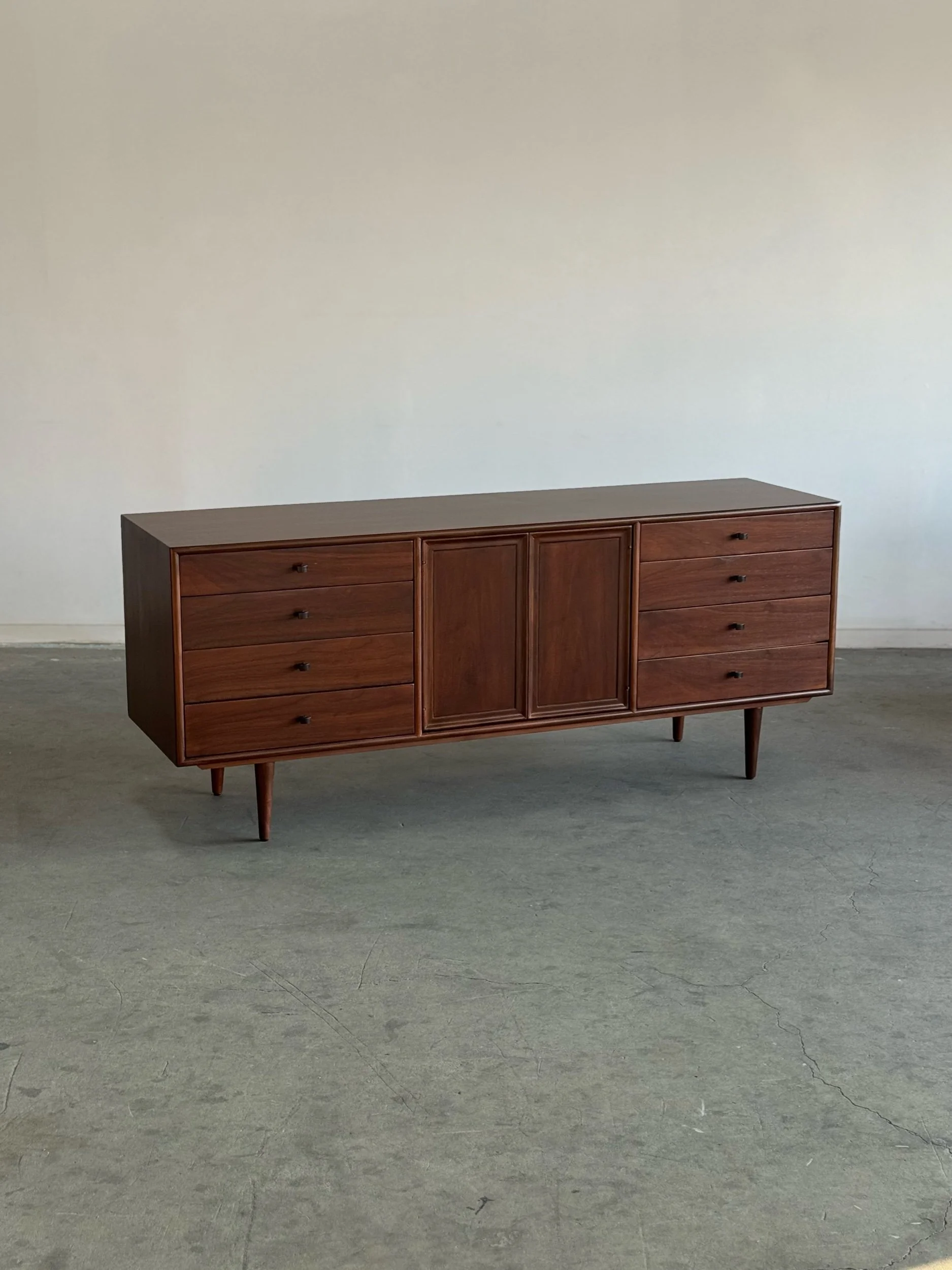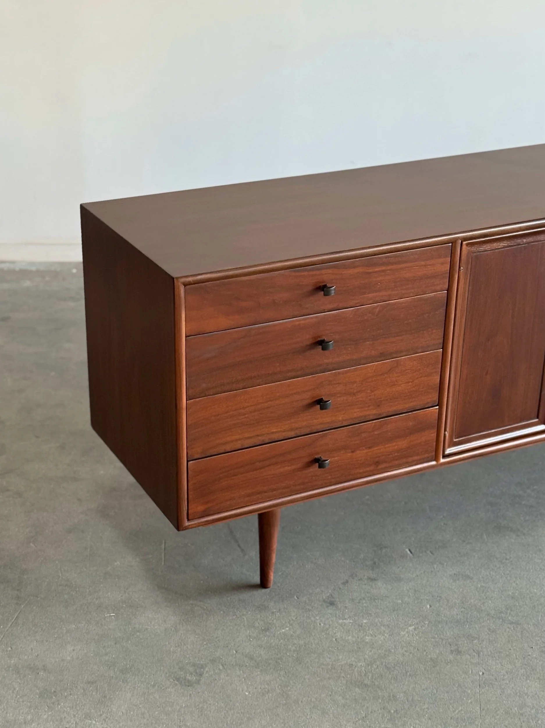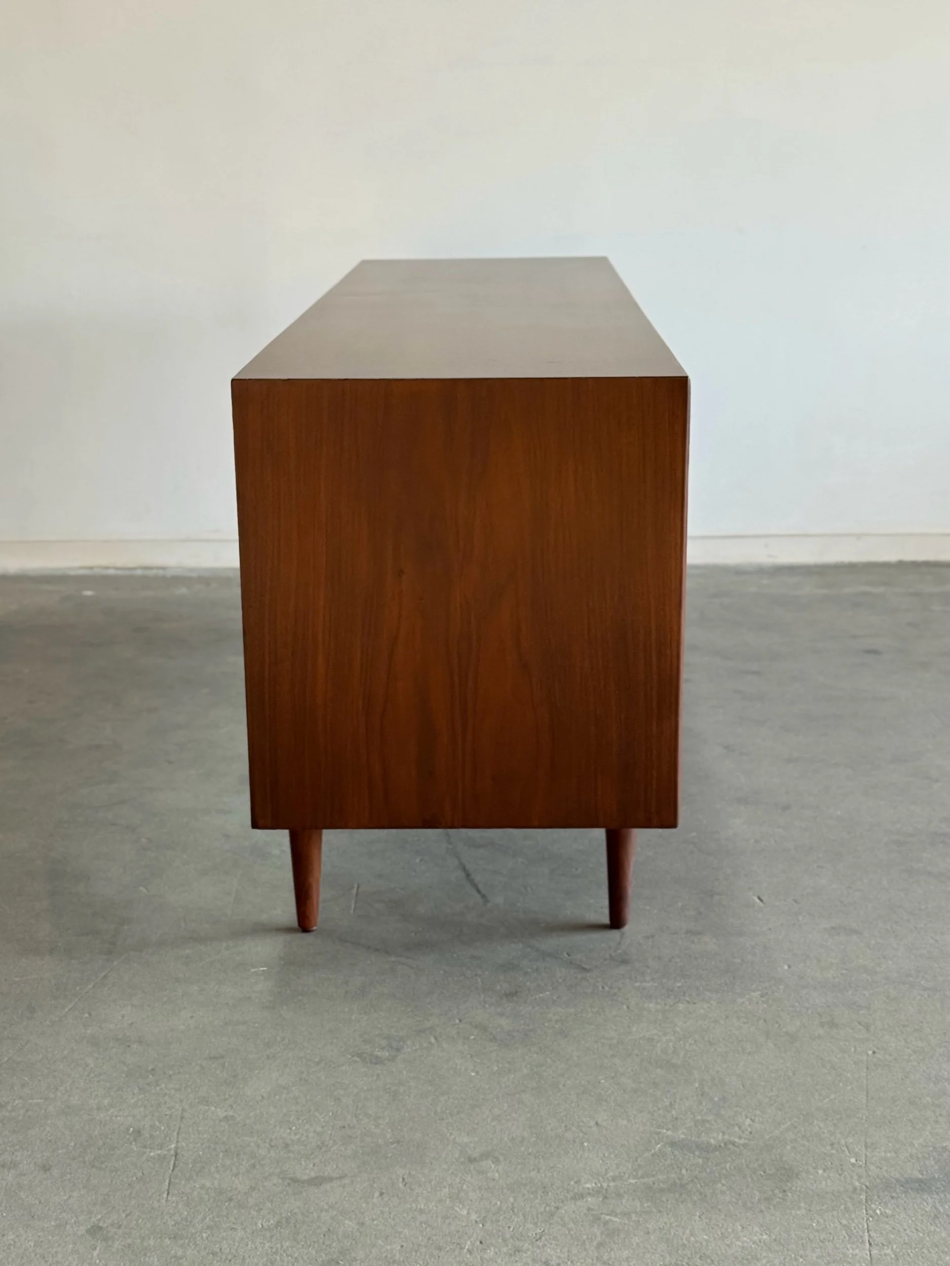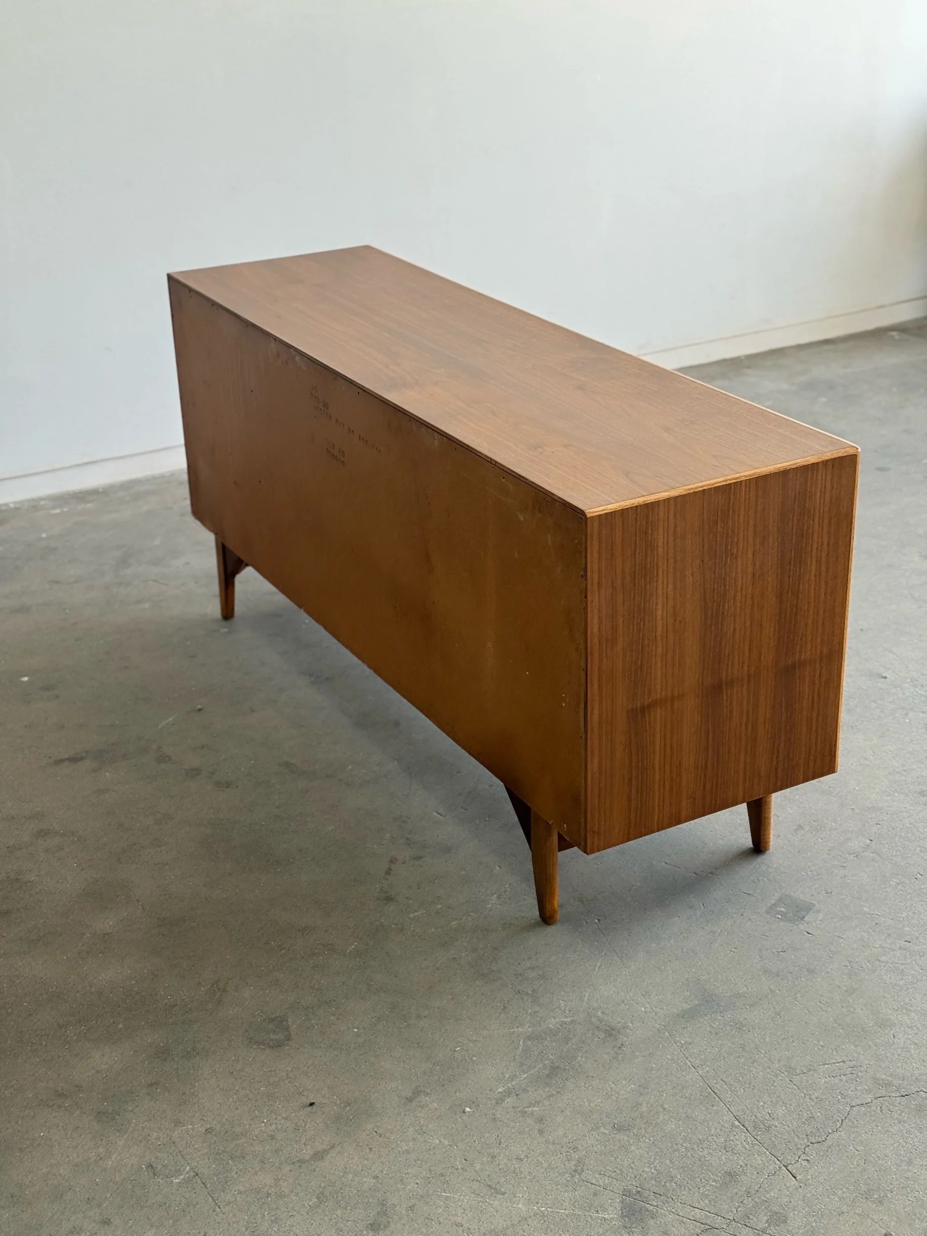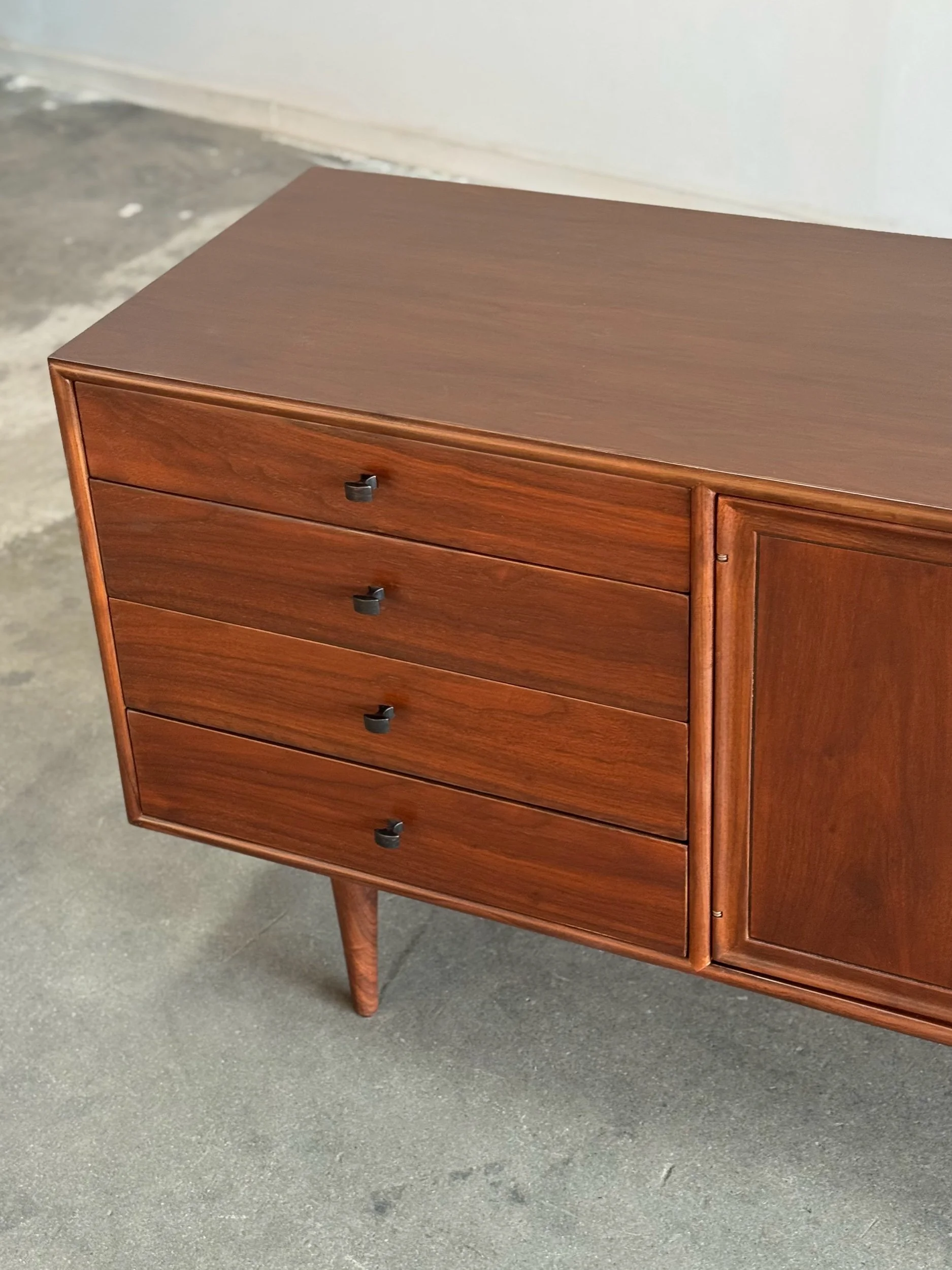 Lane credenza restored both structurally and aesthetically. Unit features wonderful sculpted pulls, woven detailed doors, and sturdy base with plenty of cross bars. Unit shows well and has been clear coated to show natural hues.
