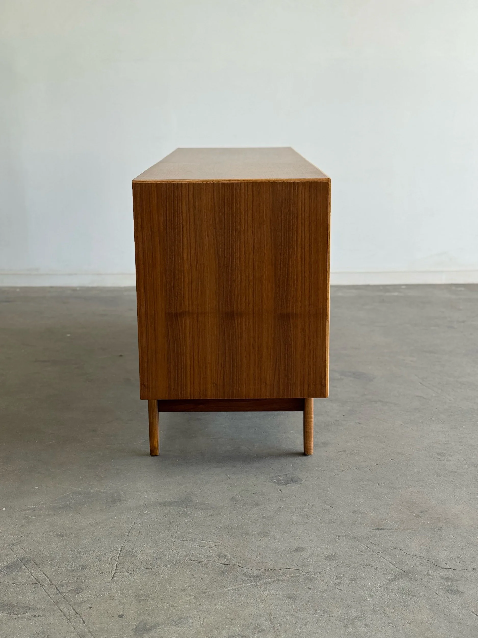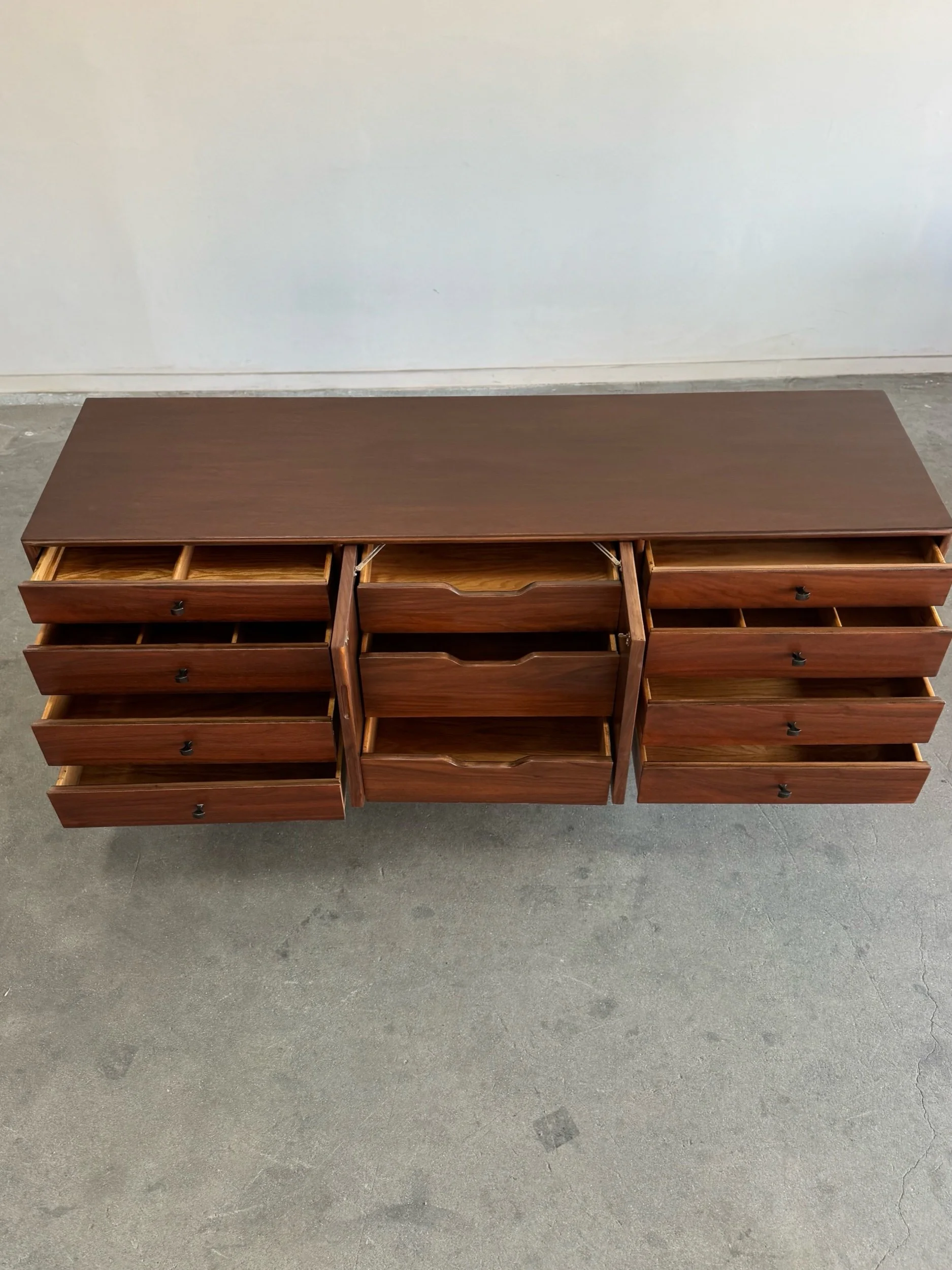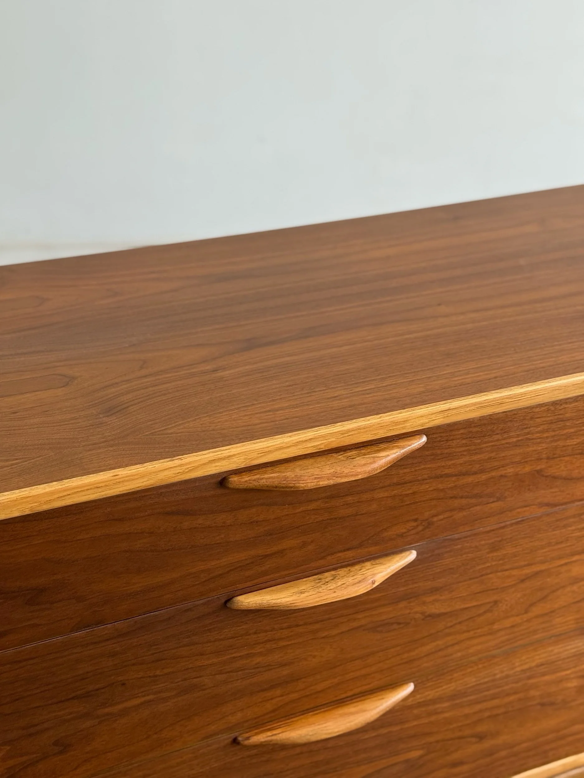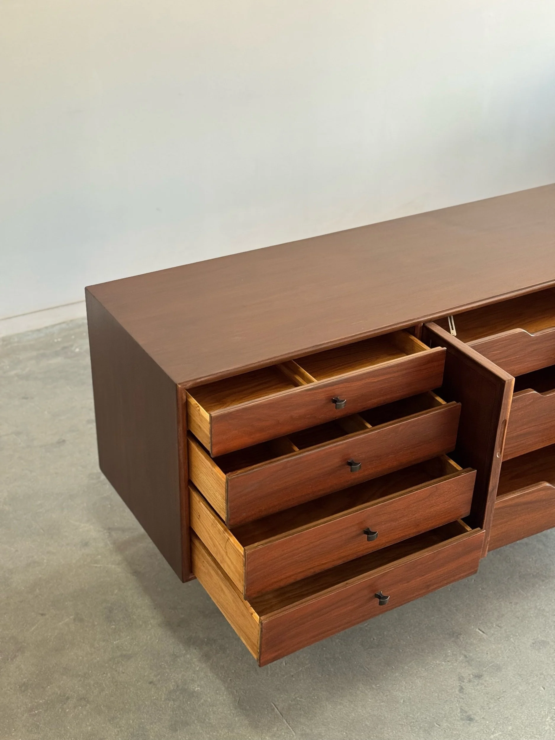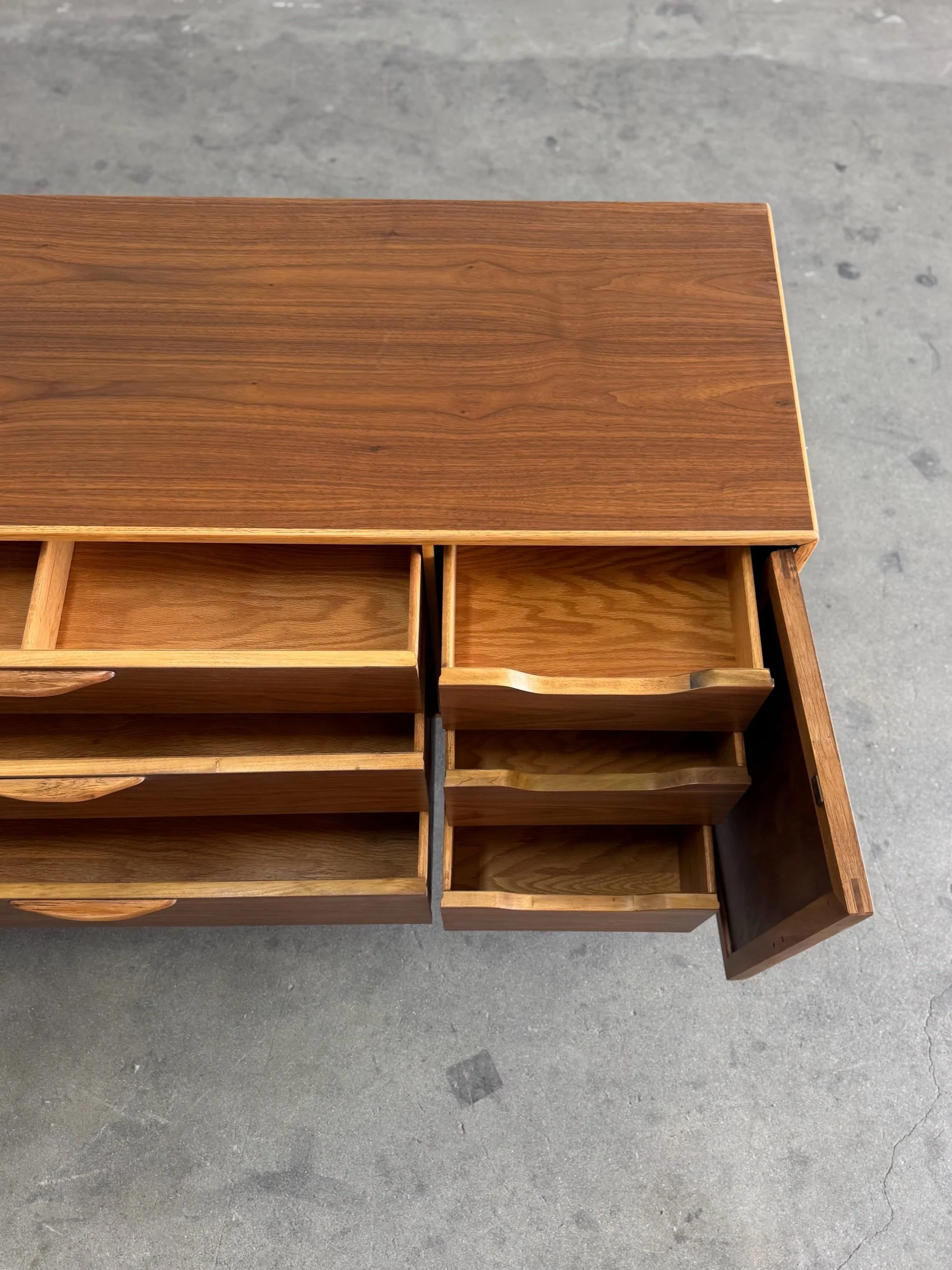 Lane credenza restored both structurally and aesthetically. Unit features wonderful sculpted pulls, woven detailed doors, and sturdy base with plenty of cross bars. Unit shows well and has been clear coated to show natural hues.