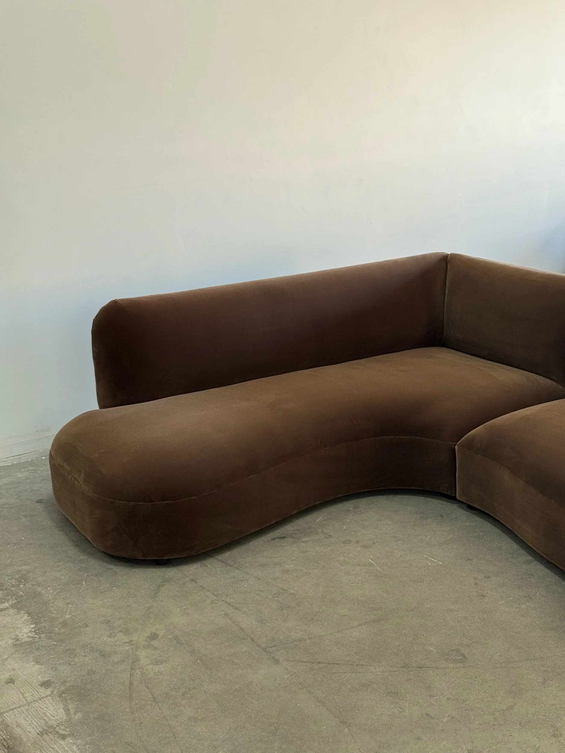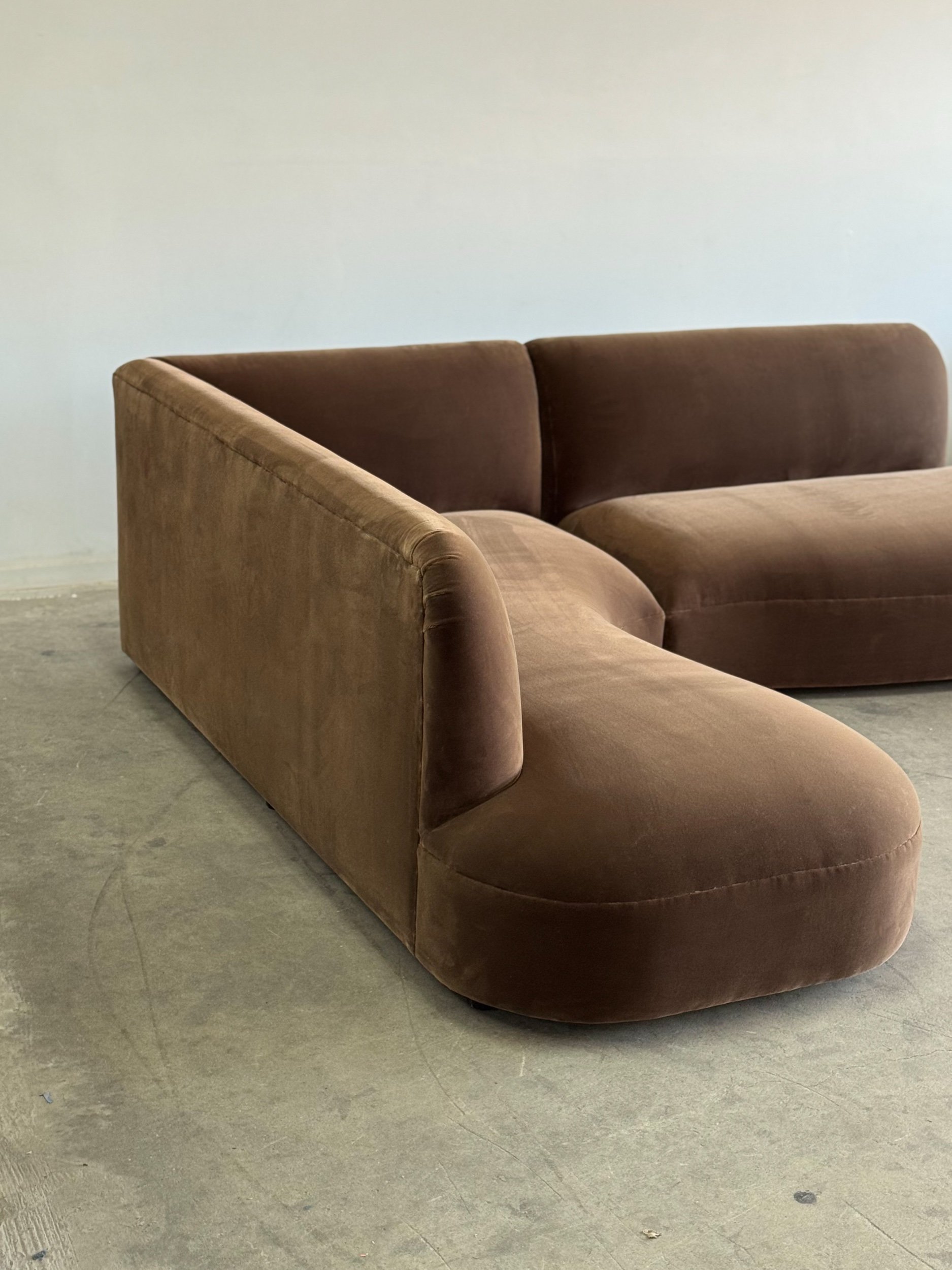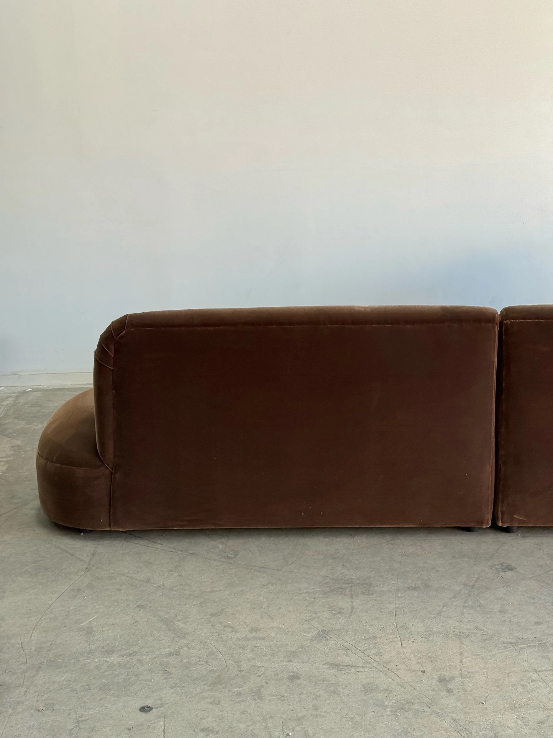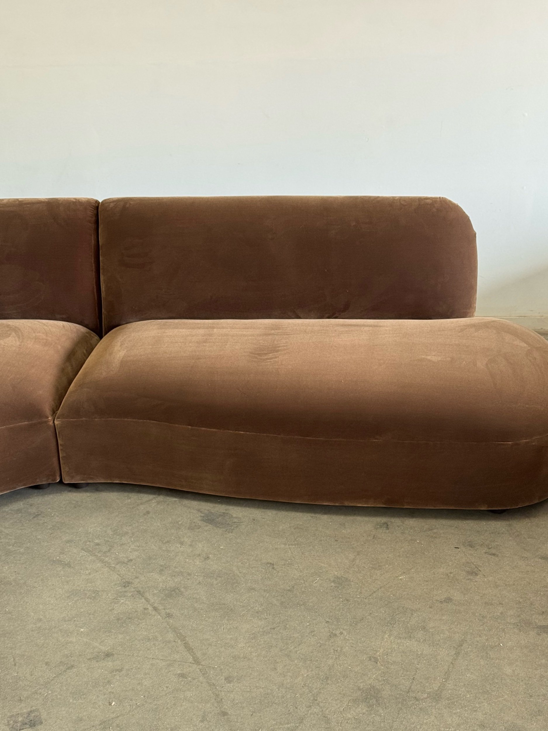 Protoype Floor model for our made to order Oversized channel sectional. This model features a spring and medium foam mix with a high pile mohair mix. Item features arm rest on each side and ample depth compared to other sofas. Item also shows a nice lip overhang on the front of the sofa. This large sectional consists of three pieces that can bee used as modular pieces or connected with pre installed undermount brackets. Price is for the floor model as shows.